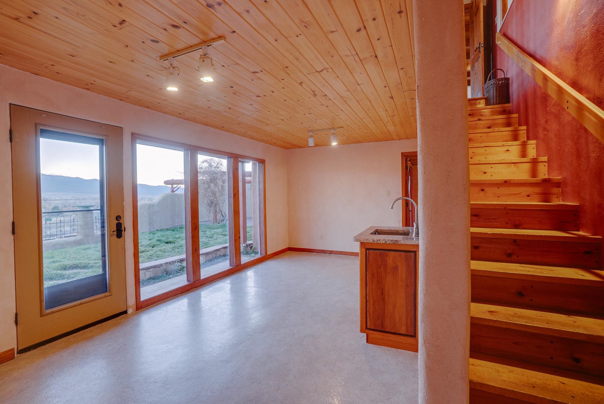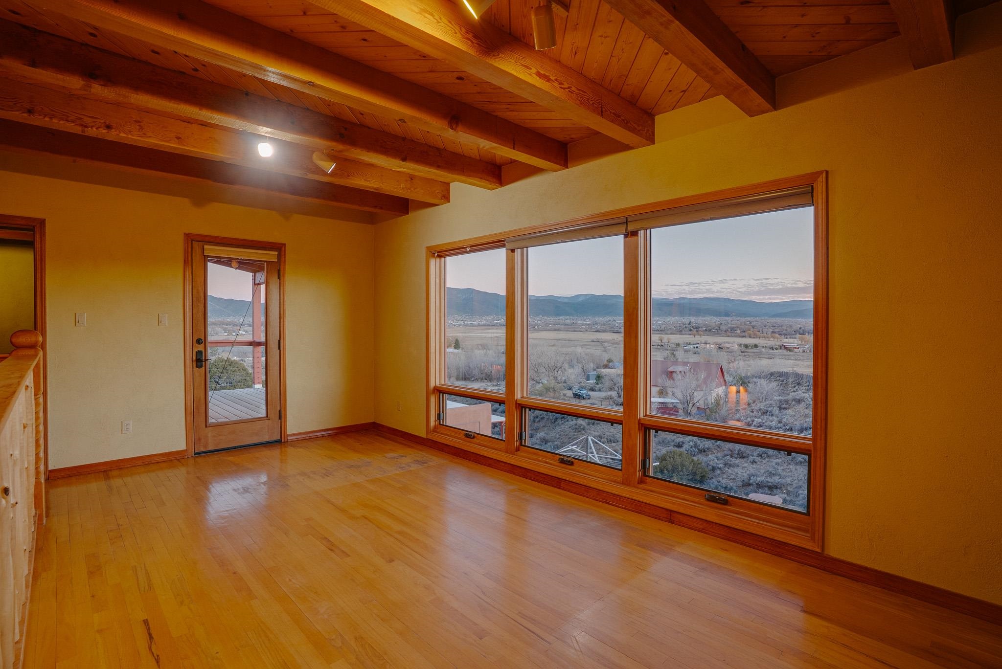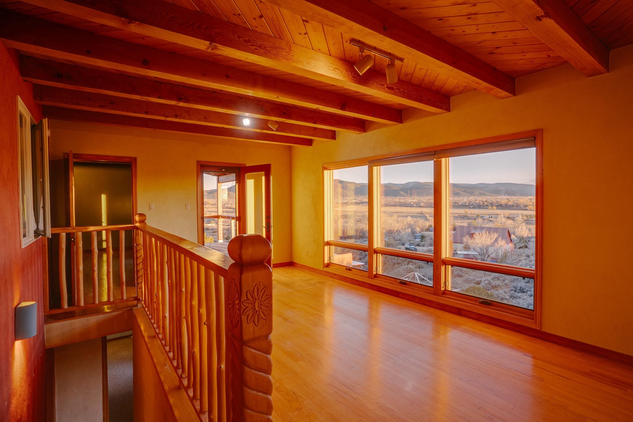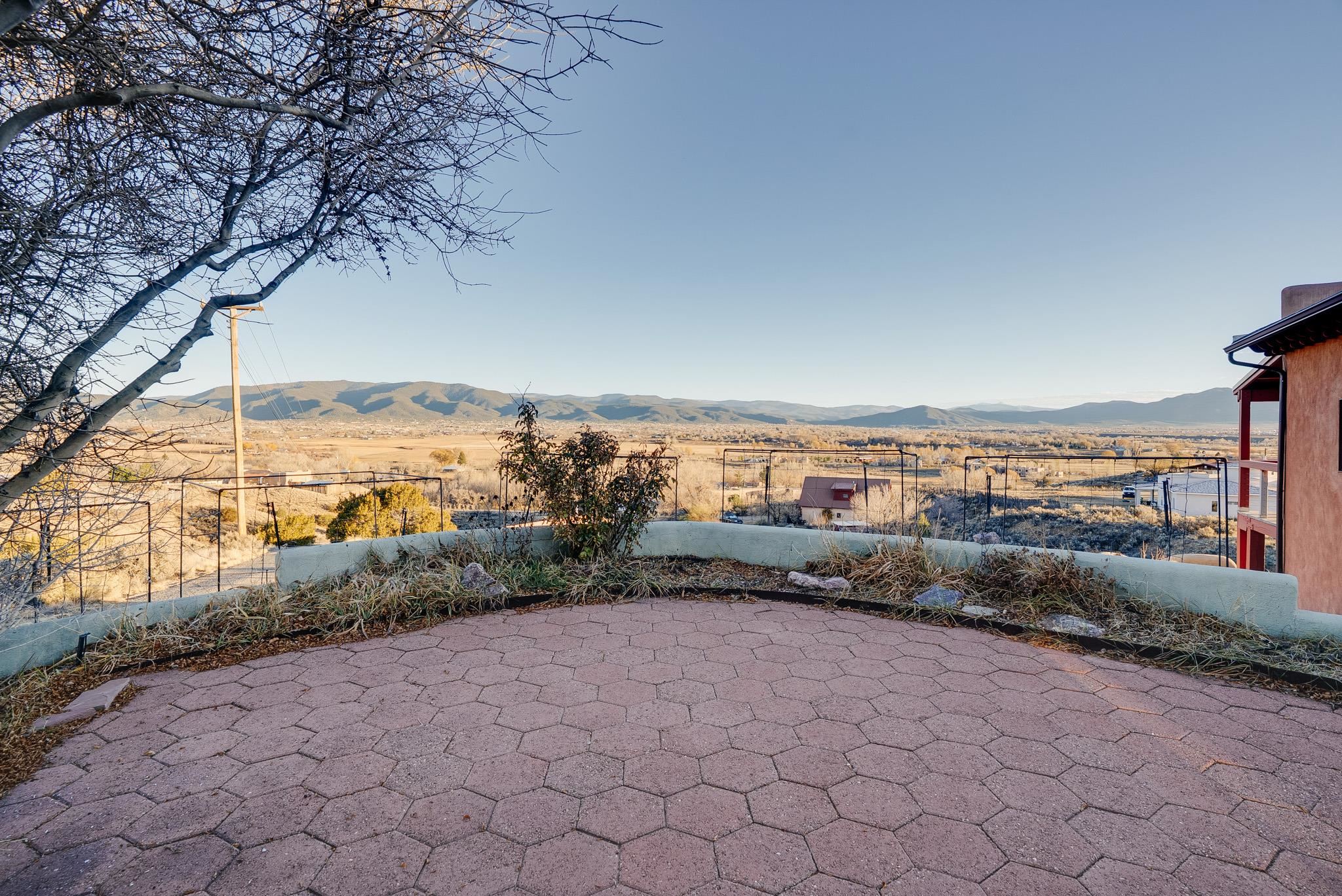 Views, Location, and Space, this property has it all! Perched on 1.67 acres along a ridge top, 9 Cerro Ventoso offers sweeping panoramas of the Taos Valley and the Sangre de Cristo Mountains, along with beautifully maintained living spaces and exceptional versatility. The main home spans two levels with 3 bedrooms, 2 bathrooms, and 2,228 sq ft of heated living space. Large window walls in the dining area frame ever-changing mountain views, creating a stunning backdrop for every meal. The living room features a cozy wood-burning fireplace with a custom heatilator for added warmth and efficiency. Thoughtful craftsmanship is found throughout, including hand-forged iron hardware, gates, and artistic details. Two spacious balconies capture the landscape from above, while the lower level opens directly onto a lush green lawn. A charming pergola provides the perfect space for sunset gatherings, alfresco dining, or peaceful sunrise coffee. A short walk down the paved driveway leads to the workshop and guest apartment. The 819 sq ft workshop is a dream for creatives or hobbyists, equipped with a wood stove, gas heat, two 220 outlets, an industrial exhaust fan, built-in racks, an electric door, and near-soundproof walls. Attached, yet with its own private entrance, is the 849 sq. ft. apartment, offering a full kitchen, bathroom, and two large rooms (each with generous closets). Its industrial aesthetic reflects its origins as part of the workshop, making it an ideal rental, studio, or guest space. Utilities include natural gas to the main home, with propane serving the workshop and apartment. The property is on a shared well with 10 Cerro Ventoso and features two 2,500-gallon cisterns for water catchment, used to irrigate the lawn, plants, and landscaping. Priced well below a recent appraisal, this property is an exceptional value. Schedule a showing to experience the views and versatility of 9 Cerro Ventoso in person.