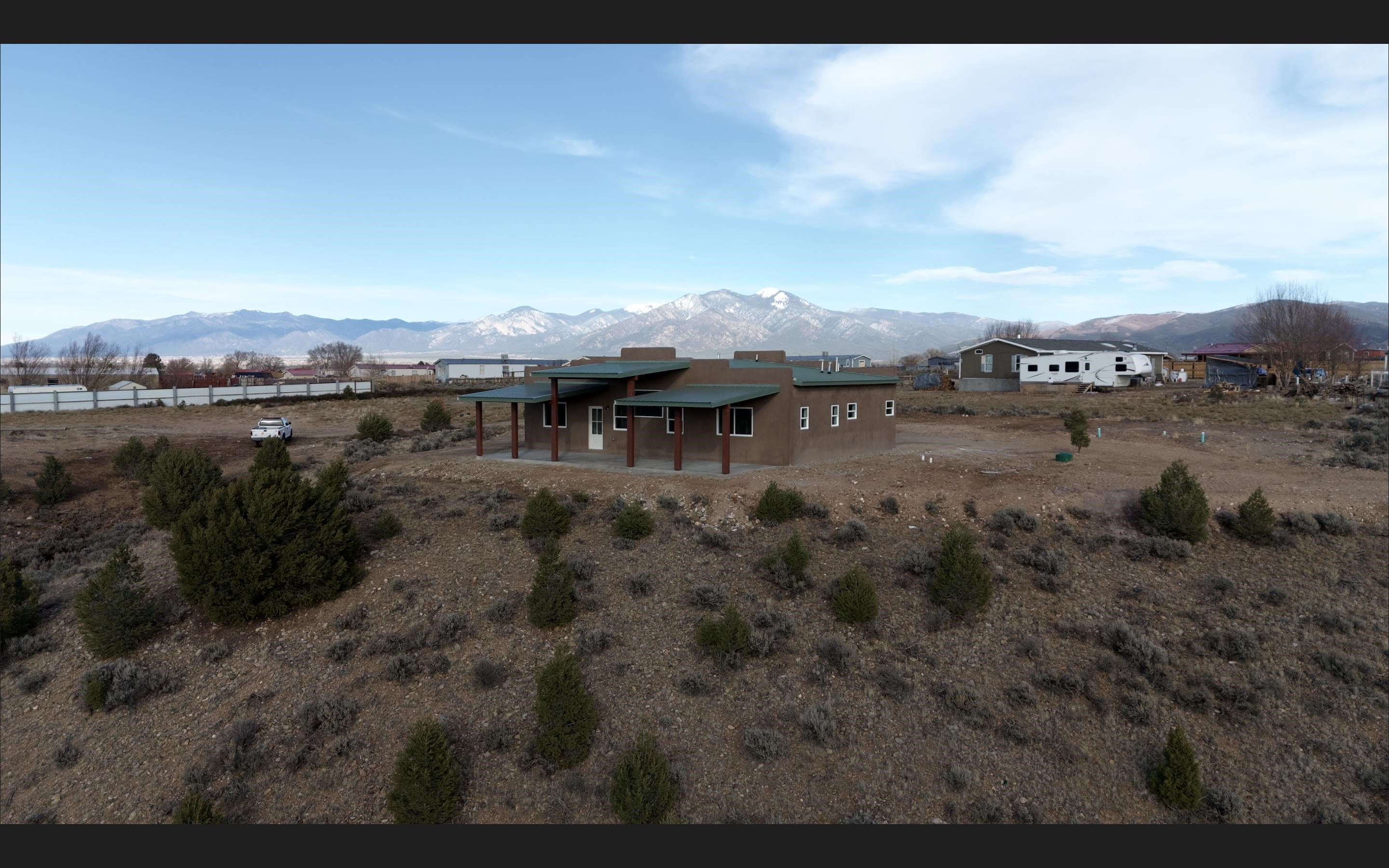 Experience the best of Taos living in this modern Southwest style home, perfectly positioned on a private cul-de-sac with breathtaking western exposure. Enjoy spectacular sunsets that paint the sky each evening and unobstructed views overlooking the golf course. This inviting three-bedroom, two-bath residence blends clean contemporary lines with warm regional character. Natural light fills the open living spaces, making it very cozy. A combination of privacy and scenery, make this home feel the tru spirit of New Mexico living.