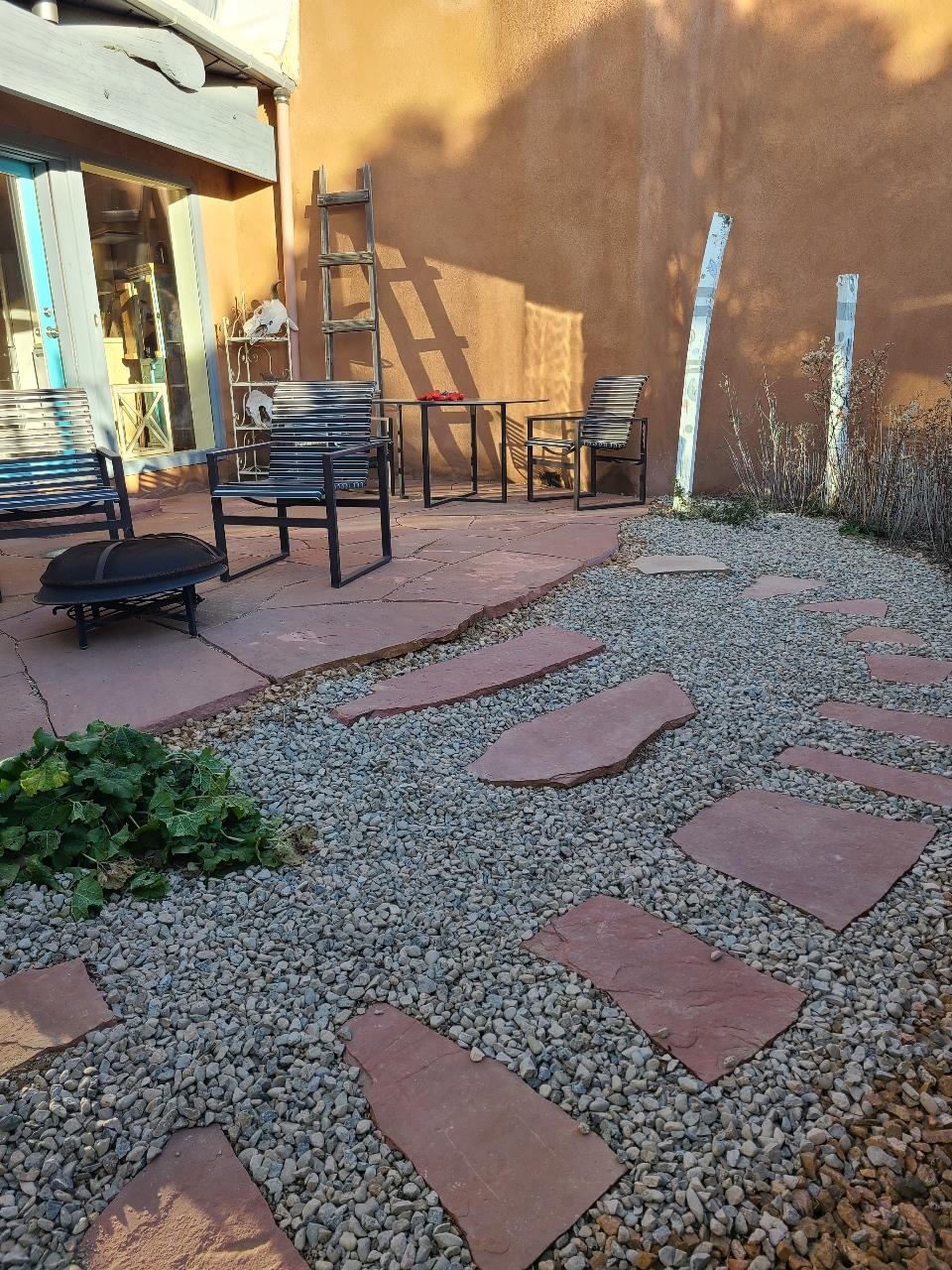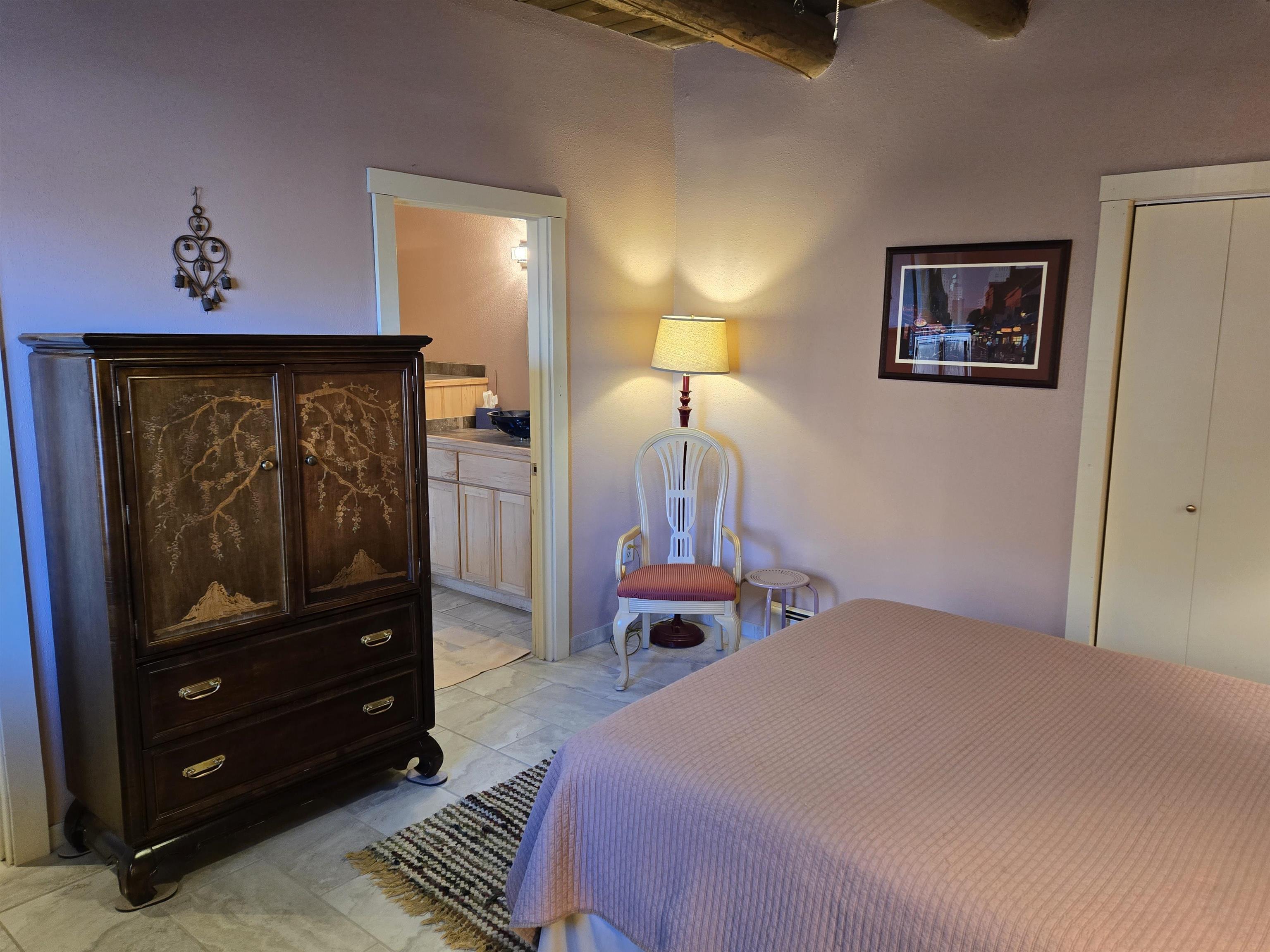 This beautifully updated 2 bedroom 2 bath condo is just a short walk to downtown Taos. It features 2 separate courtyards, a one car garage, a big kitchen island, stainless appliances and ensuite bathrooms for each of the bedrooms. There is a full sized washer and dryer in the unit. The building has 6 units. Valverde Street is located just 2 blocks west of Taos Plaza and is very convenient to shopping, restaurants, concerts and downtown events. PRIME LOCATION AND COMMUNITY FEATURES: The condominium, called Casa Grande is ideally located within the historic district of Taos, an area where short-term rentals are not permitted; however, long-term rental opportunities are available for residents. Its prime placement offers outstanding convenience and walkability as it is situated close to the plaza, Kit Carson Park, the dog park, and the library. Being on the north side of the Historic Taos Plaza, the property provides easy access to the Taos Ski Valley, making it especially appealing to those who enjoy outdoor activities. Additionally, the building borders Garcia Elementary School, ensuring a peaceful and quiet atmosphere during evenings, summers, and weekends. OPEN LIVING SPACES AND COURTYARDS: The main living area of the condominium is designed with an open-concept kitchen and living room. French doors in the living area open directly onto the east courtyard, which leads to the back condo area and serves as a shortcut to the plaza. A fireplace, crafted by renowned Taos artist Carmen Valvarde, serves as a striking centerpiece in this space. The kitchen is equipped with modern stainless steel appliances, including an electric range with an internal exhaust system. It overlooks the south courtyard, which provides passive heat in the winter to keep heating costs low and helps keep the unit cool during the summer. The south courtyard also features a flagstone patio and connects to the condo grounds, the front parking lot, and the pathway to the plaza. BEDROOMS AND BATHROOMS: Both bedrooms in the unit feature custom-designed headboards created by a local artist and have their own individual thermostats for personalized comfort. The master bedroom has a sliding door that opens directly to the courtyard and includes a private bathroom with a shower. The guest bedroom contains a full-size washer and dryer neatly tucked away in a closet, and the guest bathroom is accessible from the main living area, providing convenience for both residents and guests. The entire unit is finished with tile flooring throughout. HEATING, GARAGE AND BUILDING DETAILS: Heating for the condo is provided by water baseboards, with the boiler and hot water holding tank located in the one-car garage beneath the unit. This setup ensures that the garage remains heated during the winter months. The garage is equipped with a smart door that can be controlled via an app. While the garage does not have direct access to the living space, stairs lead from the garage to the entryway, and once inside, all living areas are situated on a single level for ease of access. The building itself consists of six units, was re-stuccoed in 2018, and had its roof and stairs replaced in 2021, with both improvements currently under warranty. Most furnishings can stay with the unit. Seller intends to retain artwork and selected pieces.