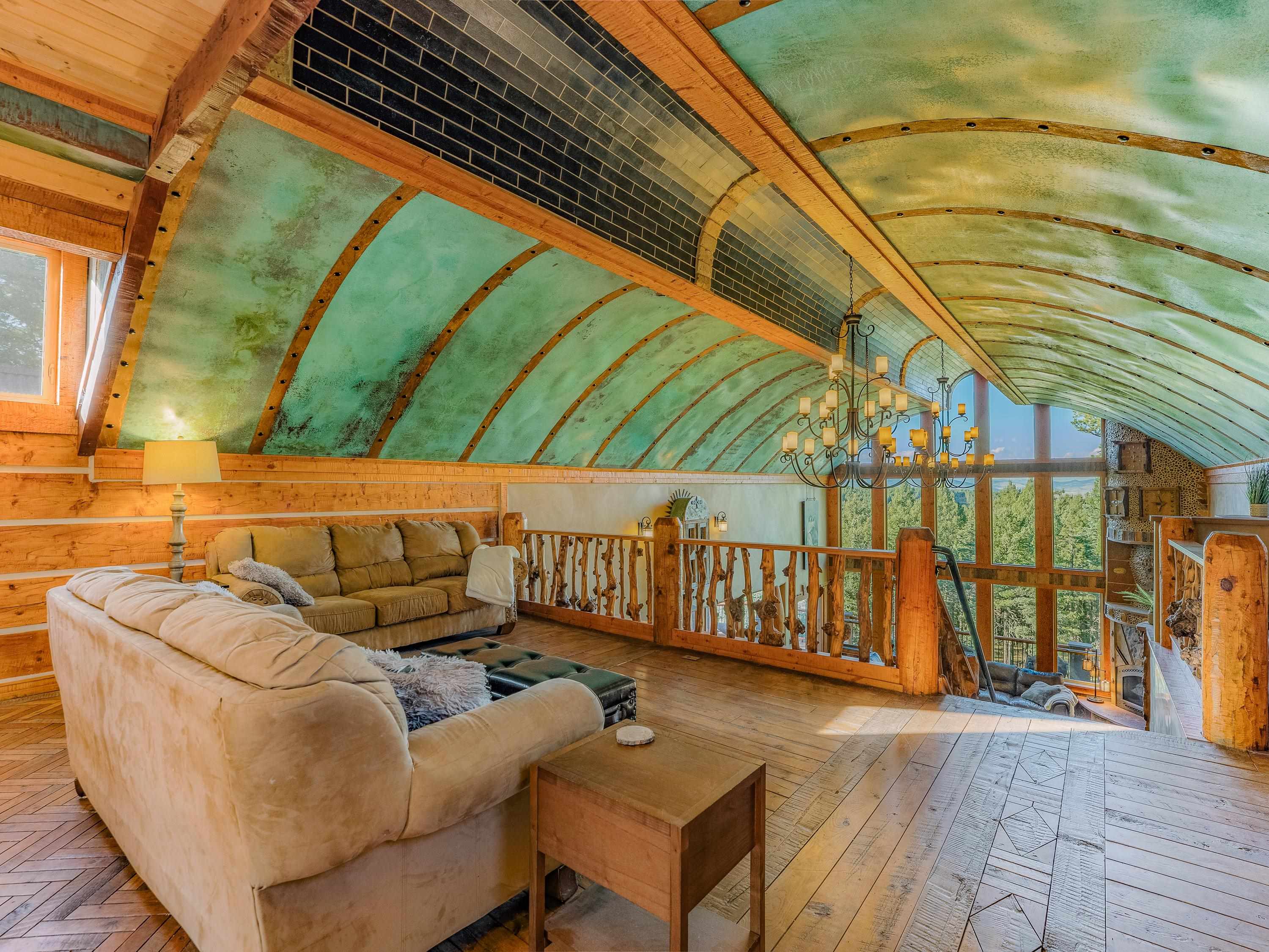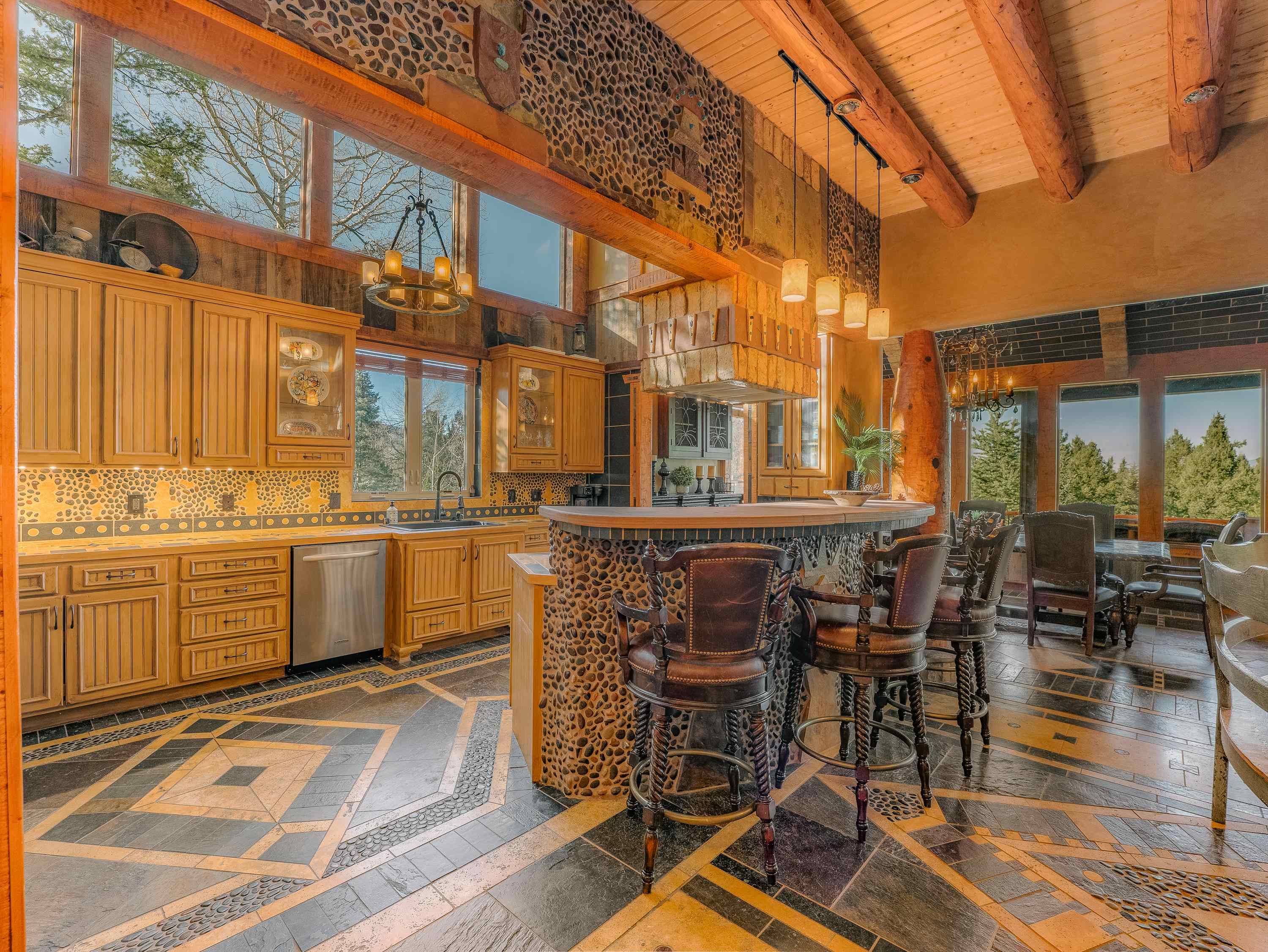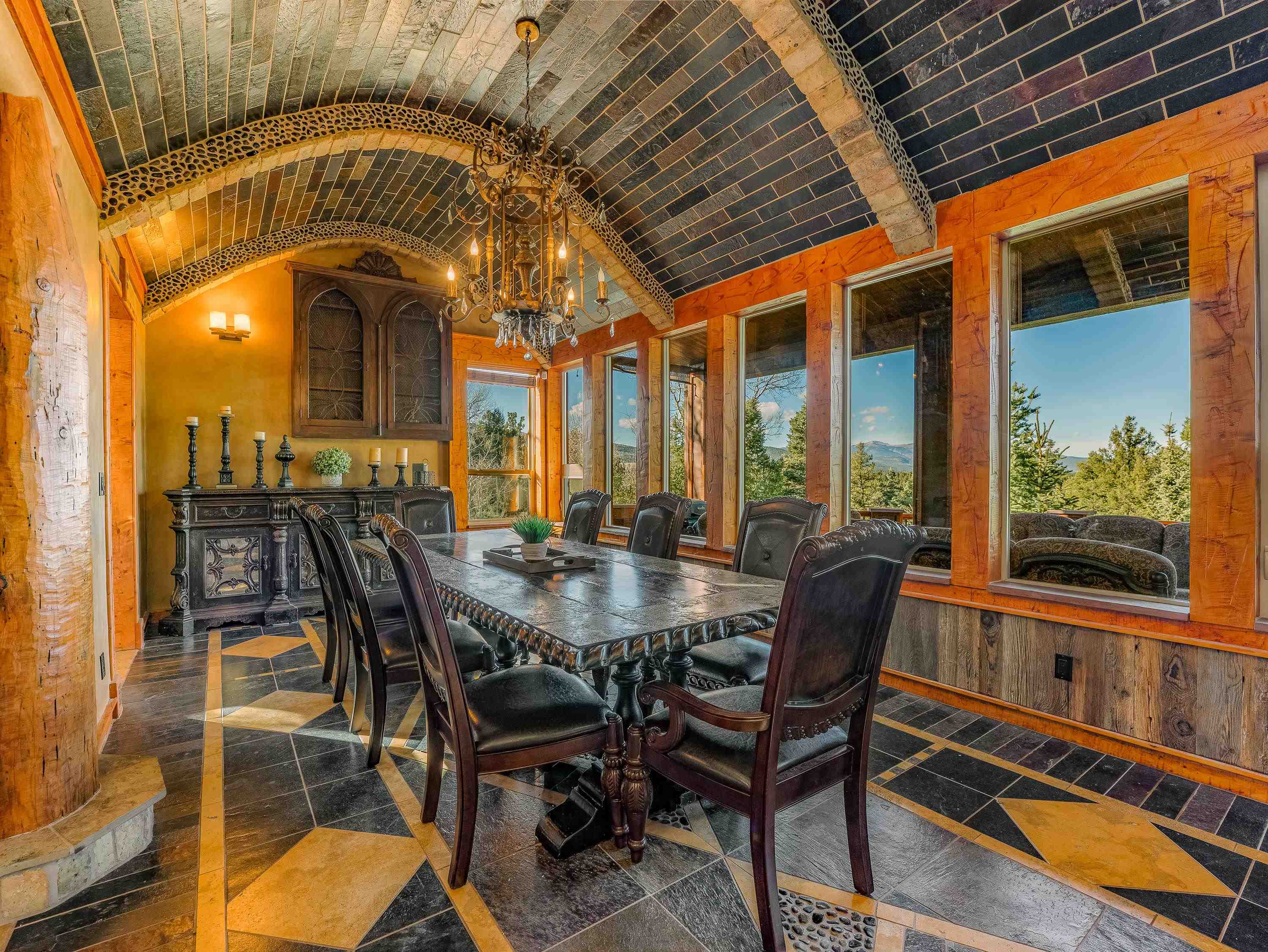 Known as Woodland Castle, this one-of-a-kind architectural masterpiece was designed and built by renowned artist Ray Renfro. Featuring over 7,000 sq. ft. of intricate artistry with a style all its own, the unbelievable level of custom detail defies description and must be seen to be truly appreciated. The home sits on over 2.5 acres of beautiful woodland and backs up to greenbelt space. The tallest peaks in New Mexico are framed like a picture from the back deck. The property is in a perfect location with the privacy and feel you're looking for in a mountain home but also just across the street from Monte Verde Lake, three minutes from the golf course, five minutes from the grocery store, and seven minutes from the ski lifts. There are four separate living areas; the main floor living room, a walkout living room downstairs, a spacious loft, and 'the pub.' The main floor living room features majestic vaulted ceilings, a towering fireplace, and a fantastic view of the mountains through the floor-to-ceiling window wall. The pub has a wet bar, an ice-maker, fireplace, and is set up for parlor games, arcade games, card games, or just catching the game on T.V. The kitchen has a standard oven and a steam oven, plenty of countertop space, tons of cabinets, and a large walk-in pantry. A highlight of the home is the four primary suites, three of which offer direct access to the decks. There is also a large bedroom/bunkroom downstairs, and an office that can be utilized as a bedroom, fitness room, crafting room... you name it! The fully furnished decks include two propane fire pit tables. There are plentiful covered areas and ample space to get some sun. The upper deck has a direct line-of-sight view of Wheeler Peak; the lower deck features an extra large hot tub. There are a lot of incredible homes but there is only one Woodland Castle, truly a marvel of creative architecture.