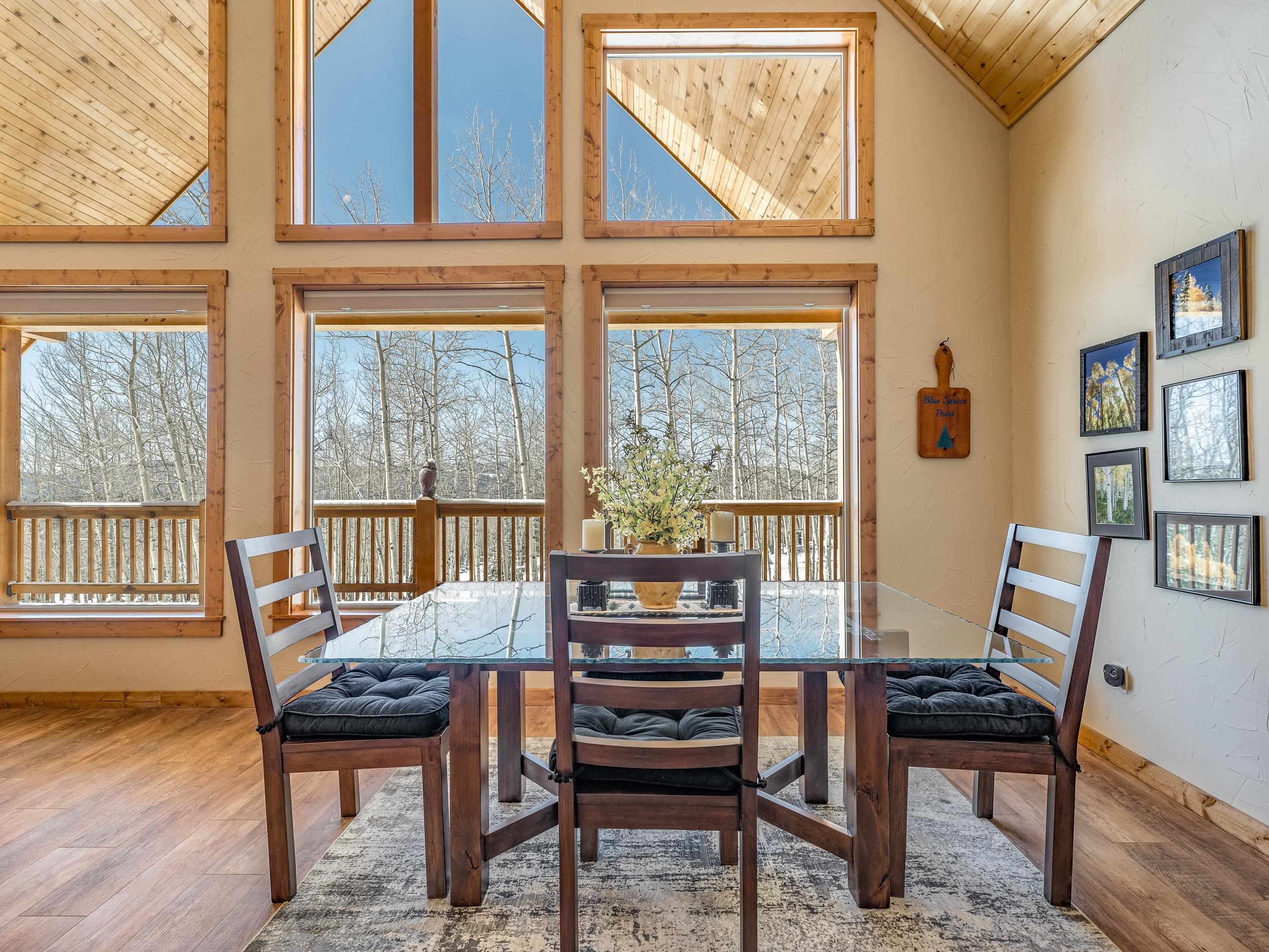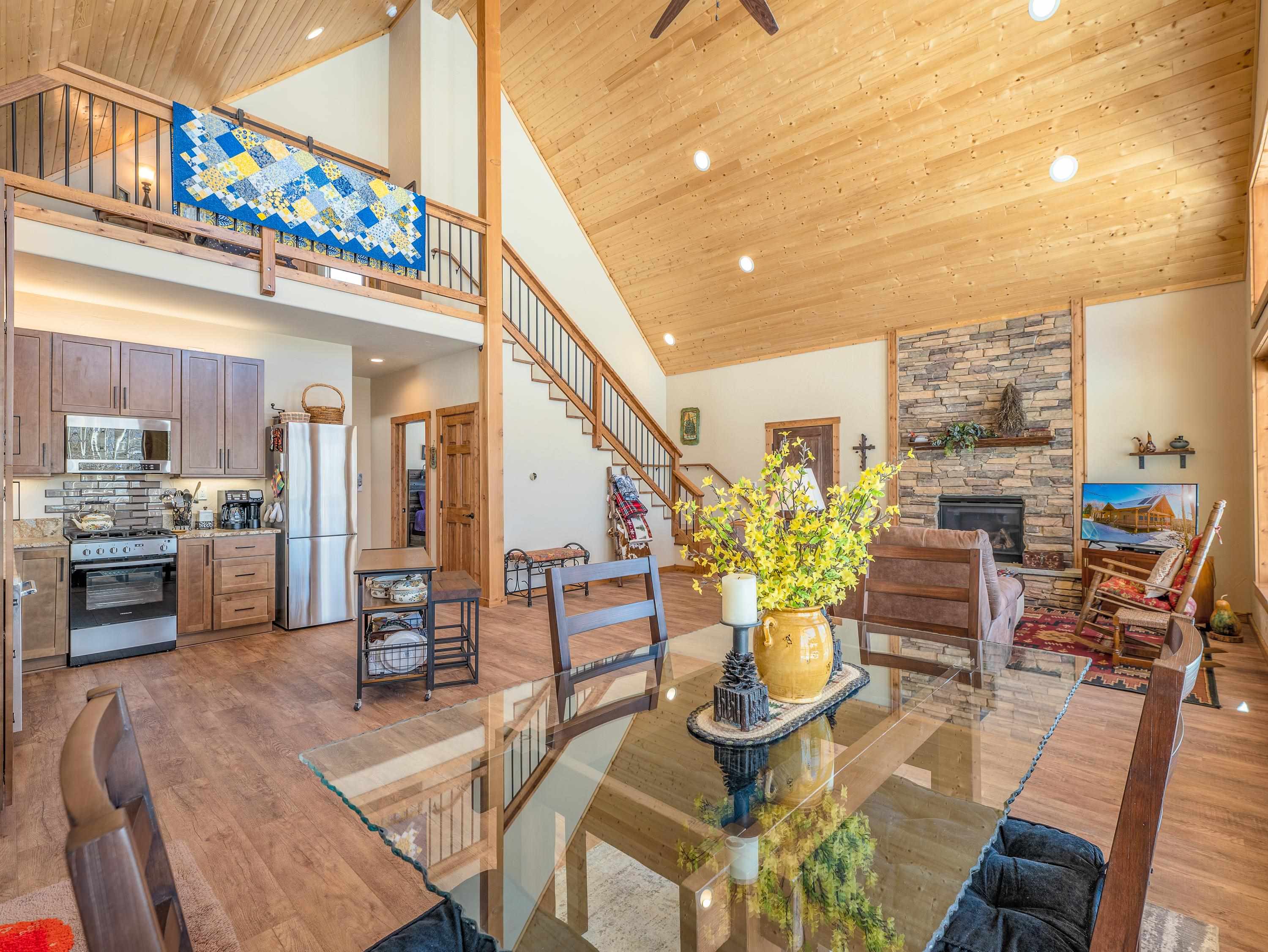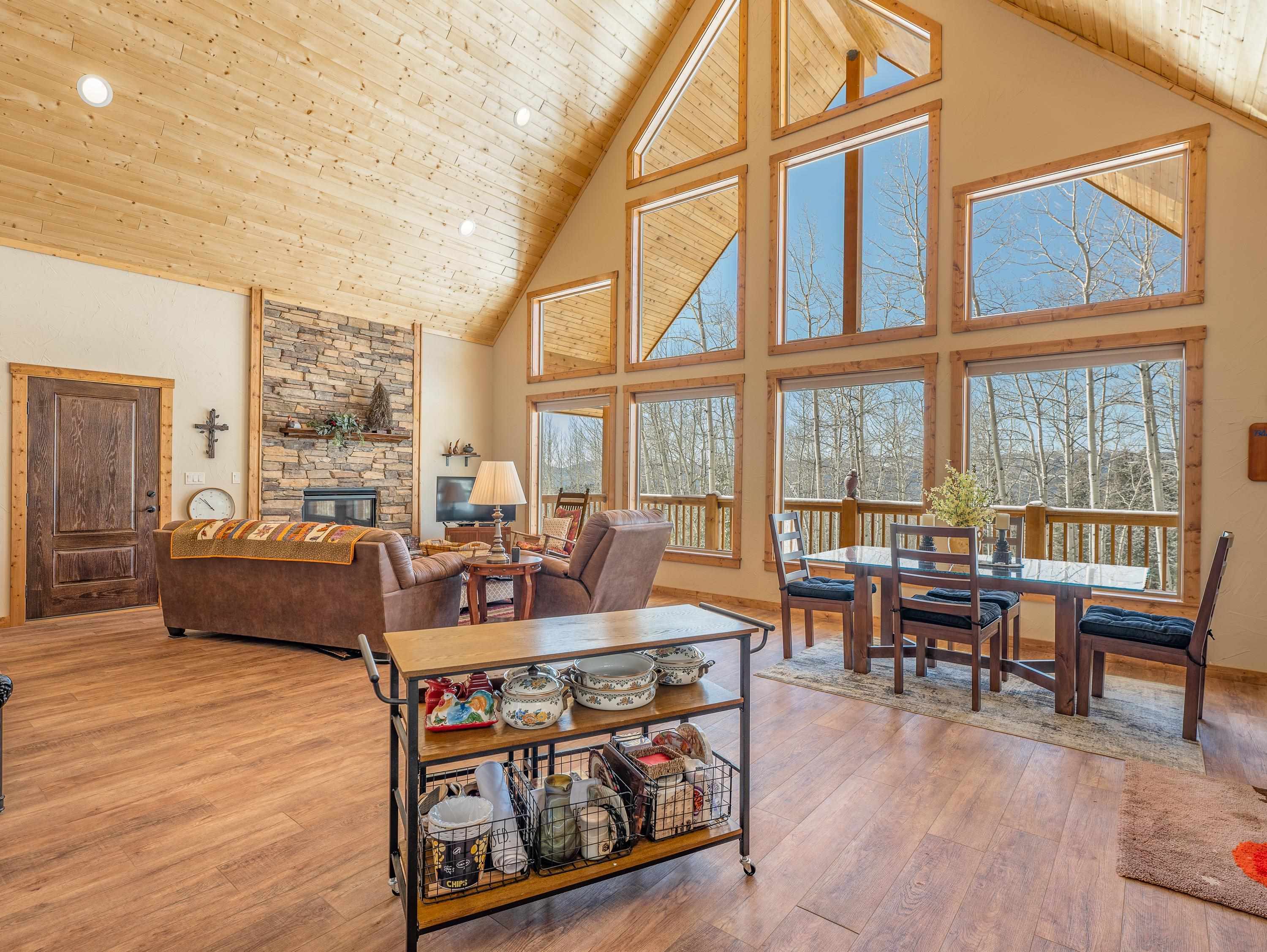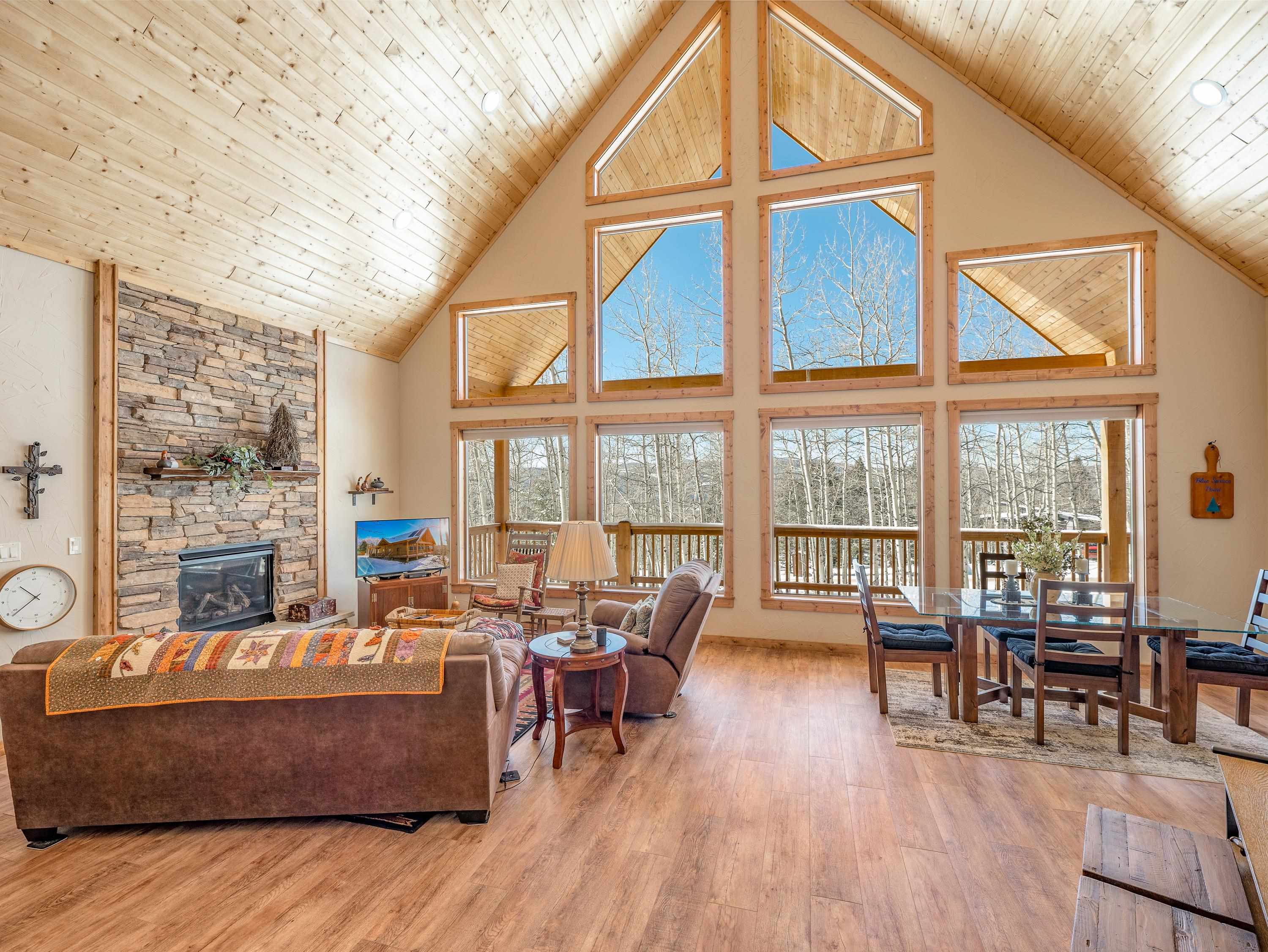 Nestled among a grove of quaking aspens, this charming home is ready to be your haven of tranquility. Built for effortless living, thisrecently completed retreat offers a serene and stylish escape with modern comforts throughout. Be wowed by breathtaking viewsthrough the expansive window wall from the moment you step inside, and let your worries melt away in the inviting atmosphere of thevaulted ceiling and spacious, open layout. Cozy up by the low-maintenance propane fireplace, prepare meals in the well-appointedkitchen--featuring premium, space-conscious appliances designed for smart and efficient living--while friends and family gather aroundthe large dining table. The main-floor primary suite features a lovely walk-in shower and a rustic vanity in the ensuite bathroom. If youseek a bit more privacy, the second bedroom is tucked above the living area, offering its own full bathroom and a cozy lofted sitting areaoverlooking the great room and stunning window wall. A roomy laundry area and a convenient half-bath complete the home's thoughtfulinterior. Enjoy cool summer nights and sunny winter days from the expansive covered deck, and experience mountain adventures just ashort, scenic drive away at Angel Fire Resort. Leave your troubles behind and embrace mountain living at 395 El Camino Real in AngelFire, NM.