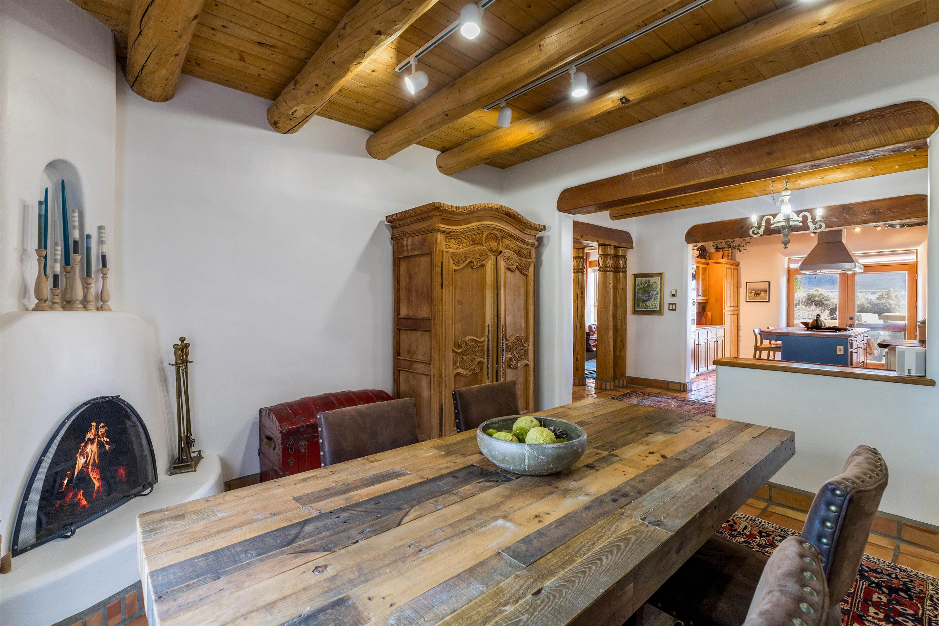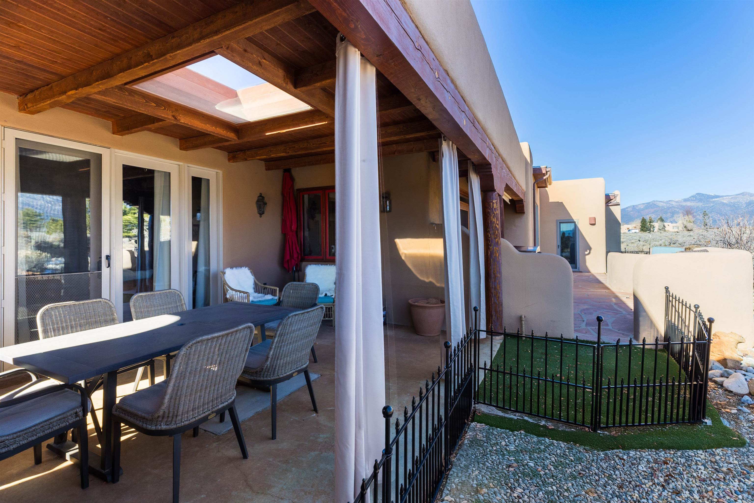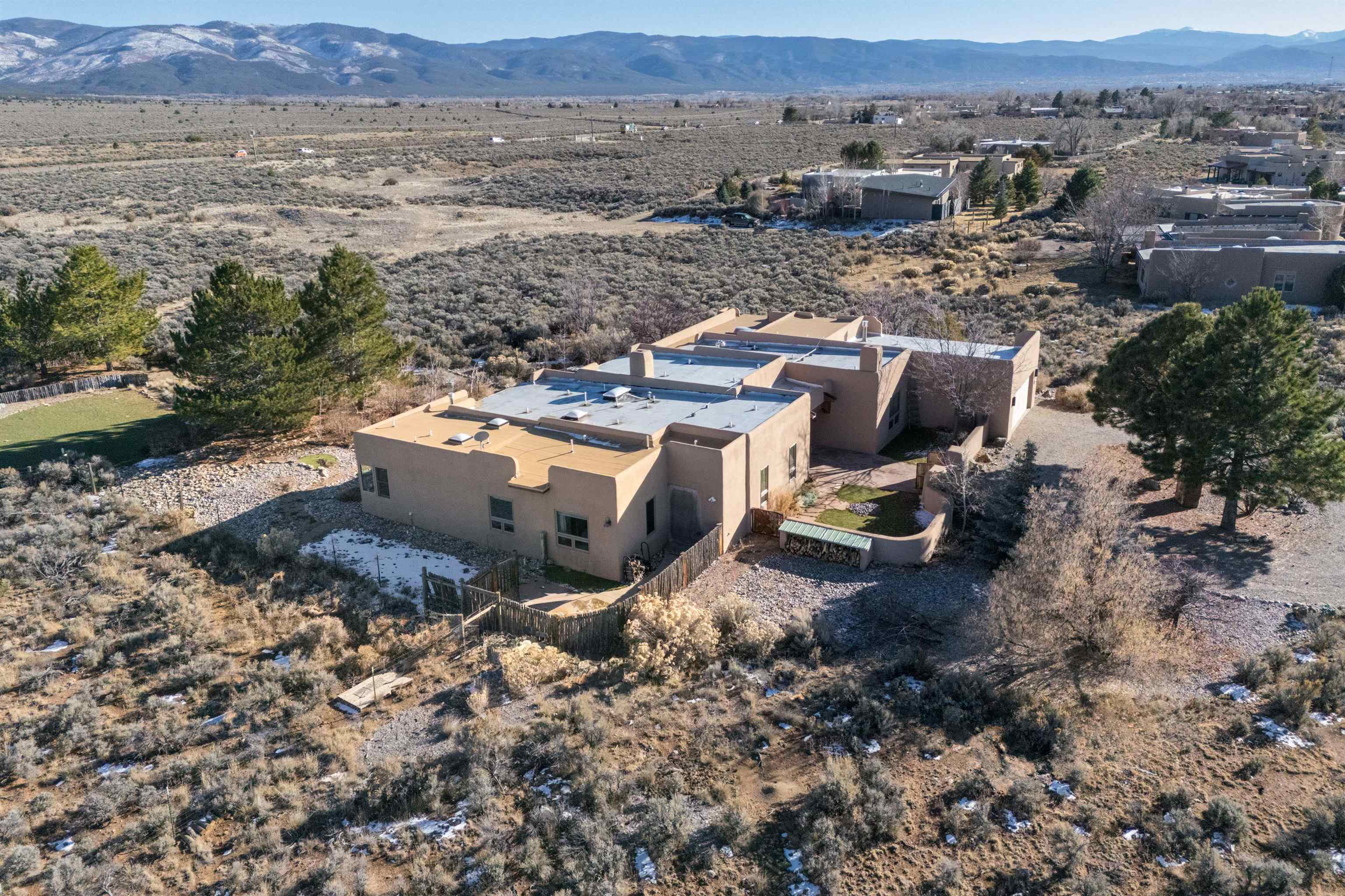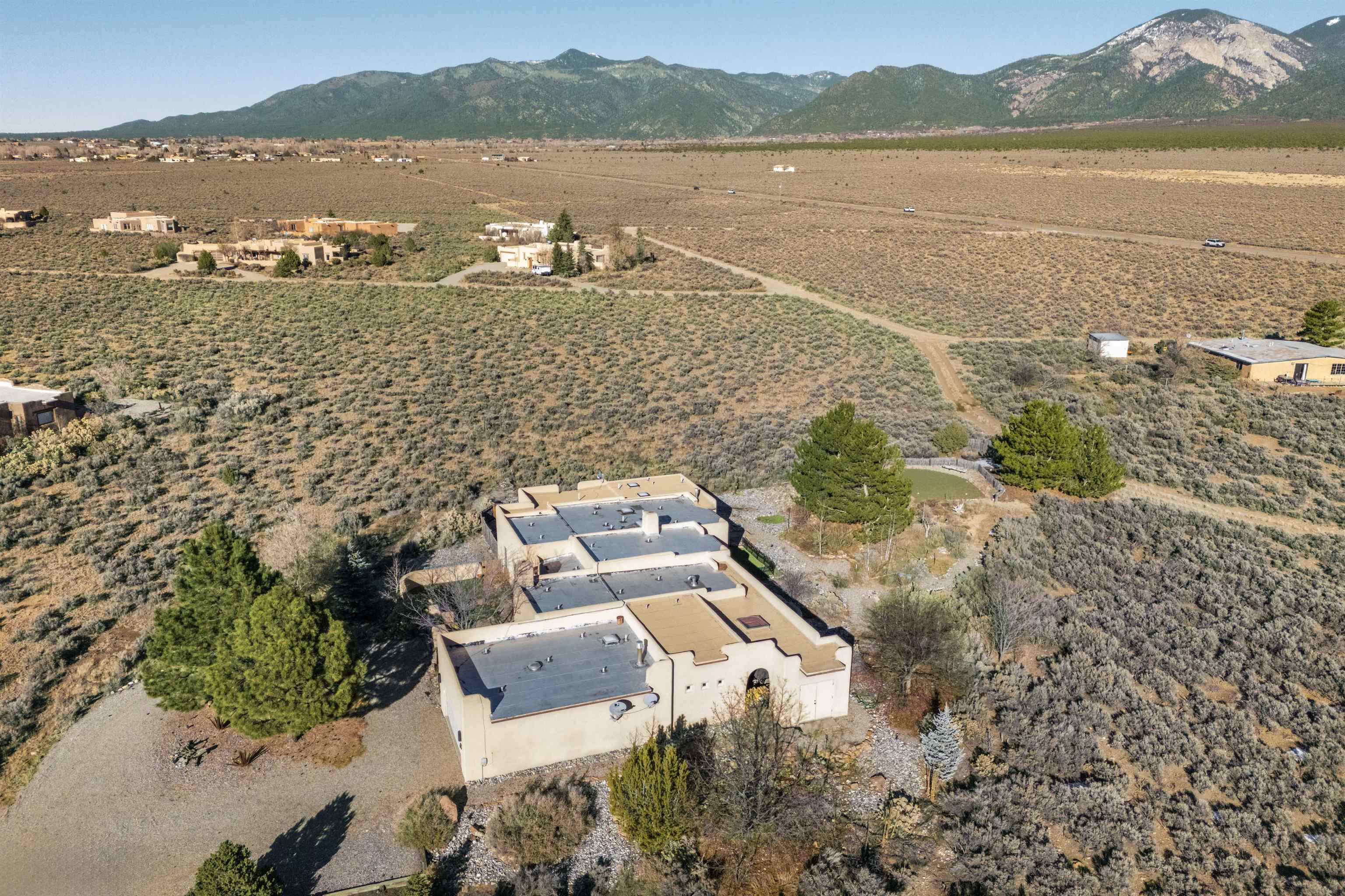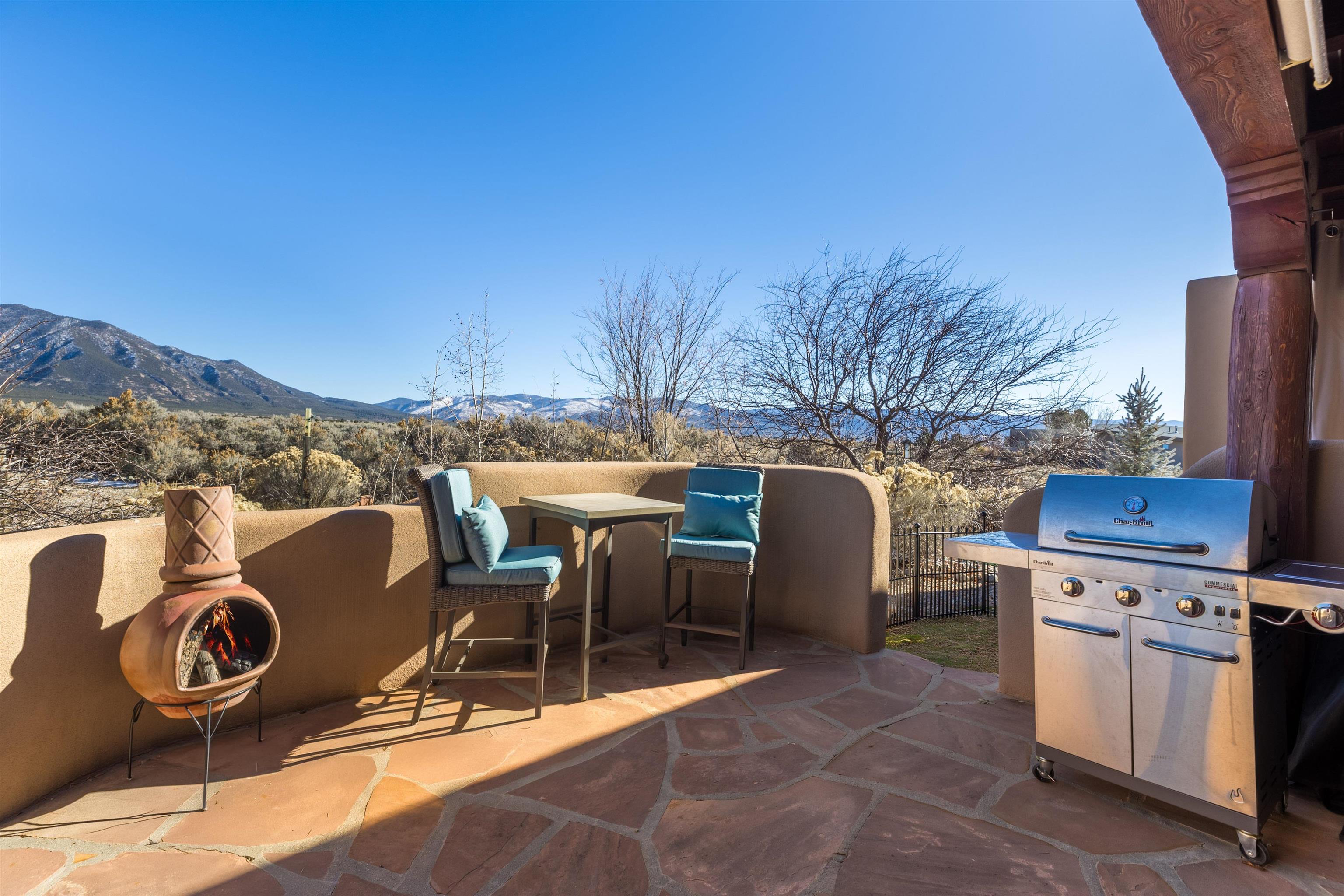 Bring the entire gang! Gorgeous adobe home in the desirable Upper Colonias neighborhood is perfectly positioned between the Town of Taos and Taos Ski Valley at the end of the road with expansive mountain views. Adobe construction, Viga wood beams on the ceilings, two southwestern style fireplaces, saltillo tile- all the beautiful, authentic features that are, sadly, disappearing from our market. This house has it all-4 bedrooms, three baths, two living rooms, a cozy dining room with a fireplace, and a bonus artist's studio/project room with a utility sink, loads of storage and lots of windows bringing in natural light from the north and east. The primary bedroom has large windows with sweeping views of the mountains, a luxurious 6-piece bath and a gigantic walk-in closet with generous built-in storage. The chef's kitchen has great appliances, a large island for counter top dining and direct access to a long portal, partially covered with a grill and entertaining space with front-row views of Taos Mountain. Great spaces for gathering, entertaining, or quietly unwinding after a long day on the river or playing in the mountains. This home is being sold with some furnishings and others are available on a separate bill of sale. Held by the Mountain: a North-side Adobe retreat.