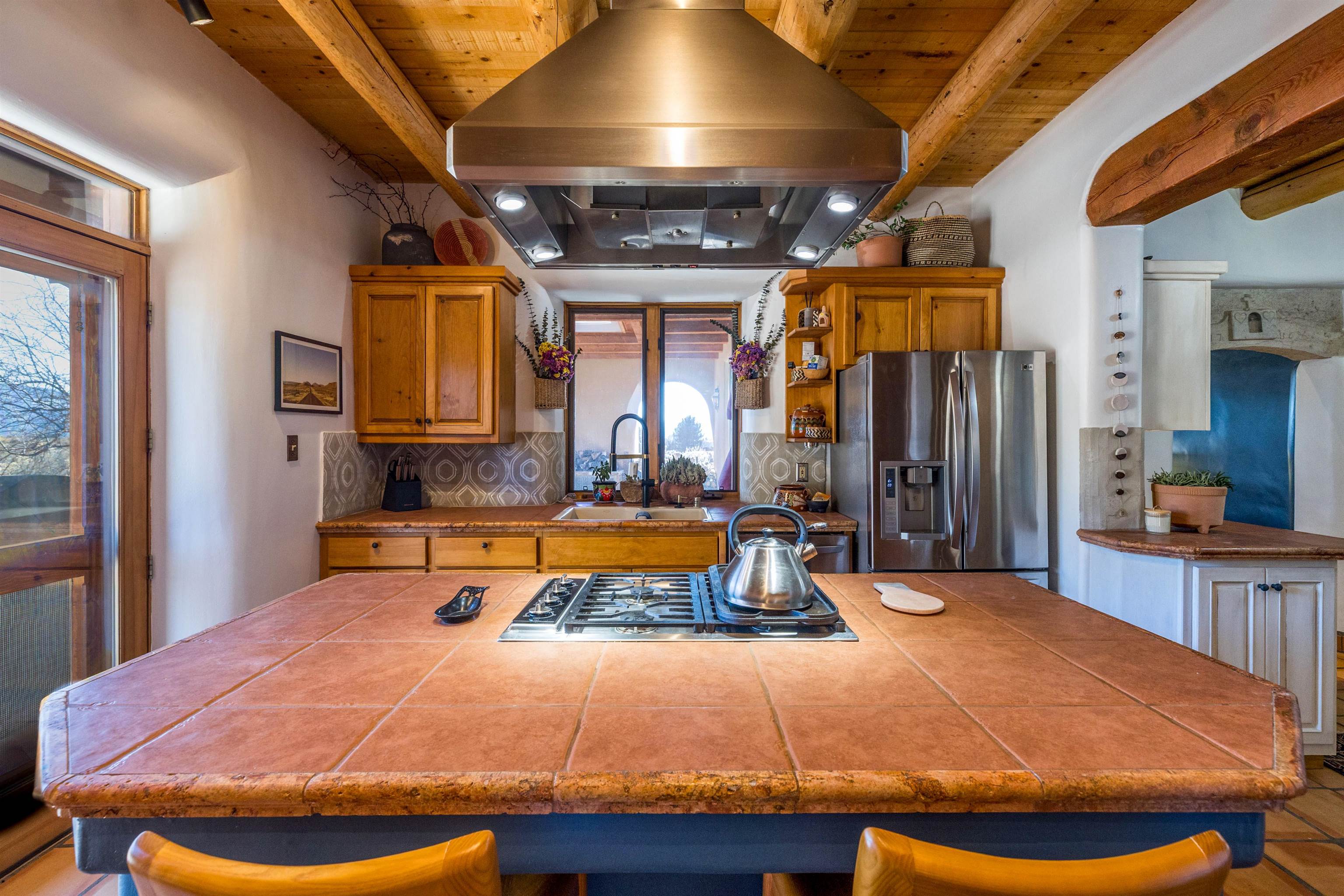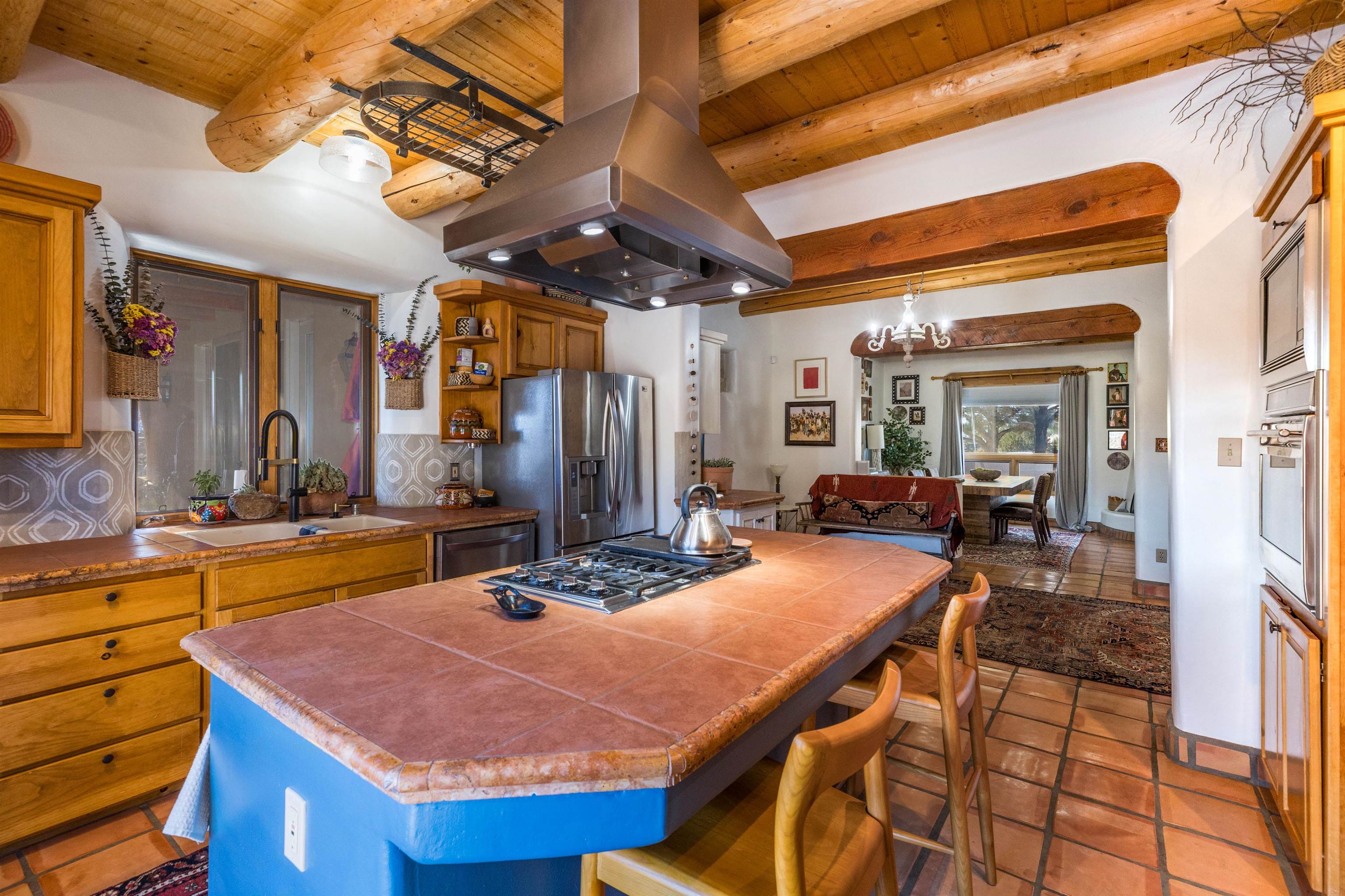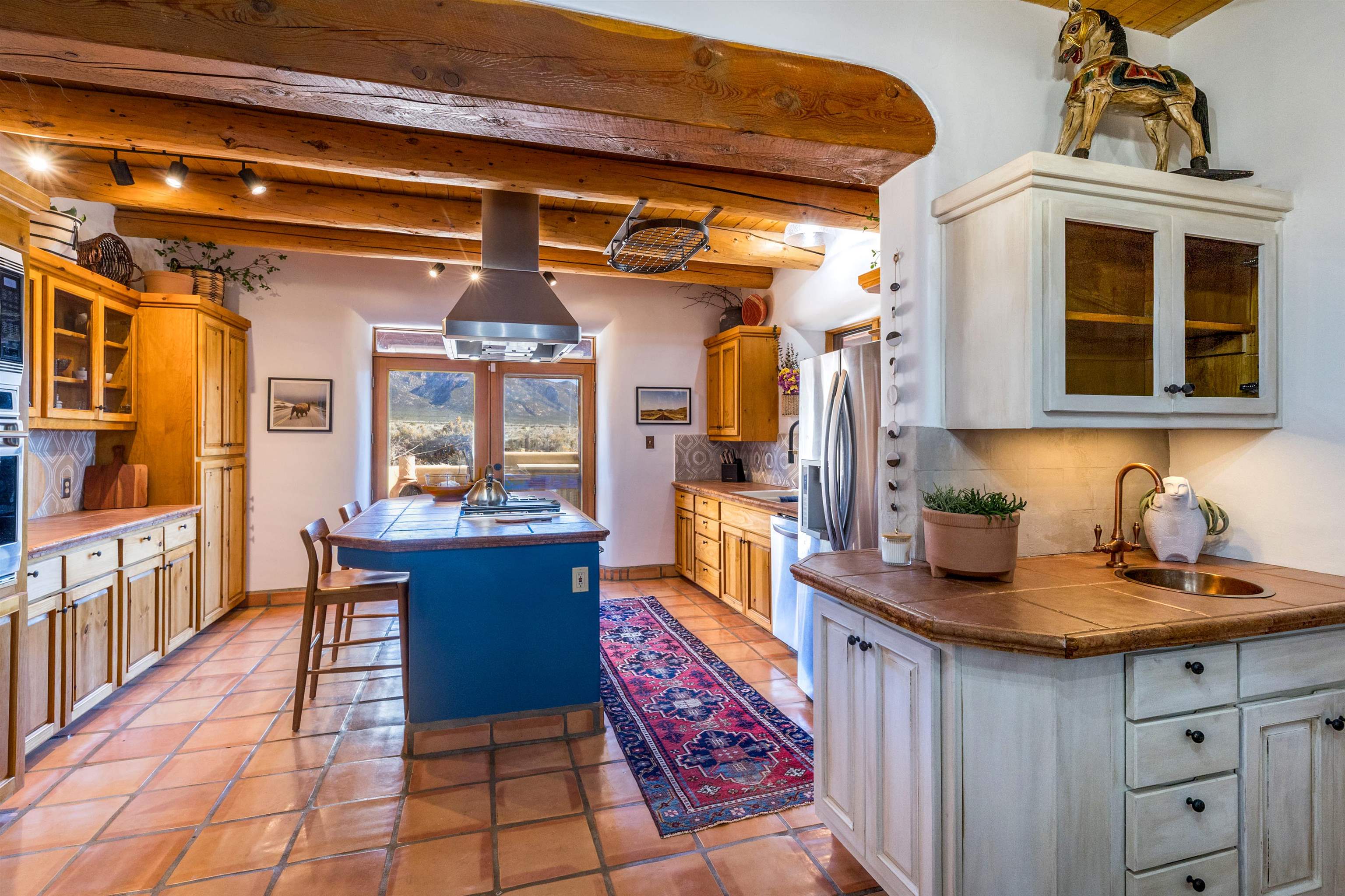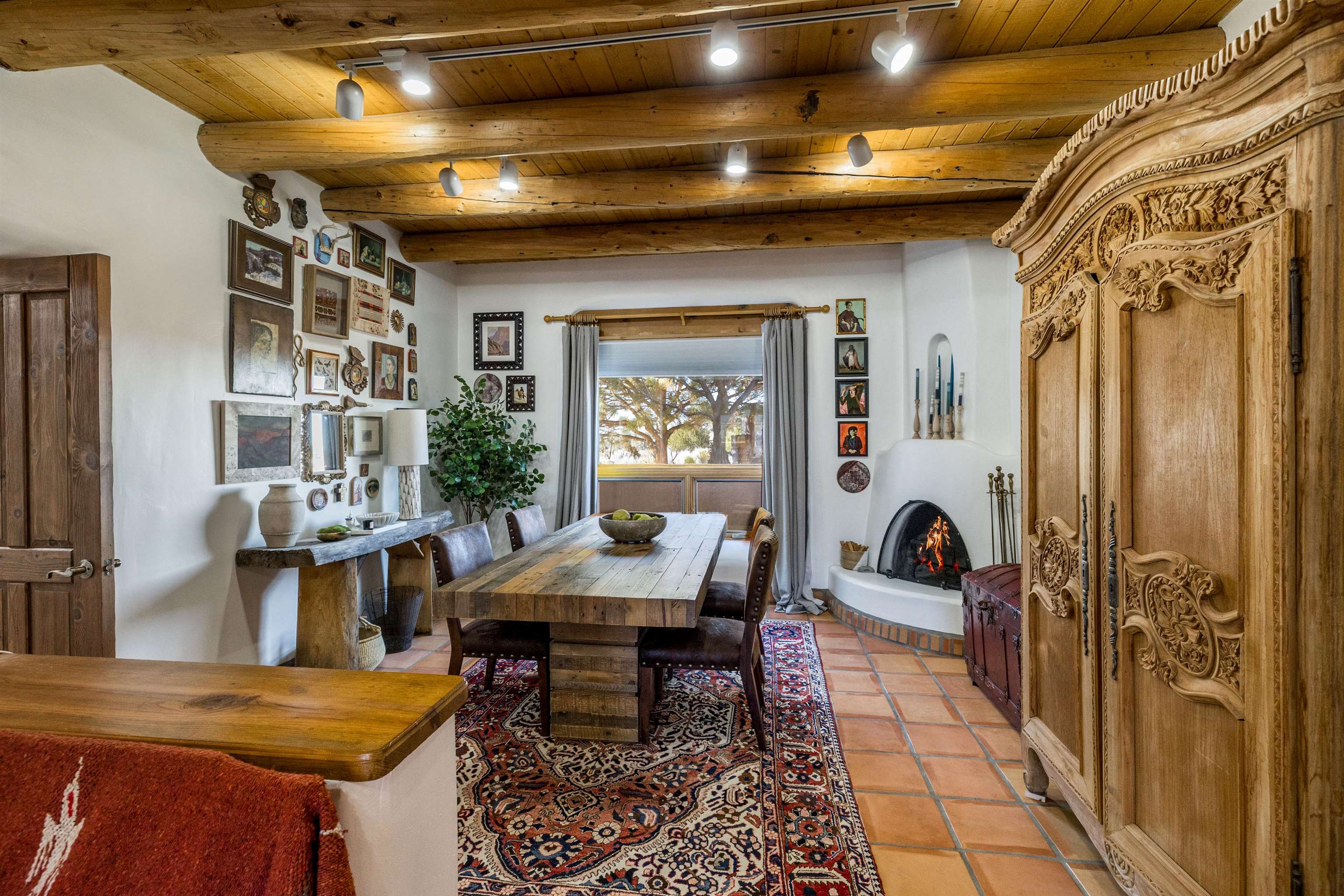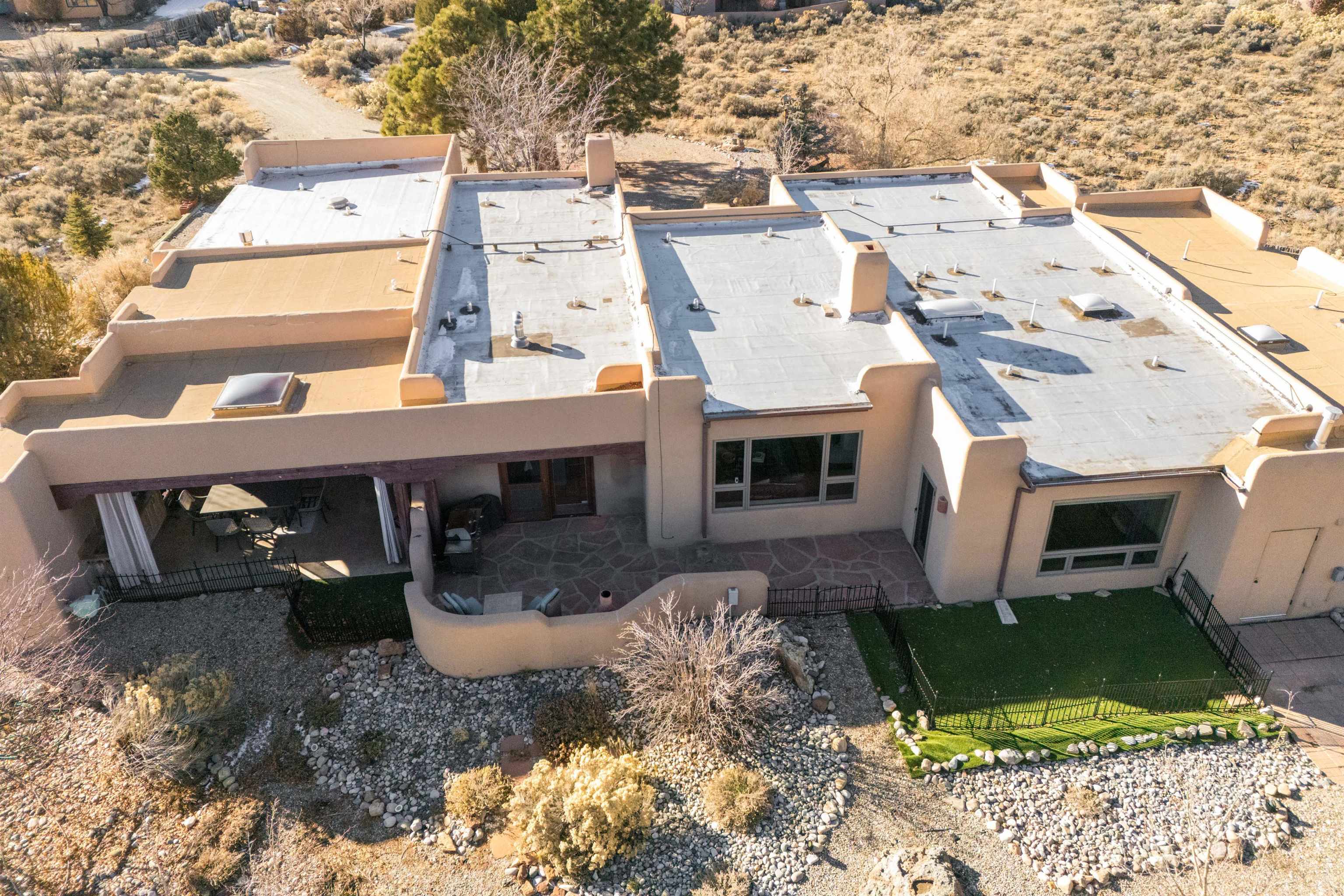 Bring the entire gang! Gorgeous adobe home in the desirable Upper Colonias neighborhood is perfectly positioned between the Town of Taos and Taos Ski Valley at the end of the road with expansive mountain views. Adobe construction, Viga wood beams on the ceilings, two southwestern style fireplaces, saltillo tile- all the beautiful, authentic features that are, sadly, disappearing from our market. This house has it all-4 bedrooms, three baths, two living rooms, a cozy dining room with a fireplace, and a bonus artist's studio/project room with a utility sink, loads of storage and lots of windows bringing in natural light from the north and east. The primary bedroom has large windows with sweeping views of the mountains, a luxurious 6-piece bath and a gigantic walk-in closet with generous built-in storage. The chef's kitchen has great appliances, a large island for counter top dining and direct access to a long portal, partially covered with a grill and entertaining space with front-row views of Taos Mountain. Great spaces for gathering, entertaining, or quietly unwinding after a long day on the river or playing in the mountains. This home is being sold with some furnishings and others are available on a separate bill of sale. Held by the Mountain: a North-side Adobe retreat.