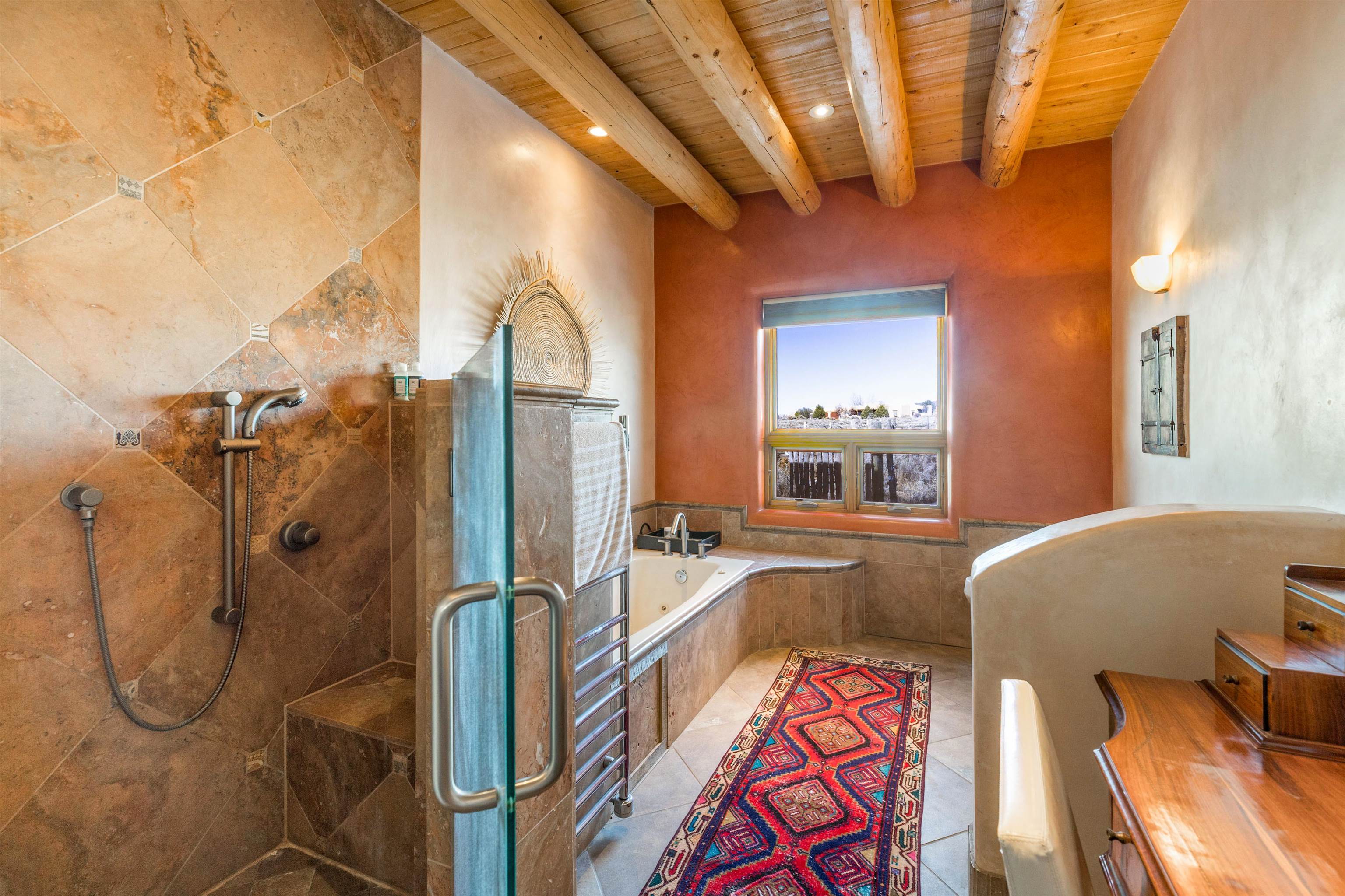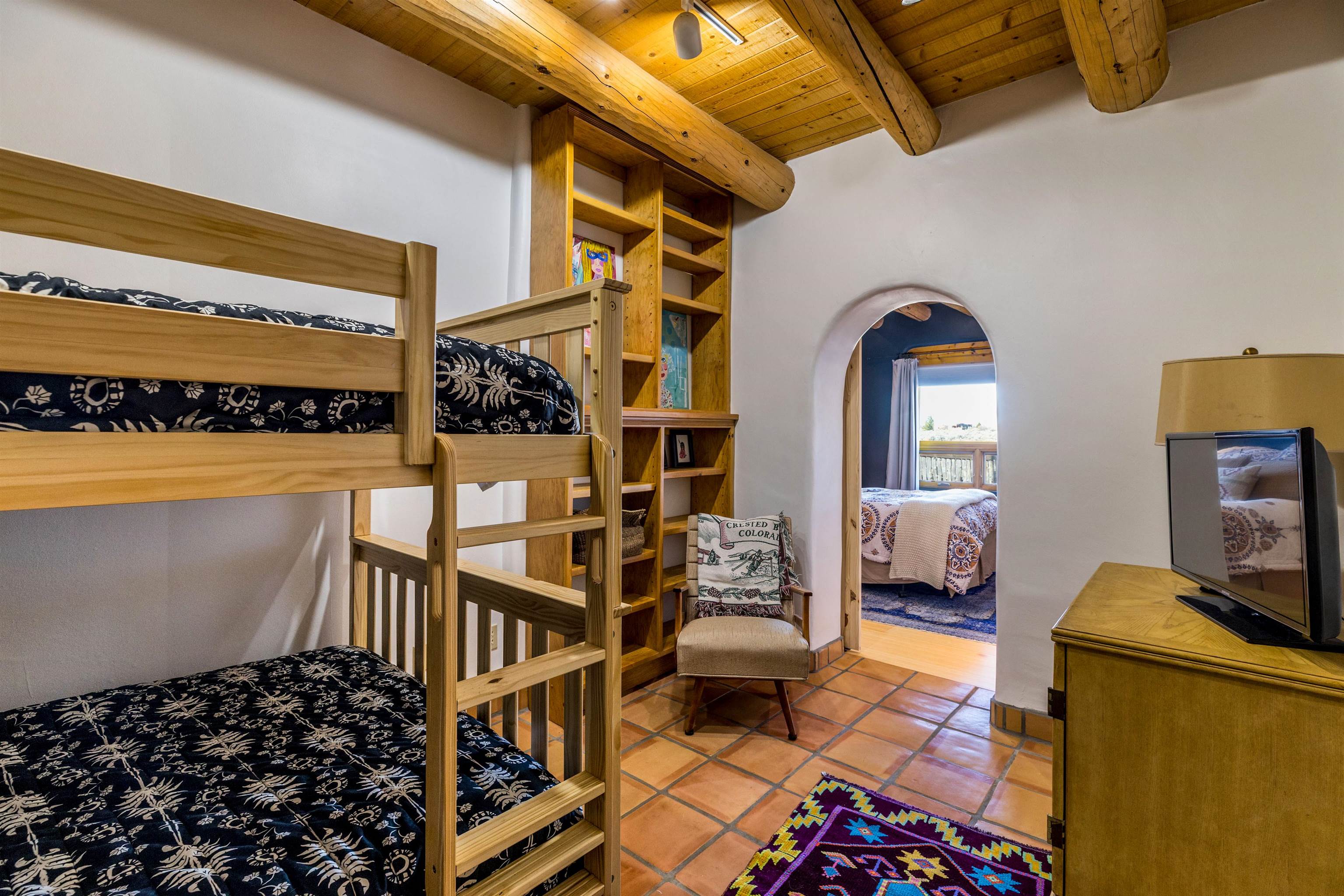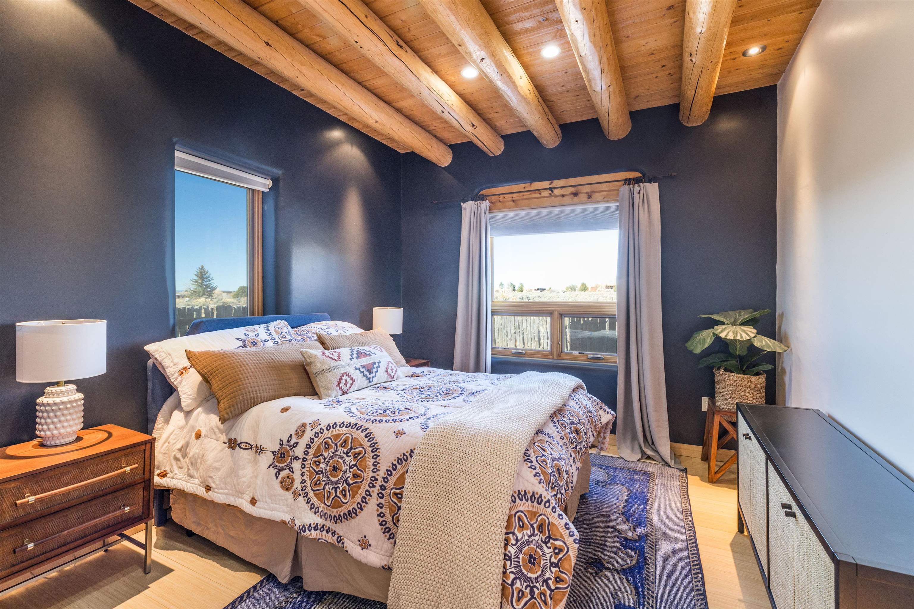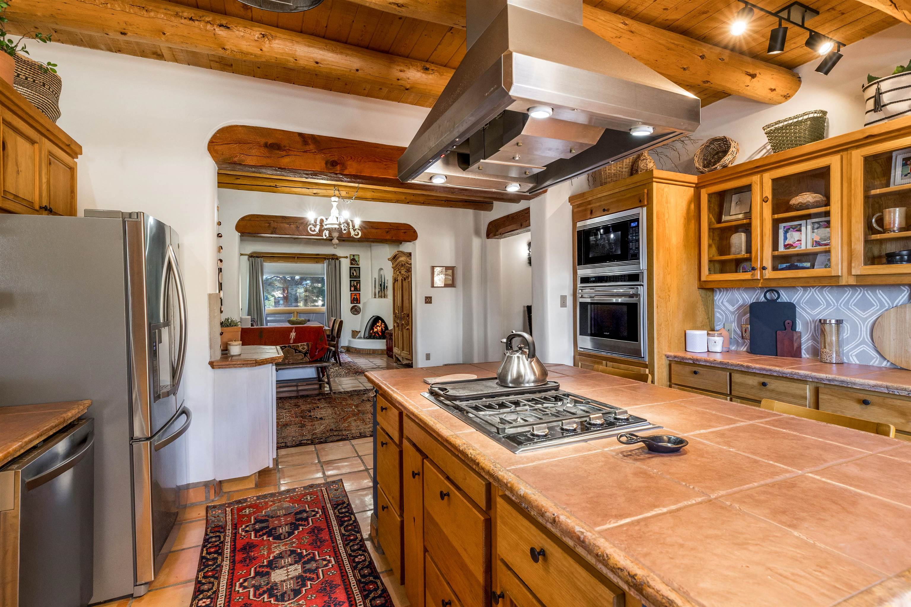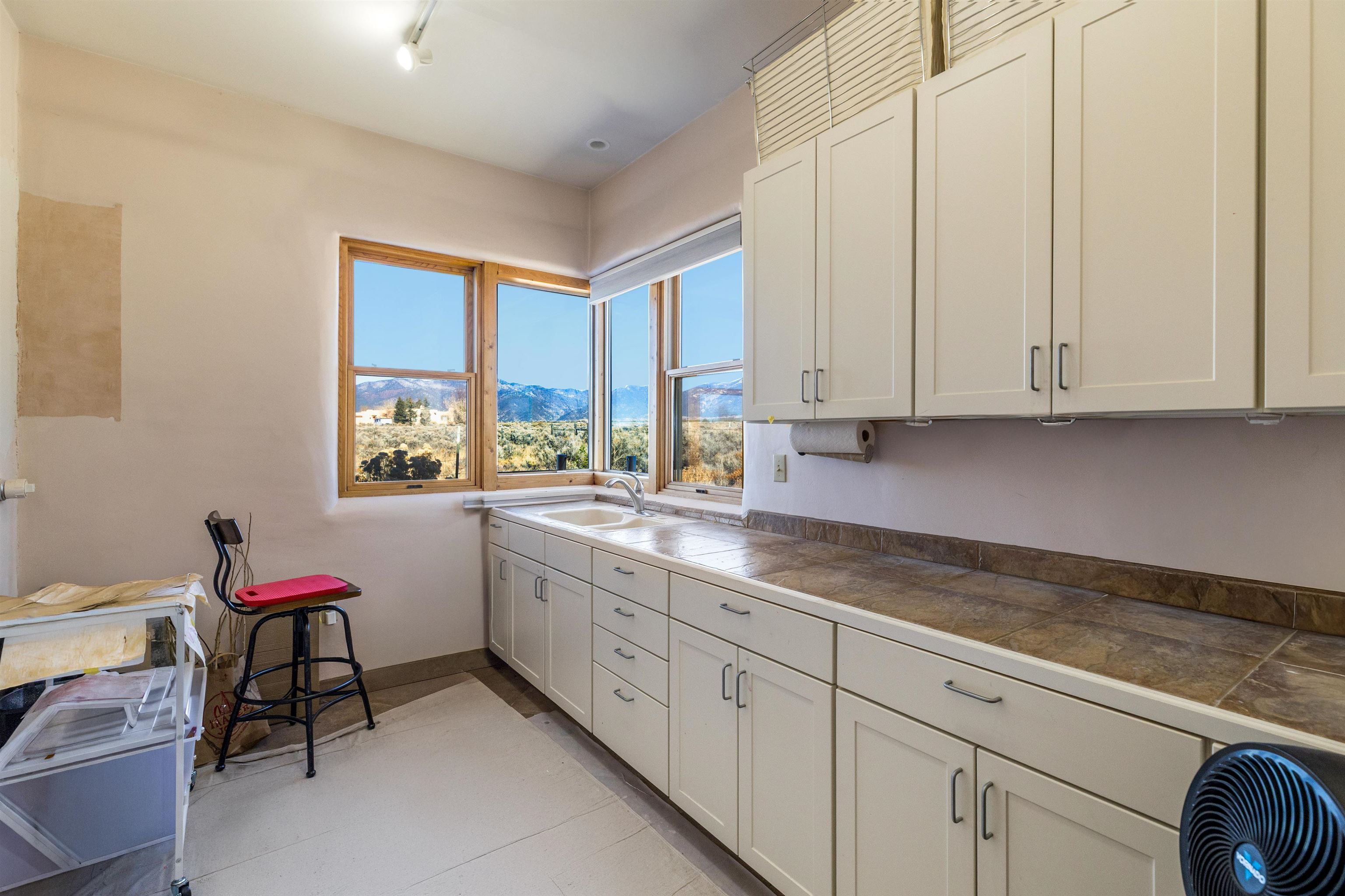 Bring the entire gang! Gorgeous adobe home in the desirable Upper Colonias neighborhood is perfectly positioned between the Town of Taos and Taos Ski Valley at the end of the road with expansive mountain views. Adobe construction, Viga wood beams on the ceilings, two southwestern style fireplaces, saltillo tile- all the beautiful, authentic features that are, sadly, disappearing from our market. This house has it all-4 bedrooms, three baths, two living rooms, a cozy dining room with a fireplace, and a bonus artist's studio/project room with a utility sink, loads of storage and lots of windows bringing in natural light from the north and east. The primary bedroom has large windows with sweeping views of the mountains, a luxurious 6-piece bath and a gigantic walk-in closet with generous built-in storage. The chef's kitchen has great appliances, a large island for counter top dining and direct access to a long portal, partially covered with a grill and entertaining space with front-row views of Taos Mountain. Great spaces for gathering, entertaining, or quietly unwinding after a long day on the river or playing in the mountains. This home is being sold with some furnishings and others are available on a separate bill of sale. Held by the Mountain: a North-side Adobe retreat.