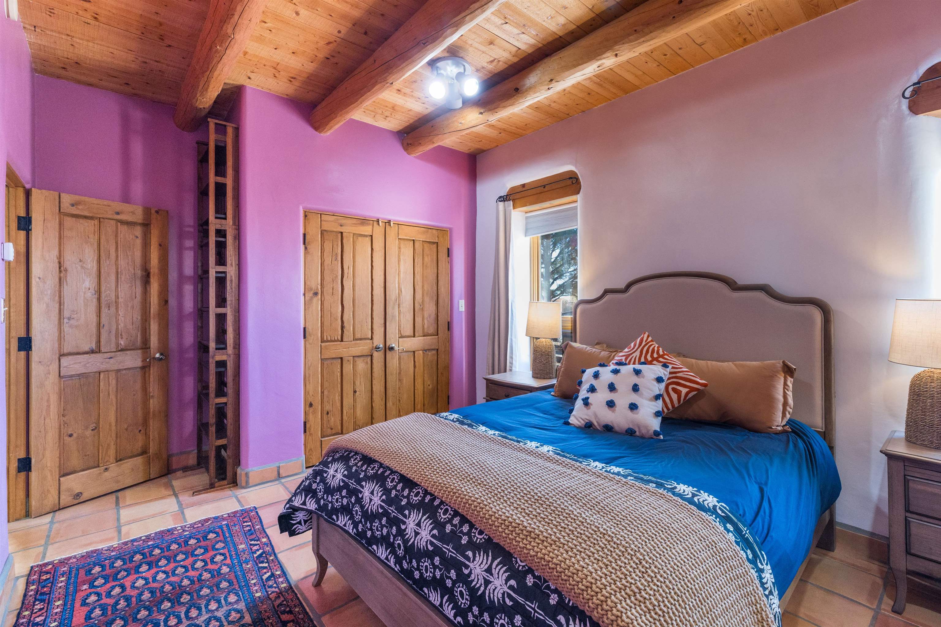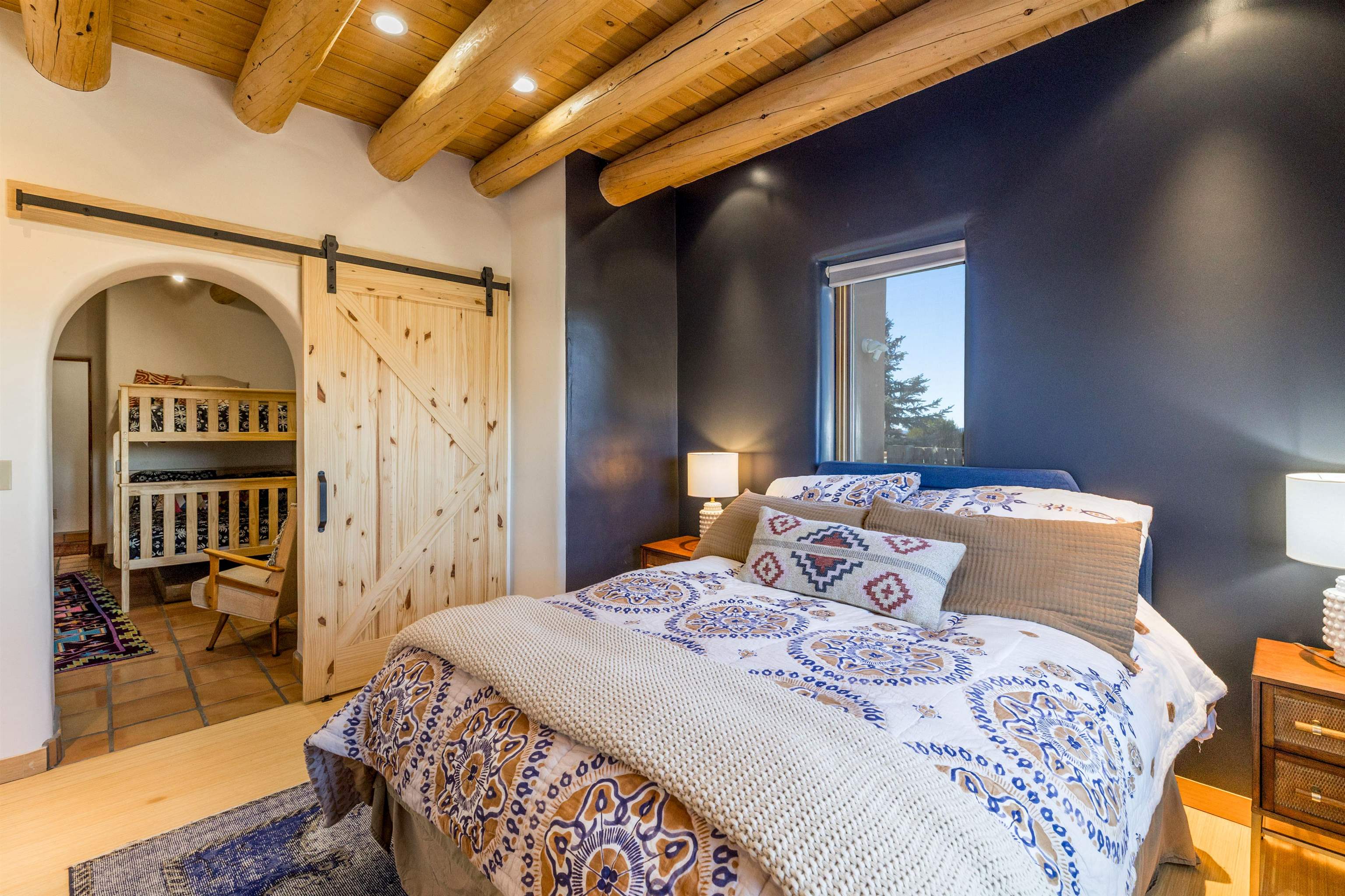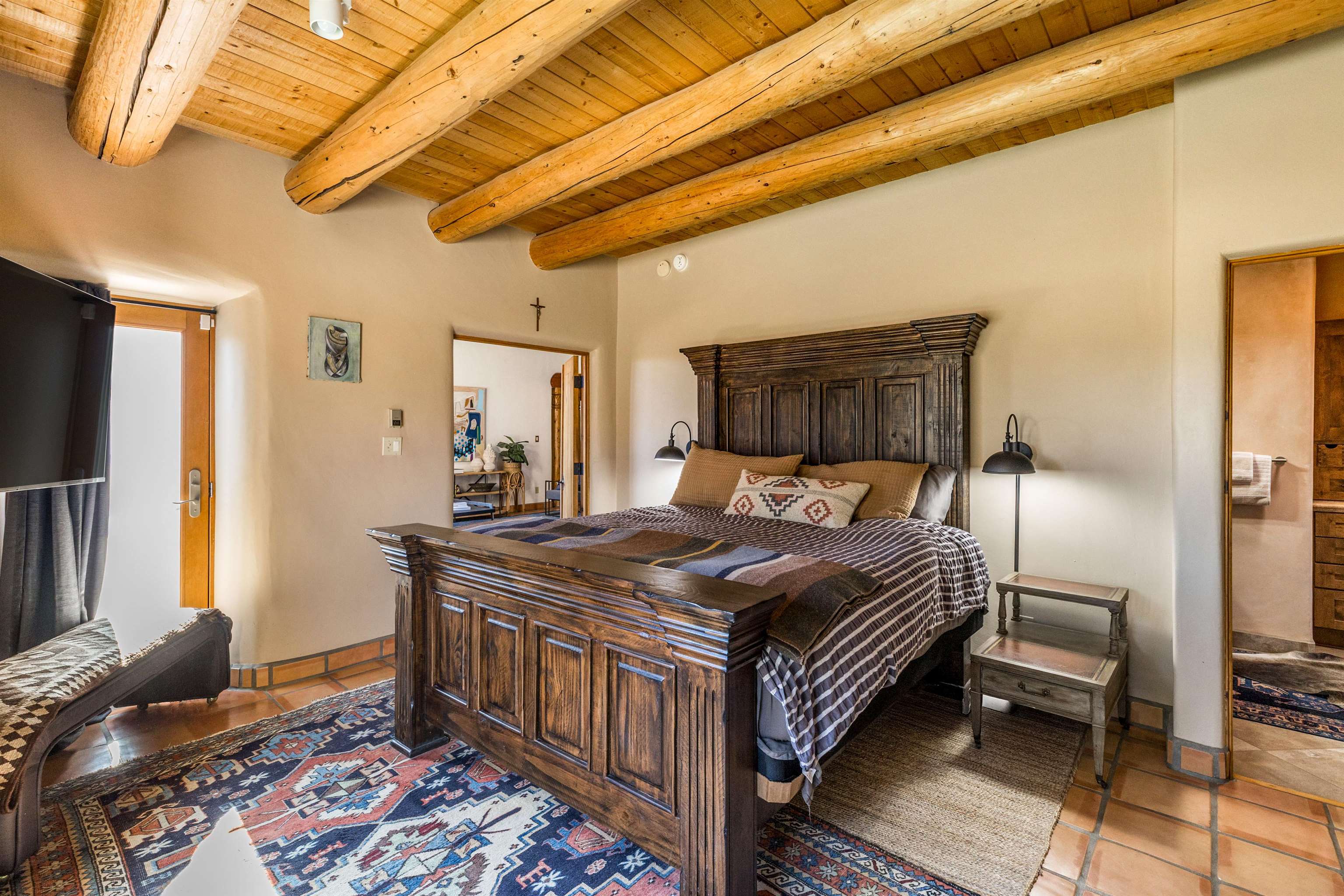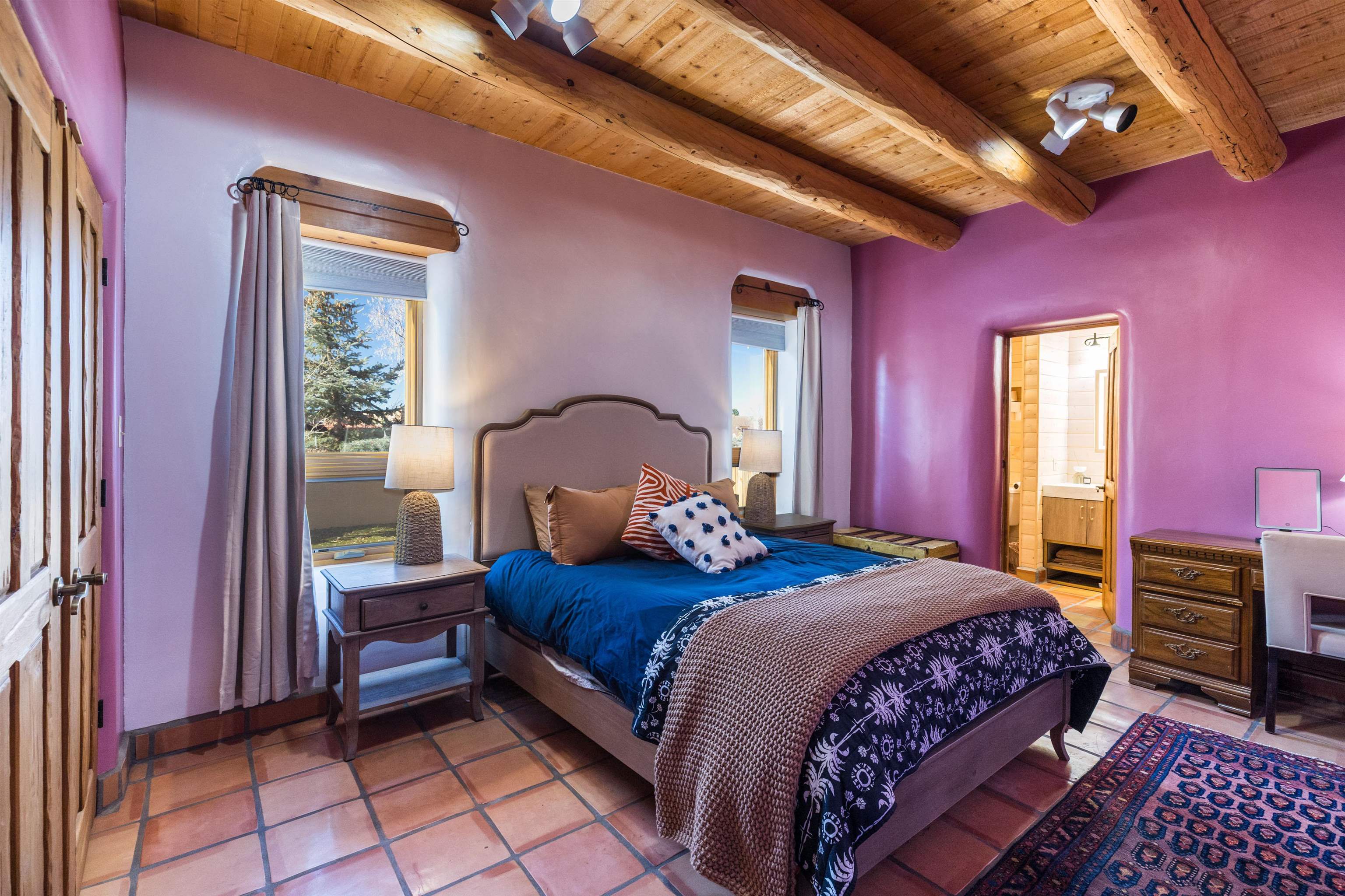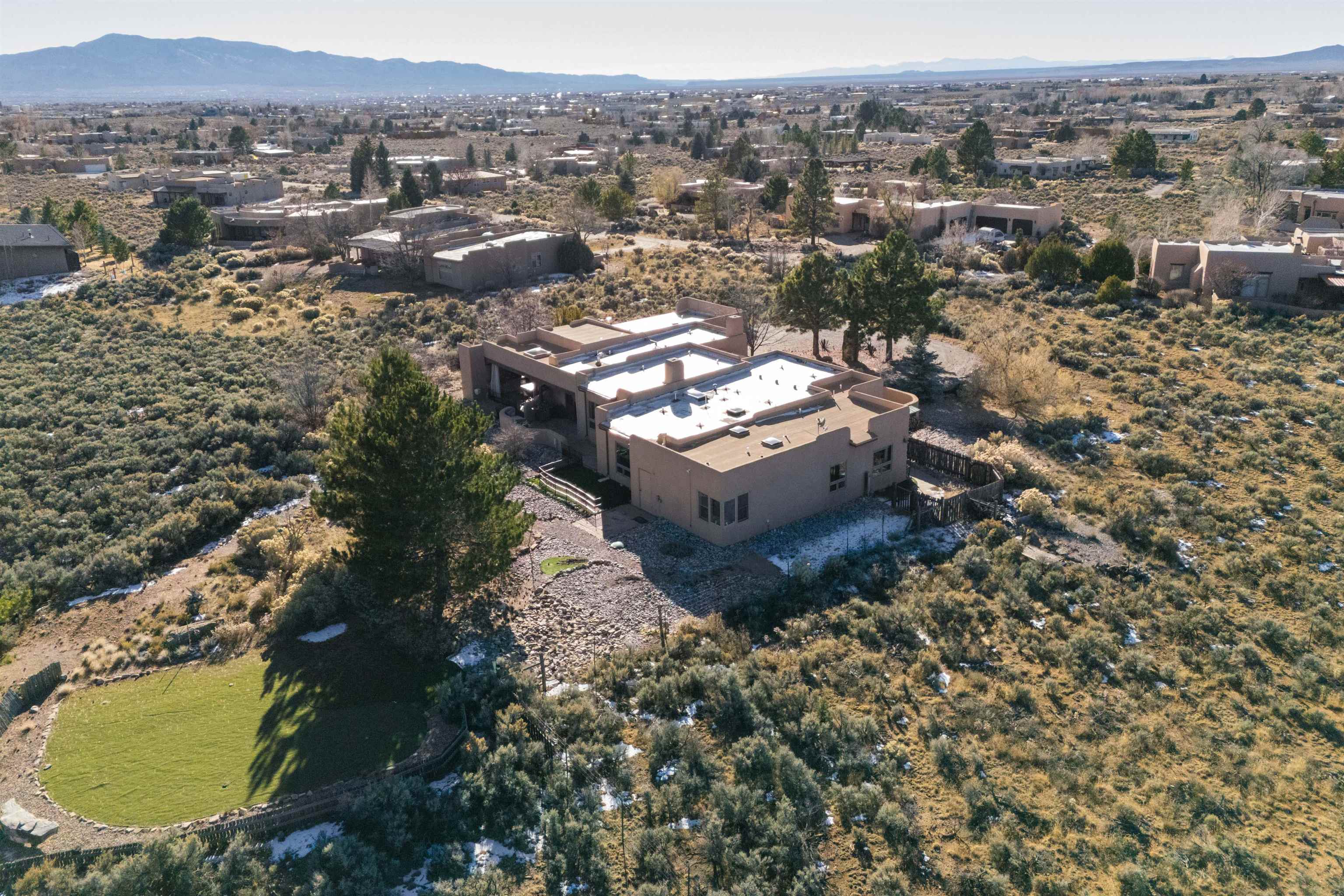Bring the entire gang! Gorgeous adobe home in the desirable Upper Colonias neighborhood is perfectly positioned between the Town of Taos and Taos Ski Valley at the end of the road with expansive mountain views. Adobe construction, Viga wood beams on the ceilings, two southwestern style fireplaces, saltillo tile- all the beautiful, authentic features that are, sadly, disappearing from our market. This house has it all-4 bedrooms, three baths, two living rooms, a cozy dining room with a fireplace, and a bonus artist's studio/project room with a utility sink, loads of storage and lots of windows bringing in natural light from the north and east. The primary bedroom has large windows with sweeping views of the mountains, a luxurious 6-piece bath and a gigantic walk-in closet with generous built-in storage. The chef's kitchen has great appliances, a large island for counter top dining and direct access to a long portal, partially covered with a grill and entertaining space with front-row views of Taos Mountain. Great spaces for gathering, entertaining, or quietly unwinding after a long day on the river or playing in the mountains. This home is being sold with some furnishings and others are available on a separate bill of sale. Held by the Mountain: a North-side Adobe retreat.
