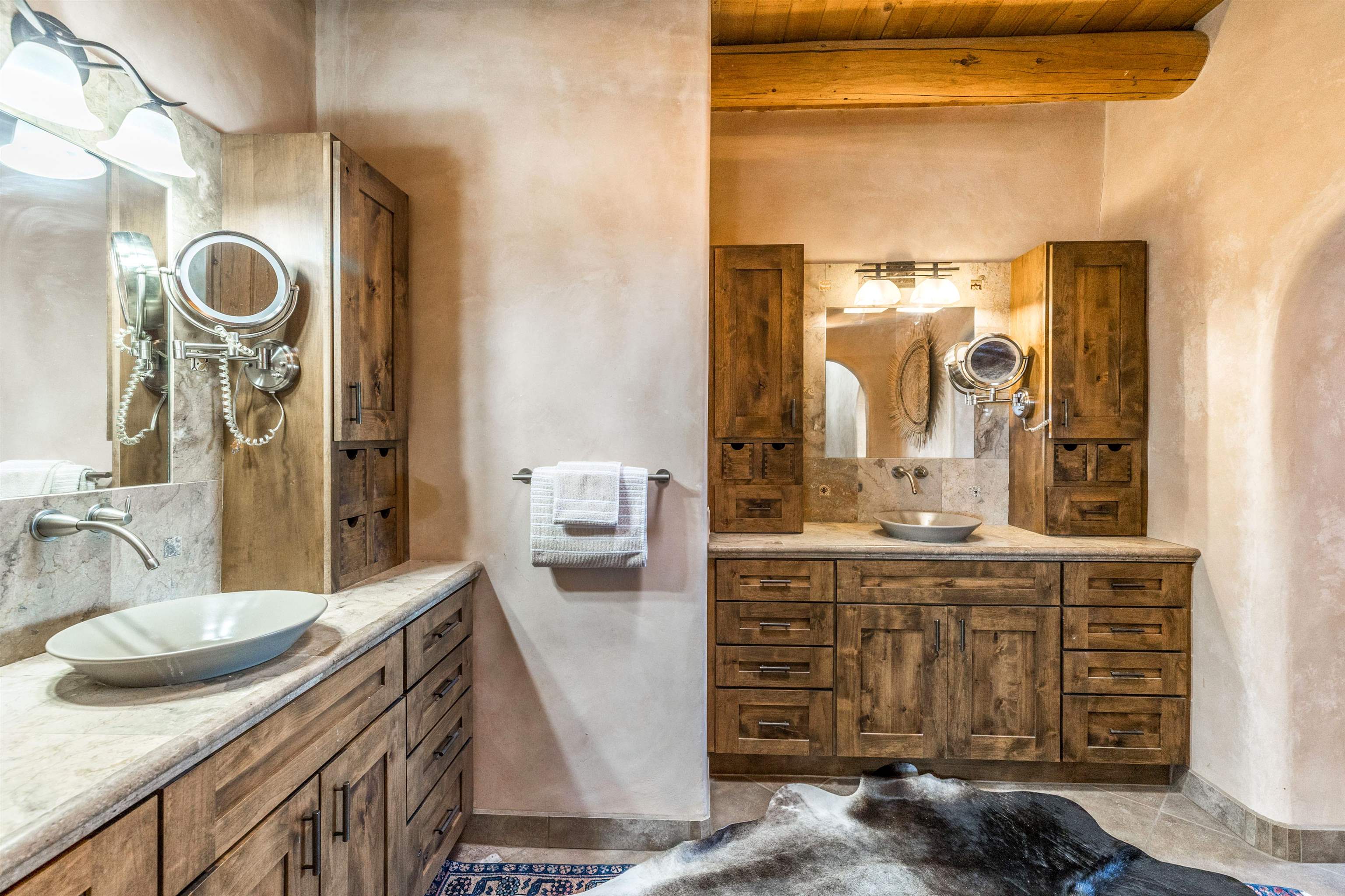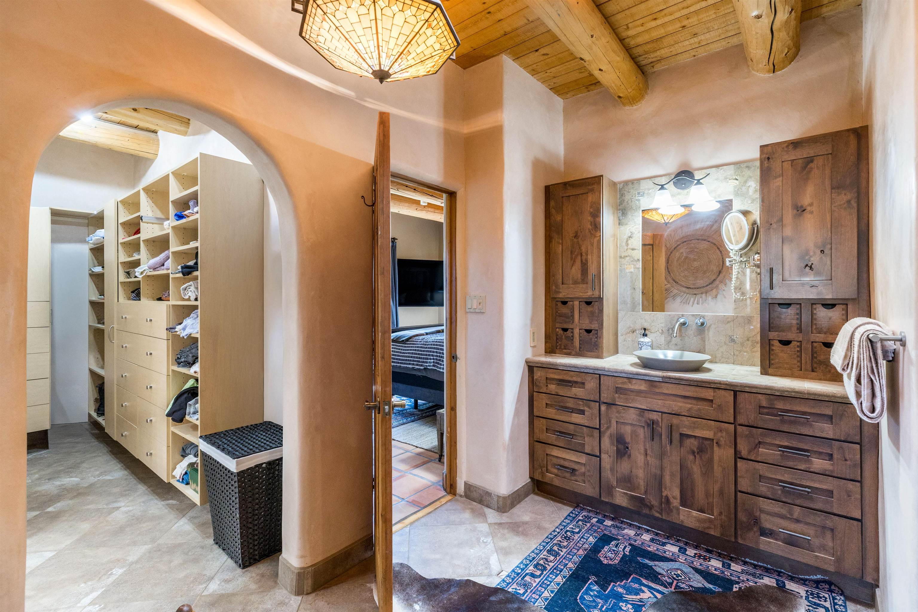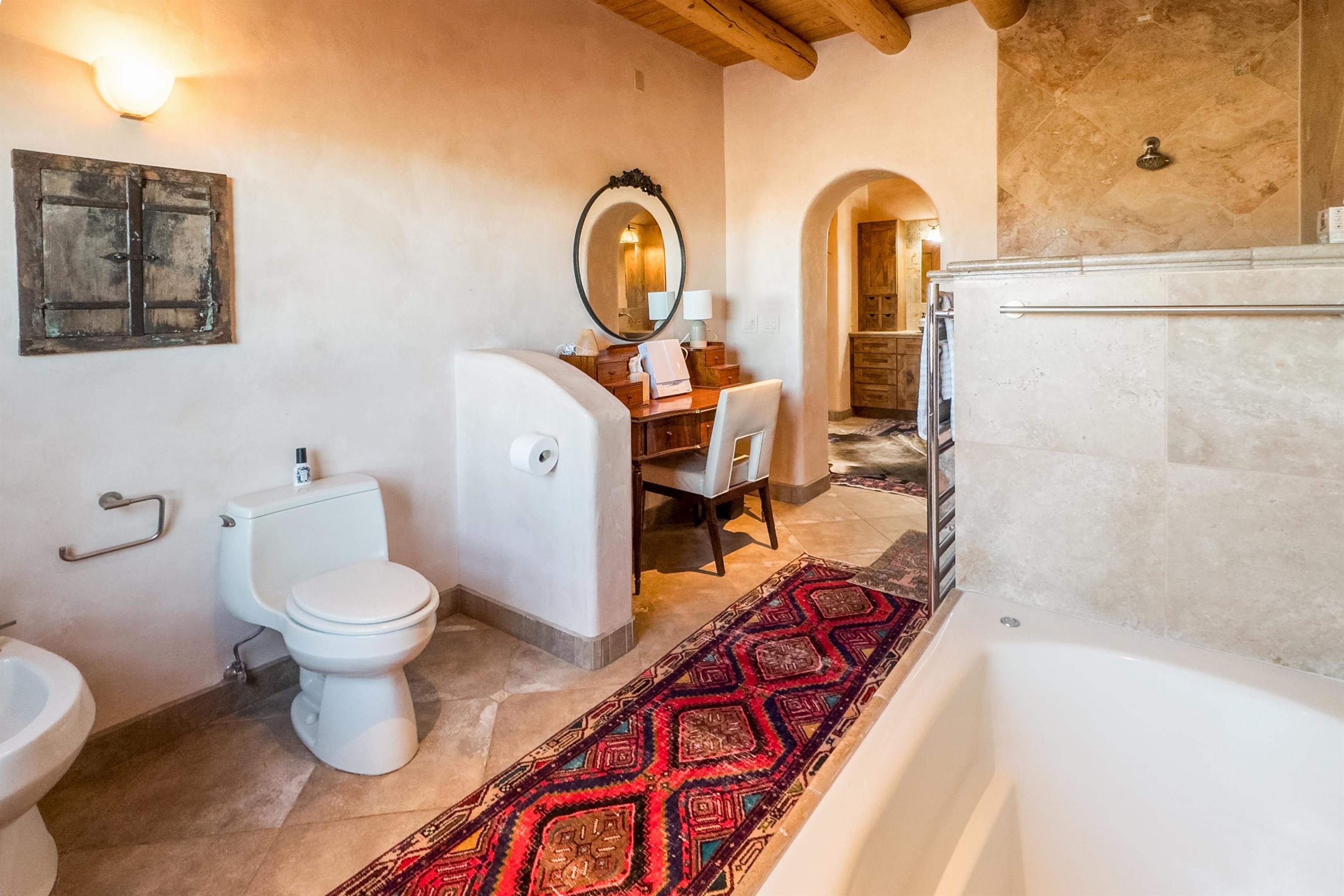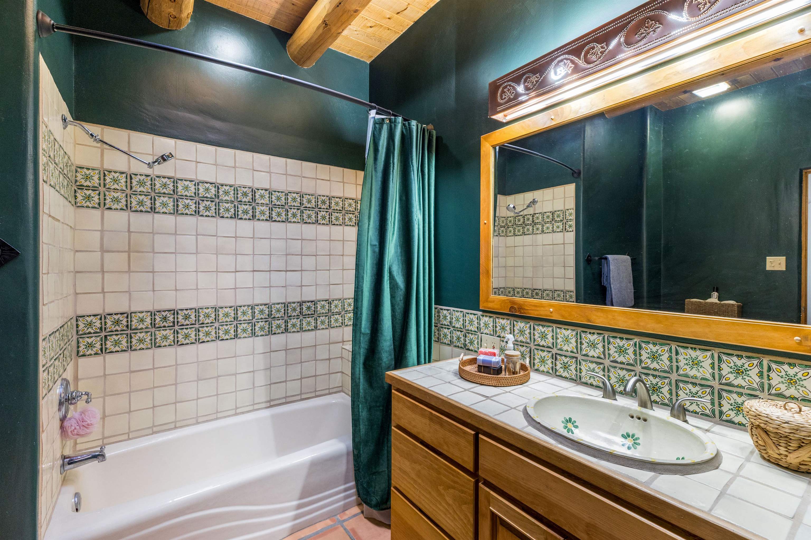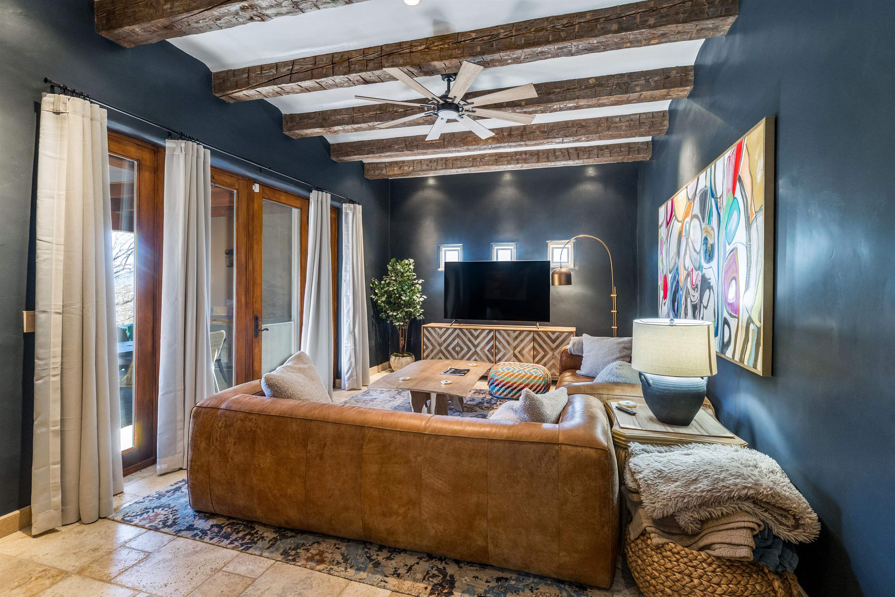 Bring the entire gang! Gorgeous adobe home in the desirable Upper Colonias neighborhood is perfectly positioned between the Town of Taos and Taos Ski Valley at the end of the road with expansive mountain views. Adobe construction, Viga wood beams on the ceilings, two southwestern style fireplaces, saltillo tile- all the beautiful, authentic features that are, sadly, disappearing from our market. This house has it all-4 bedrooms, three baths, two living rooms, a cozy dining room with a fireplace, and a bonus artist's studio/project room with a utility sink, loads of storage and lots of windows bringing in natural light from the north and east. The primary bedroom has large windows with sweeping views of the mountains, a luxurious 6-piece bath and a gigantic walk-in closet with generous built-in storage. The chef's kitchen has great appliances, a large island for counter top dining and direct access to a long portal, partially covered with a grill and entertaining space with front-row views of Taos Mountain. Great spaces for gathering, entertaining, or quietly unwinding after a long day on the river or playing in the mountains. This home is being sold with some furnishings and others are available on a separate bill of sale. Held by the Mountain: a North-side Adobe retreat.