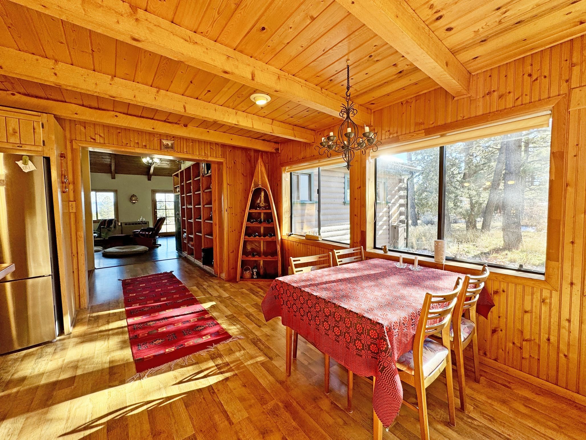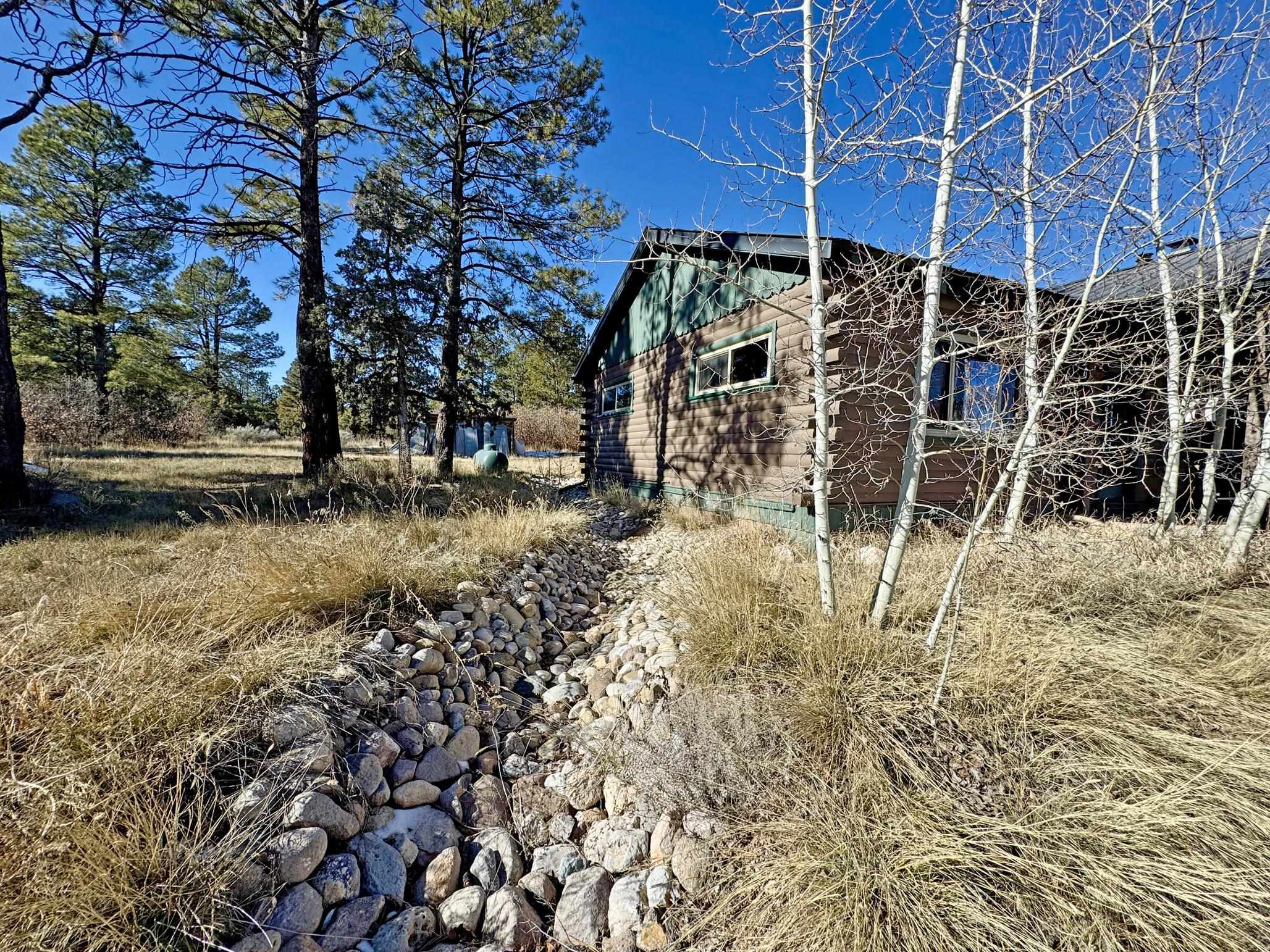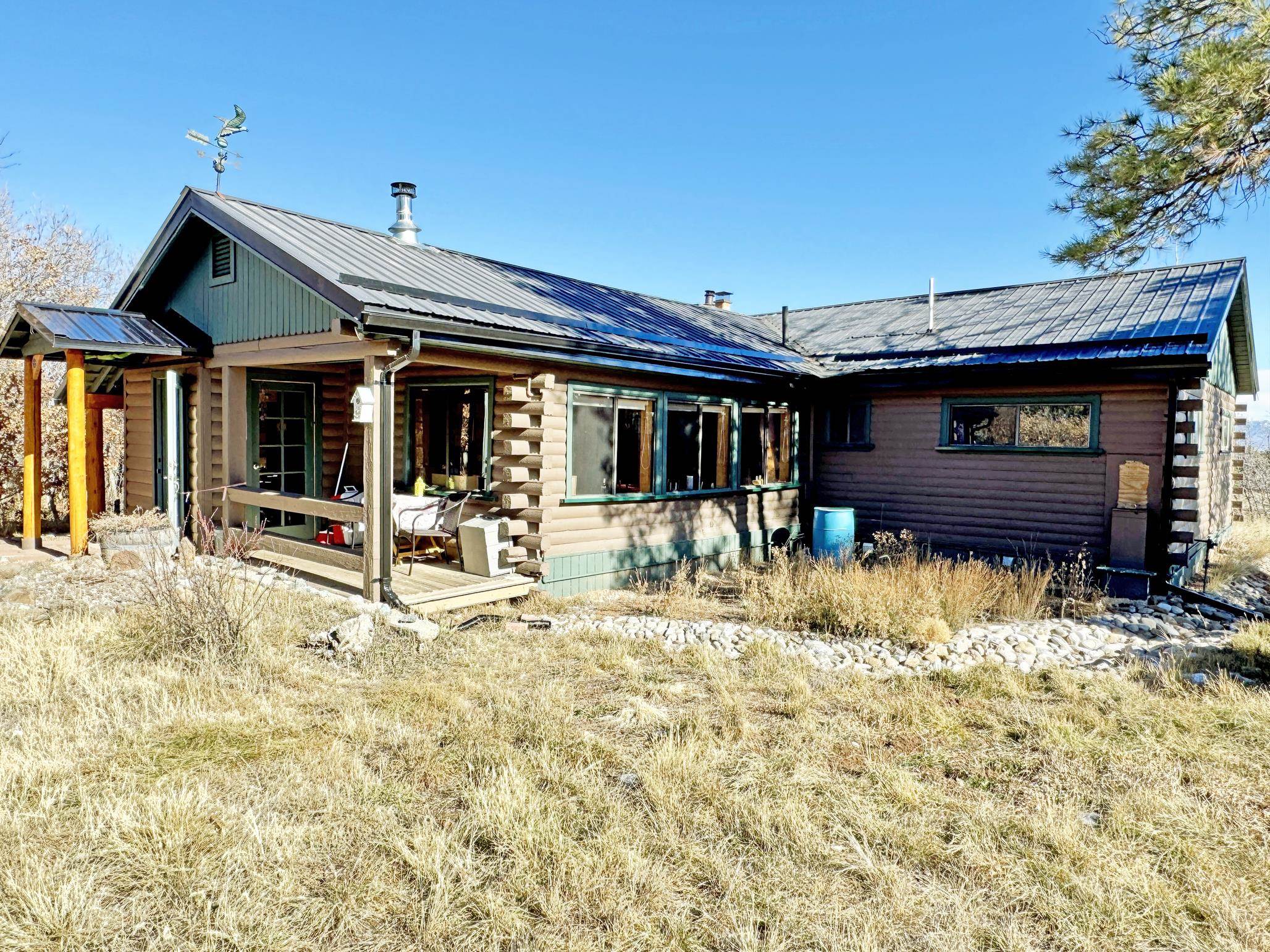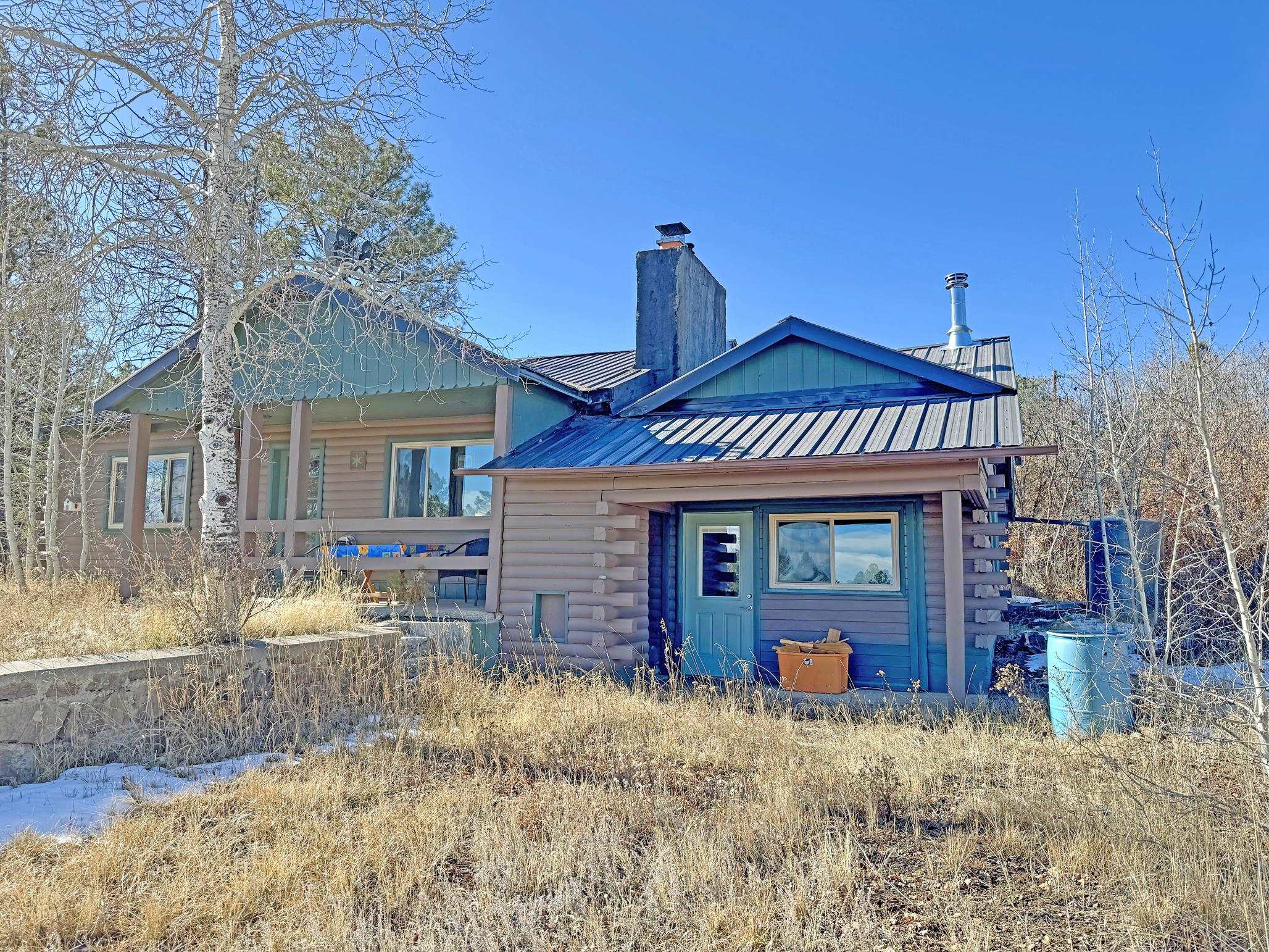 Escape to your own piece of Northern New Mexico paradise! This beautifully maintained split-level premium log cabin in the peaceful Highland Estates subdivision of Tres Piedras offers the perfect blend of rustic charm and modern updates. Surrounded by stunning mountain views, wide-open spaces, and starry night skies, this property is ideal for those seeking privacy and outdoor adventure such as hiking, skiing, rafting and the Rio Grande Gorge. This cabin in the woods is located in the beautiful Tusas Mountains half an hour west of Taos, half an hour north of Ojo Caliente Mineral Hot Springs, and an hour and a half away from Santa Fe. Step inside to vaulted ceilings, warm wood accents, and multiple heating sources for cozy year-round comfort: wood stoves in the kitchen, living room, and expansive primary suite (converted from the original garage), wall heaters in the living room and primary, plus luxurious in-floor radiant heat in the main bathroom. The main level features an open kitchen with hardwood floors and brand-new stainless-steel refrigerator and range, an inviting living room, dining room (currently used as a home office) with authentic Saltillo tiles, a primary suite with cement floors and private wood stove, two guest bedrooms with cork flooring and ceiling fans, and the main bathroom. The fully finished basement adds versatile living space with tile floors throughout, an additional bedroom, 3/4 bathroom, and plenty of room for a family room, guest quarters, or recreation area. Enjoy outdoor living at its finest with two covered porches--one east-facing for morning coffee and one west-facing for spectacular sunsets. The 2-acre property is fully fenced with chain-link for privacy and security, and includes a storage shed, garden shed, and wood shed. Recent upgrades include all-new rain gutters, a new mudroom, a one year old on demand electric water heater, a French drain where water from graveled driveway drains off from and electric heating cables on the roof to effortlessly melt winter snow. Practical features abound: propane tank for gas heating/cooking, septic system, community water, reliable cell service and high-speed fiber optic internet already on the property. This turnkey mountain retreat is ready for you to move in and start living the serene Tres Piedras lifestyle.