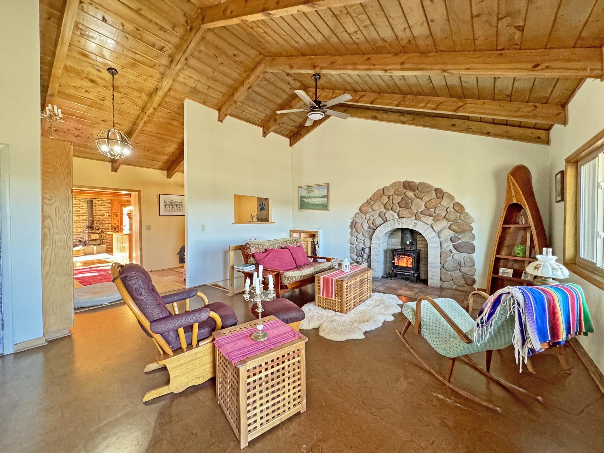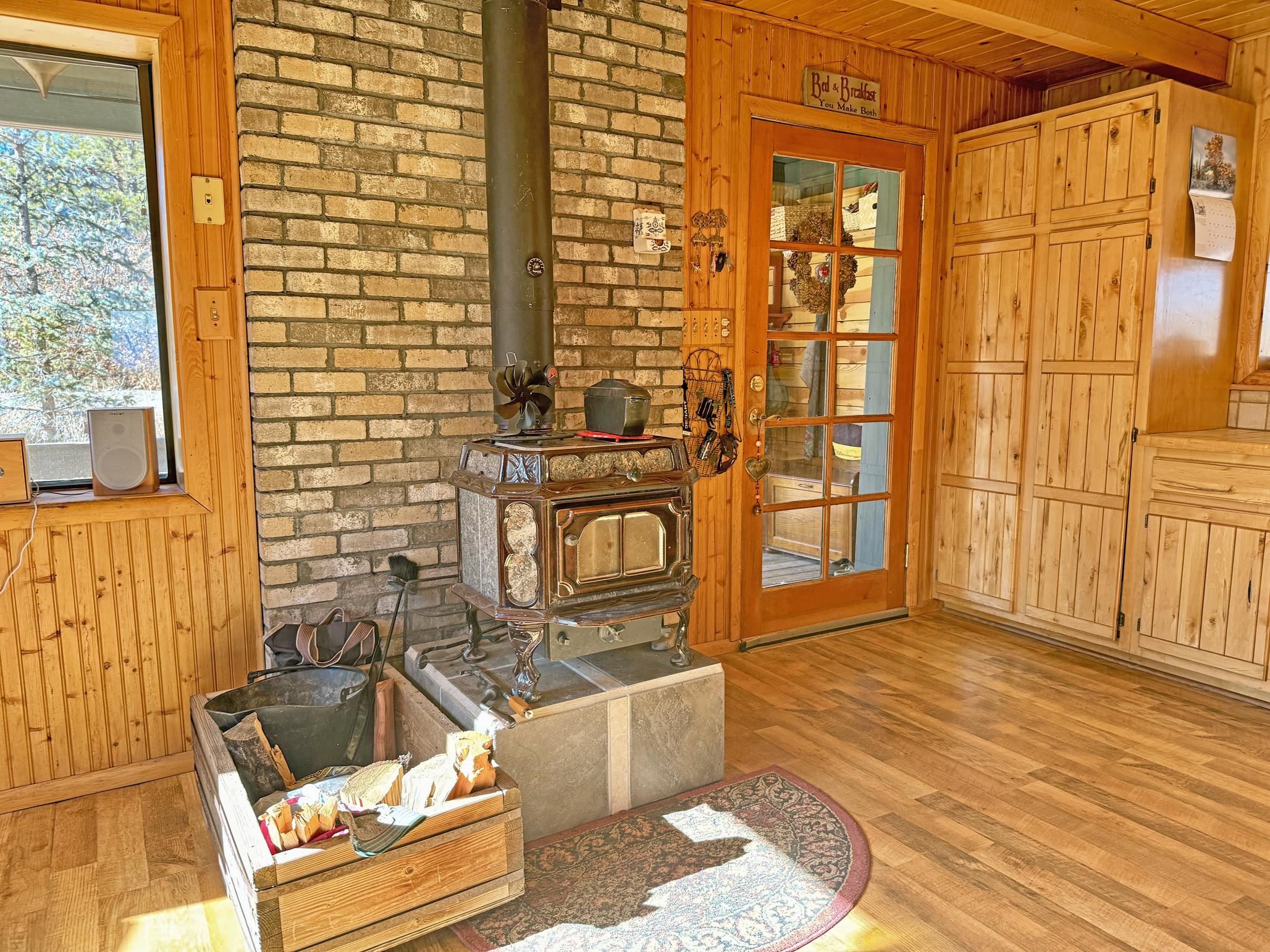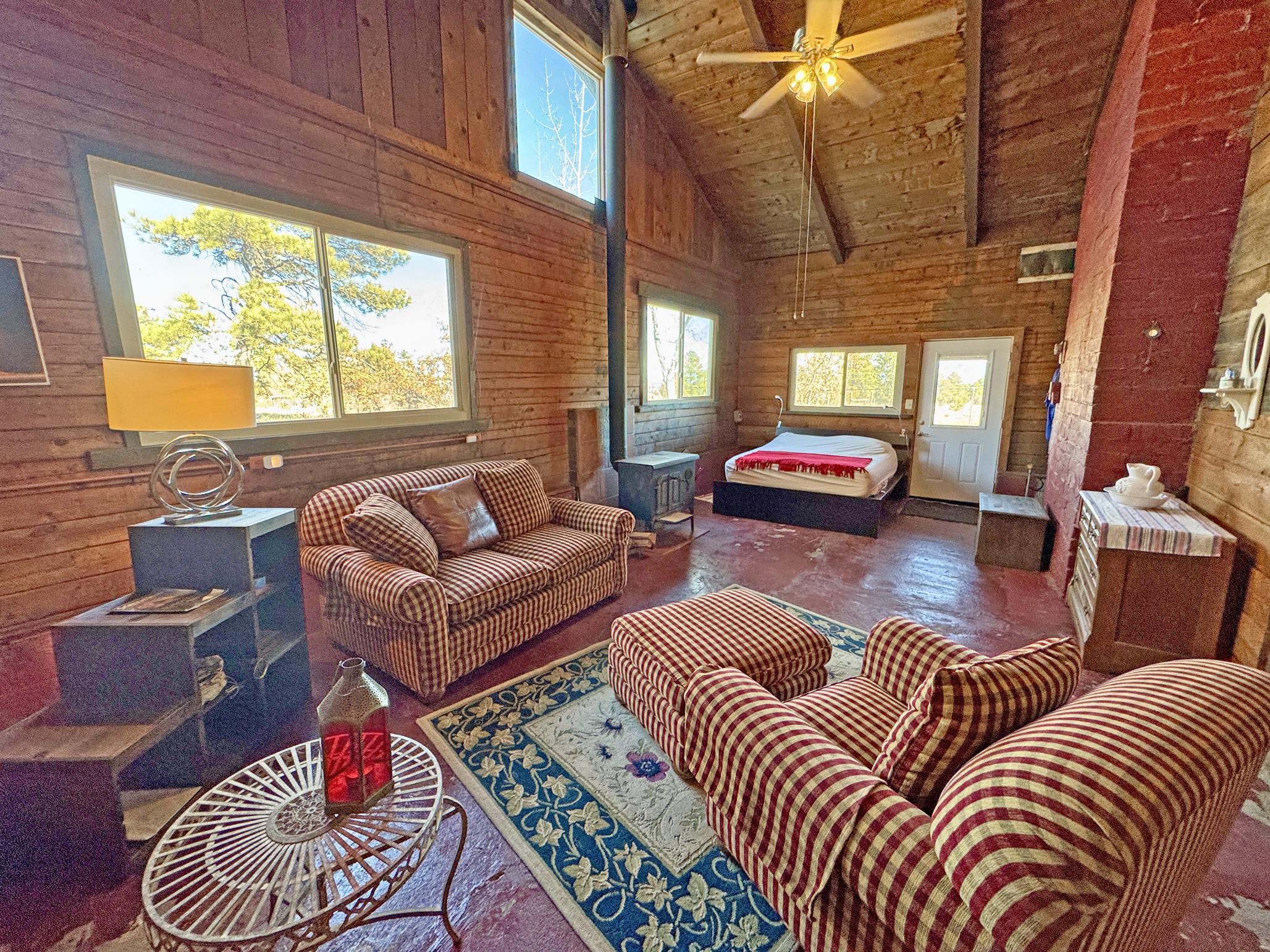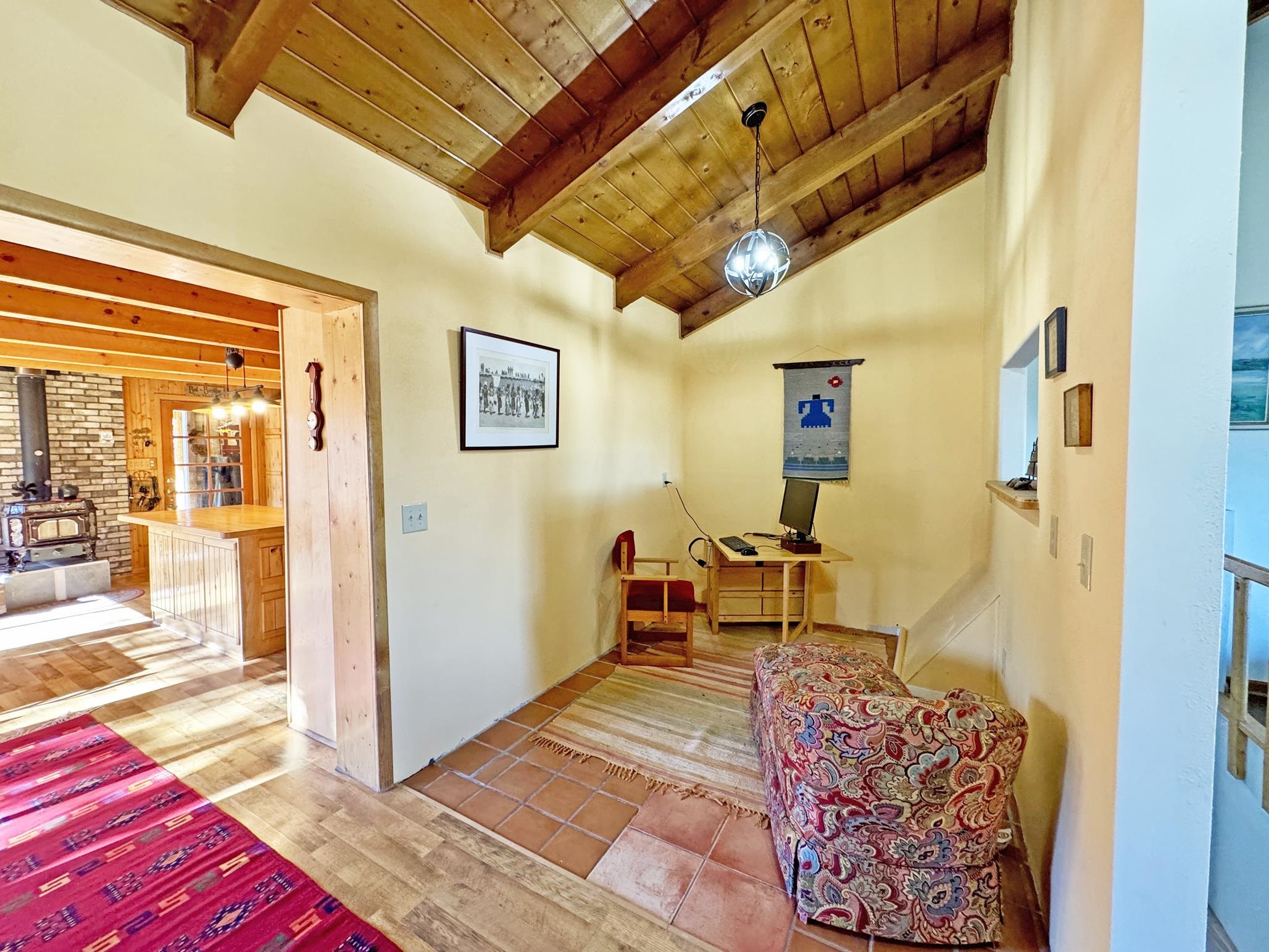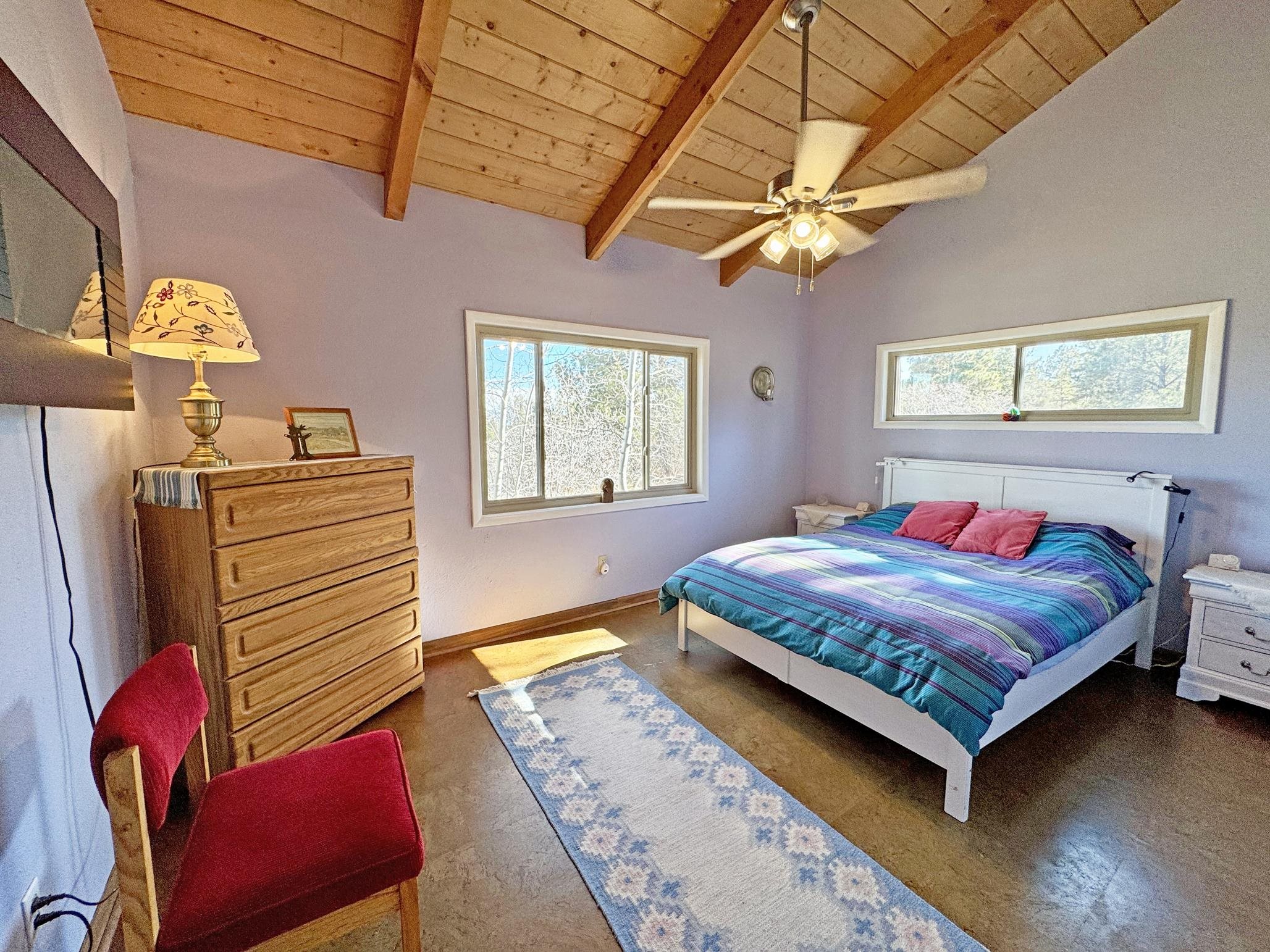 Escape to your own piece of Northern New Mexico paradise! This beautifully maintained split-level premium log cabin in the peaceful Highland Estates subdivision of Tres Piedras offers the perfect blend of rustic charm and modern updates. Surrounded by stunning mountain views, wide-open spaces, and starry night skies, this property is ideal for those seeking privacy and outdoor adventure such as hiking, skiing, rafting and the Rio Grande Gorge. This cabin in the woods is located in the beautiful Tusas Mountains half an hour west of Taos, half an hour north of Ojo Caliente Mineral Hot Springs, and an hour and a half away from Santa Fe. Step inside to vaulted ceilings, warm wood accents, and multiple heating sources for cozy year-round comfort: wood stoves in the kitchen, living room, and expansive primary suite (converted from the original garage), wall heaters in the living room and primary, plus luxurious in-floor radiant heat in the main bathroom. The main level features an open kitchen with hardwood floors and brand-new stainless-steel refrigerator and range, an inviting living room, dining room (currently used as a home office) with authentic Saltillo tiles, a primary suite with cement floors and private wood stove, two guest bedrooms with cork flooring and ceiling fans, and the main bathroom. The fully finished basement adds versatile living space with tile floors throughout, an additional bedroom, 3/4 bathroom, and plenty of room for a family room, guest quarters, or recreation area. Enjoy outdoor living at its finest with two covered porches--one east-facing for morning coffee and one west-facing for spectacular sunsets. The 2-acre property is fully fenced with chain-link for privacy and security, and includes a storage shed, garden shed, and wood shed. Recent upgrades include all-new rain gutters, a new mudroom, a one year old on demand electric water heater, a French drain where water from graveled driveway drains off from and electric heating cables on the roof to effortlessly melt winter snow. Practical features abound: propane tank for gas heating/cooking, septic system, community water, reliable cell service and high-speed fiber optic internet already on the property. This turnkey mountain retreat is ready for you to move in and start living the serene Tres Piedras lifestyle.