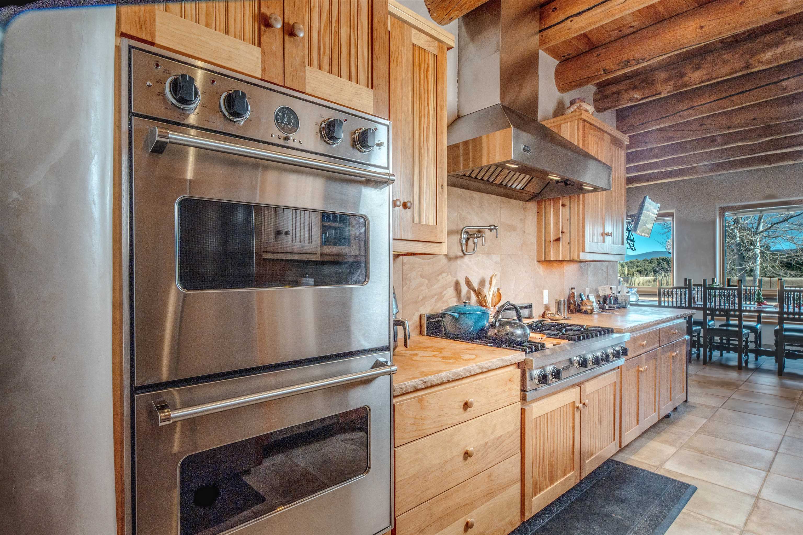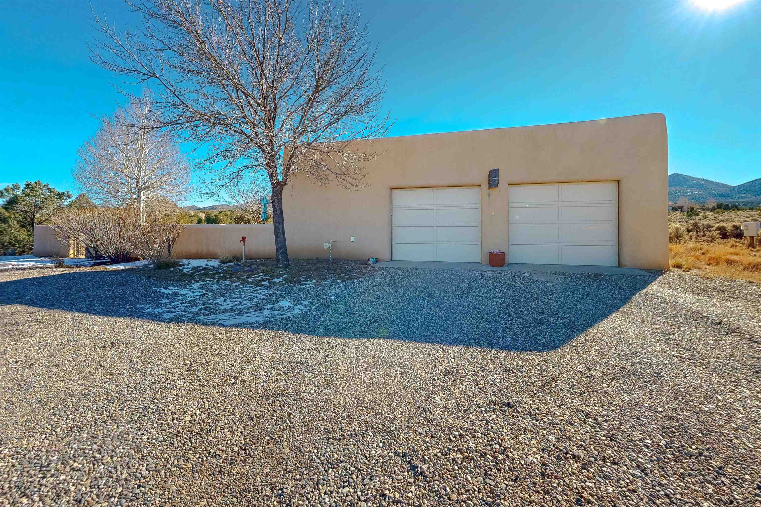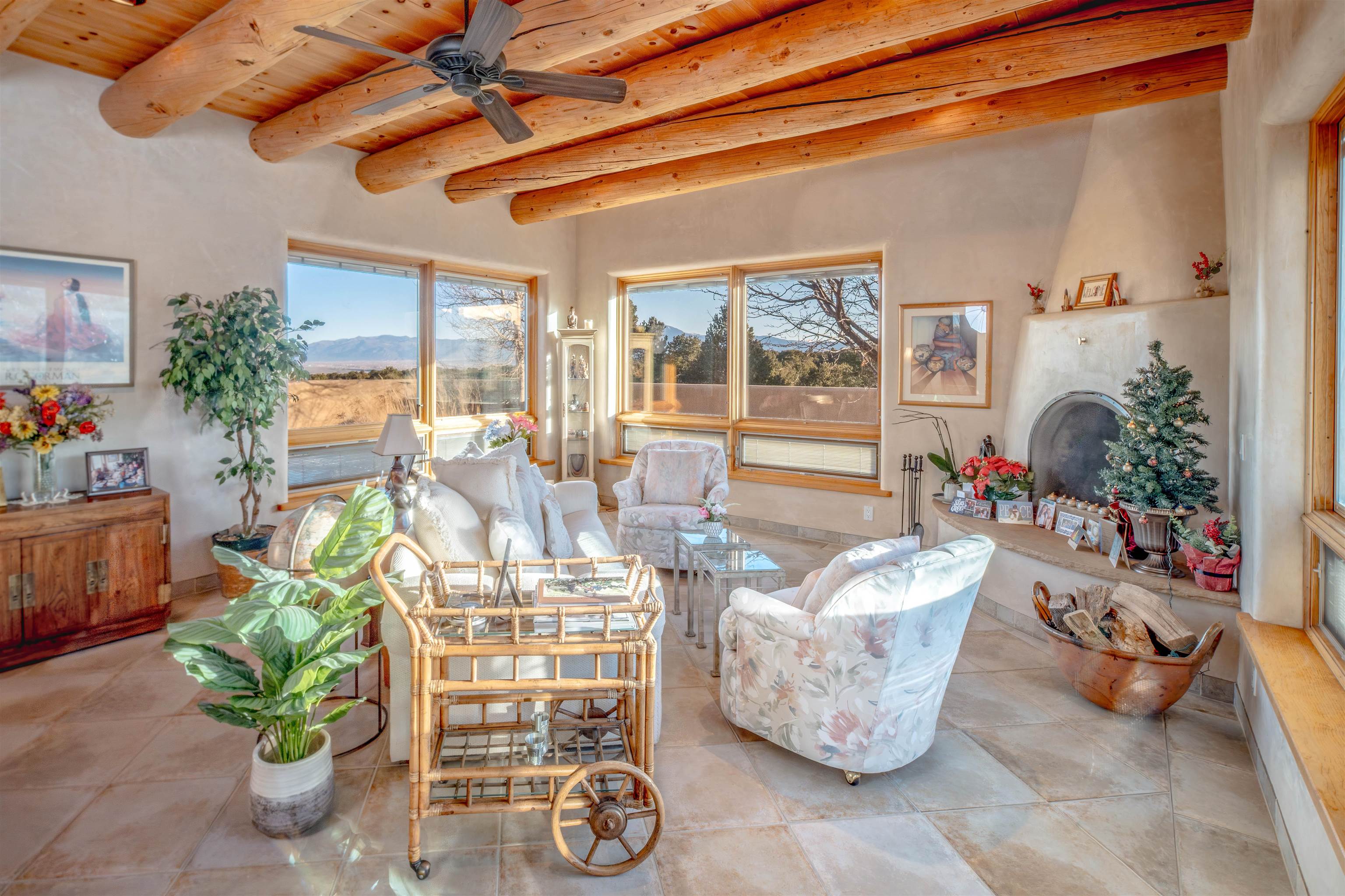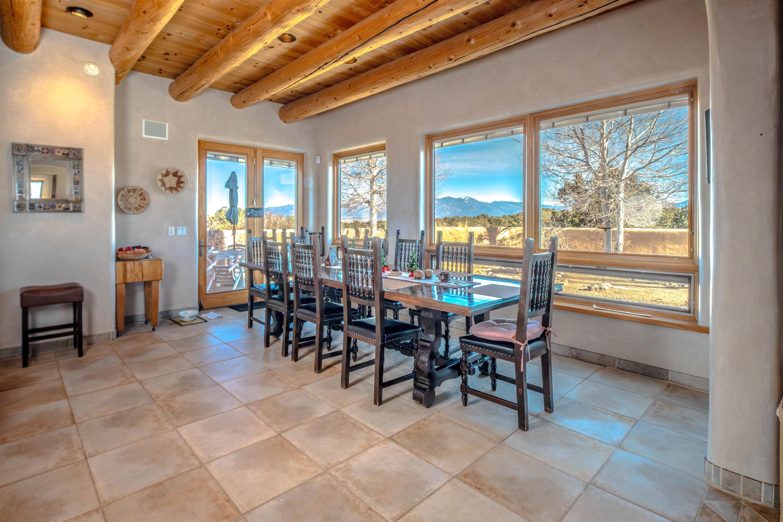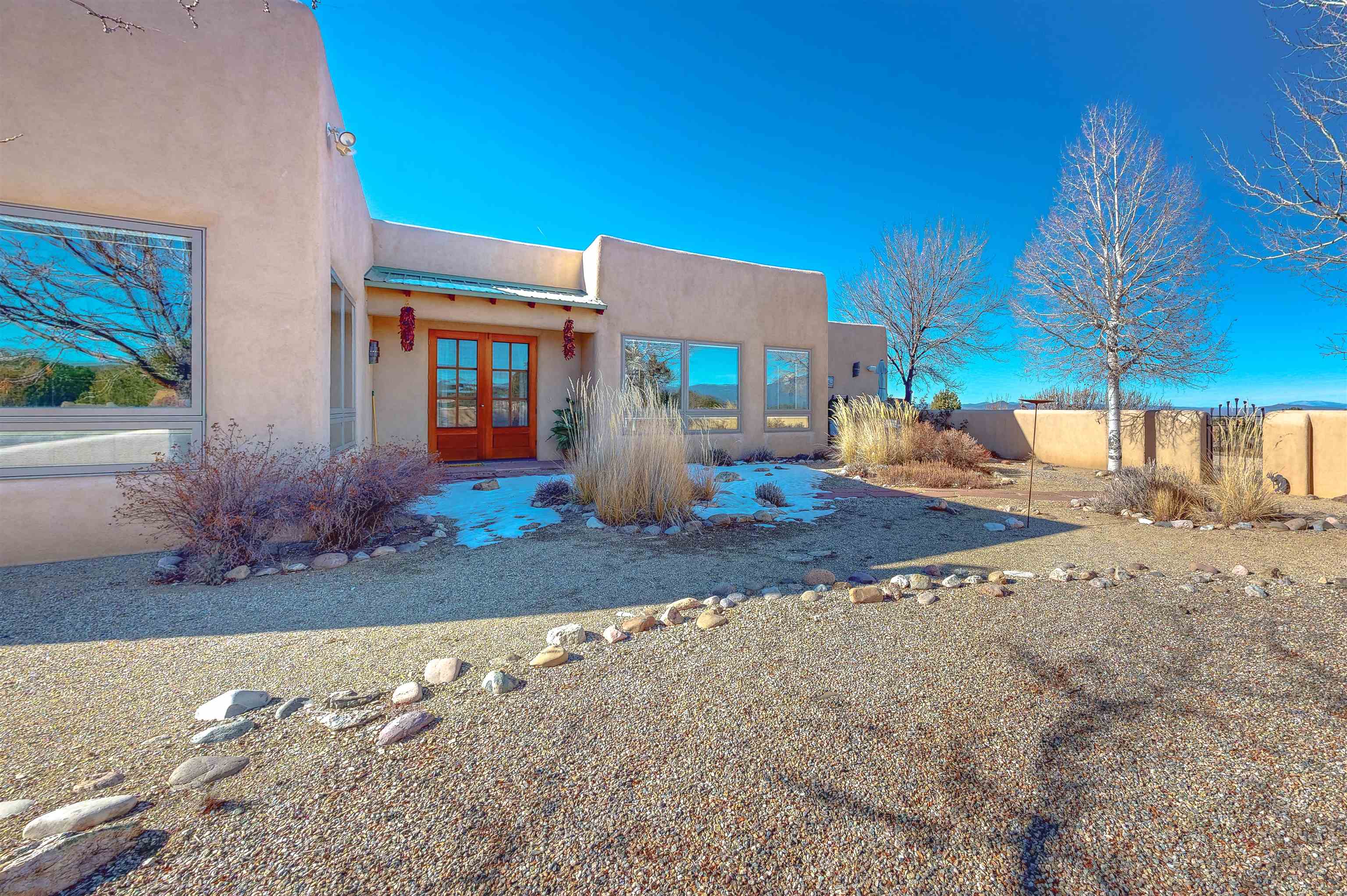 Introducing La Esencia de El Mirador, a home designed for the essence of entertaining: sharing life, good food, and spectacular views. Located in the peaceful county setting of Ranchos de Taos in the exclusive El Mirador subdivision, La Esencia de El Mirador is an exceptional single-level residence offering approximately 2,600 square feet of refined living space, masterfully crafted by respected builder Ken Wolosin - known for his quality construction and meticulous attention to detail. A private security gate welcomes you onto the property, immediately setting the tone for the thoughtful design, elevated finishes, and enduring craftsmanship found throughout. Inside, the open-concept floor plan lives effortlessly with no interior steps, elegant porcelain stone floors, and radiant in-floor heating that extends into the expansive 779 sq ft heated garage with storage areas. The inviting living room is anchored by a cozy fireplace and framed by Pella triple-pane R-4 windows, filling the home with natural light while delivering outstanding energy efficiency and serene comfort. Pella doors and windows are featured throughout, with enclosed blinds for additional insulation, and reinforcing the home's commitment to quality and performance. The chef's kitchen is a true gathering space, thoughtfully designed for both daily living and entertaining. Viking appliances - including a gas cooktop with hood and double electric wall ovens - are complemented by stone countertops, a dedicated coffee counter, and a well-planned pantry area complete with a wine fridge and microwave. A separate wine closet adds an extra layer of sophistication and convenience rarely found at this level. The primary suite offers a private retreat, featuring a custom California walk-in closet and a luxurious spa-inspired bathroom with an oversized soaking tub and bidet. Two additional bedrooms and a beautifully appointed full guest bath provide comfort and flexibility for family and guests alike. Additional upgrades enhance both form and function, including a Bry fire-resistant roof, ceiling fans in every room, and a security system installed during construction. The spacious utility room includes a deep sink, cabinetry, ample storage, and a gas dryer. The radiant-heated garage is fully finished and exceptionally well-equipped, offering a workbench, wall organizers, a storage room, and a dedicated mechanical room - ideal for projects, hobbies, or outdoor gear. The roof is a flat roof with a 1/2" per every foot slope instead of the standard 1/4" per foot slope, allowing for the rain to spew out of the canales feeding all the Aspen trees and wildflowers. The home was also built with 2" of foil faced styrofoam insulation on the exterior and beneath the plaster creating an R40 insulation thickness value. The current owner is the original owner of this home and was heavily involved in its construction and has kept meticulous maintenance records for the entire 18 years. The home is also being sold mostly furnished. Set on 11.93 quiet, open acres, La Esencia de El Mirador offers remarkable privacy, sweeping views, and space to savor the surrounding landscape - an increasingly rare opportunity in today's market. With superior craftsmanship, a thoughtfully designed layout, and high-end finishes throughout, this is a home created to be experienced, shared, and enjoyed. This listing has very detailed exterior and interior videos for your viewing pleasure.