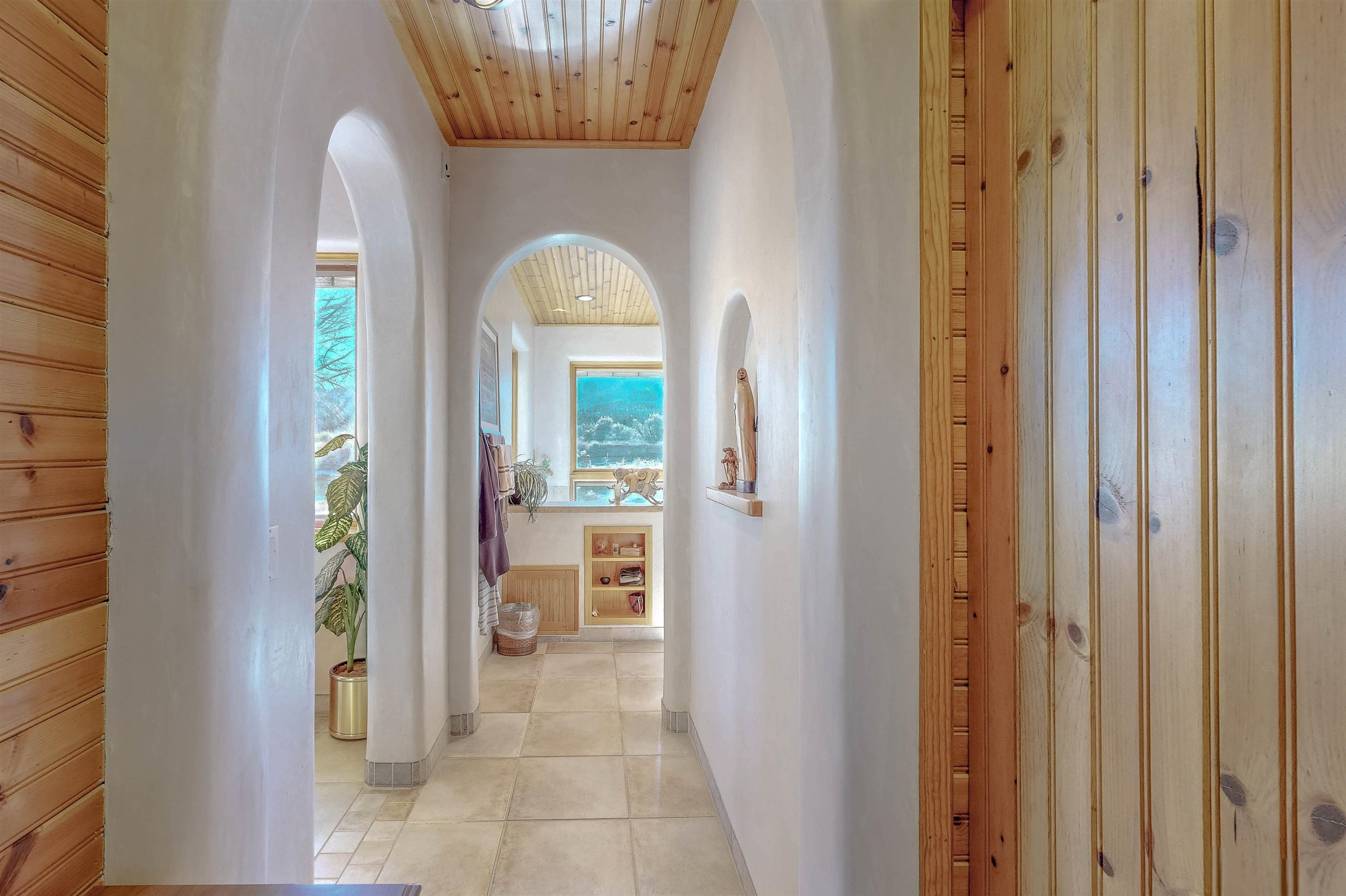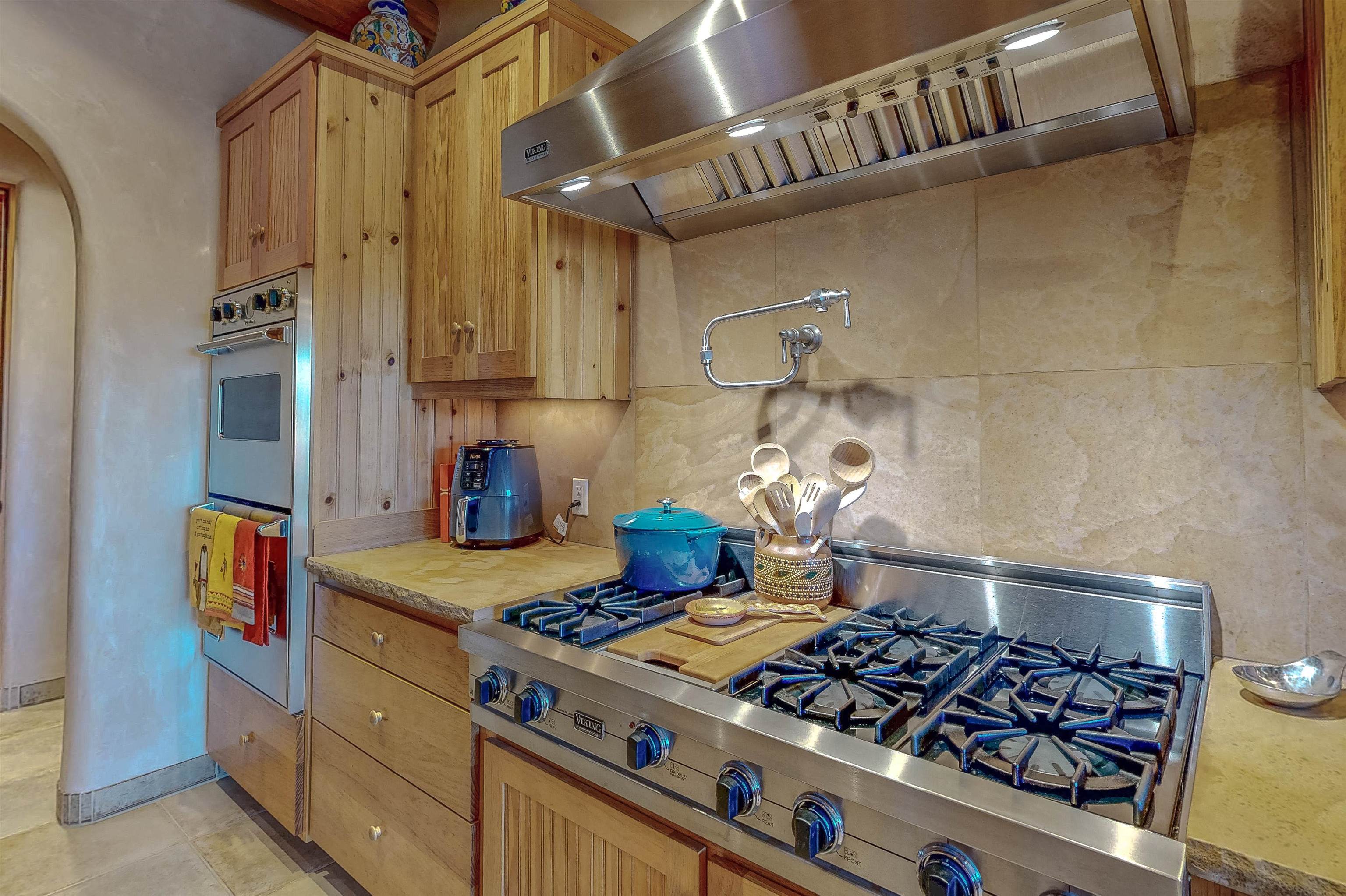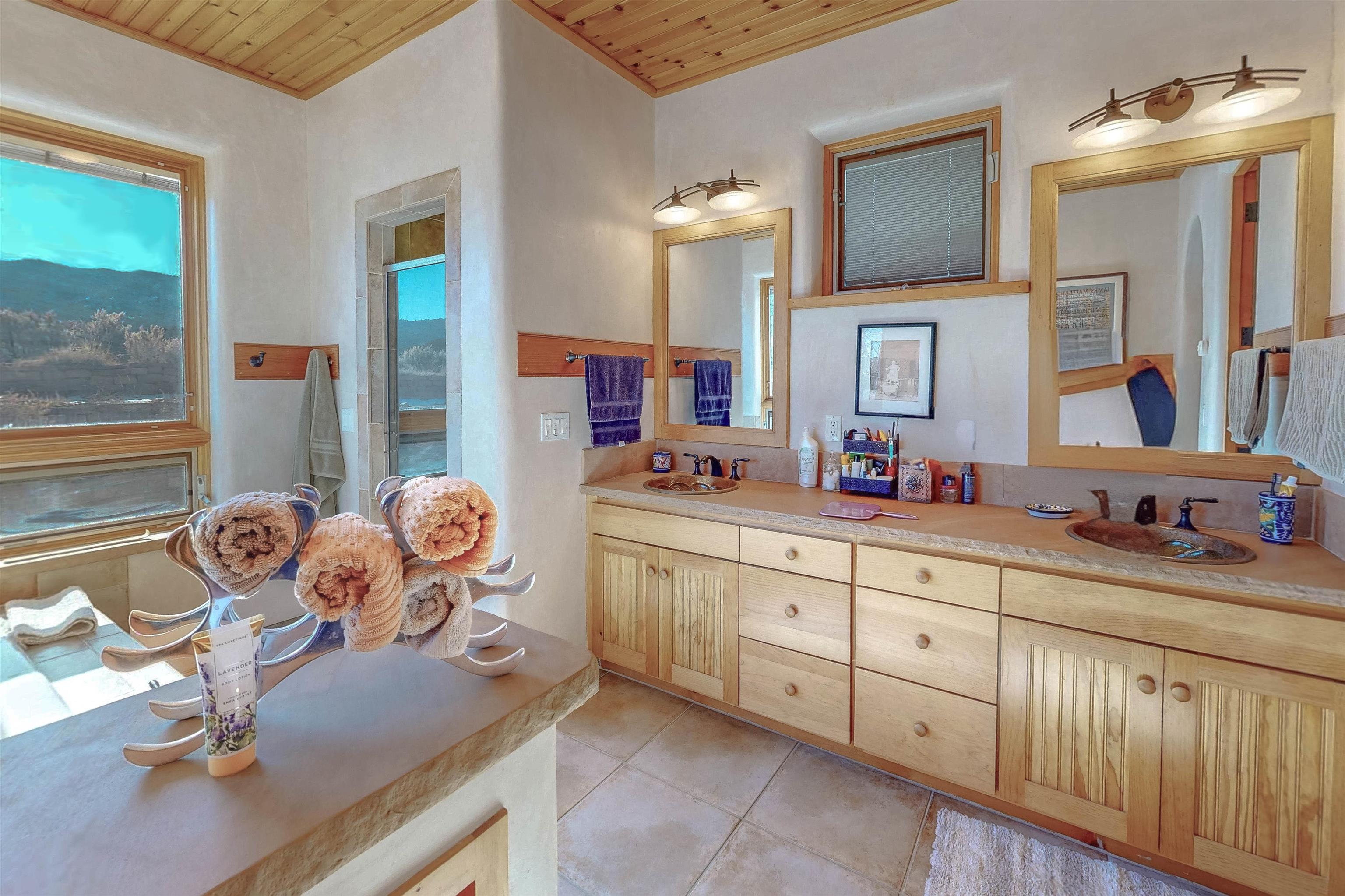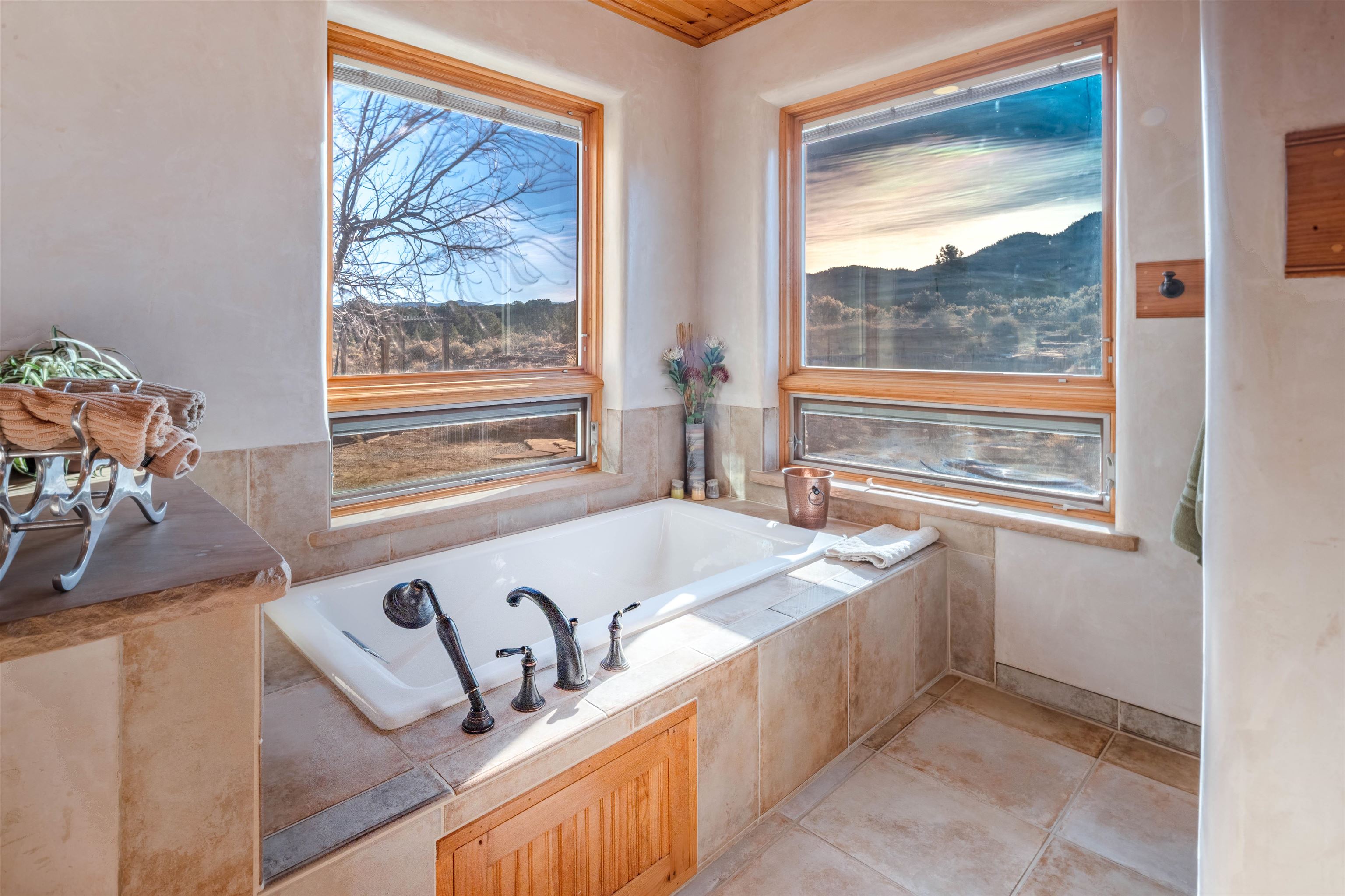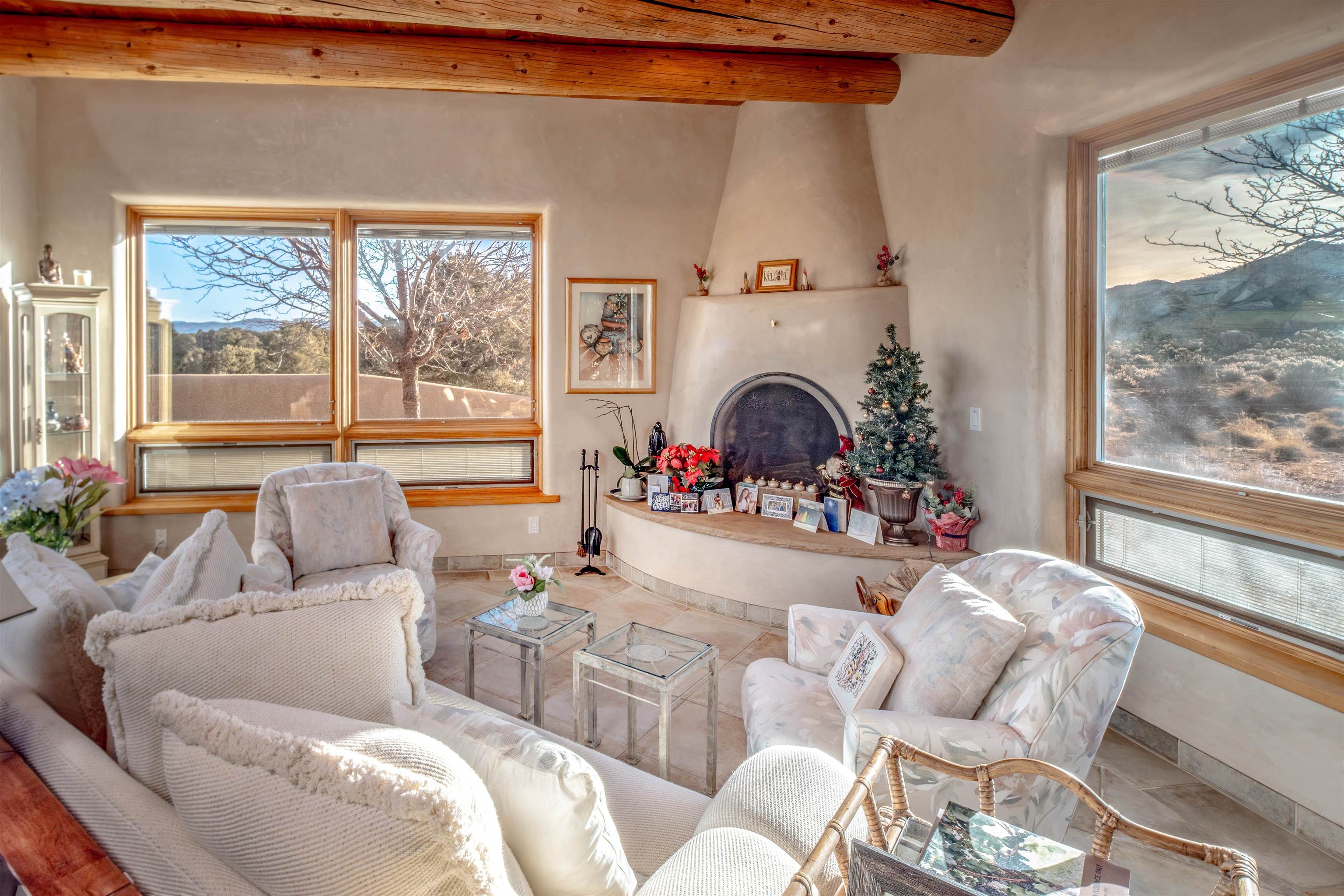 Introducing La Esencia de El Mirador, a home designed for the essence of entertaining: sharing life, good food, and spectacular views. Located in the peaceful county setting of Ranchos de Taos in the exclusive El Mirador subdivision, La Esencia de El Mirador is an exceptional single-level residence offering approximately 2,600 square feet of refined living space, masterfully crafted by respected builder Ken Wolosin - known for his quality construction and meticulous attention to detail. A private security gate welcomes you onto the property, immediately setting the tone for the thoughtful design, elevated finishes, and enduring craftsmanship found throughout. Inside, the open-concept floor plan lives effortlessly with no interior steps, elegant porcelain stone floors, and radiant in-floor heating that extends into the expansive 779 sq ft heated garage with storage areas. The inviting living room is anchored by a cozy fireplace and framed by Pella triple-pane R-4 windows, filling the home with natural light while delivering outstanding energy efficiency and serene comfort. Pella doors and windows are featured throughout, with enclosed blinds for additional insulation, and reinforcing the home's commitment to quality and performance. The chef's kitchen is a true gathering space, thoughtfully designed for both daily living and entertaining. Viking appliances - including a gas cooktop with hood and double electric wall ovens - are complemented by stone countertops, a dedicated coffee counter, and a well-planned pantry area complete with a wine fridge and microwave. A separate wine closet adds an extra layer of sophistication and convenience rarely found at this level. The primary suite offers a private retreat, featuring a custom California walk-in closet and a luxurious spa-inspired bathroom with an oversized soaking tub and bidet. Two additional bedrooms and a beautifully appointed full guest bath provide comfort and flexibility for family and guests alike. Additional upgrades enhance both form and function, including a Bry fire-resistant roof, ceiling fans in every room, and a security system installed during construction. The spacious utility room includes a deep sink, cabinetry, ample storage, and a gas dryer. The radiant-heated garage is fully finished and exceptionally well-equipped, offering a workbench, wall organizers, a storage room, and a dedicated mechanical room - ideal for projects, hobbies, or outdoor gear. The roof is a flat roof with a 1/2" per every foot slope instead of the standard 1/4" per foot slope, allowing for the rain to spew out of the canales feeding all the Aspen trees and wildflowers. The home was also built with 2" of foil faced styrofoam insulation on the exterior and beneath the plaster creating an R40 insulation thickness value. The current owner is the original owner of this home and was heavily involved in its construction and has kept meticulous maintenance records for the entire 18 years. The home is also being sold mostly furnished. Set on 11.93 quiet, open acres, La Esencia de El Mirador offers remarkable privacy, sweeping views, and space to savor the surrounding landscape - an increasingly rare opportunity in today's market. With superior craftsmanship, a thoughtfully designed layout, and high-end finishes throughout, this is a home created to be experienced, shared, and enjoyed. This listing has very detailed exterior and interior videos for your viewing pleasure.