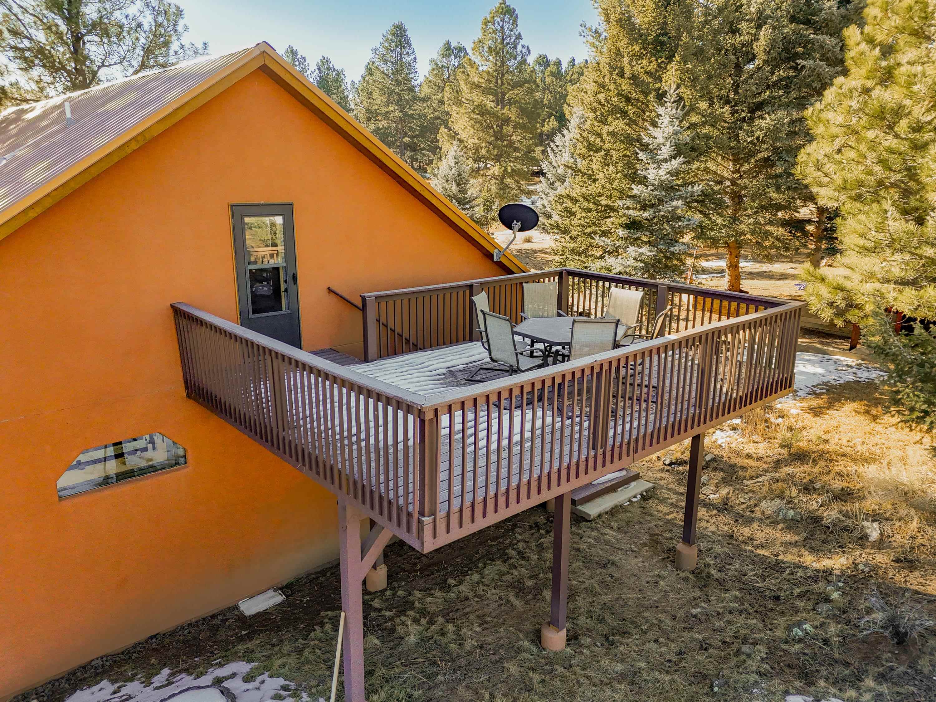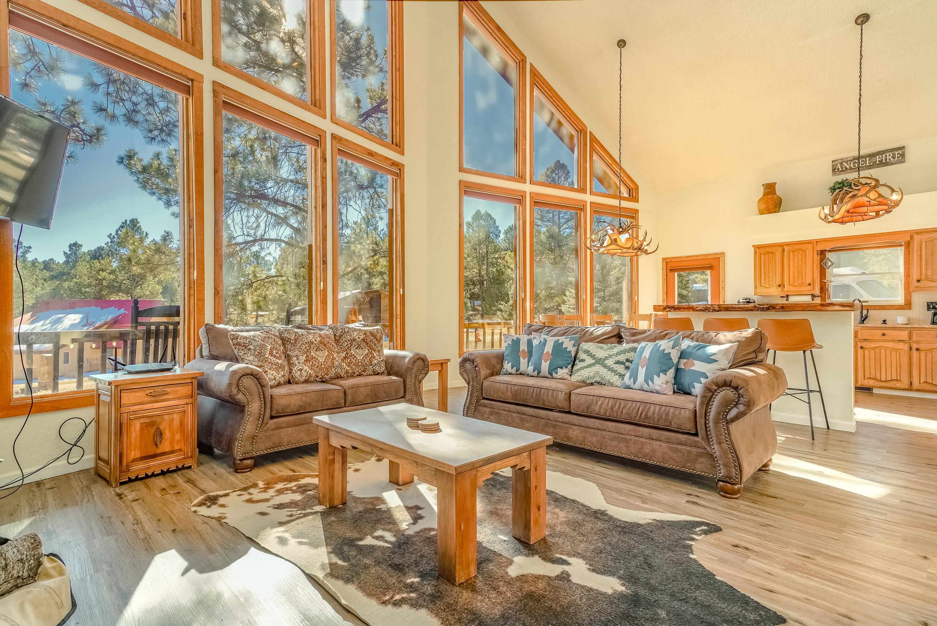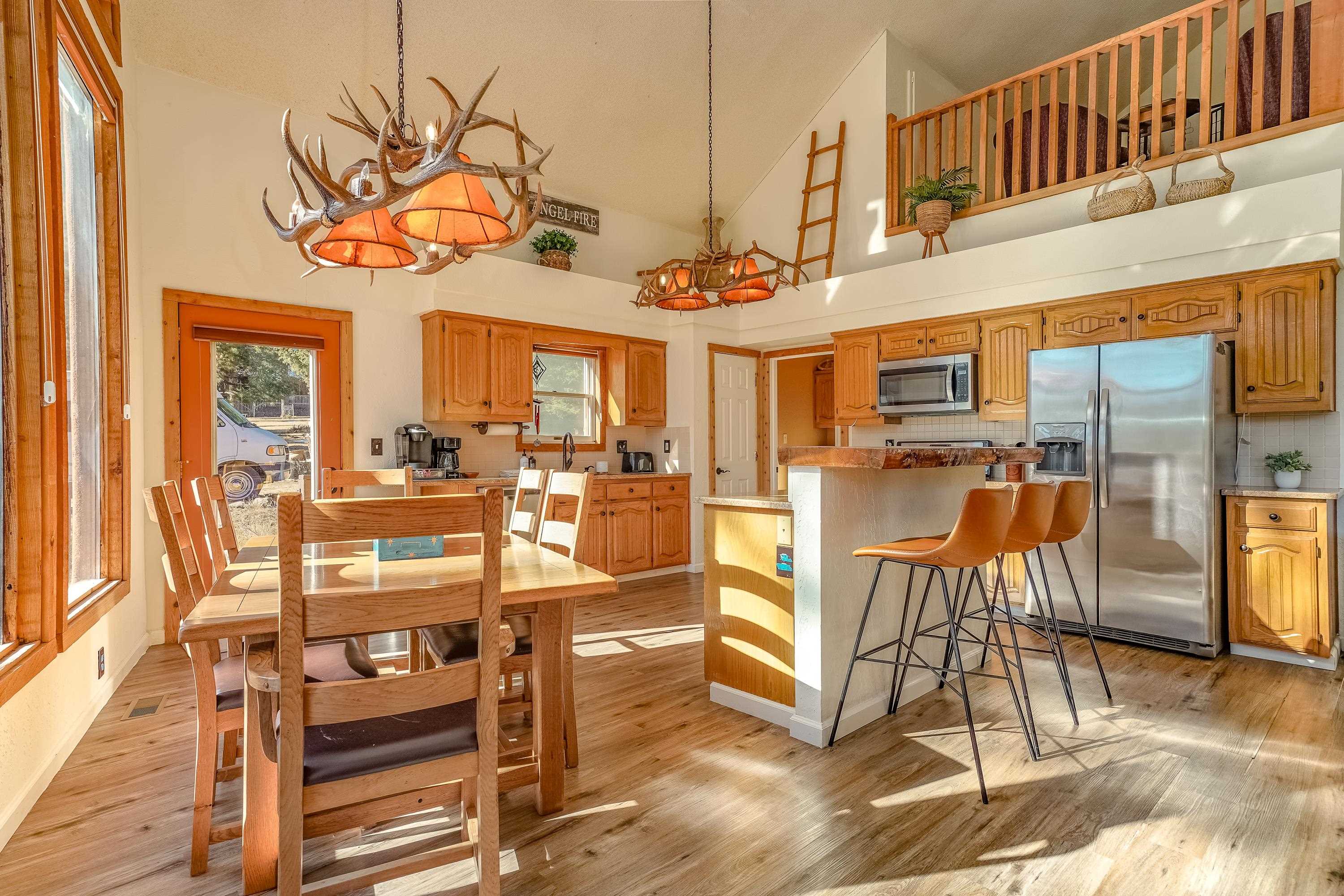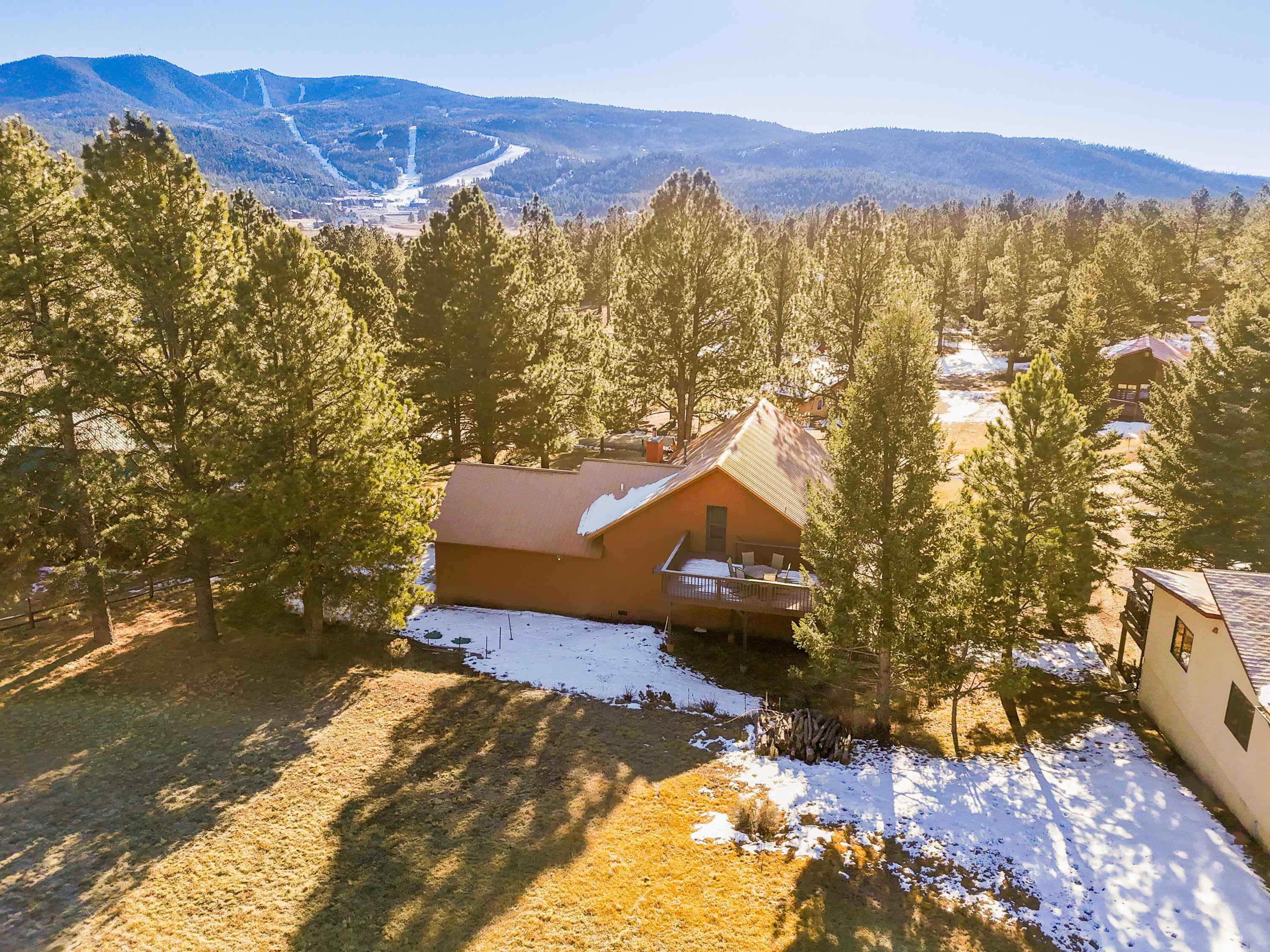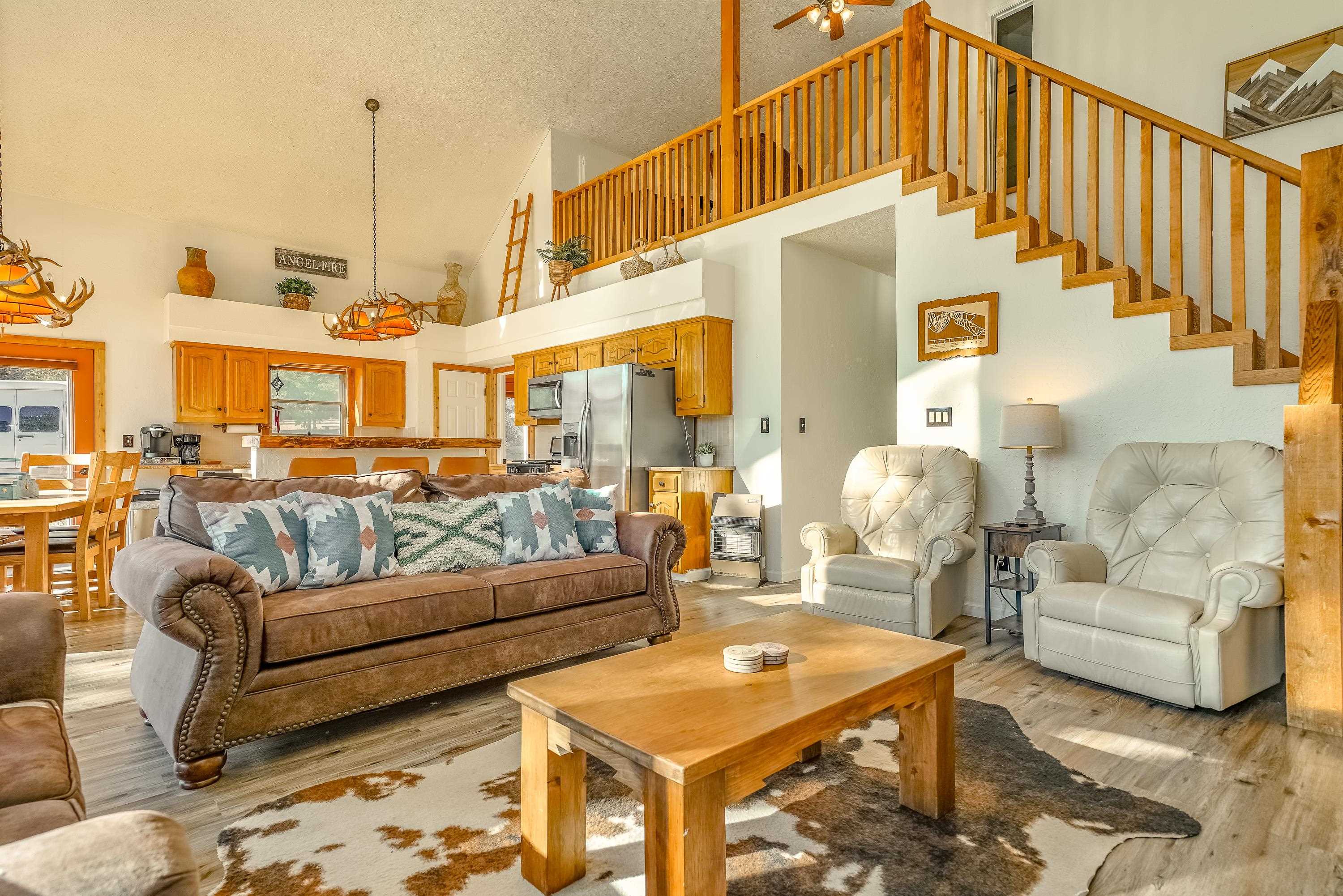 Welcome to 20 Armijo Drive, an Angel Fire chalet in an unbeatable location, just minutes from the grocery store, coffee shop, and local hiking trails. Set on a lovely 0.55-acre lot, this inviting mountain home offers ski area views, a functional layout, and plenty of space for family and friends to spread out comfortably. Step inside to a large mudroom entry, perfect for dropping coats and gear after a day on the slopes. The main living area features vaulted ceilings and oversized windows that bring in beautiful natural light, flowing into an open kitchen and dining space ideal for gatherings. Expansive deck space gives you plenty of space to relax outside - whether you're chasing sunshine or cooling off in the shade, there's a spot for every mood. The main-level primary suite makes for easy living, along with an additional guest bedroom, full guest bath, and laundry on the same floor. Upstairs, you'll find a spacious loft (great for extra sleeping space or a cozy hangout area), plus another bedroom and bath. A private back deck adds the perfect place for quiet morning coffee or winding down after a day of adventure. With an attached 2-car garage, concrete driveway, and easy year-round access, this home is a fantastic fit as a full-time residence, vacation getaway, or potential rental in the heart of Angel Fire.