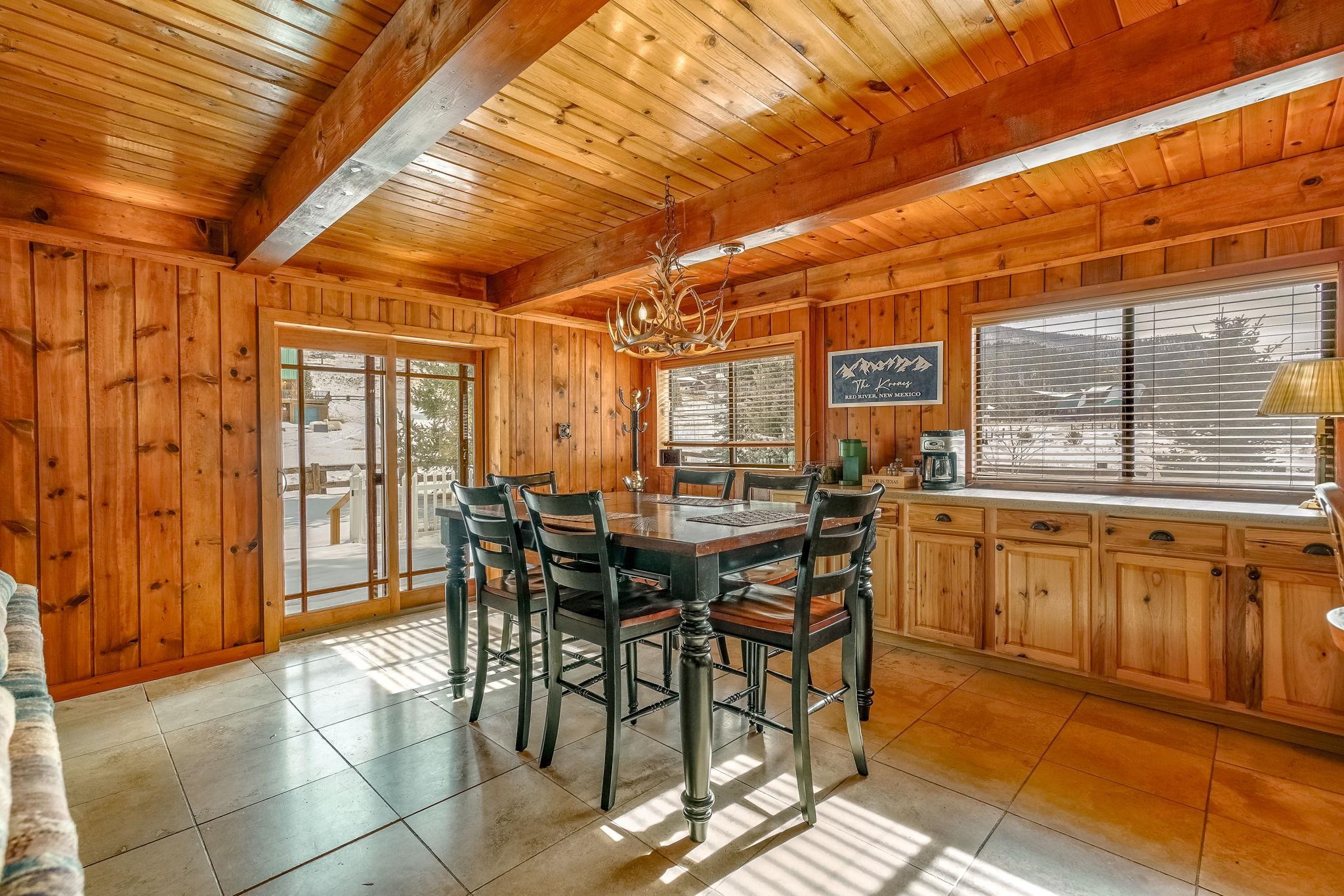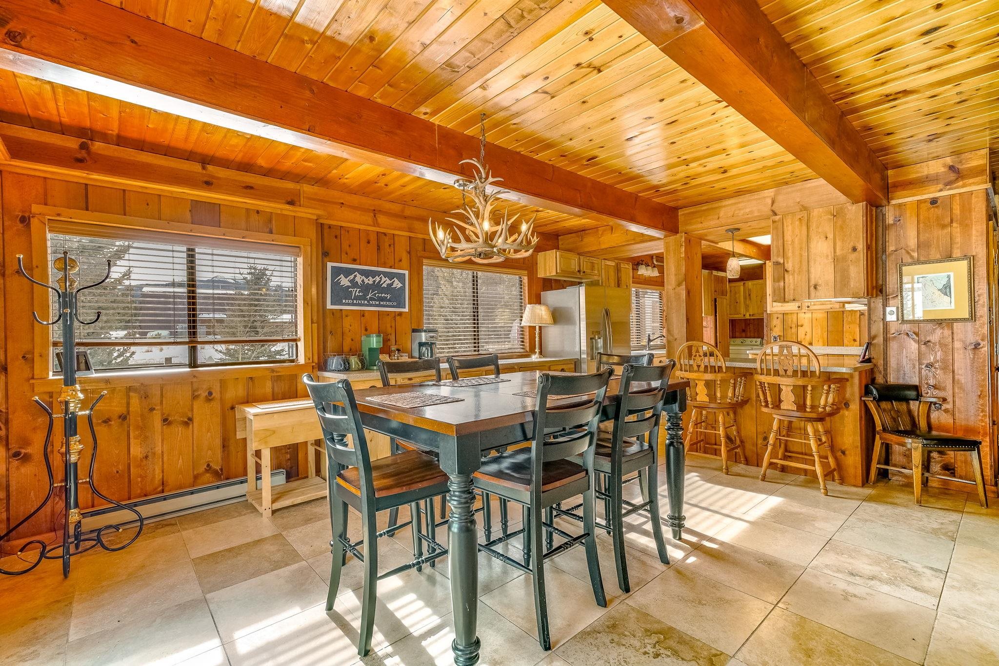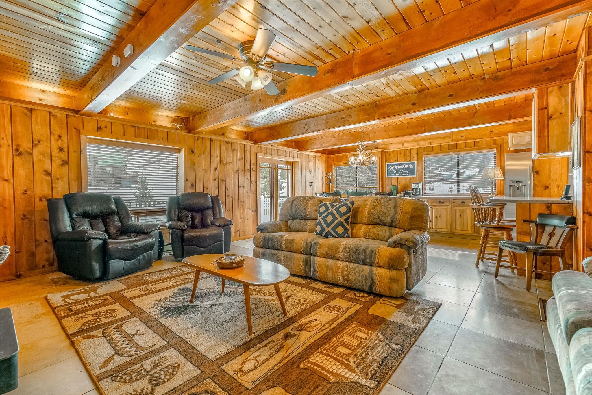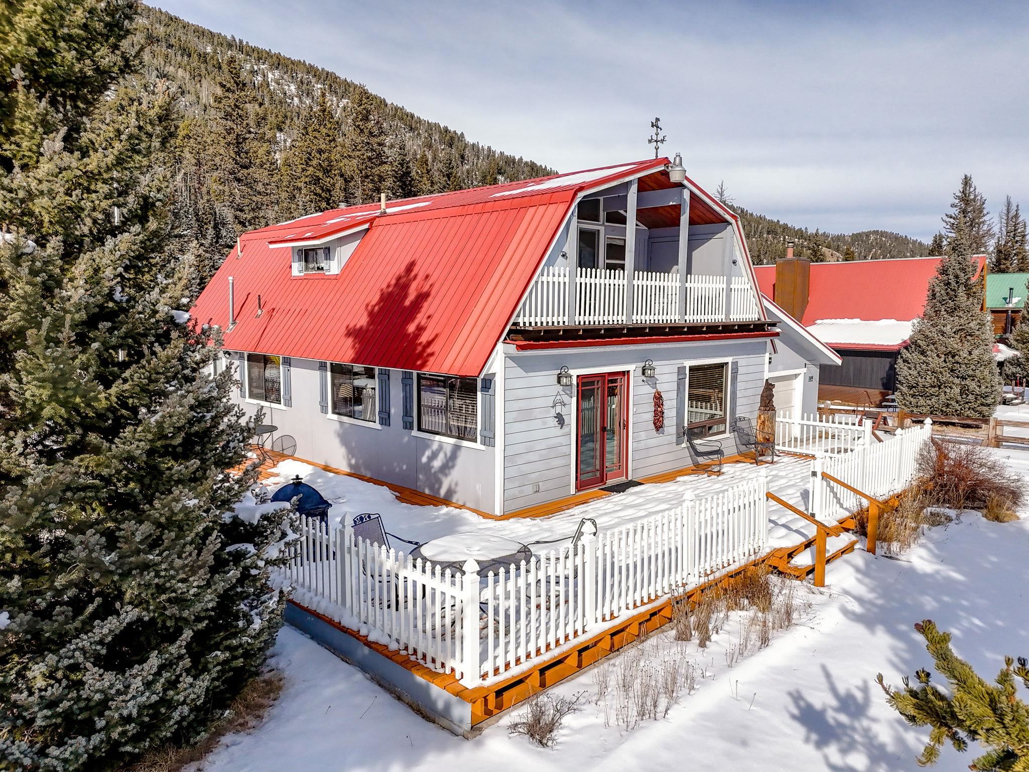 Riverfront living in Red River's Upper Valley is a rare find, and this home offers a setting that is genuinely special. Situated directly along the Red River, the property is shaped by its surroundings. The home spans two largely flat lots, offering rare outdoor usability and flexibility for future expansion. Covered porches, a wraparound deck, and fenced outdoor areas extend the living space and invite time outside. From the upper grounds, wooden steps lead down to the river, where towering evergreens and a riverside firepit create a distinctly different setting for time spent in nature. The home features warm wood interiors, exposed beams, and a comfortable, well-proportioned layout designed for connection and ease. A fireplace anchors the living space, creating a natural gathering place after a day outdoors. The kitchen and dining areas are open and functional. The four bedrooms plus a bonus room are thoughtfully arranged for privacy and flexibility. Located a short drive from town, this property offers a rural setting without sacrificing convenience for skiing, dining, shopping, and year-round recreation. Short-term rentals are permitted in this area. 14 Canyon Valley Rd is offered mostly furnished and equipped.