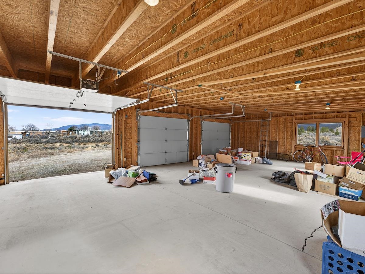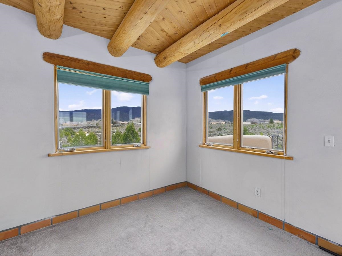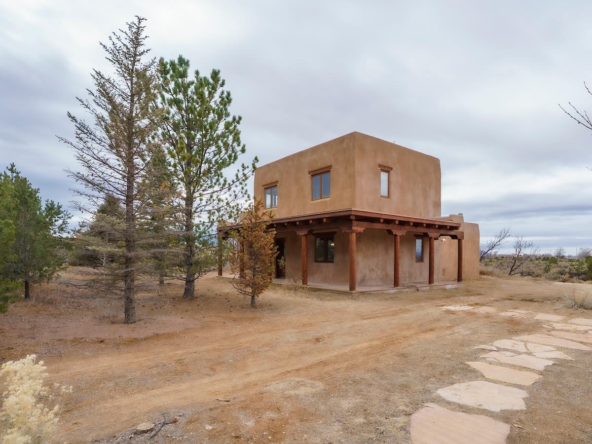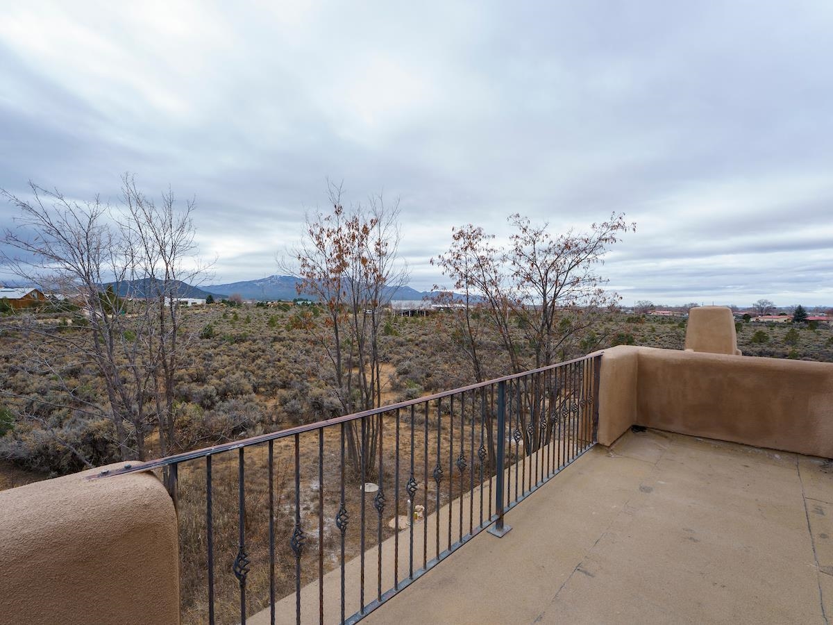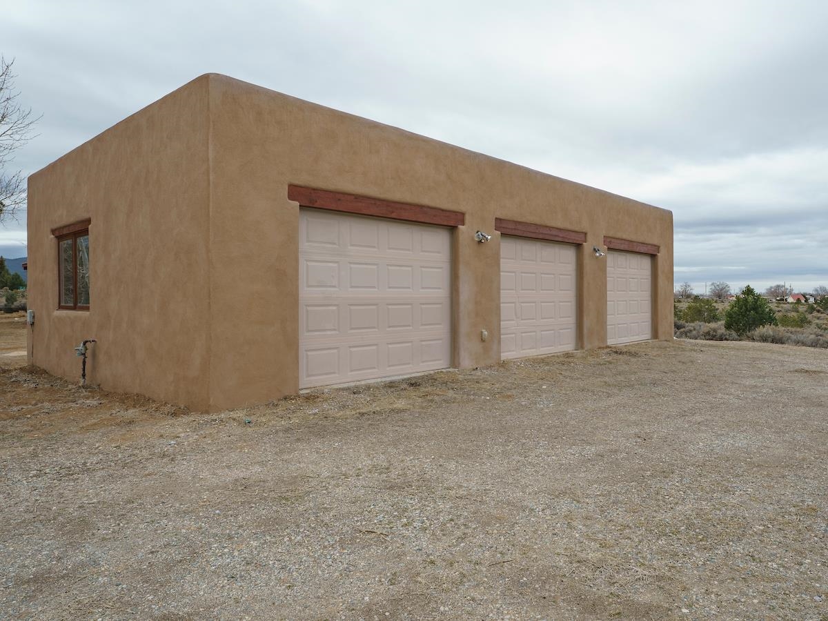 This Lovely two-story home in a truly exceptional Taos location. Just minutes from the historic town of Taos, with easy access to shopping, restaurants, museums, and culture--yet remarkably private, set on 3 peaceful acres with wonderful mountain views. This adobe and frame home blends classic Southwest character with modern comfort. Recent updates include new stucco and some new appliances. The property features a private well and El Valle sewer. A welcoming entryway opens into a bright, open floor plan filled with natural light from abundant windows that frame the surrounding landscape. The gourmet kitchen is ideal for cooking and entertaining, offering generous counter space, plentiful oak cabinetry, and a functional layout. Tile floors with in-floor radiant heating provide warmth and comfort throughout the main level. A nice downstairs bedroom adds flexibility for guests or office space. Upstairs, the primary bedroom is a private retreat with a large bath with a generous walk-in closet, lots of light, and access to a private deck--perfect for enjoying morning coffee or sunset views. A big front portal extends the living space outdoors and invites relaxation in every season. The property also includes a detached, well-built three-car garage with electricity, ideal for vehicles, storage, or workshop space. The combination of sweeping views, proximity to town, and a rare sense of privacy makes this a special home. An easy drive to world-famous Taos Ski Valley completes the appeal of this outstanding Taos property. Come and see this wonderful home soon.