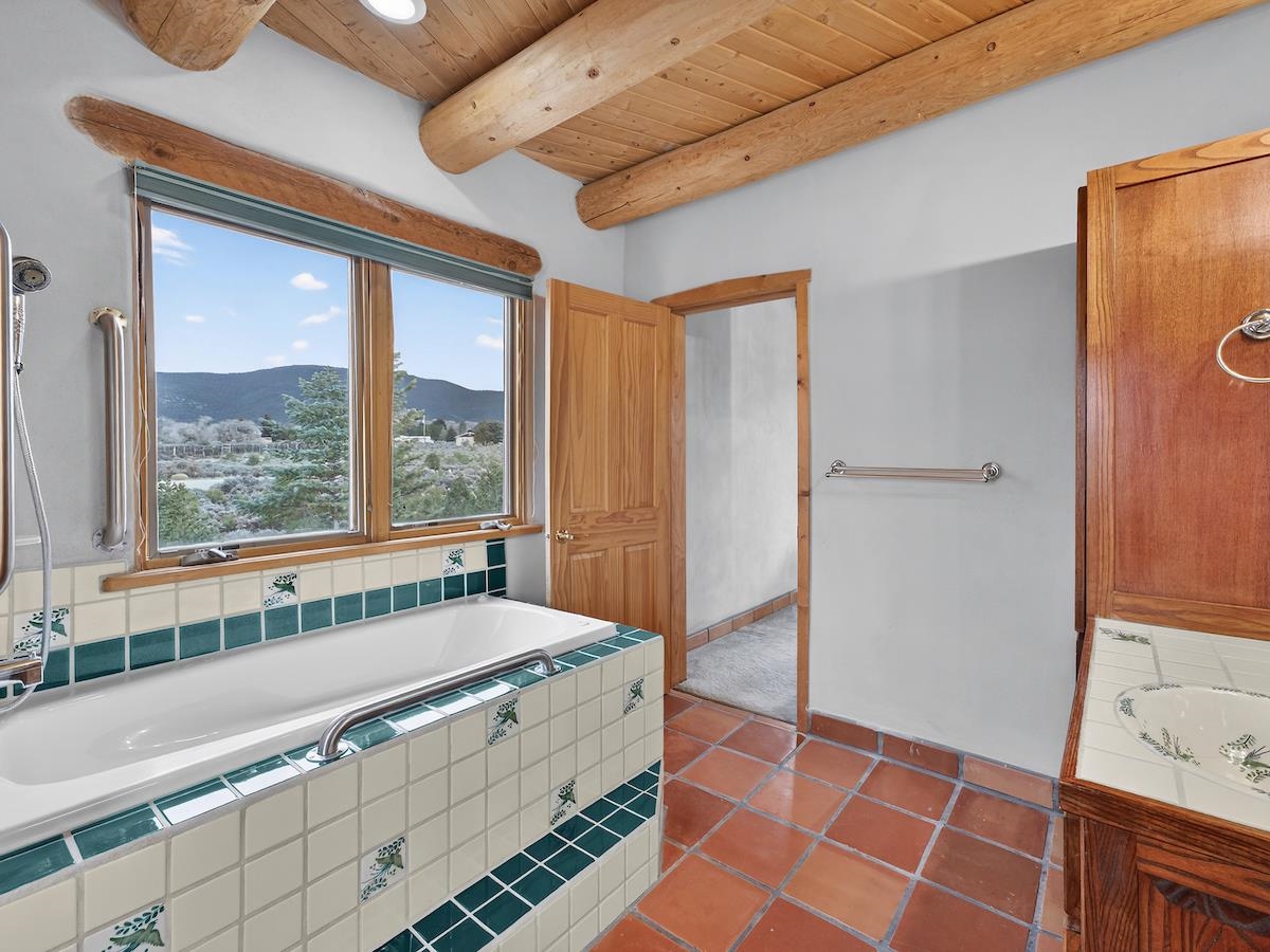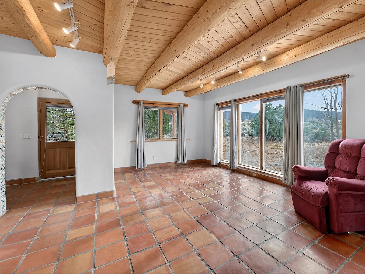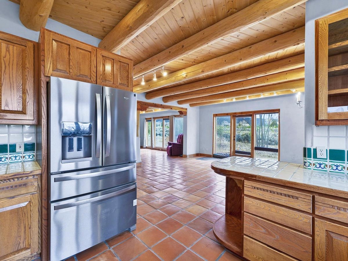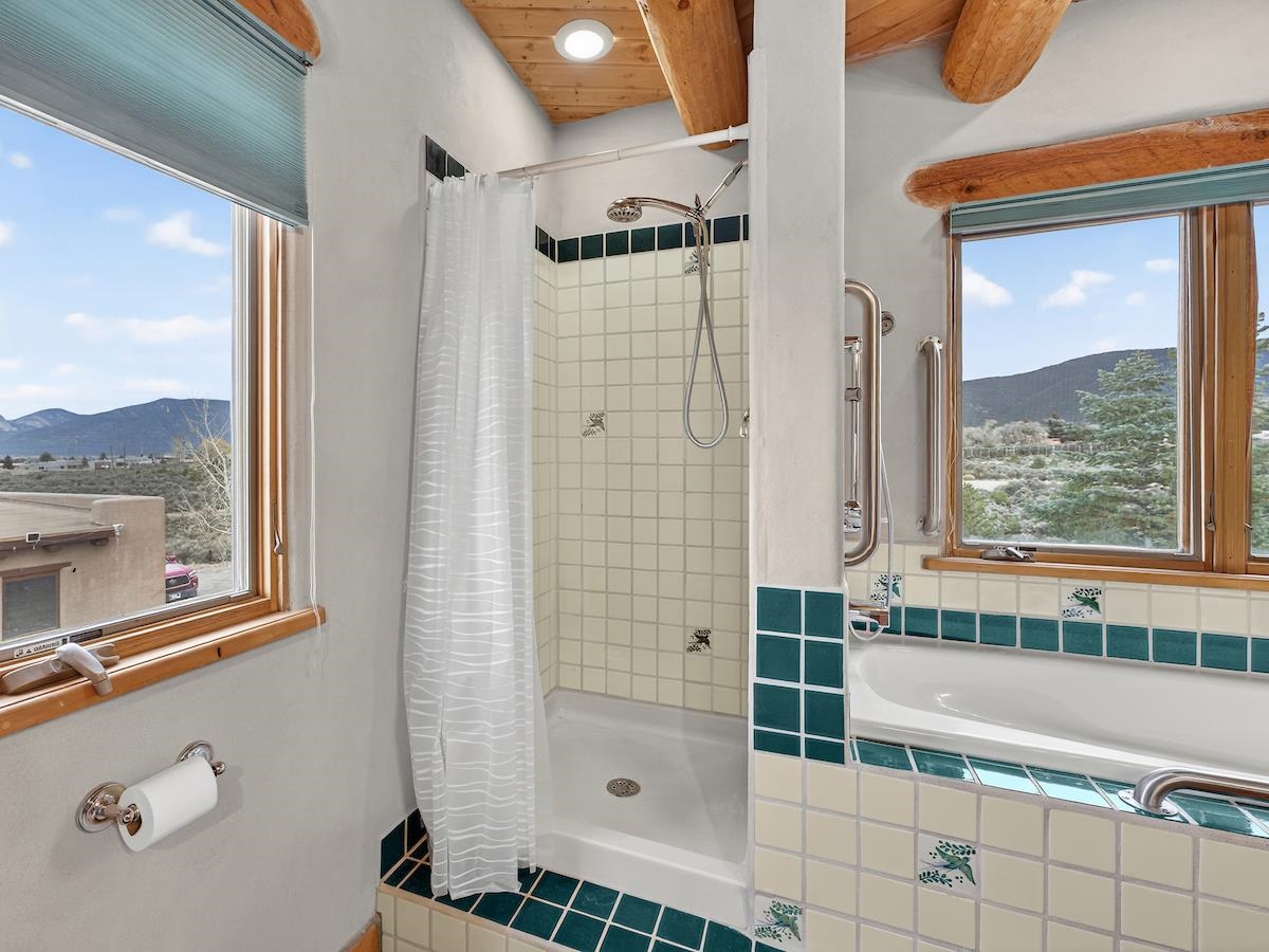 This Lovely two-story home in a truly exceptional Taos location. Just minutes from the historic town of Taos, with easy access to shopping, restaurants, museums, and culture--yet remarkably private, set on 3 peaceful acres with wonderful mountain views. This adobe and frame home blends classic Southwest character with modern comfort. Recent updates include new stucco and some new appliances. The property features a private well and El Valle sewer. A welcoming entryway opens into a bright, open floor plan filled with natural light from abundant windows that frame the surrounding landscape. The gourmet kitchen is ideal for cooking and entertaining, offering generous counter space, plentiful oak cabinetry, and a functional layout. Tile floors with in-floor radiant heating provide warmth and comfort throughout the main level. A nice downstairs bedroom adds flexibility for guests or office space. Upstairs, the primary bedroom is a private retreat with a large bath with a generous walk-in closet, lots of light, and access to a private deck--perfect for enjoying morning coffee or sunset views. A big front portal extends the living space outdoors and invites relaxation in every season. The property also includes a detached, well-built three-car garage with electricity, ideal for vehicles, storage, or workshop space. The combination of sweeping views, proximity to town, and a rare sense of privacy makes this a special home. An easy drive to world-famous Taos Ski Valley completes the appeal of this outstanding Taos property. Come and see this wonderful home soon.
