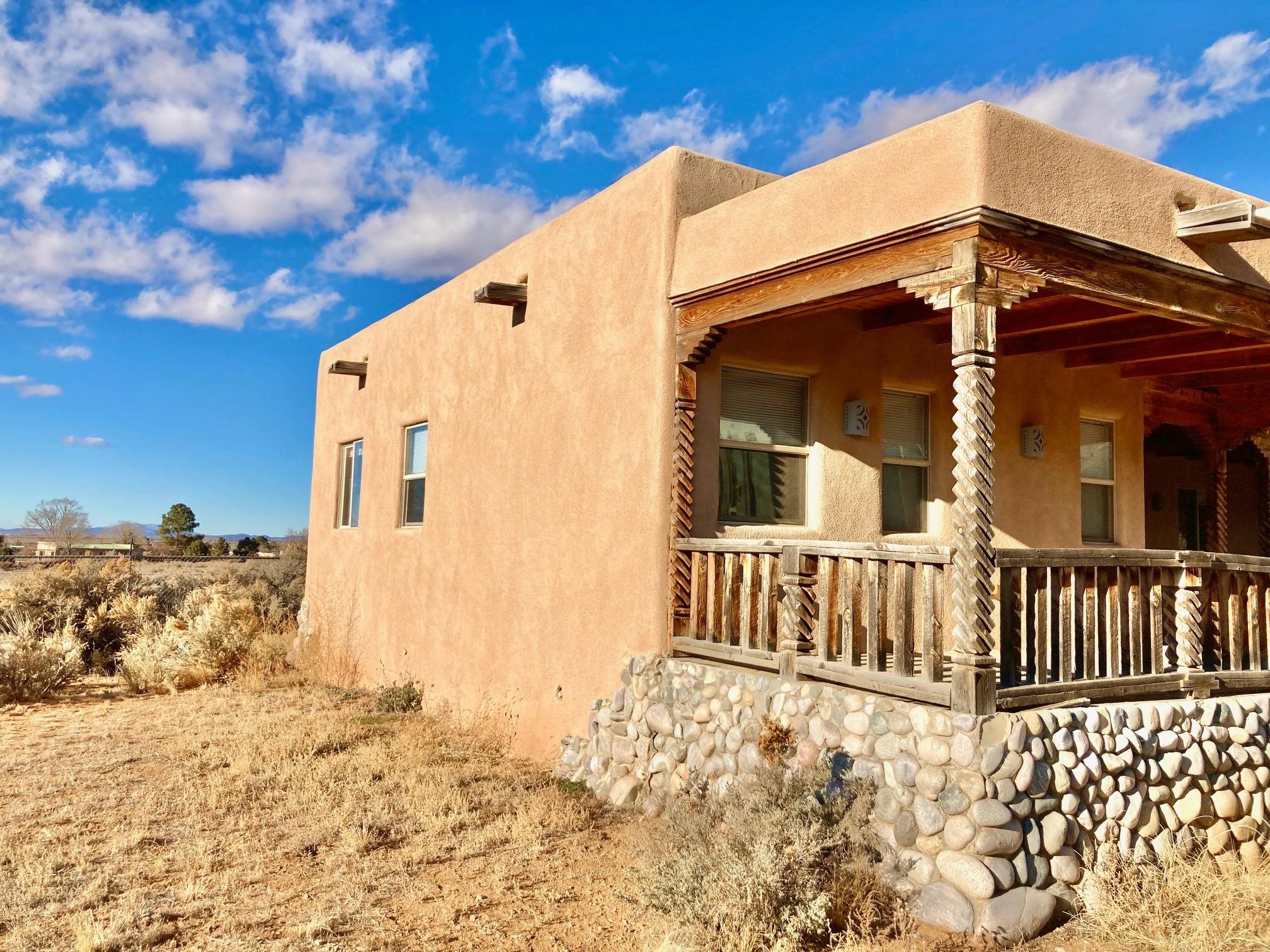 Beautiful 3 bedroom & 3 bathroom home, appx 1,490 sf, offering privacy & serenity at the end of a quiet cul-de-sac in convenient South Taos. Open, airy design features rough-sawn, corbelled pine beams, T&G ceilings, hardwood & Saltillo tile floors, and tiled baths. New roof installed 2025. Quiet hydronic boiler heating. Three sets of double doors connect to a spacious wrap-around covered porch with views. Light-filled kitchen and Living Room have views of the northern mountains & western mesa. The warm living room opens to the porch. Two bedrooms with private double door deck access, the third has southern views.. Close to shopping, dining, entertainment & medical care. Your perfect Taos escape--schedule a tour today!