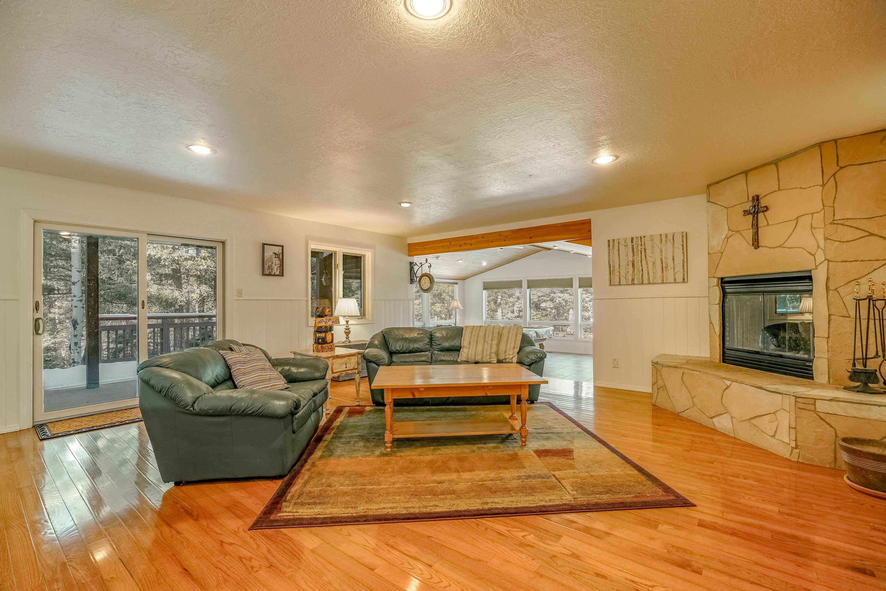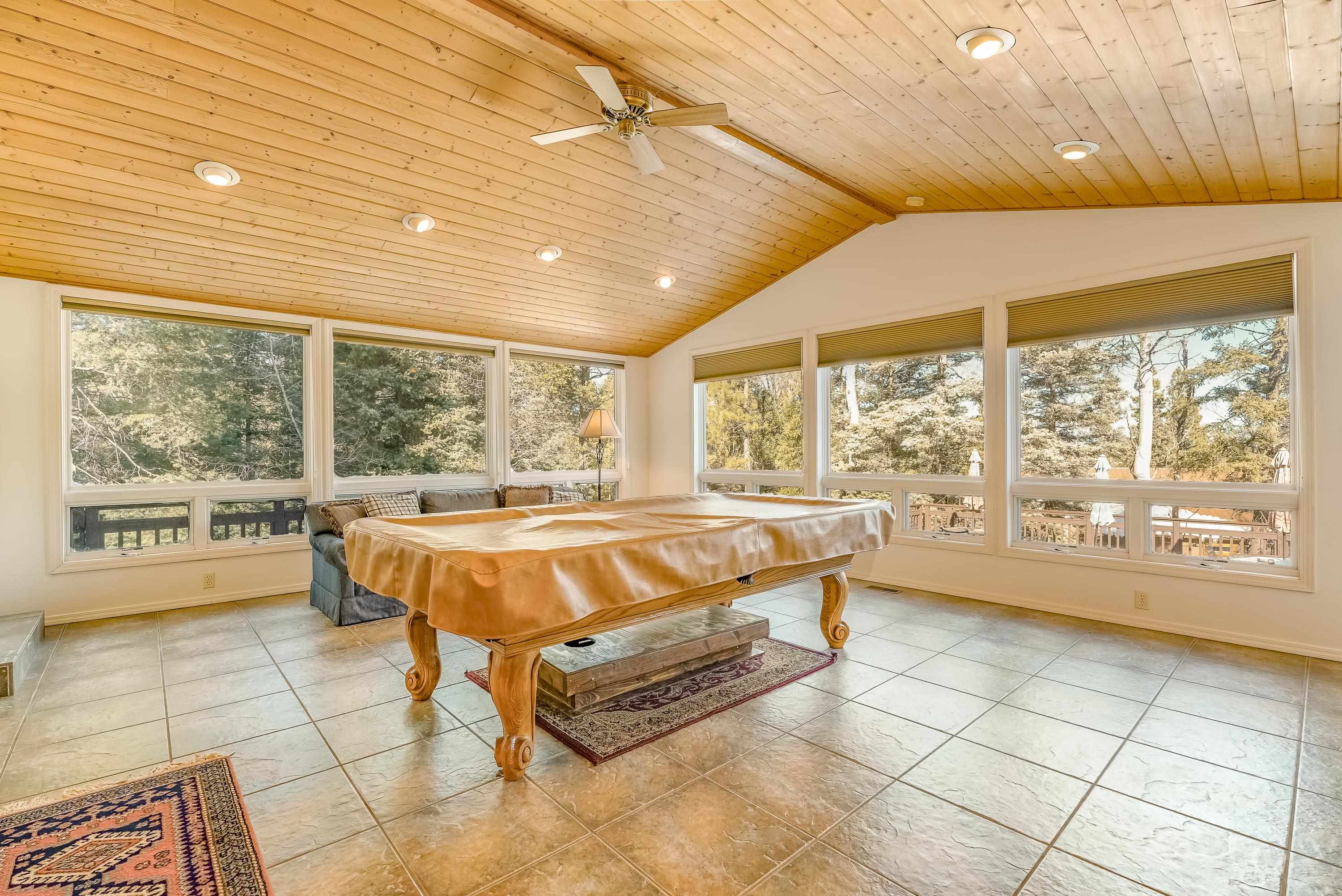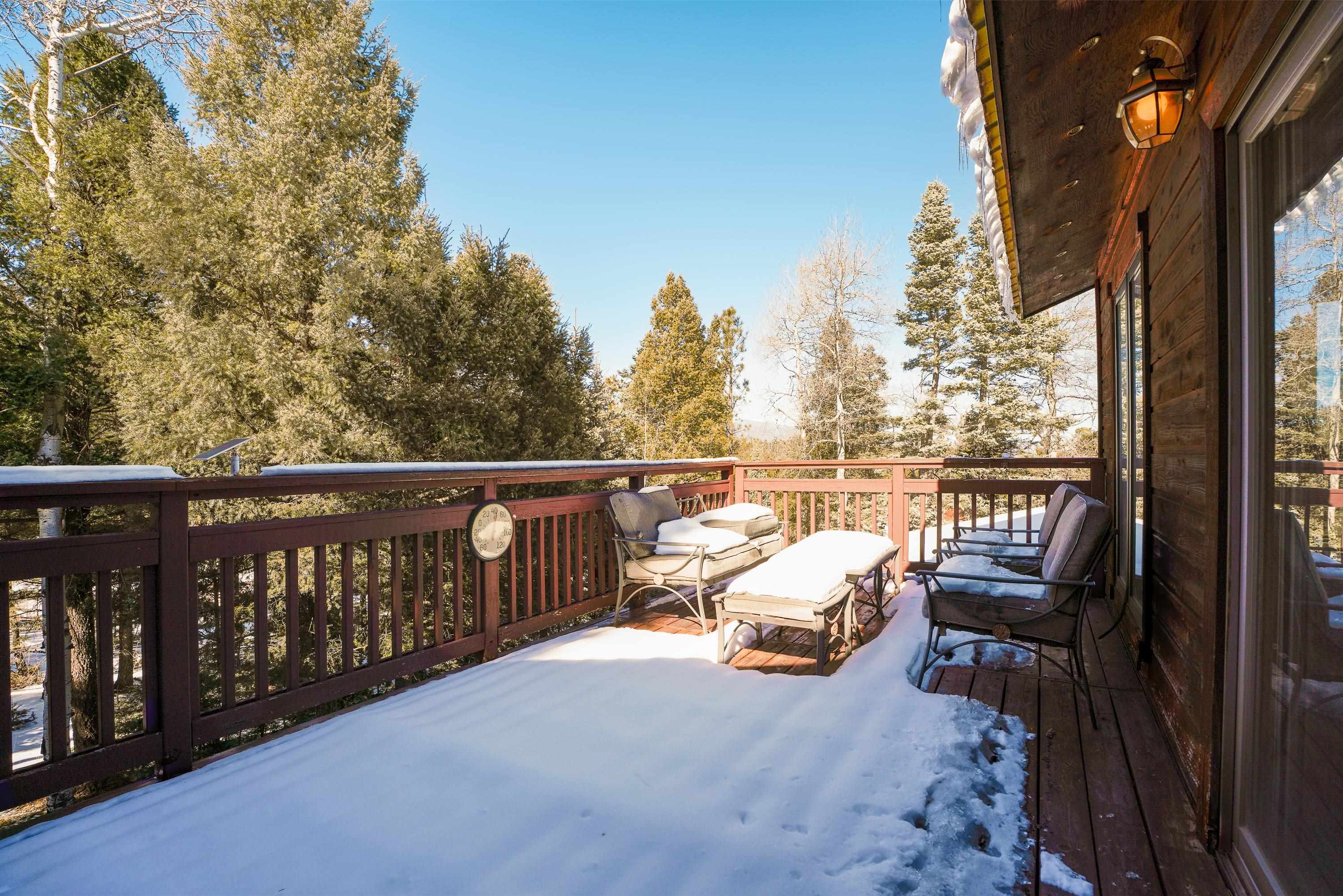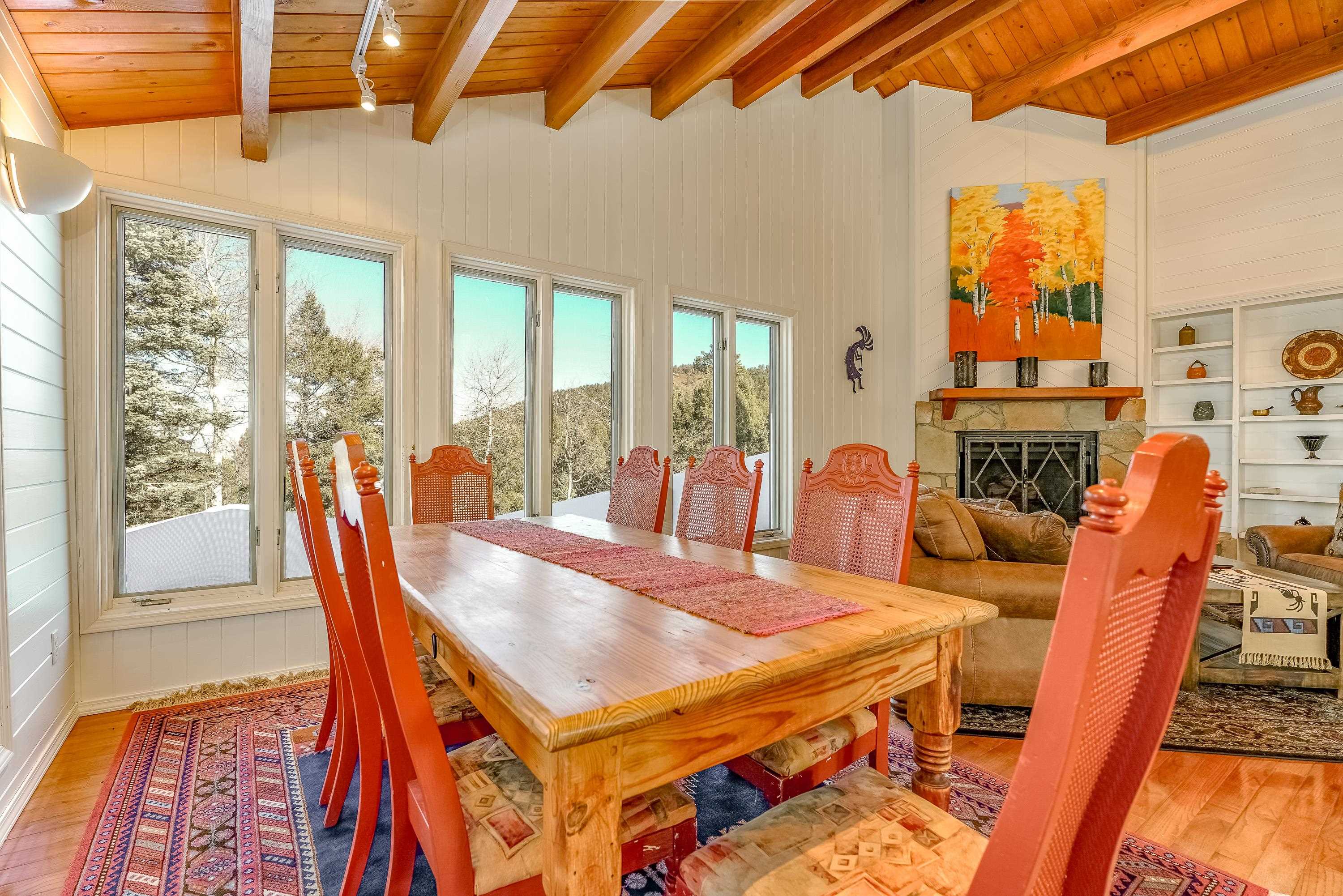 Designed for gathering, entertaining, and mountain living, this 4BD/4BA single-family home offers 3,640 SF on a private 0.8-acre setting among mature pines. Interior features include tongue-and-groove ceilings, wood flooring, high ceilings, abundant windows, two fireplaces, and multiple living areas ideal for hosting family and guests. The expansive kitchen is well suited for entertaining with stainless steel appliances, generous counter space, a large island, and ample storage. Finished walk-out basement includes a spacious family room and game room with direct access to multi-level decks and a large hot tub. Main and lower levels both open to outdoor living spaces. The primary suite offers a large walk-in closet and a spacious bath with dual vanities, water closet, toilet, and bidet. Attached 2-car garage. Located near the main road yet tucked in the pines, with convenient access--approximately 6 minutes to the country club, tennis and pickleball courts, and 8 minutes to the ski area--making this an ideal Angel Fire retreat or vacation home.