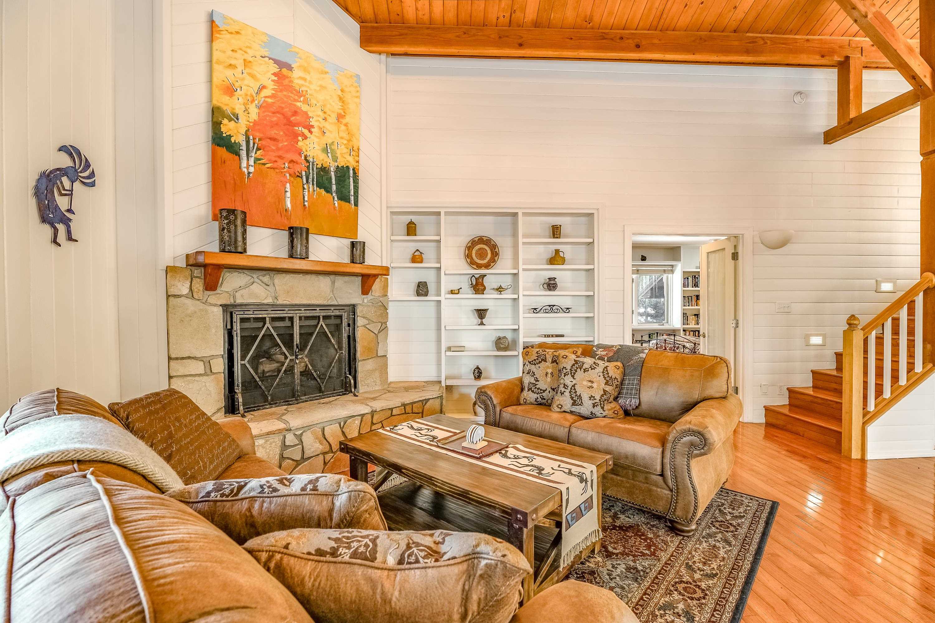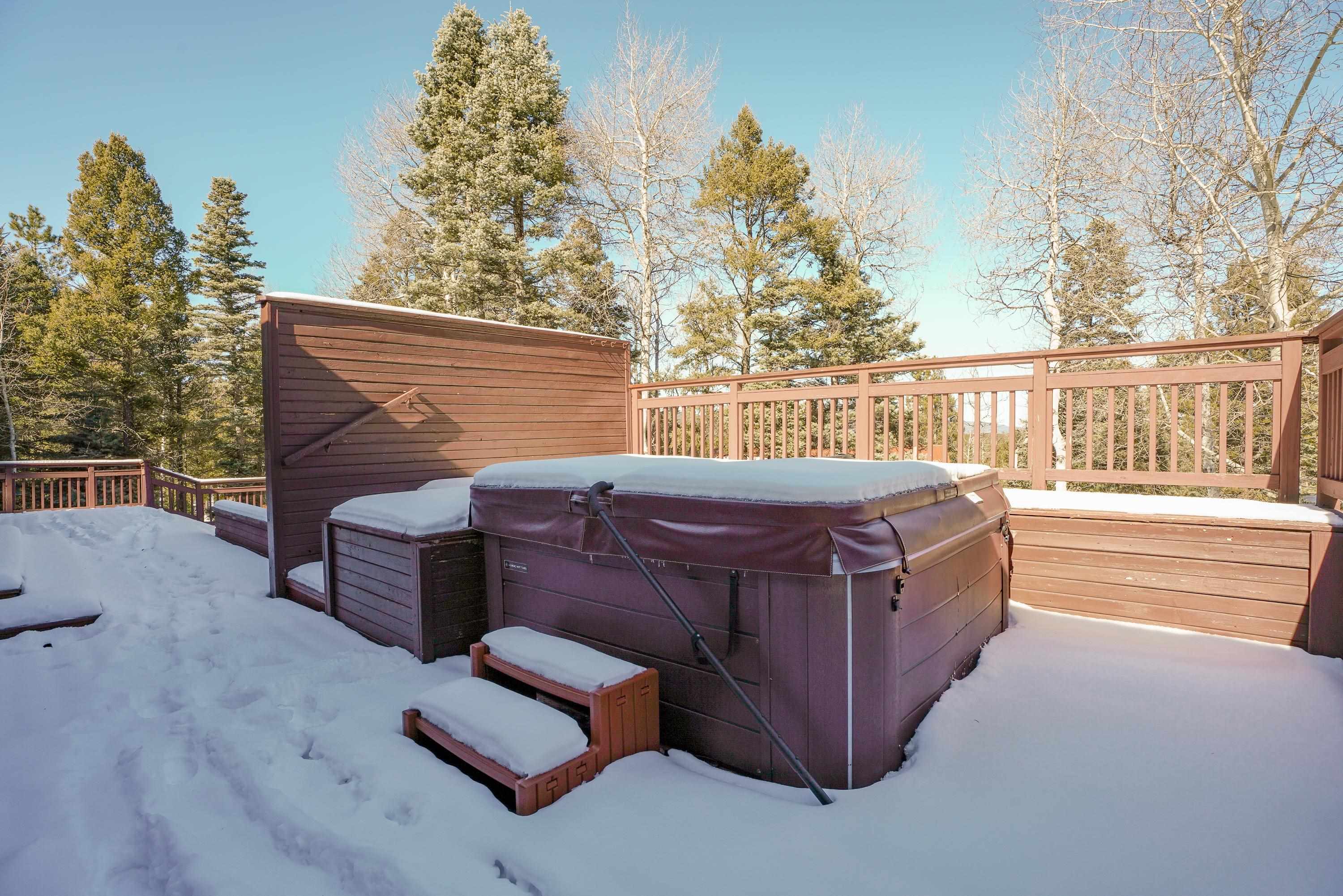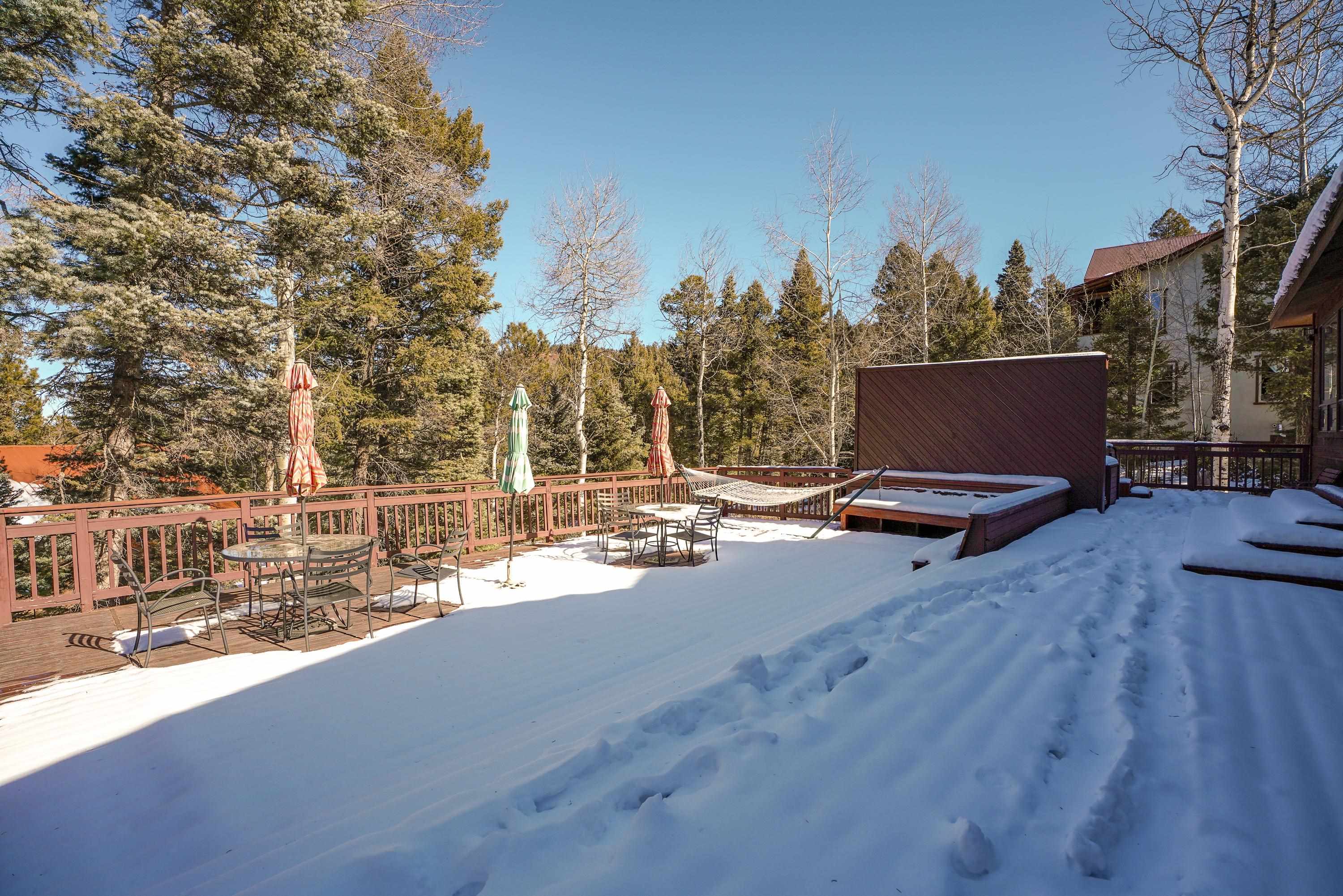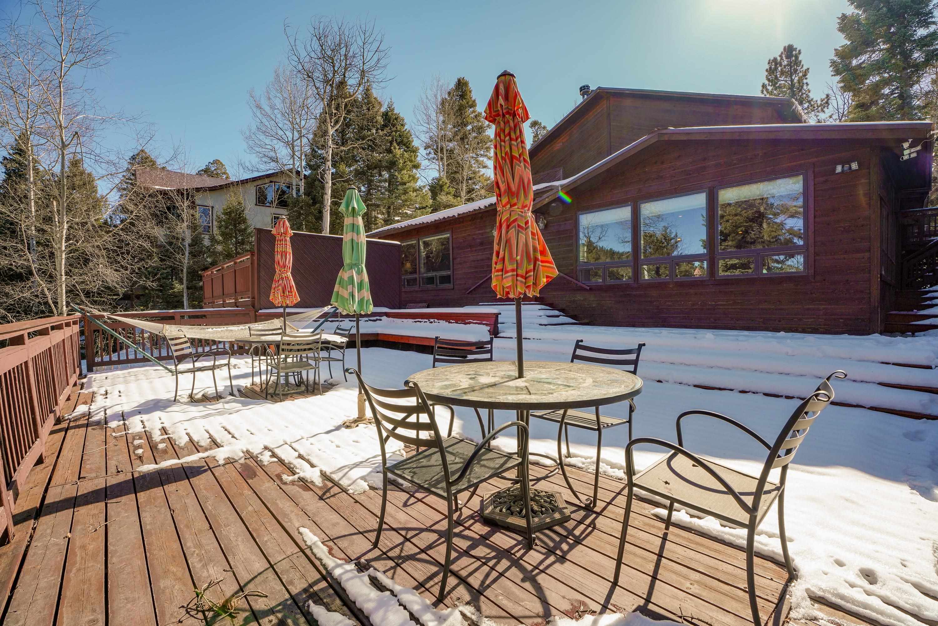 Designed for gathering, entertaining, and mountain living, this 4BD/4BA single-family home offers 3,640 SF on a private 0.8-acre setting among mature pines. Interior features include tongue-and-groove ceilings, wood flooring, high ceilings, abundant windows, two fireplaces, and multiple living areas ideal for hosting family and guests. The expansive kitchen is well suited for entertaining with stainless steel appliances, generous counter space, a large island, and ample storage. Finished walk-out basement includes a spacious family room and game room with direct access to multi-level decks and a large hot tub. Main and lower levels both open to outdoor living spaces. The primary suite offers a large walk-in closet and a spacious bath with dual vanities, water closet, toilet, and bidet. Attached 2-car garage. Located near the main road yet tucked in the pines, with convenient access--approximately 6 minutes to the country club, tennis and pickleball courts, and 8 minutes to the ski area--making this an ideal Angel Fire retreat or vacation home.