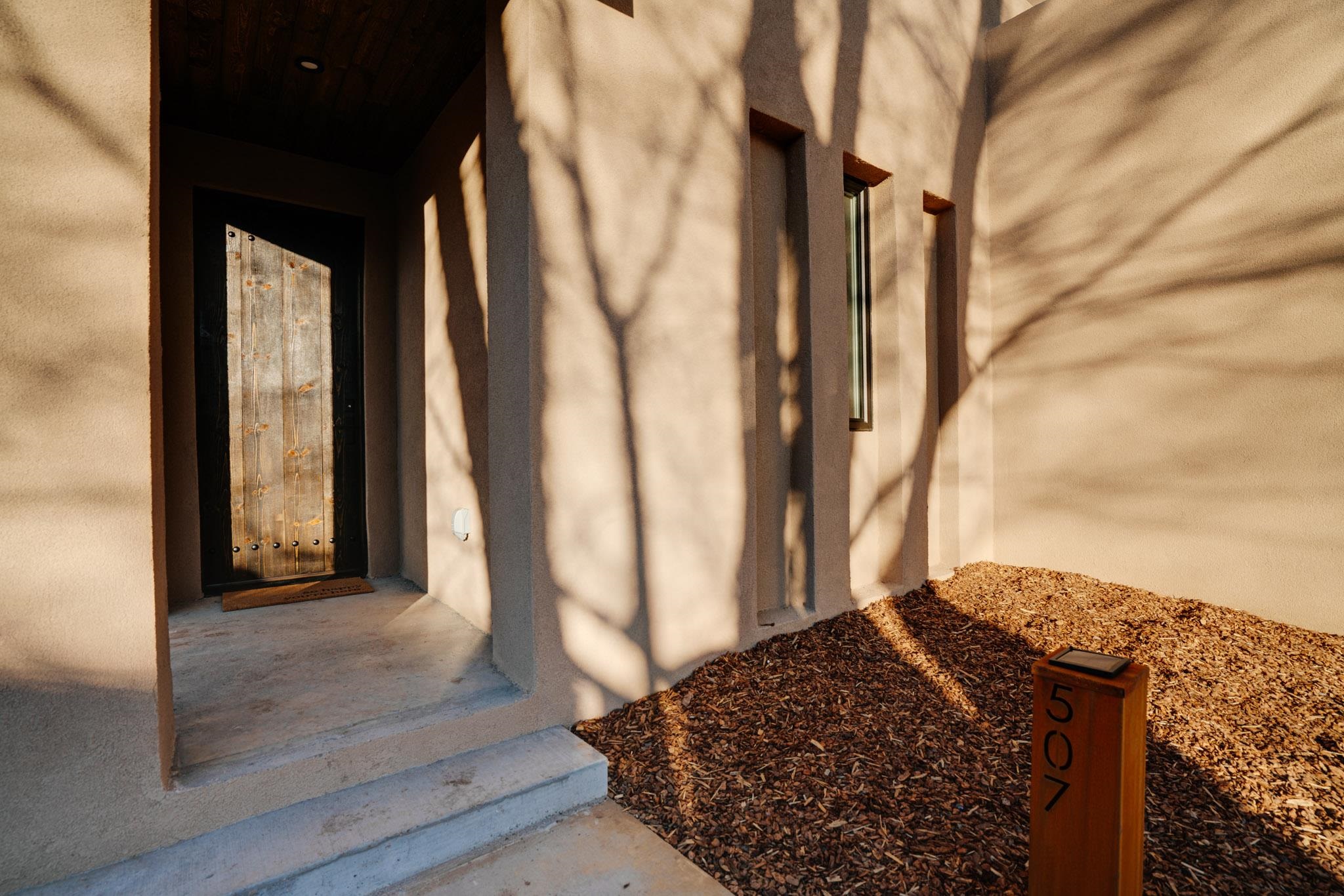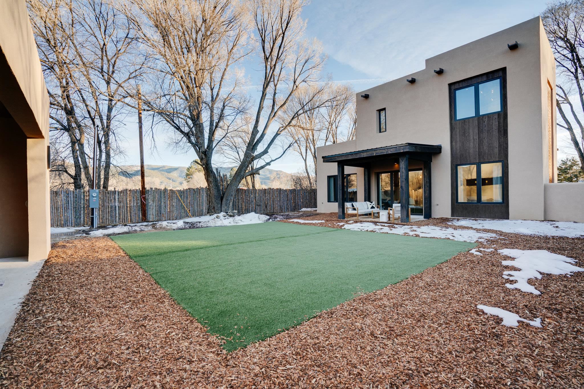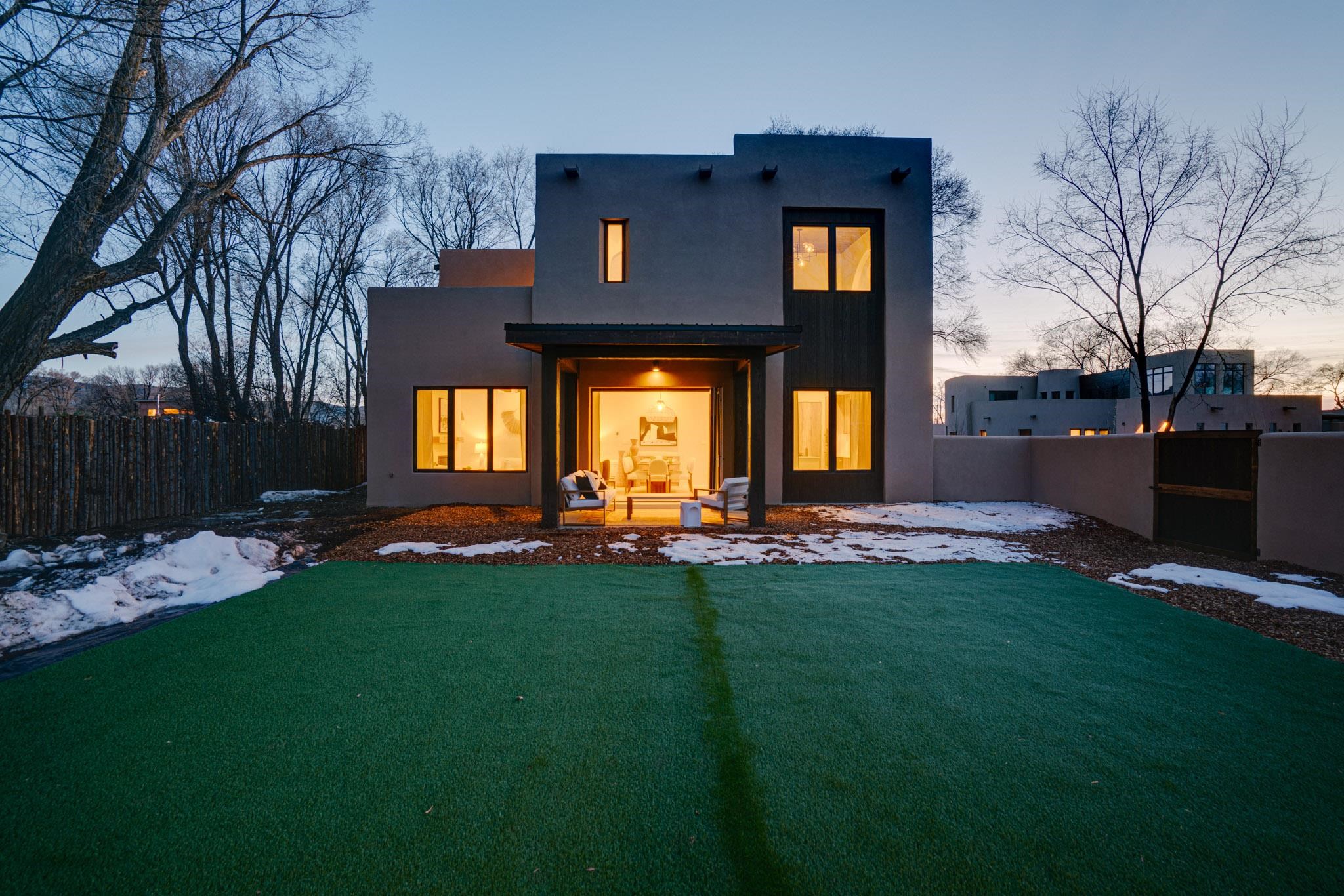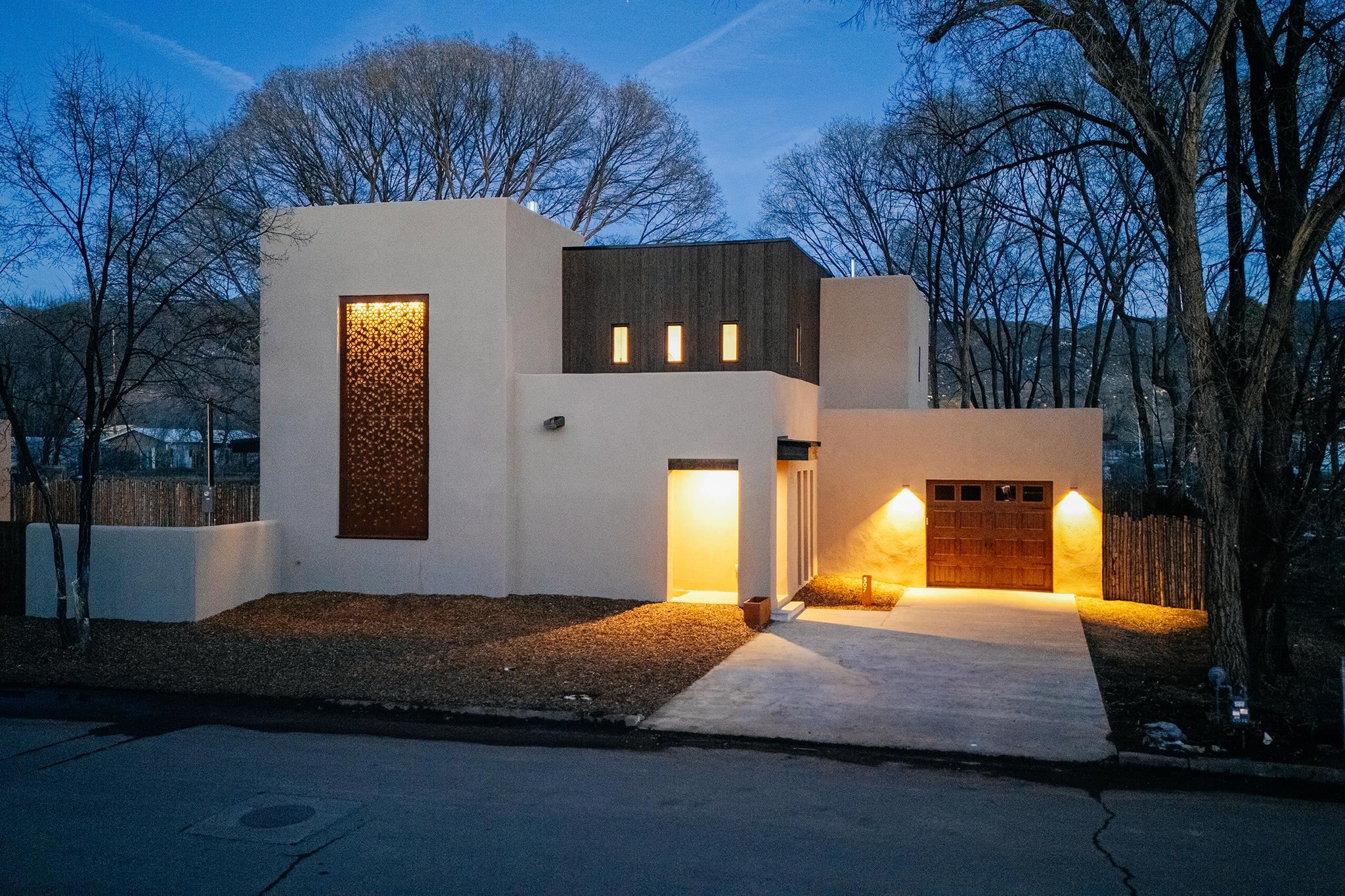 Welcome to ELMhouse, a truly spectacular newly built home surrounded by mature Siberian Elm trees. Located on the quiet Vigil Street you are afforded all the conveniences that town living has to offer. Designed and built by award winning Architect/Interior Designer, Johnna Barrett of Barrett Design, Elm House incorporates bold, dramatic design with the latest in eco-friendly sustainability. As you approach the property, the first thing you notice is the impressive custom designed Corten steel panel which is backlit at night. The lovely foyer, lit with a wall of electric pillar candles and handmade clay tile leads to the open kitchen/ dining/ living area. The kitchen offers Bosch electric appliances and durable, stain resistant quartz countertops with a Summit gas cooktop. A 9-foot Panoramic door opens to the outdoor patio and on to a detached portal which is great for leisurely lunches and dinners and excellent for entertaining. The landscaping offers minimal maintenance with weed barrier, topsoil and mulch. A patch of year-round green is provided by synthetic turf. The spacious dining/living room area has a gas fireplace as well as a mini split unit for additional heat and air conditioning. There are two bedrooms on the first level with a mini split unit in each as well as a full bath. Three storage closets and a large pantry lead to the one-car oversized garage. Enjoy electric radiant floor heat throughout the home. Two tankless on demand water heaters assure that you will never run out of hot water! The walls of the home are breathable lime-washed hand brushed paint which produces a velvety finish. White oak floors throughout the home come with a lifetime warranty. Five handmade wire lamps are suspended from the ceiling, giving a striking effect as you ascend to the second level. The risers of the stairs leading to the second level are enhanced by decorative encaustic tiles. Upstairs you will find the spacious primary bedroom offering a glorious view of Taos Mountain, a gas fireplace and a large ensuite bathroom. The plaster work in the bathrooms is Tadelakt , an elegant traditional waterproof Moroccan lime-based plaster with handmade clay tiles. There is an additional bedroom and a bonus room with a terrace. The bonus room can be used as an office, a TV room, studio, or an additional bedroom. This newly constructed 2488 SF 4-bedroom, 3 bath home which sits on .215 acres with high ceiling and skylights is filled with natural light. The construction is 2x6 and 2x12 which gives the home a very solid feeling. The exterior of the home is finished with Elastomeric stucco, a superior, long lasting, water and crack resistant product. Superior craftsmanship can be seen in every aspect of construction and design. The home is offered fully furnished and decorated in a sophisticated and soothing neutral color scheme giving a buyer the opportunity to add their own personal touches. Bold and dramatic, this stunning eco-friendly home is a must-see and beckons you to call it your own.