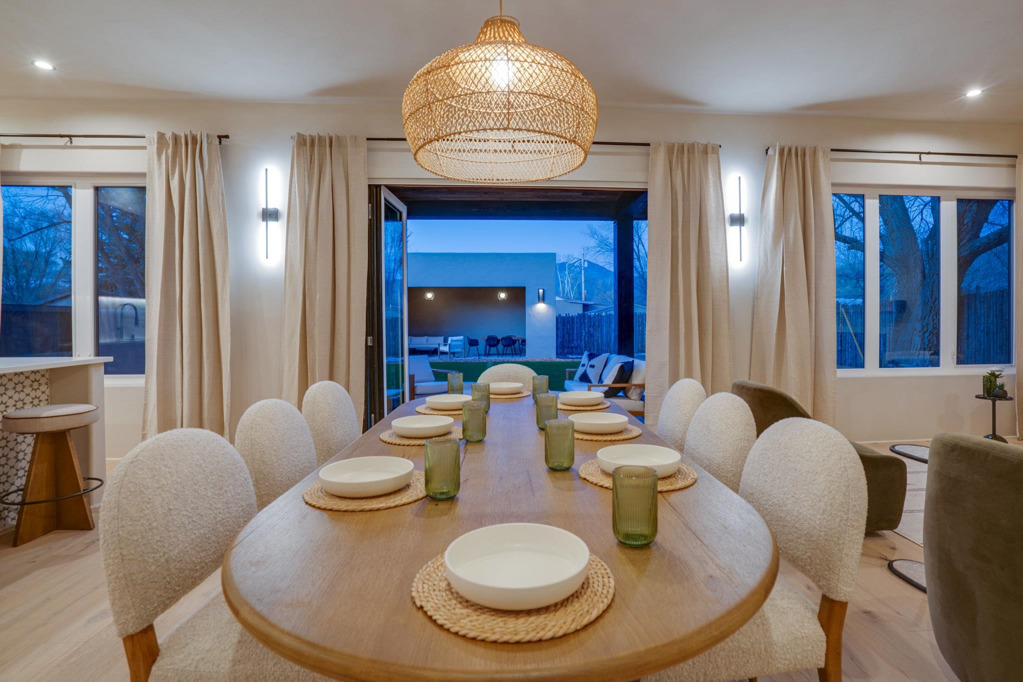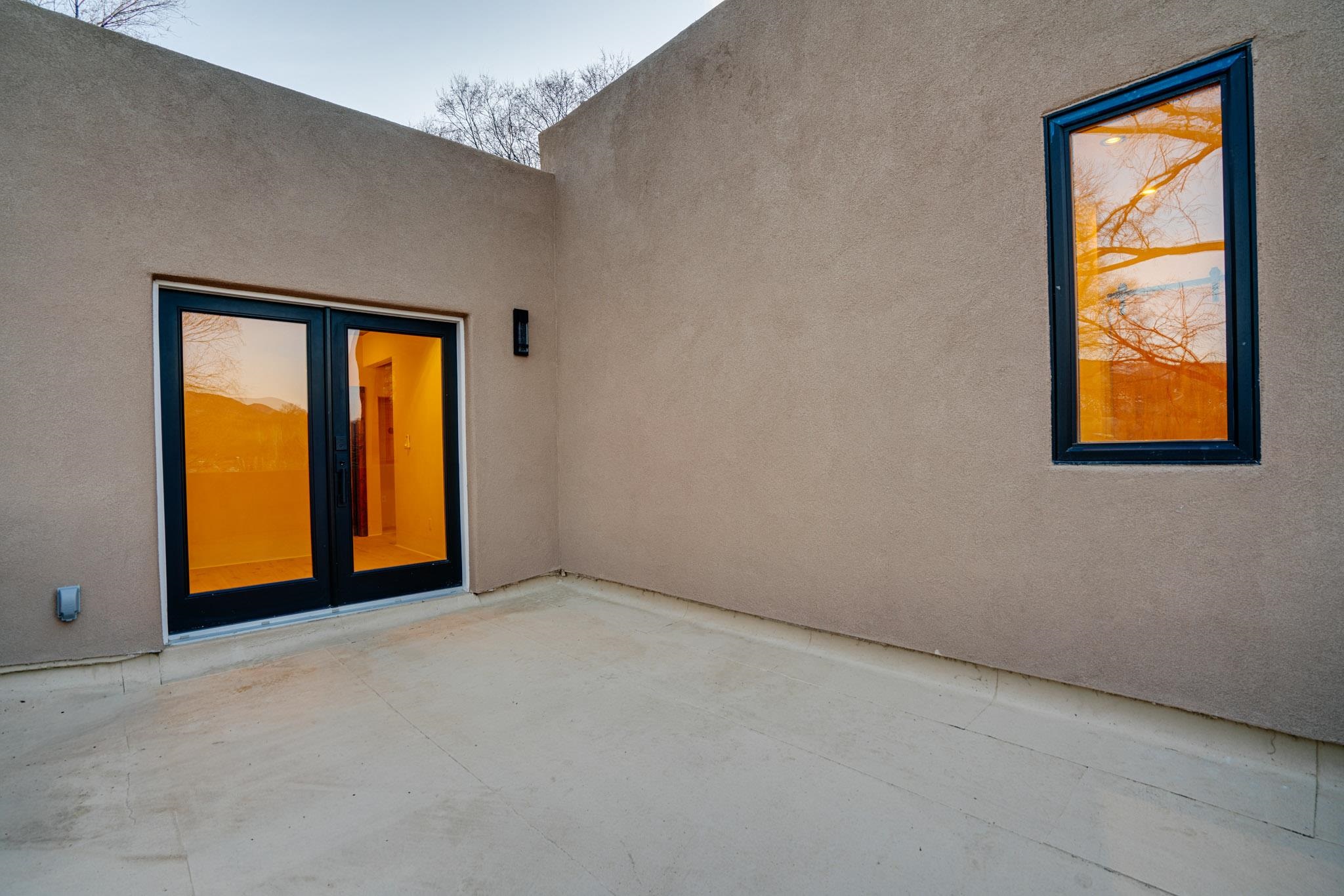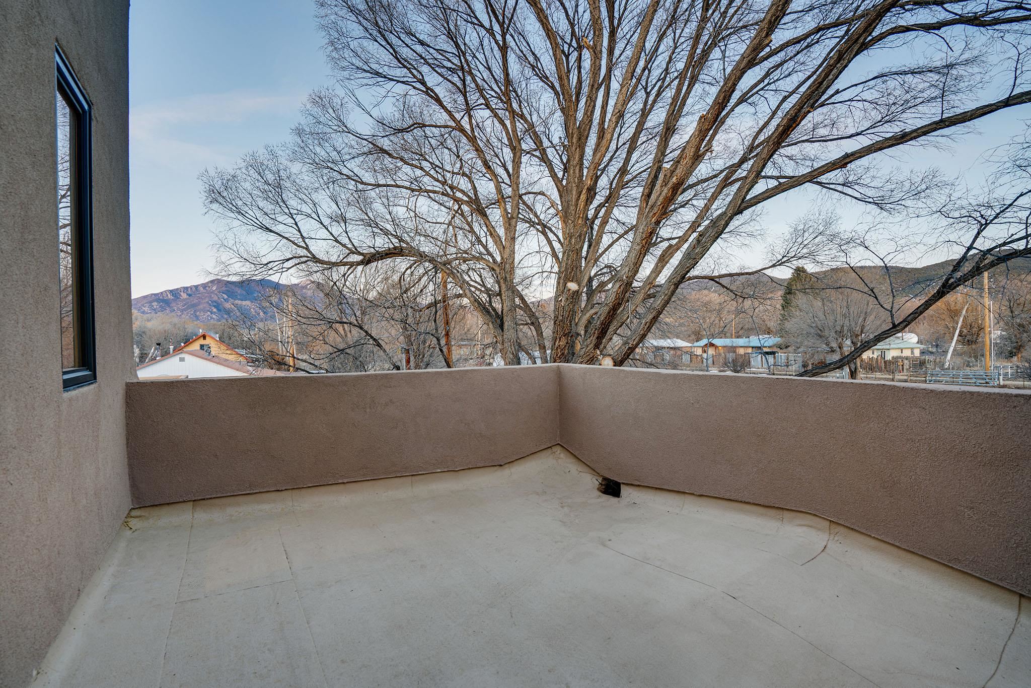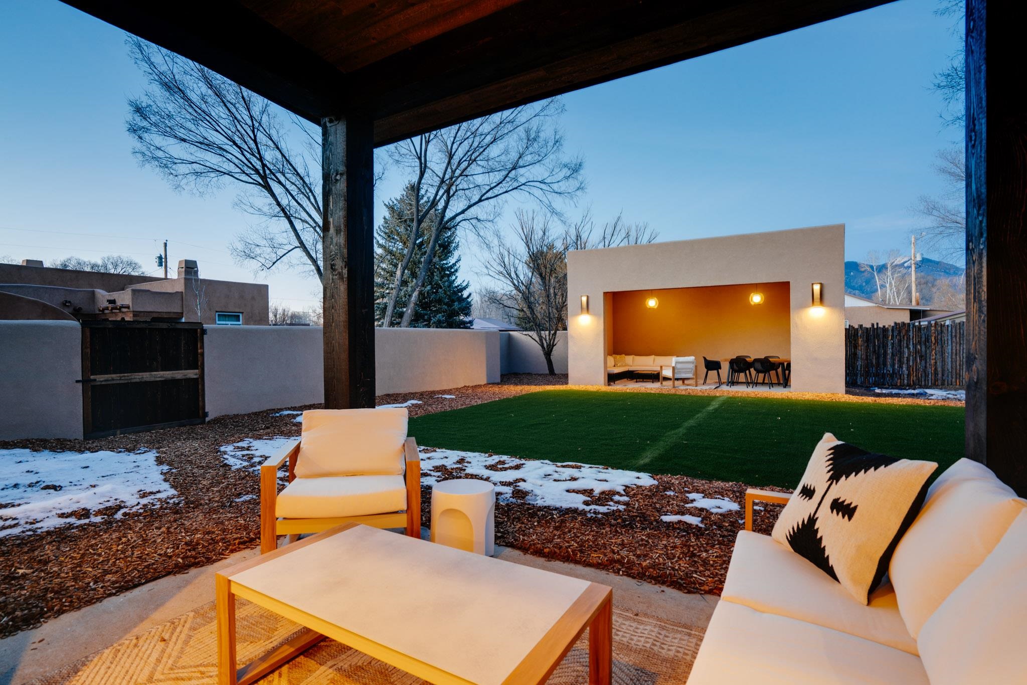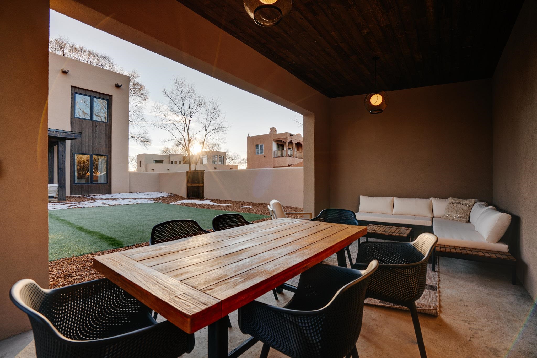 Welcome to ELMhouse, a truly spectacular newly built home surrounded by mature Siberian Elm trees. Located on the quiet Vigil Street you are afforded all the conveniences that town living has to offer. Designed and built by award winning Architect/Interior Designer, Johnna Barrett of Barrett Design, Elm House incorporates bold, dramatic design with the latest in eco-friendly sustainability. As you approach the property, the first thing you notice is the impressive custom designed Corten steel panel which is backlit at night. The lovely foyer, lit with a wall of electric pillar candles and handmade clay tile leads to the open kitchen/ dining/ living area. The kitchen offers Bosch electric appliances and durable, stain resistant quartz countertops with a Summit gas cooktop. A 9-foot Panoramic door opens to the outdoor patio and on to a detached portal which is great for leisurely lunches and dinners and excellent for entertaining. The landscaping offers minimal maintenance with weed barrier, topsoil and mulch. A patch of year-round green is provided by synthetic turf. The spacious dining/living room area has a gas fireplace as well as a mini split unit for additional heat and air conditioning. There are two bedrooms on the first level with a mini split unit in each as well as a full bath. Three storage closets and a large pantry lead to the one-car oversized garage. Enjoy electric radiant floor heat throughout the home. Two tankless on demand water heaters assure that you will never run out of hot water! The walls of the home are breathable lime-washed hand brushed paint which produces a velvety finish. White oak floors throughout the home come with a lifetime warranty. Five handmade wire lamps are suspended from the ceiling, giving a striking effect as you ascend to the second level. The risers of the stairs leading to the second level are enhanced by decorative encaustic tiles. Upstairs you will find the spacious primary bedroom offering a glorious view of Taos Mountain, a gas fireplace and a large ensuite bathroom. The plaster work in the bathrooms is Tadelakt , an elegant traditional waterproof Moroccan lime-based plaster with handmade clay tiles. There is an additional bedroom and a bonus room with a terrace. The bonus room can be used as an office, a TV room, studio, or an additional bedroom. This newly constructed 2488 SF 4-bedroom, 3 bath home which sits on .215 acres with high ceiling and skylights is filled with natural light. The construction is 2x6 and 2x12 which gives the home a very solid feeling. The exterior of the home is finished with Elastomeric stucco, a superior, long lasting, water and crack resistant product. Superior craftsmanship can be seen in every aspect of construction and design. The home is offered fully furnished and decorated in a sophisticated and soothing neutral color scheme giving a buyer the opportunity to add their own personal touches. Bold and dramatic, this stunning eco-friendly home is a must-see and beckons you to call it your own.