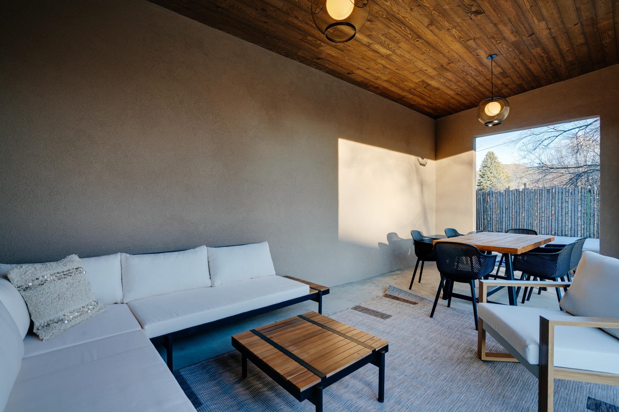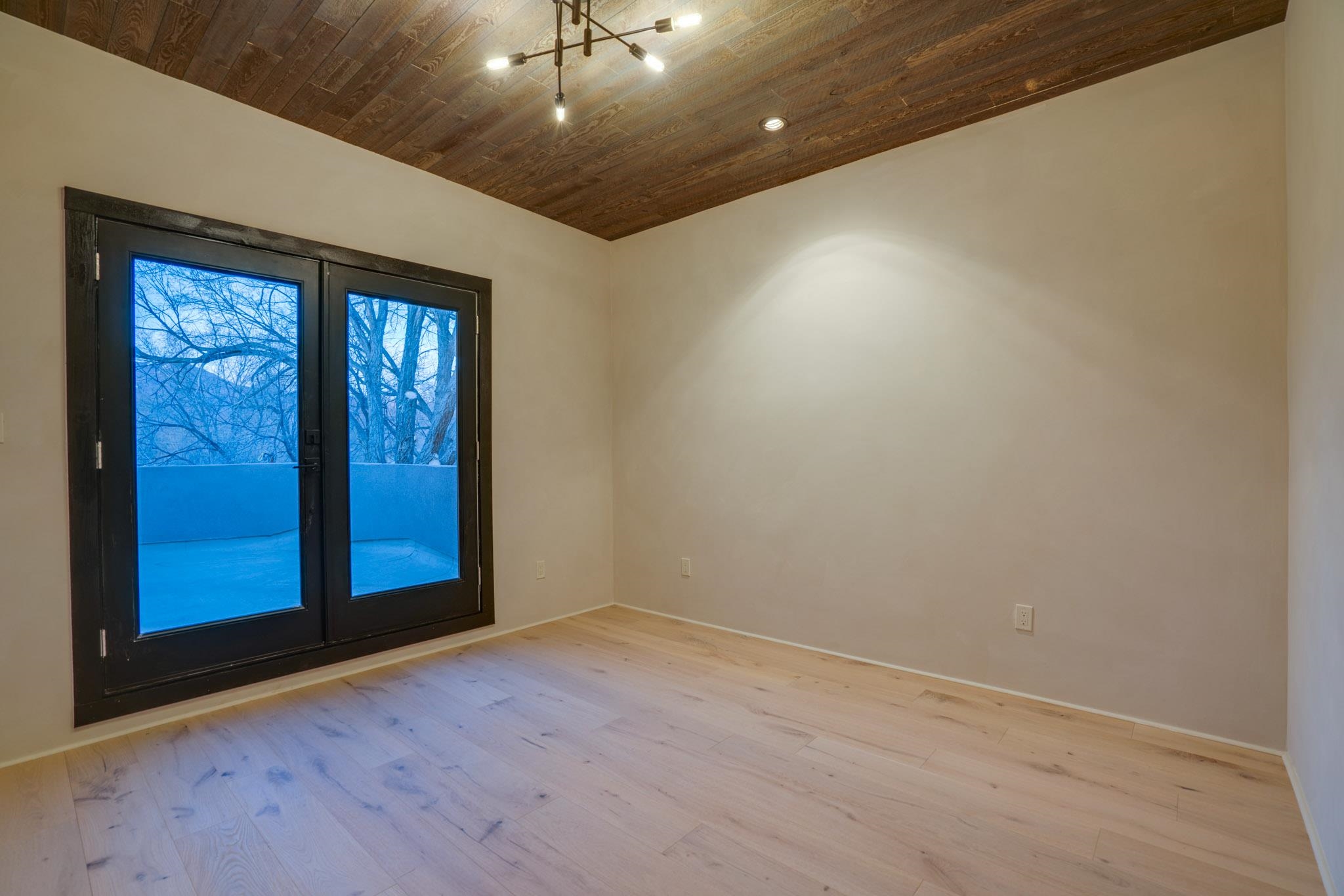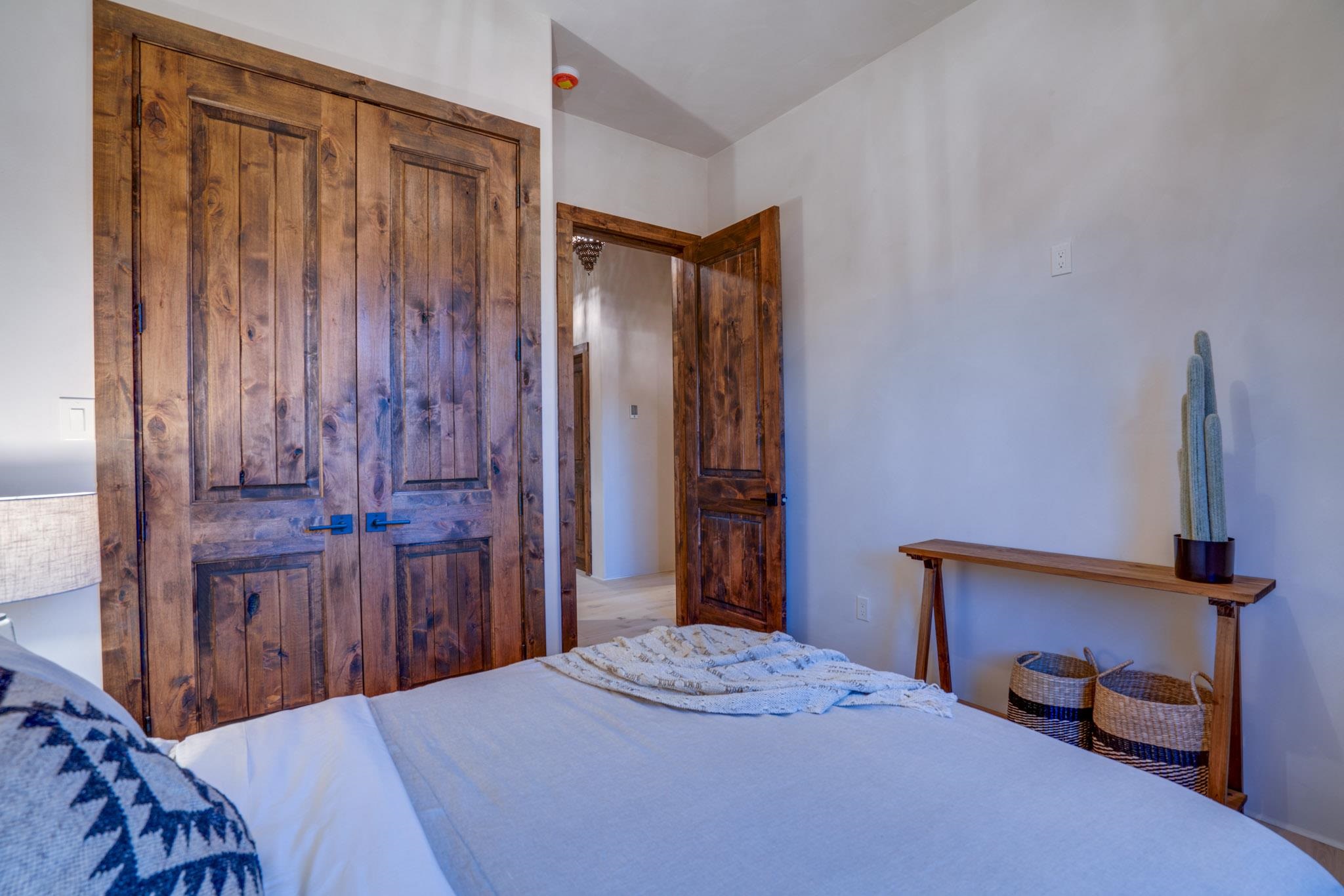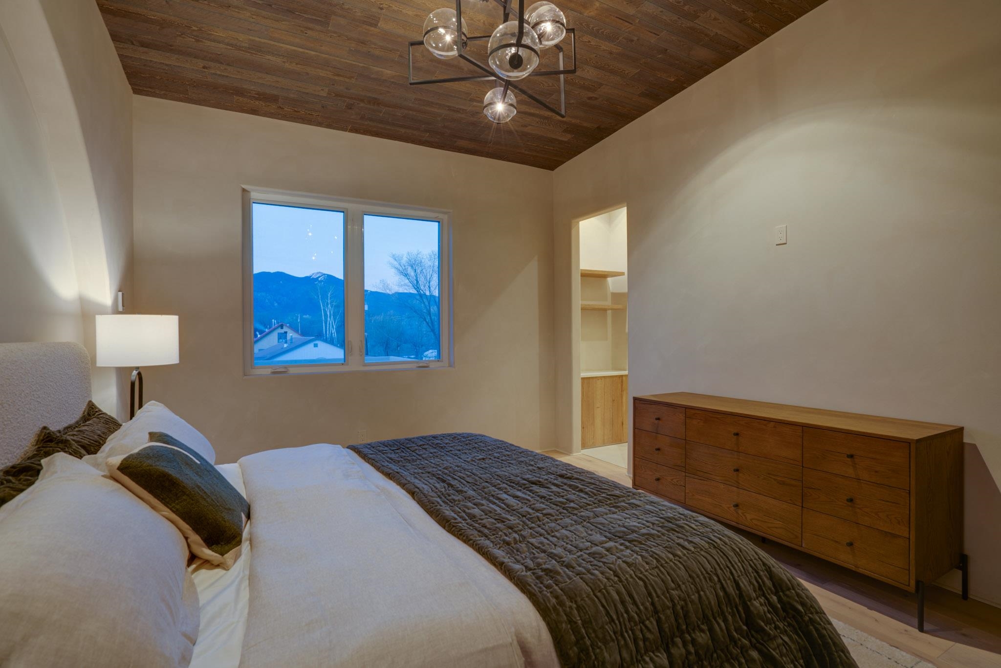 Welcome to ELMhouse, a truly spectacular newly built home surrounded by mature Siberian Elm trees. Located on the quiet Vigil Street you are afforded all the conveniences that town living has to offer. Designed and built by award winning Architect/Interior Designer, Johnna Barrett of Barrett Design, Elm House incorporates bold, dramatic design with the latest in eco-friendly sustainability. As you approach the property, the first thing you notice is the impressive custom designed Corten steel panel which is backlit at night. The lovely foyer, lit with a wall of electric pillar candles and handmade clay tile leads to the open kitchen/ dining/ living area. The kitchen offers Bosch electric appliances and durable, stain resistant quartz countertops with a Summit gas cooktop. A 9-foot Panoramic door opens to the outdoor patio and on to a detached portal which is great for leisurely lunches and dinners and excellent for entertaining. The landscaping offers minimal maintenance with weed barrier, topsoil and mulch. A patch of year-round green is provided by synthetic turf. The spacious dining/living room area has a gas fireplace as well as a mini split unit for additional heat and air conditioning. There are two bedrooms on the first level with a mini split unit in each as well as a full bath. Three storage closets and a large pantry lead to the one-car oversized garage. Enjoy electric radiant floor heat throughout the home. Two tankless on demand water heaters assure that you will never run out of hot water! The walls of the home are breathable lime-washed hand brushed paint which produces a velvety finish. White oak floors throughout the home come with a lifetime warranty. Five handmade wire lamps are suspended from the ceiling, giving a striking effect as you ascend to the second level. The risers of the stairs leading to the second level are enhanced by decorative encaustic tiles. Upstairs you will find the spacious primary bedroom offering a glorious view of Taos Mountain, a gas fireplace and a large ensuite bathroom. The plaster work in the bathrooms is Tadelakt , an elegant traditional waterproof Moroccan lime-based plaster with handmade clay tiles. There is an additional bedroom and a bonus room with a terrace. The bonus room can be used as an office, a TV room, studio, or an additional bedroom. This newly constructed 2488 SF 4-bedroom, 3 bath home which sits on .215 acres with high ceiling and skylights is filled with natural light. The construction is 2x6 and 2x12 which gives the home a very solid feeling. The exterior of the home is finished with Elastomeric stucco, a superior, long lasting, water and crack resistant product. Superior craftsmanship can be seen in every aspect of construction and design. The home is offered fully furnished and decorated in a sophisticated and soothing neutral color scheme giving a buyer the opportunity to add their own personal touches. Bold and dramatic, this stunning eco-friendly home is a must-see and beckons you to call it your own.