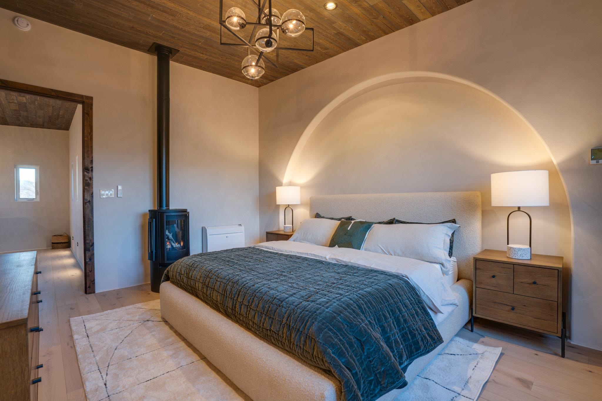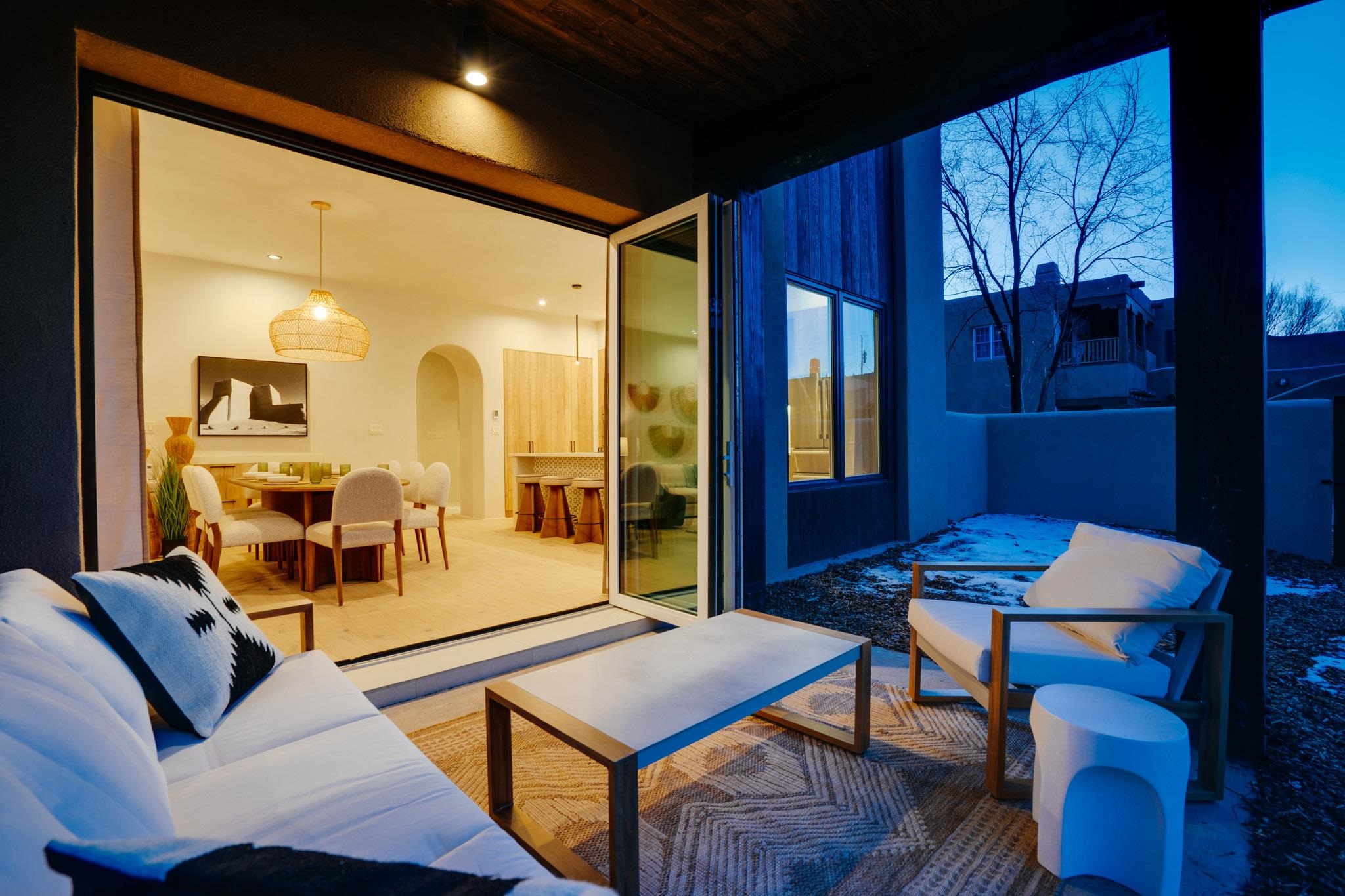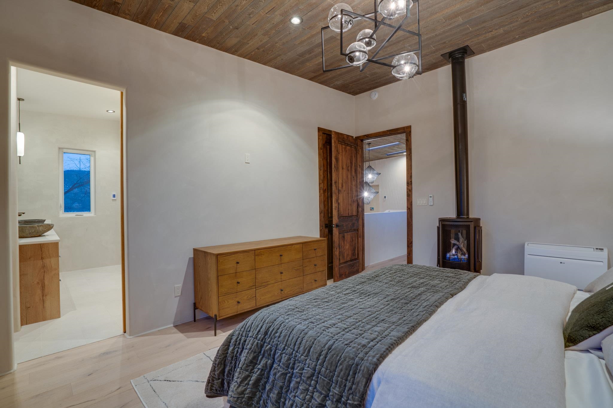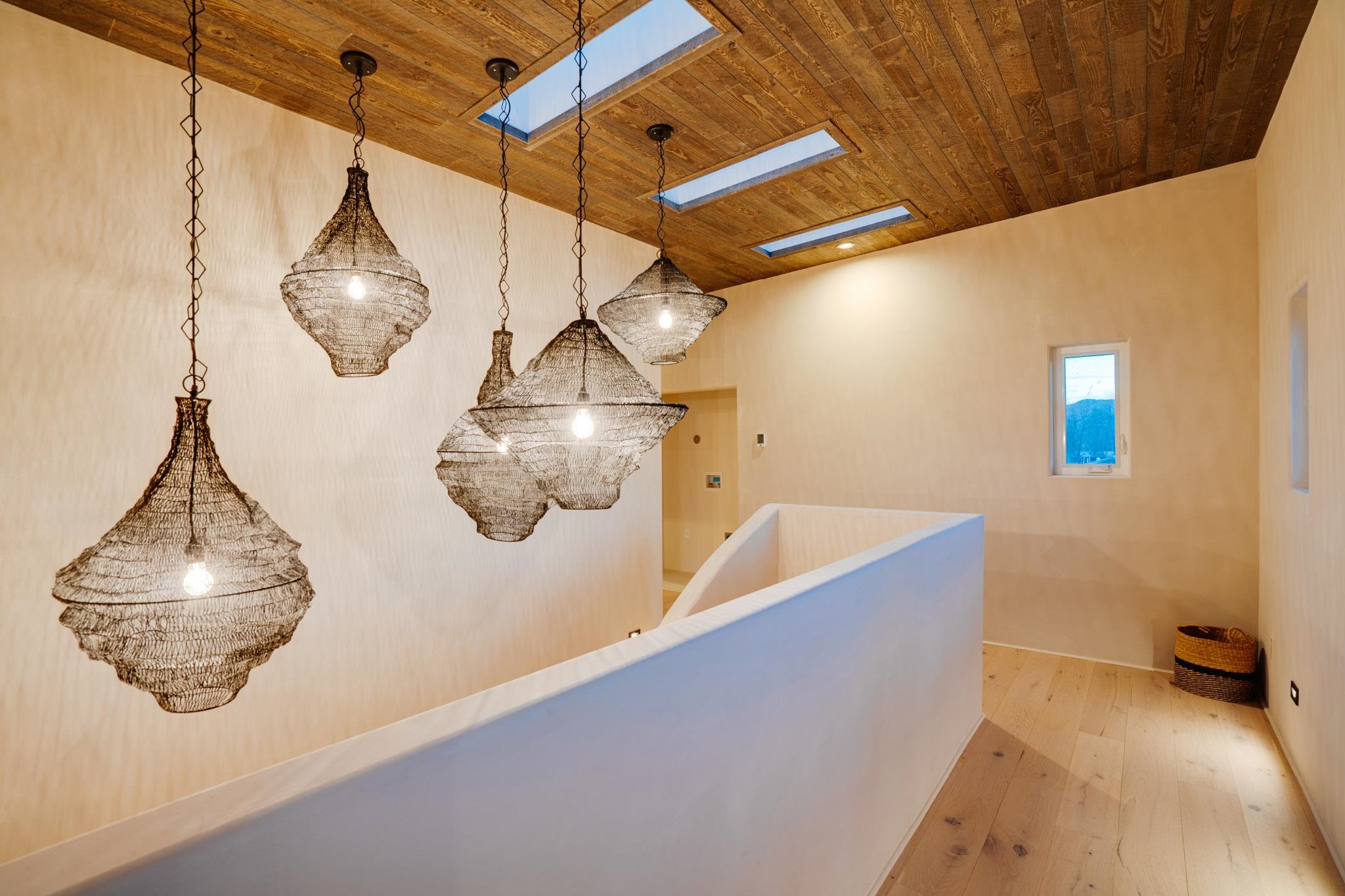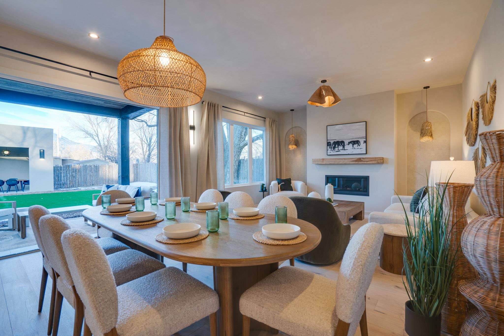 Welcome to ELMhouse, a truly spectacular newly built home surrounded by mature Siberian Elm trees. Located on the quiet Vigil Street you are afforded all the conveniences that town living has to offer. Designed and built by award winning Architect/Interior Designer, Johnna Barrett of Barrett Design, Elm House incorporates bold, dramatic design with the latest in eco-friendly sustainability. As you approach the property, the first thing you notice is the impressive custom designed Corten steel panel which is backlit at night. The lovely foyer, lit with a wall of electric pillar candles and handmade clay tile leads to the open kitchen/ dining/ living area. The kitchen offers Bosch electric appliances and durable, stain resistant quartz countertops with a Summit gas cooktop. A 9-foot Panoramic door opens to the outdoor patio and on to a detached portal which is great for leisurely lunches and dinners and excellent for entertaining. The landscaping offers minimal maintenance with weed barrier, topsoil and mulch. A patch of year-round green is provided by synthetic turf. The spacious dining/living room area has a gas fireplace as well as a mini split unit for additional heat and air conditioning. There are two bedrooms on the first level with a mini split unit in each as well as a full bath. Three storage closets and a large pantry lead to the one-car oversized garage. Enjoy electric radiant floor heat throughout the home. Two tankless on demand water heaters assure that you will never run out of hot water! The walls of the home are breathable lime-washed hand brushed paint which produces a velvety finish. White oak floors throughout the home come with a lifetime warranty. Five handmade wire lamps are suspended from the ceiling, giving a striking effect as you ascend to the second level. The risers of the stairs leading to the second level are enhanced by decorative encaustic tiles. Upstairs you will find the spacious primary bedroom offering a glorious view of Taos Mountain, a gas fireplace and a large ensuite bathroom. The plaster work in the bathrooms is Tadelakt , an elegant traditional waterproof Moroccan lime-based plaster with handmade clay tiles. There is an additional bedroom and a bonus room with a terrace. The bonus room can be used as an office, a TV room, studio, or an additional bedroom. This newly constructed 2488 SF 4-bedroom, 3 bath home which sits on .215 acres with high ceiling and skylights is filled with natural light. The construction is 2x6 and 2x12 which gives the home a very solid feeling. The exterior of the home is finished with Elastomeric stucco, a superior, long lasting, water and crack resistant product. Superior craftsmanship can be seen in every aspect of construction and design. The home is offered fully furnished and decorated in a sophisticated and soothing neutral color scheme giving a buyer the opportunity to add their own personal touches. Bold and dramatic, this stunning eco-friendly home is a must-see and beckons you to call it your own.