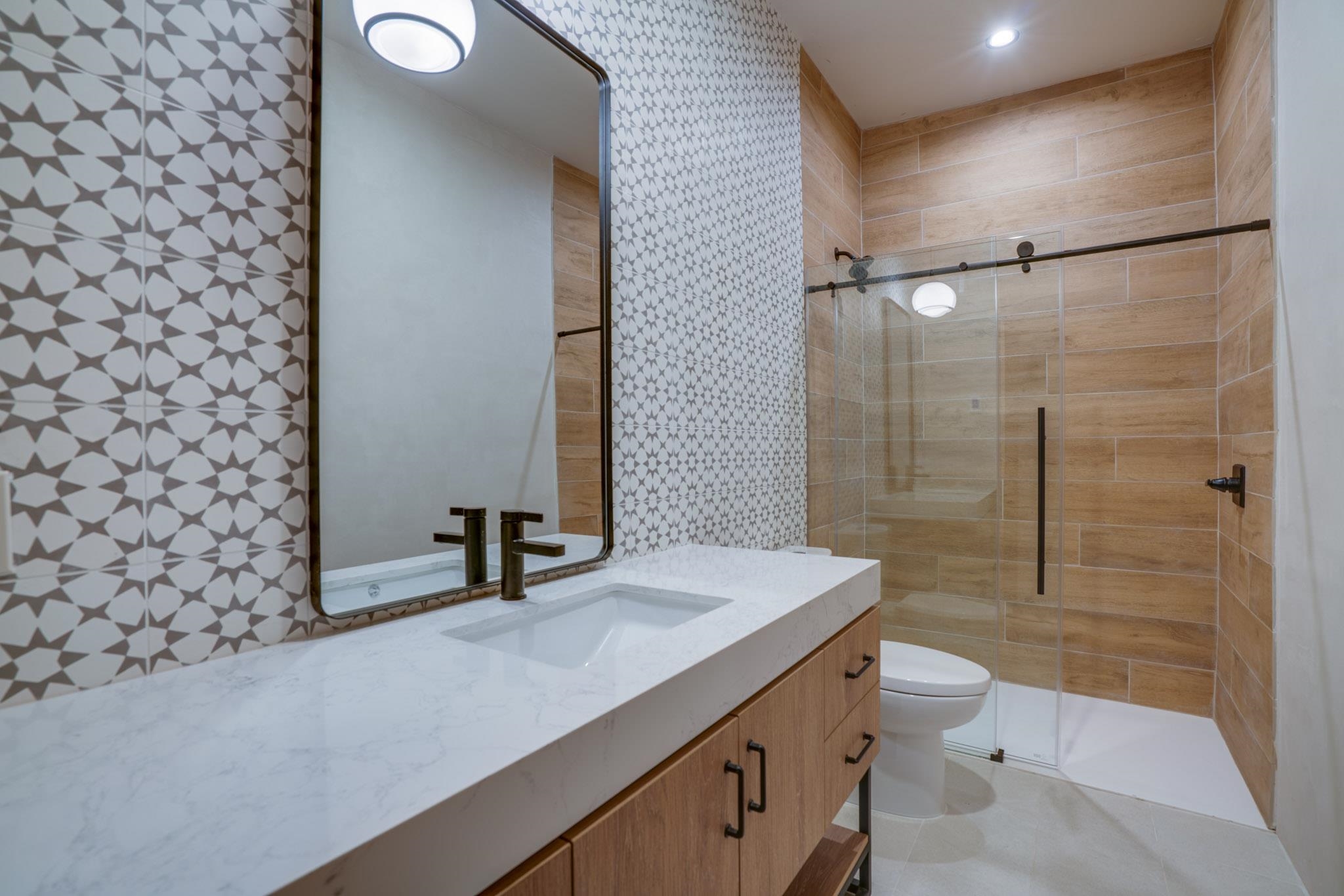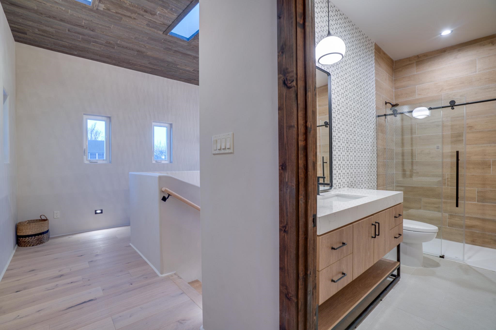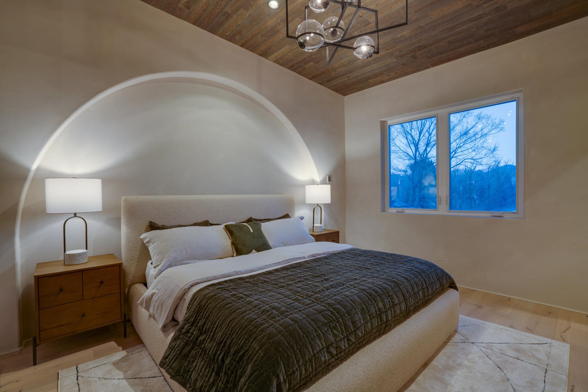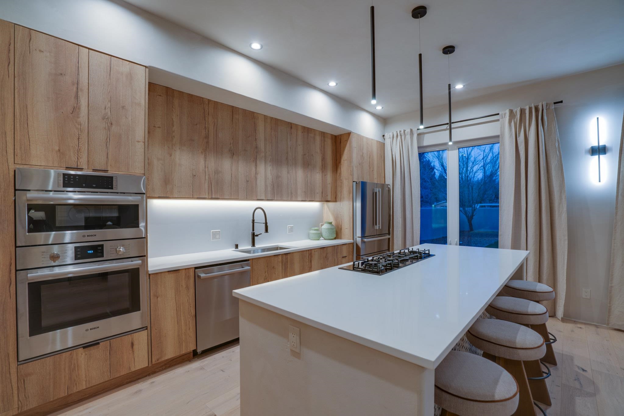 Welcome to ELMhouse, a truly spectacular newly built home surrounded by mature Siberian Elm trees. Located on the quiet Vigil Street you are afforded all the conveniences that town living has to offer. Designed and built by award winning Architect/Interior Designer, Johnna Barrett of Barrett Design, Elm House incorporates bold, dramatic design with the latest in eco-friendly sustainability. As you approach the property, the first thing you notice is the impressive custom designed Corten steel panel which is backlit at night. The lovely foyer, lit with a wall of electric pillar candles and handmade clay tile leads to the open kitchen/ dining/ living area. The kitchen offers Bosch electric appliances and durable, stain resistant quartz countertops with a Summit gas cooktop. A 9-foot Panoramic door opens to the outdoor patio and on to a detached portal which is great for leisurely lunches and dinners and excellent for entertaining. The landscaping offers minimal maintenance with weed barrier, topsoil and mulch. A patch of year-round green is provided by synthetic turf. The spacious dining/living room area has a gas fireplace as well as a mini split unit for additional heat and air conditioning. There are two bedrooms on the first level with a mini split unit in each as well as a full bath. Three storage closets and a large pantry lead to the one-car oversized garage. Enjoy electric radiant floor heat throughout the home. Two tankless on demand water heaters assure that you will never run out of hot water! The walls of the home are breathable lime-washed hand brushed paint which produces a velvety finish. White oak floors throughout the home come with a lifetime warranty. Five handmade wire lamps are suspended from the ceiling, giving a striking effect as you ascend to the second level. The risers of the stairs leading to the second level are enhanced by decorative encaustic tiles. Upstairs you will find the spacious primary bedroom offering a glorious view of Taos Mountain, a gas fireplace and a large ensuite bathroom. The plaster work in the bathrooms is Tadelakt , an elegant traditional waterproof Moroccan lime-based plaster with handmade clay tiles. There is an additional bedroom and a bonus room with a terrace. The bonus room can be used as an office, a TV room, studio, or an additional bedroom. This newly constructed 2488 SF 4-bedroom, 3 bath home which sits on .215 acres with high ceiling and skylights is filled with natural light. The construction is 2x6 and 2x12 which gives the home a very solid feeling. The exterior of the home is finished with Elastomeric stucco, a superior, long lasting, water and crack resistant product. Superior craftsmanship can be seen in every aspect of construction and design. The home is offered fully furnished and decorated in a sophisticated and soothing neutral color scheme giving a buyer the opportunity to add their own personal touches. Bold and dramatic, this stunning eco-friendly home is a must-see and beckons you to call it your own.