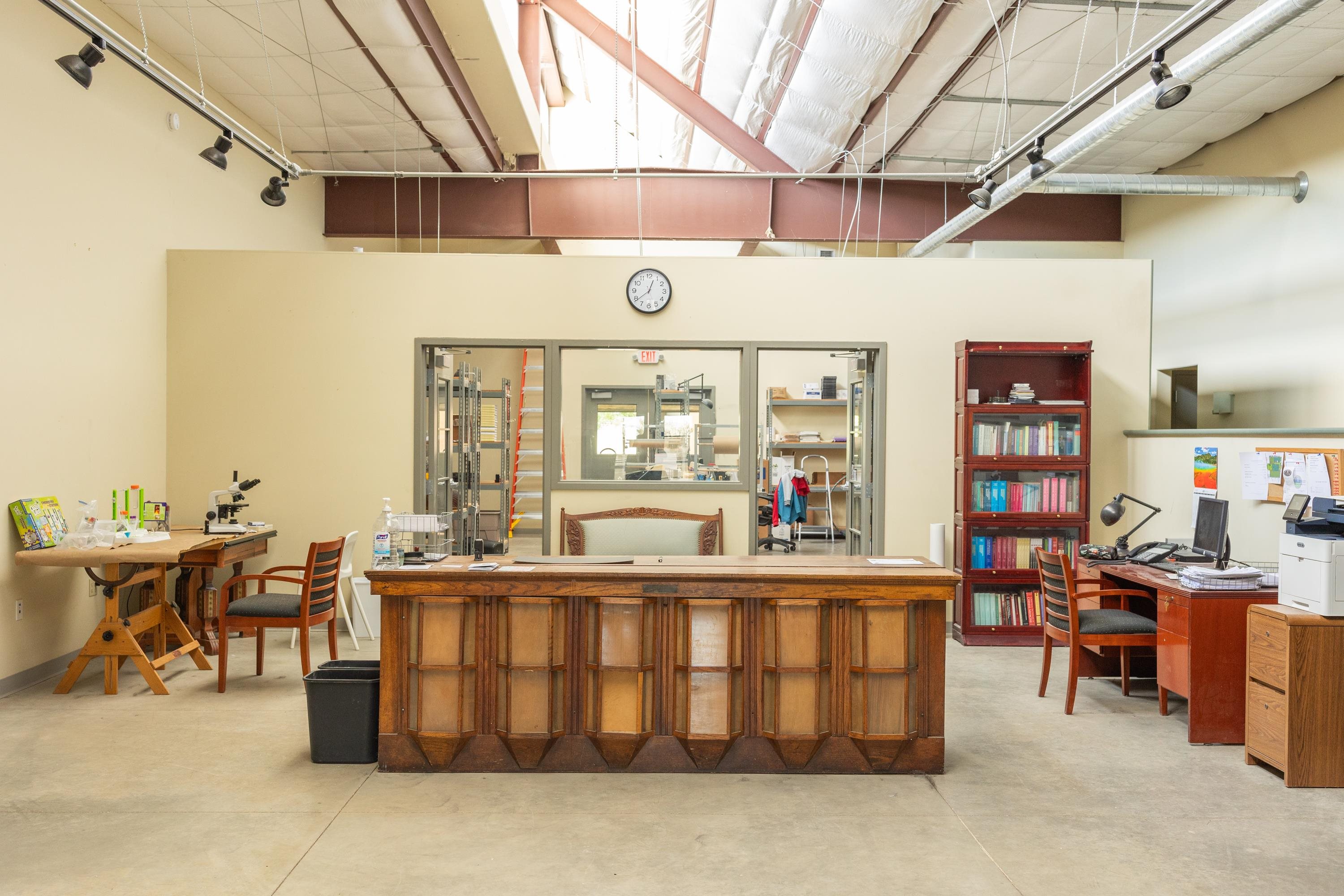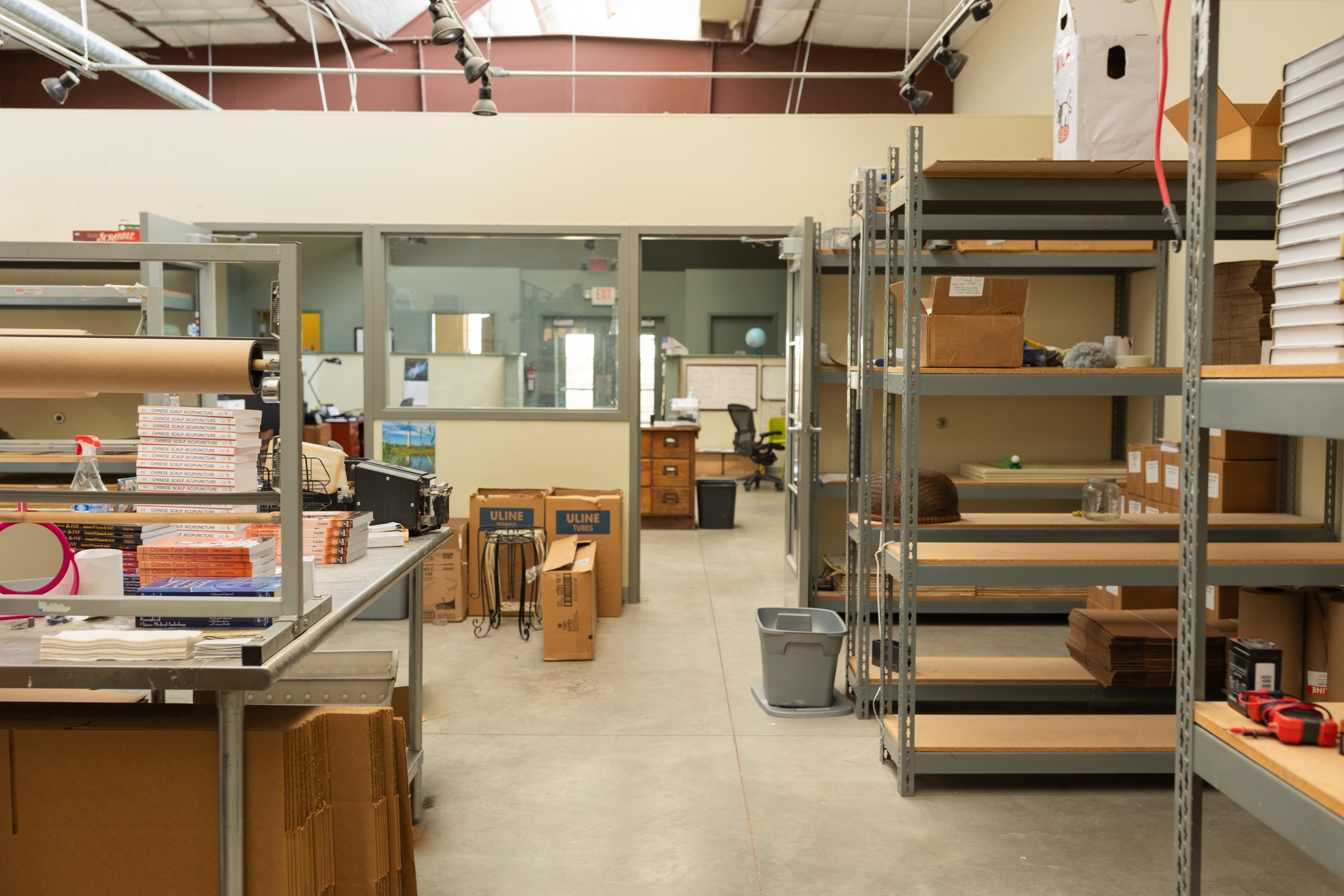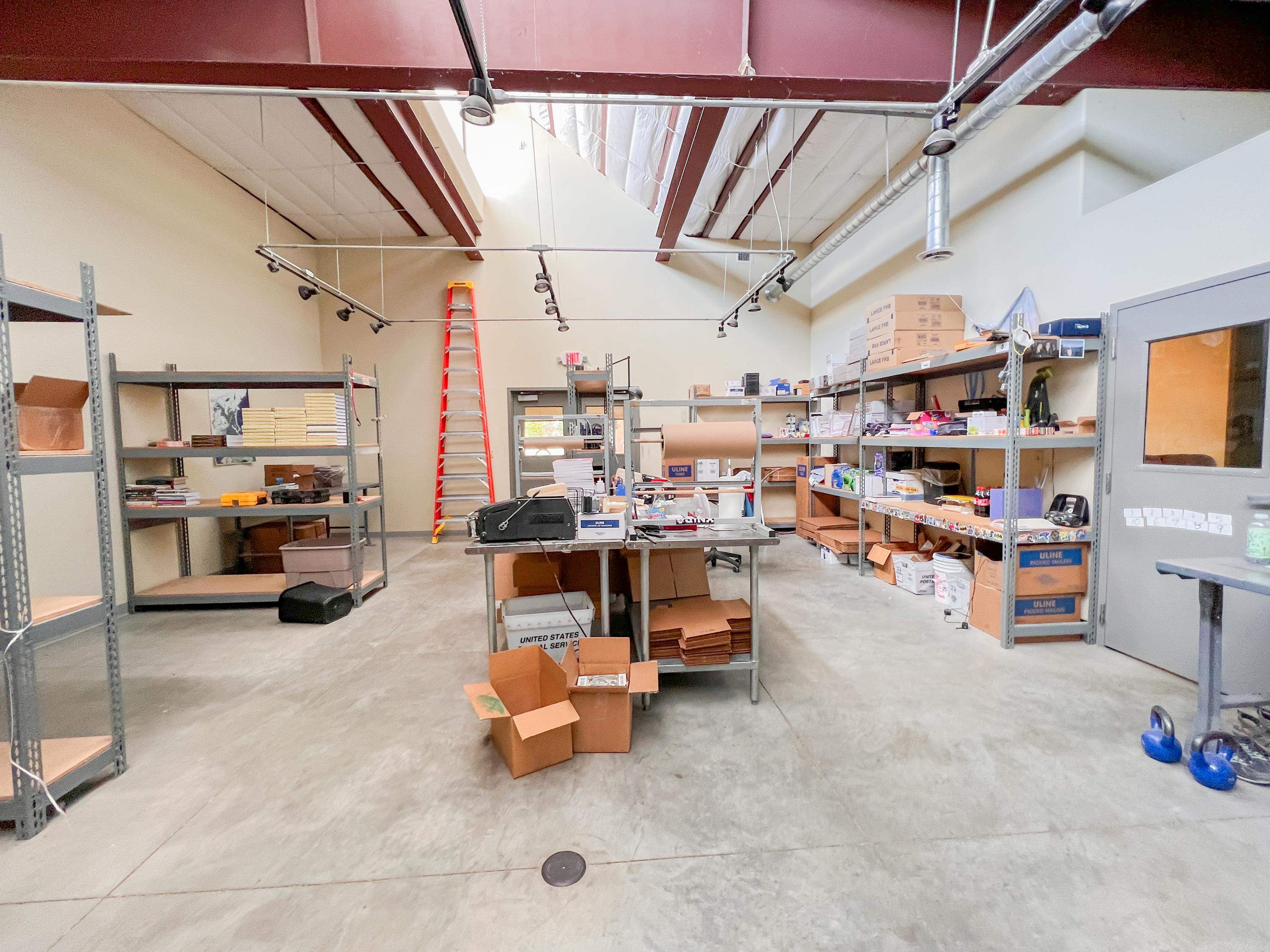 This building was designed and built as a working warehouse and distribution center for a book publishing company, using sustainable development principles. There are many natural and harmonious features allowing an aesthetically pleasing environment for future occupants. High ceilings and large clerestory windows provide diffused natural lighting throughout, while the lower windows are operable and shielded to reduce solar gain in the summer. Insulated walls of R-28, and R38, in the roof, maintains comfort and control inside. Efficient lighting, radiant heated floor zones, low volume plumbing fixtures and energy efficient controls systems, make this property a pleasure to own and operate. The exterior grounds are landscaped and irrigated with drought resistant plants and structured to take advantage of the how the elements impact the building over the course of the year. Passive solar gain on the south side into offices, conference and lounge areas. Small exterior patio off lounge provides outdoor seating and recreation area. Inside, the building is designed as open offices and meeting areas, a library or large conference room, several private perimeter offices, a common kitchen area, two large bathrooms, and several clean and well lit storage and delivery areas. There is also a second commercial kitchen, with many appliances in place near the loading area.