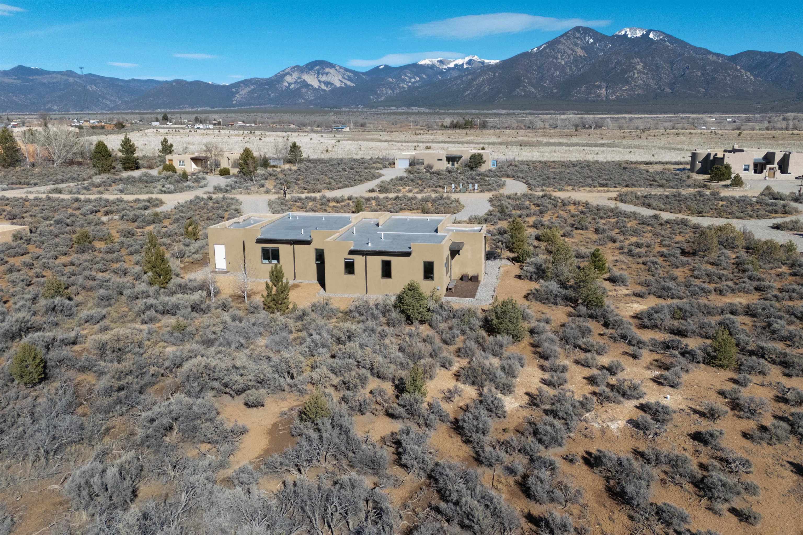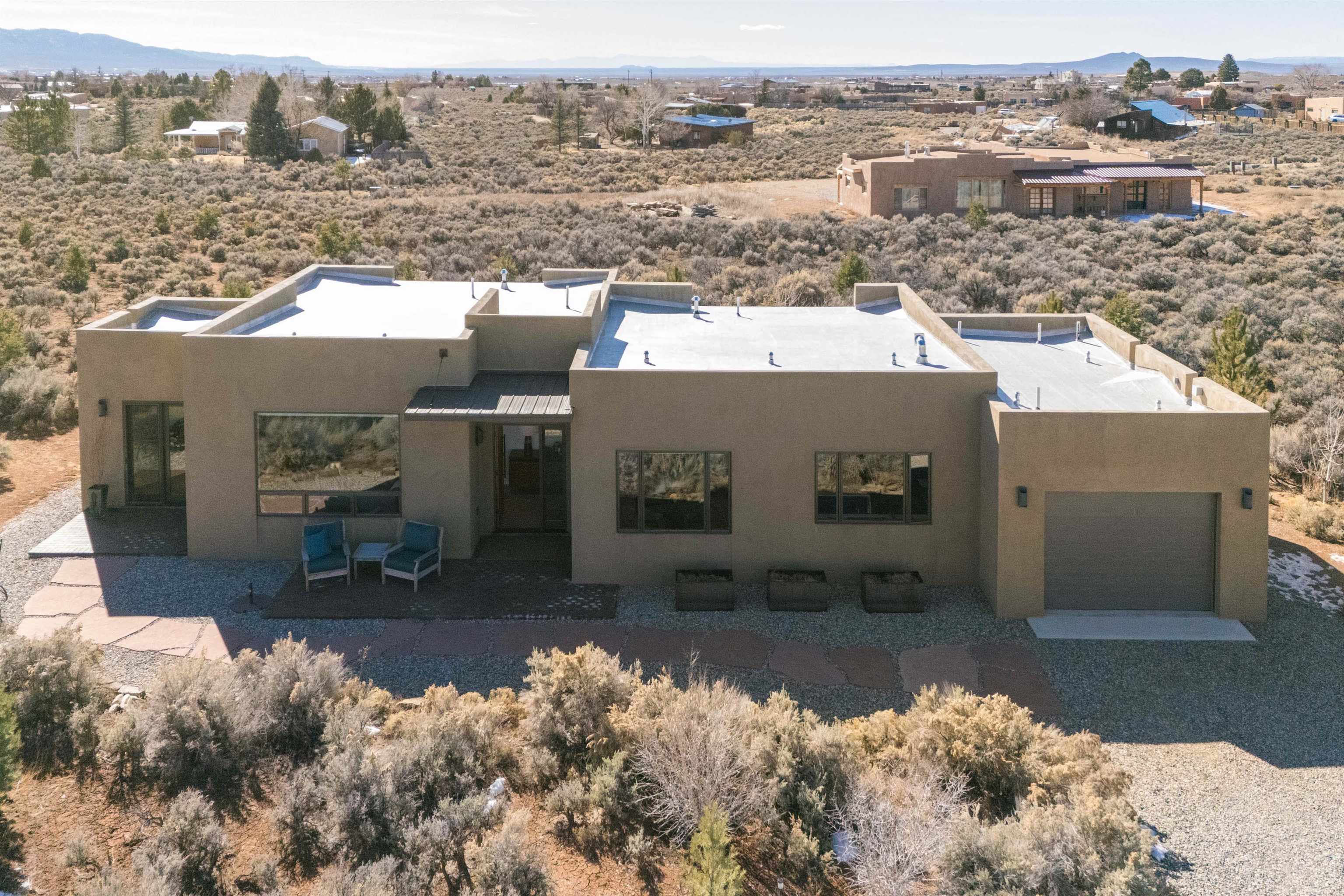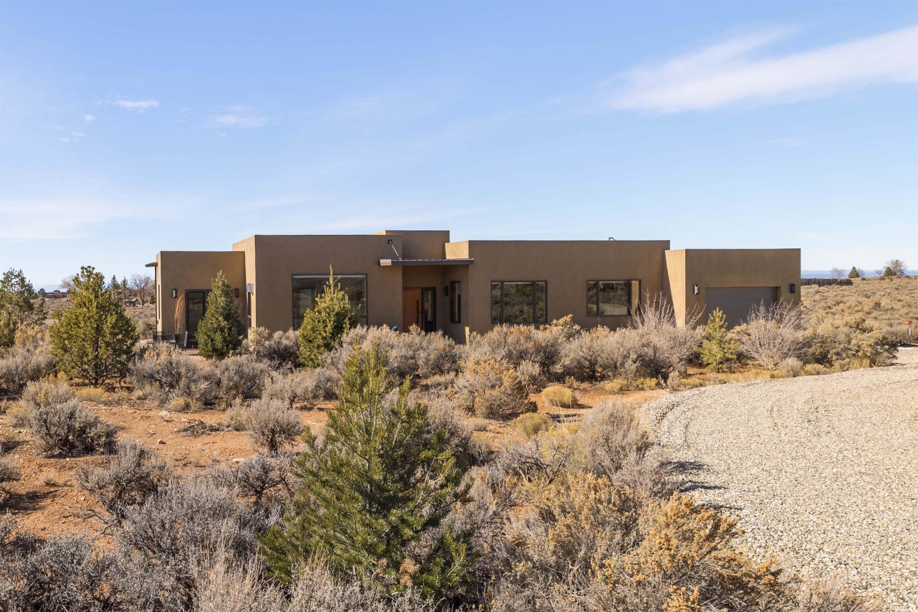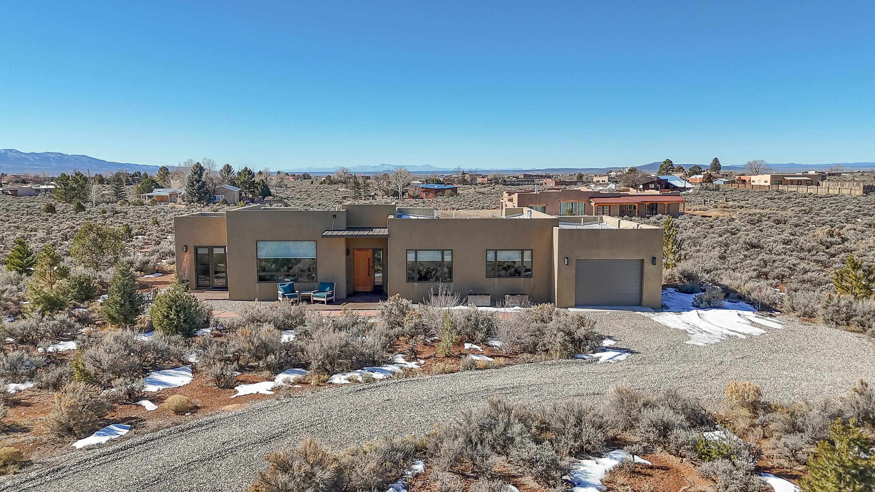 At the quiet end of a dead-end road, where the land opens into protected beauty and the sky feels endless, this contemporary Southwest residence offers a rare harmony of privacy, design, and place. Thoughtfully built just five years ago and maintained to the highest standard, the two-bedroom, two-bath home lives like new--radiant floor heat beneath your feet, a glowing gas Jotul fireplace anchoring the living space, and expansive windows framing the ever-changing drama of the Sangre de Cristo Mountains. Natural light moves effortlessly through the interiors, illuminating clean lines and warm, organic textures. The kitchen is exceptional--abundant custom storage, top-of-the-line Frigidaire Professional appliances, double wall ovens (convection), a convection microwave/oven combo, Zepher hood, 6 burner 36" Thor gas Range top, a large custom-built island and a gracious layout designed for both intimate evenings and inspired entertaining. Every detail feels intentional. Every finish, timeless. There are custom details throughout and all systems are thoughtful and efficient including: water softener, reverse osmosis drinking system, on demand hot water heater, instant hot water for taps, multi zone radiant heating, including garage, dimmable LED lighting inside and out, fiber optic high speed internet with ethernet wall outlets, adjustable Elfa closet systems, automatic drip irrigation and a hot tub hookup. The Primary bedroom is bathed in natural light and graced with a spa-like bath and large walk-in closet and a sublime view of Pedernal on the horizon through the West facing windows. The guest bedroom is currently used as a fantastic Artist studio. A flexible bonus room offers the perfect setting for a private office, studio, or creative sanctuary. The attached heated garage adds everyday ease, while the home's position contiguous to a conservation easement ensures lasting tranquility and gorgeous walks just out the front door. Step outside to miles of walking trails through open sage , where the landscape is preserved and the silence is sacred. Ideally located off the north end of Blueberry Hill, this property is perfectly poised between the cultural heartbeat of Taos and the alpine exhilaration of Taos Ski Valley. World-class skiing, rafting, biking, and hiking are all within effortless reach--yet home remains a peaceful retreat. Offered fully furnished with beautifully curated pieces that complement the architecture and light, this is more than a home. It is a turnkey expression of modern Southwest living--romantic, refined, and ready to be lived in beautifully.