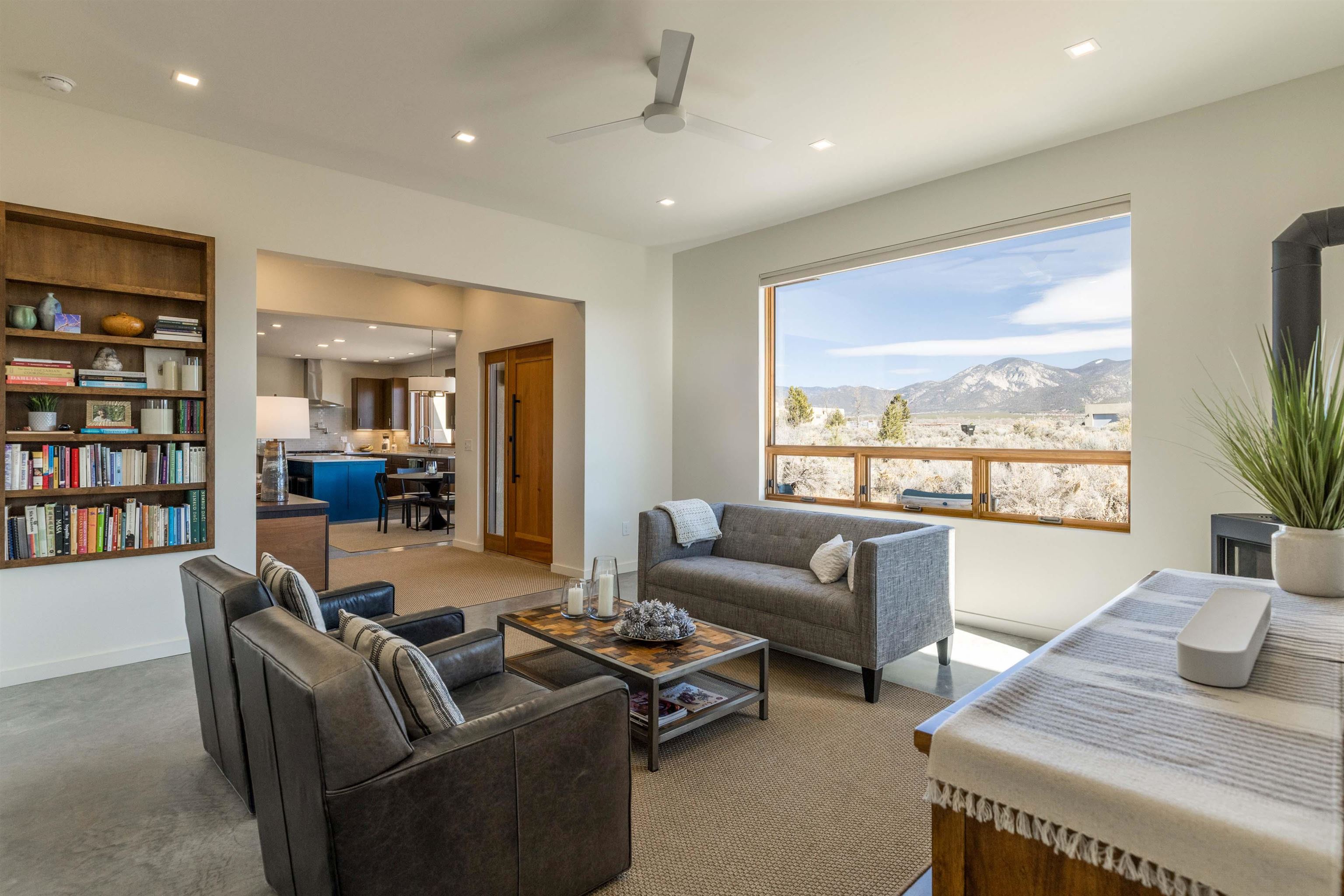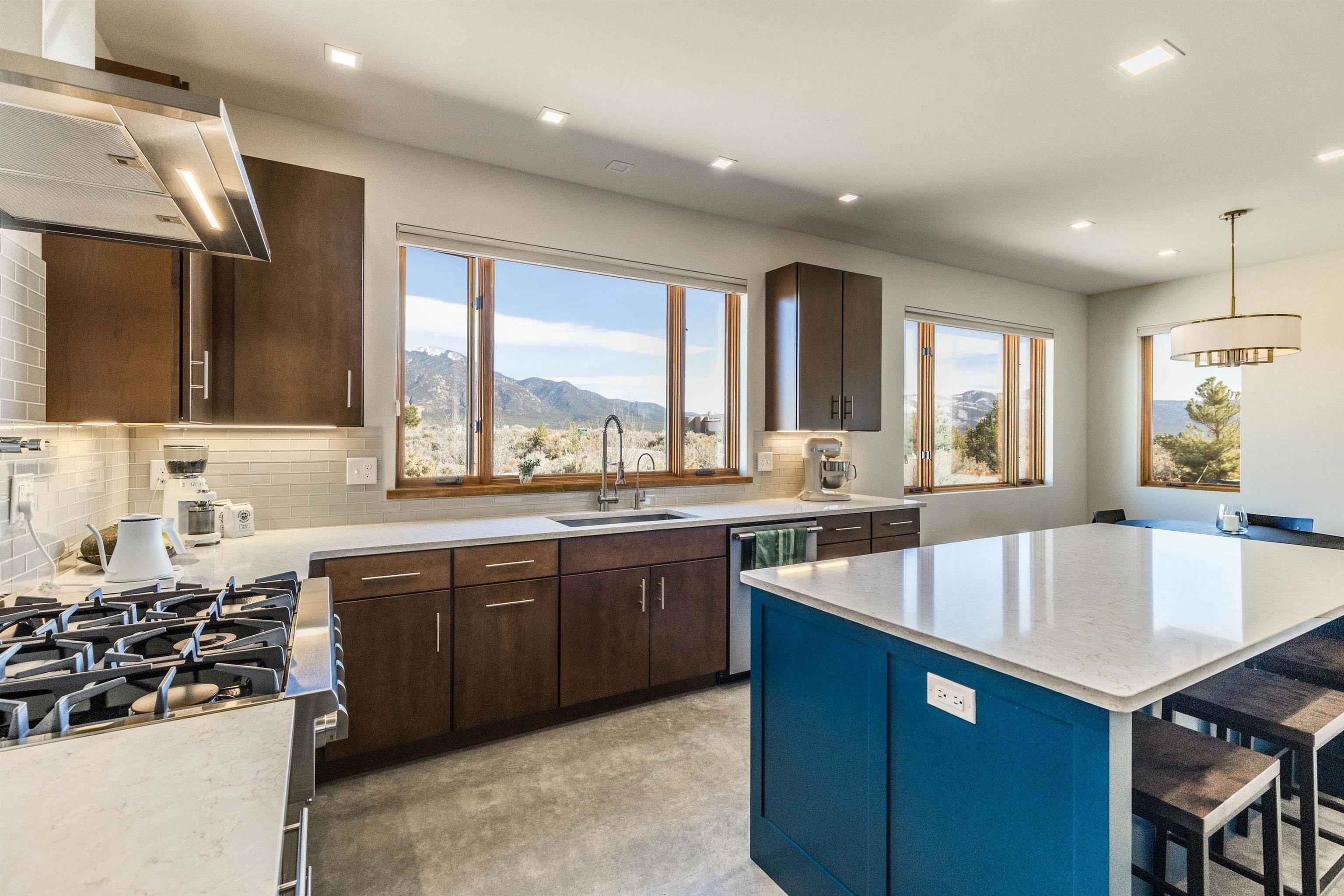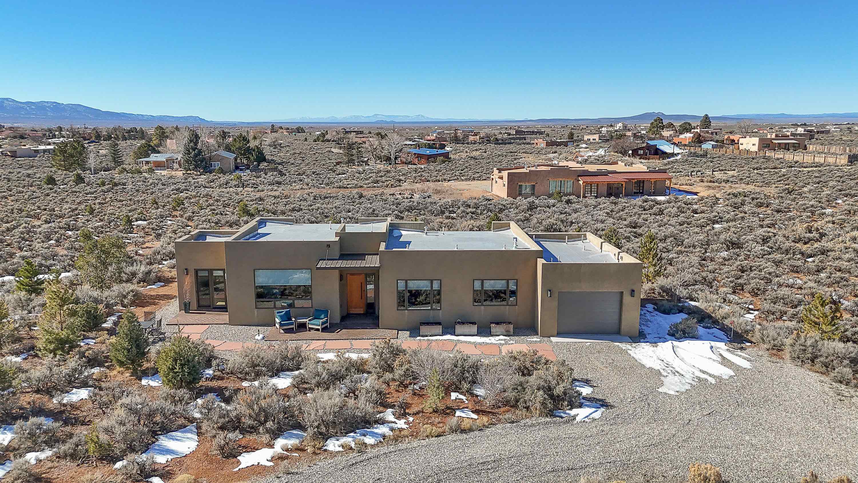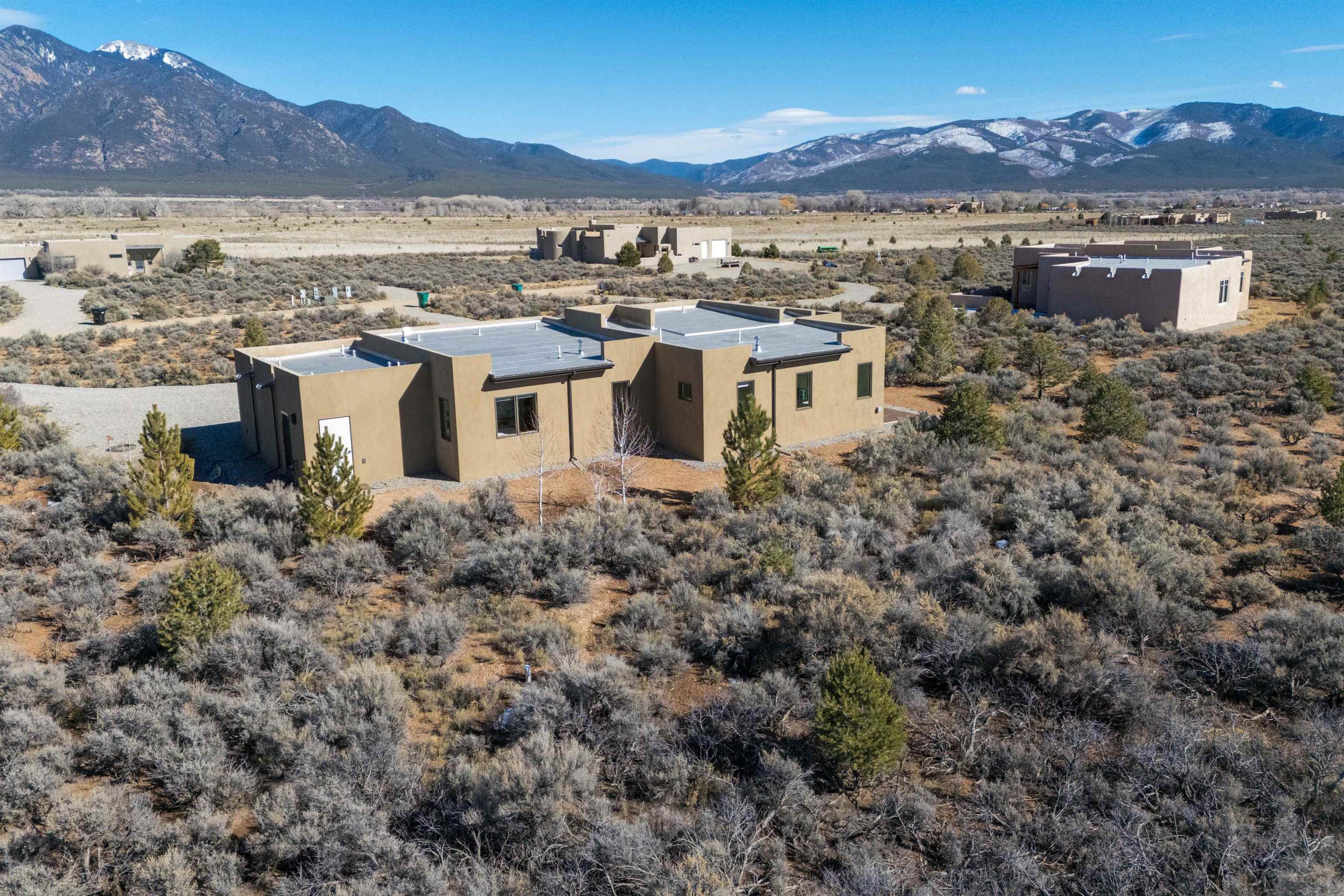 At the quiet end of a dead-end road, where the land opens into protected beauty and the sky feels endless, this contemporary Southwest residence offers a rare harmony of privacy, design, and place. Thoughtfully built just five years ago and maintained to the highest standard, the two-bedroom, two-bath home lives like new--radiant floor heat beneath your feet, a glowing gas Jotul fireplace anchoring the living space, and expansive windows framing the ever-changing drama of the Sangre de Cristo Mountains. Natural light moves effortlessly through the interiors, illuminating clean lines and warm, organic textures. The kitchen is exceptional--abundant custom storage, top-of-the-line Frigidaire Professional appliances, double wall ovens (convection), a convection microwave/oven combo, Zepher hood, 6 burner 36" Thor gas Range top, a large custom-built island and a gracious layout designed for both intimate evenings and inspired entertaining. Every detail feels intentional. Every finish, timeless. There are custom details throughout and all systems are thoughtful and efficient including: water softener, reverse osmosis drinking system, on demand hot water heater, instant hot water for taps, multi zone radiant heating, including garage, dimmable LED lighting inside and out, fiber optic high speed internet with ethernet wall outlets, adjustable Elfa closet systems, automatic drip irrigation and a hot tub hookup. The Primary bedroom is bathed in natural light and graced with a spa-like bath and large walk-in closet and a sublime view of Pedernal on the horizon through the West facing windows. The guest bedroom is currently used as a fantastic Artist studio. A flexible bonus room offers the perfect setting for a private office, studio, or creative sanctuary. The attached heated garage adds everyday ease, while the home's position contiguous to a conservation easement ensures lasting tranquility and gorgeous walks just out the front door. Step outside to miles of walking trails through open sage , where the landscape is preserved and the silence is sacred. Ideally located off the north end of Blueberry Hill, this property is perfectly poised between the cultural heartbeat of Taos and the alpine exhilaration of Taos Ski Valley. World-class skiing, rafting, biking, and hiking are all within effortless reach--yet home remains a peaceful retreat. Offered fully furnished with beautifully curated pieces that complement the architecture and light, this is more than a home. It is a turnkey expression of modern Southwest living--romantic, refined, and ready to be lived in beautifully.