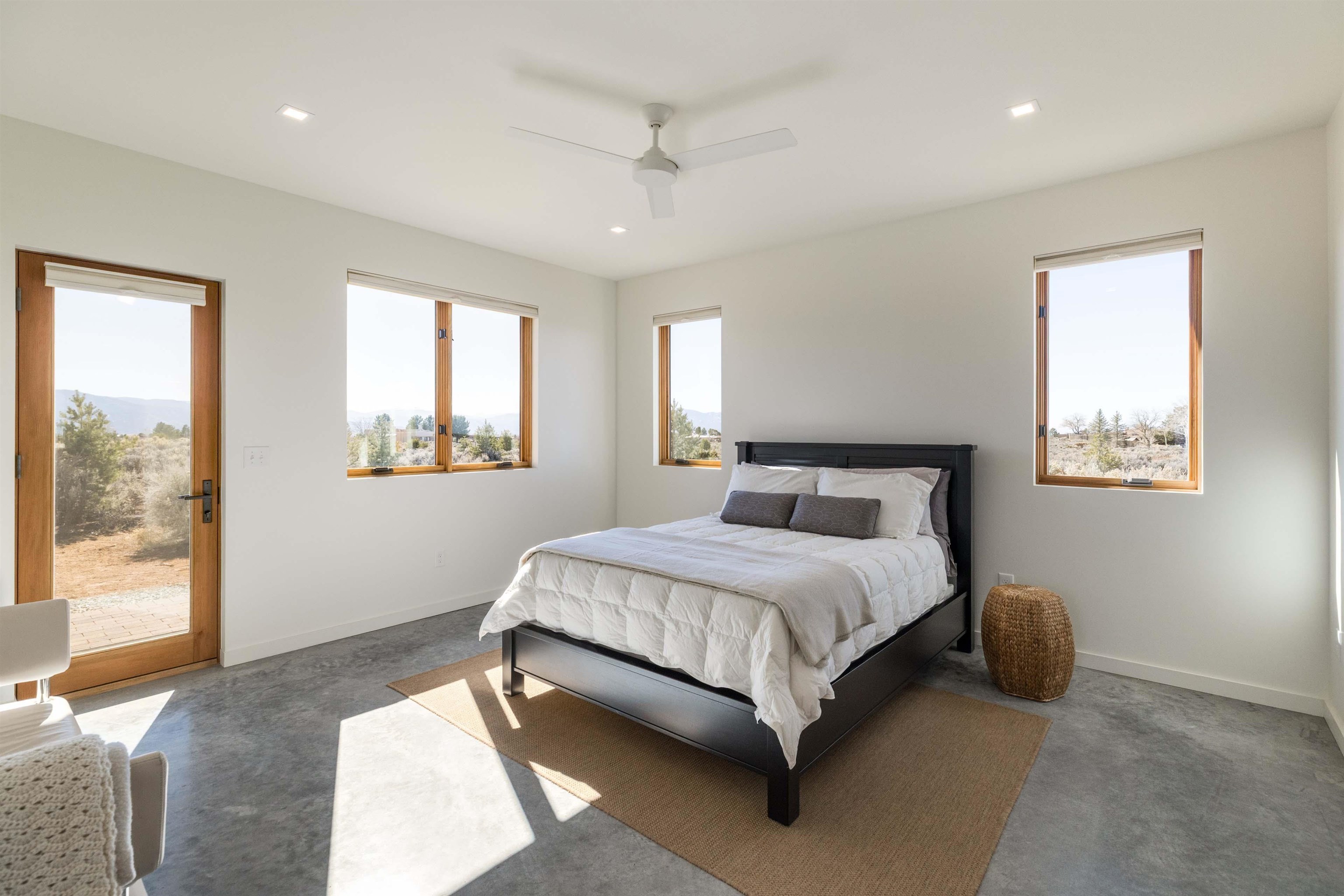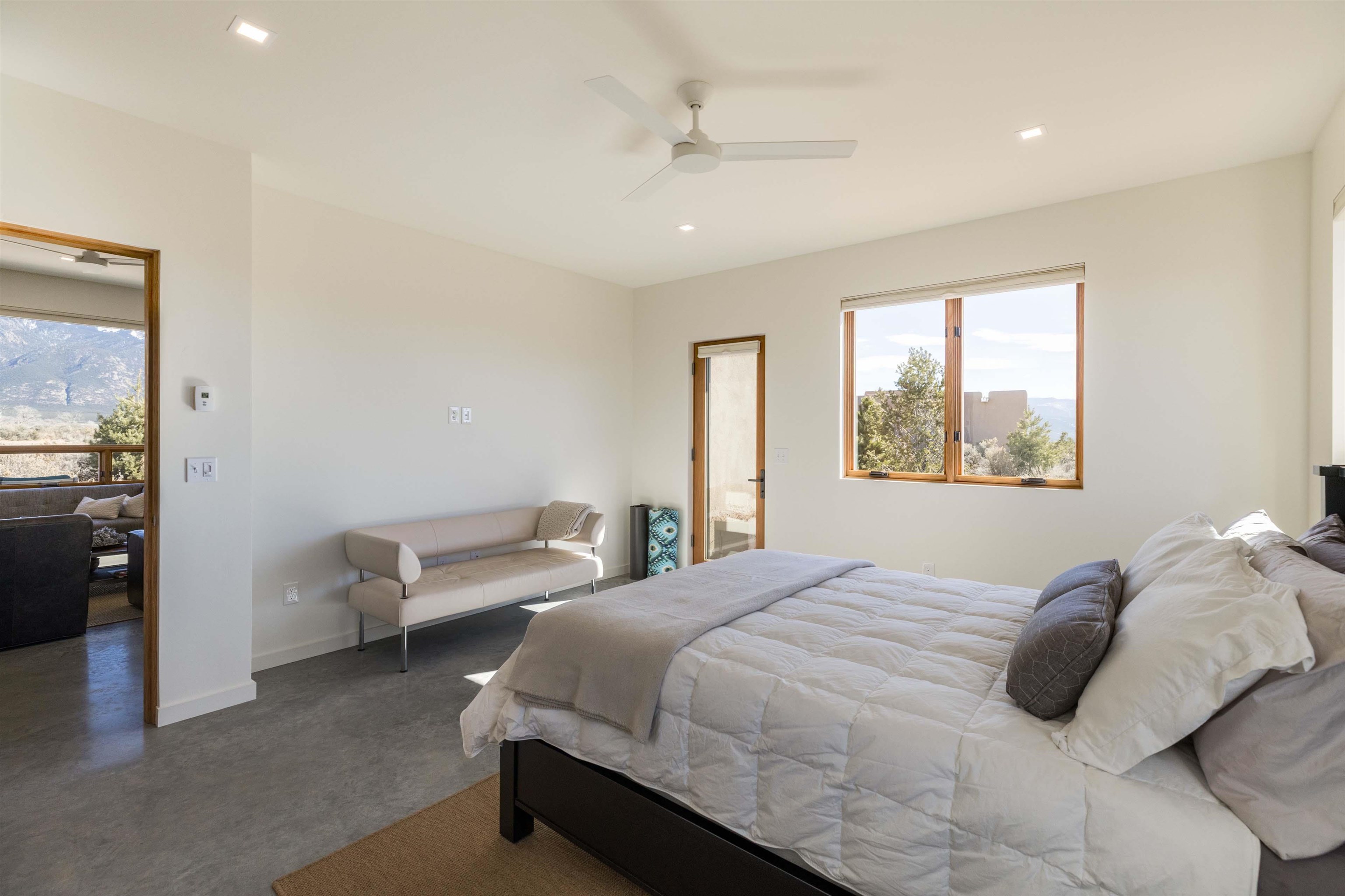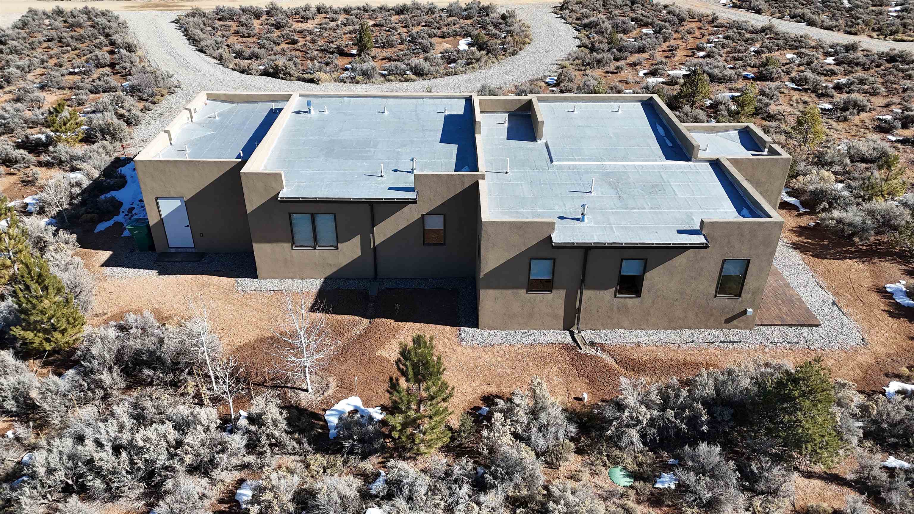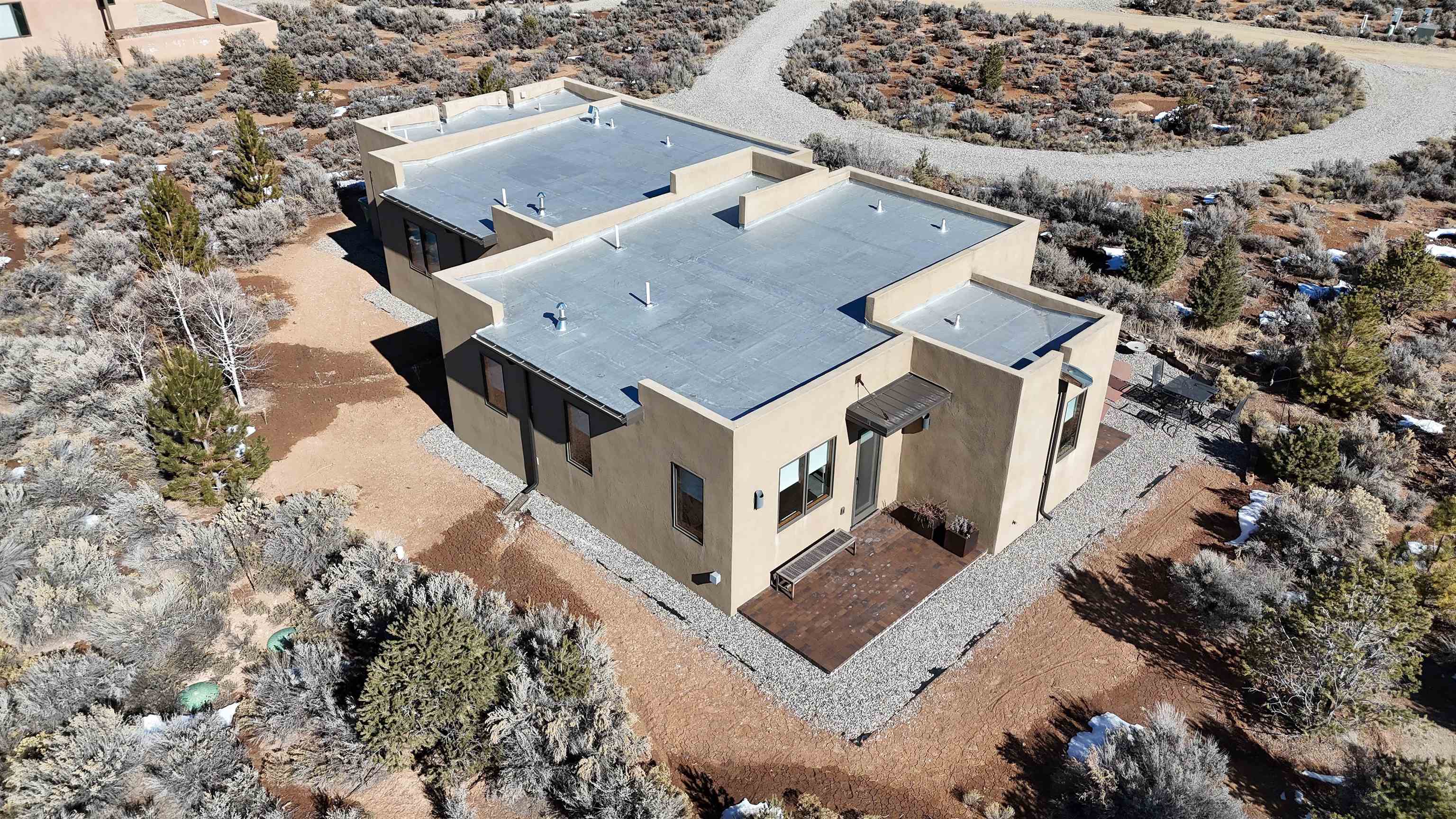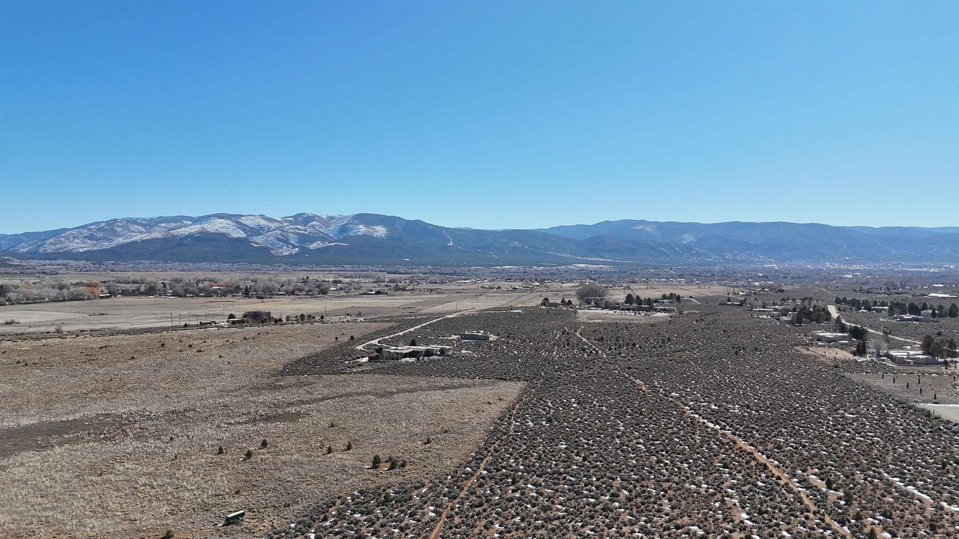 At the quiet end of a dead-end road, where the land opens into protected beauty and the sky feels endless, this contemporary Southwest residence offers a rare harmony of privacy, design, and place. Thoughtfully built just five years ago and maintained to the highest standard, the two-bedroom, two-bath home lives like new--radiant floor heat beneath your feet, a glowing gas Jotul fireplace anchoring the living space, and expansive windows framing the ever-changing drama of the Sangre de Cristo Mountains. Natural light moves effortlessly through the interiors, illuminating clean lines and warm, organic textures. The kitchen is exceptional--abundant custom storage, top-of-the-line Frigidaire Professional appliances, double wall ovens (convection), a convection microwave/oven combo, Zepher hood, 6 burner 36" Thor gas Range top, a large custom-built island and a gracious layout designed for both intimate evenings and inspired entertaining. Every detail feels intentional. Every finish, timeless. There are custom details throughout and all systems are thoughtful and efficient including: water softener, reverse osmosis drinking system, on demand hot water heater, instant hot water for taps, multi zone radiant heating, including garage, dimmable LED lighting inside and out, fiber optic high speed internet with ethernet wall outlets, adjustable Elfa closet systems, automatic drip irrigation and a hot tub hookup. The Primary bedroom is bathed in natural light and graced with a spa-like bath and large walk-in closet and a sublime view of Pedernal on the horizon through the West facing windows. The guest bedroom is currently used as a fantastic Artist studio. A flexible bonus room offers the perfect setting for a private office, studio, or creative sanctuary. The attached heated garage adds everyday ease, while the home's position contiguous to a conservation easement ensures lasting tranquility and gorgeous walks just out the front door. Step outside to miles of walking trails through open sage , where the landscape is preserved and the silence is sacred. Ideally located off the north end of Blueberry Hill, this property is perfectly poised between the cultural heartbeat of Taos and the alpine exhilaration of Taos Ski Valley. World-class skiing, rafting, biking, and hiking are all within effortless reach--yet home remains a peaceful retreat. Offered fully furnished with beautifully curated pieces that complement the architecture and light, this is more than a home. It is a turnkey expression of modern Southwest living--romantic, refined, and ready to be lived in beautifully.