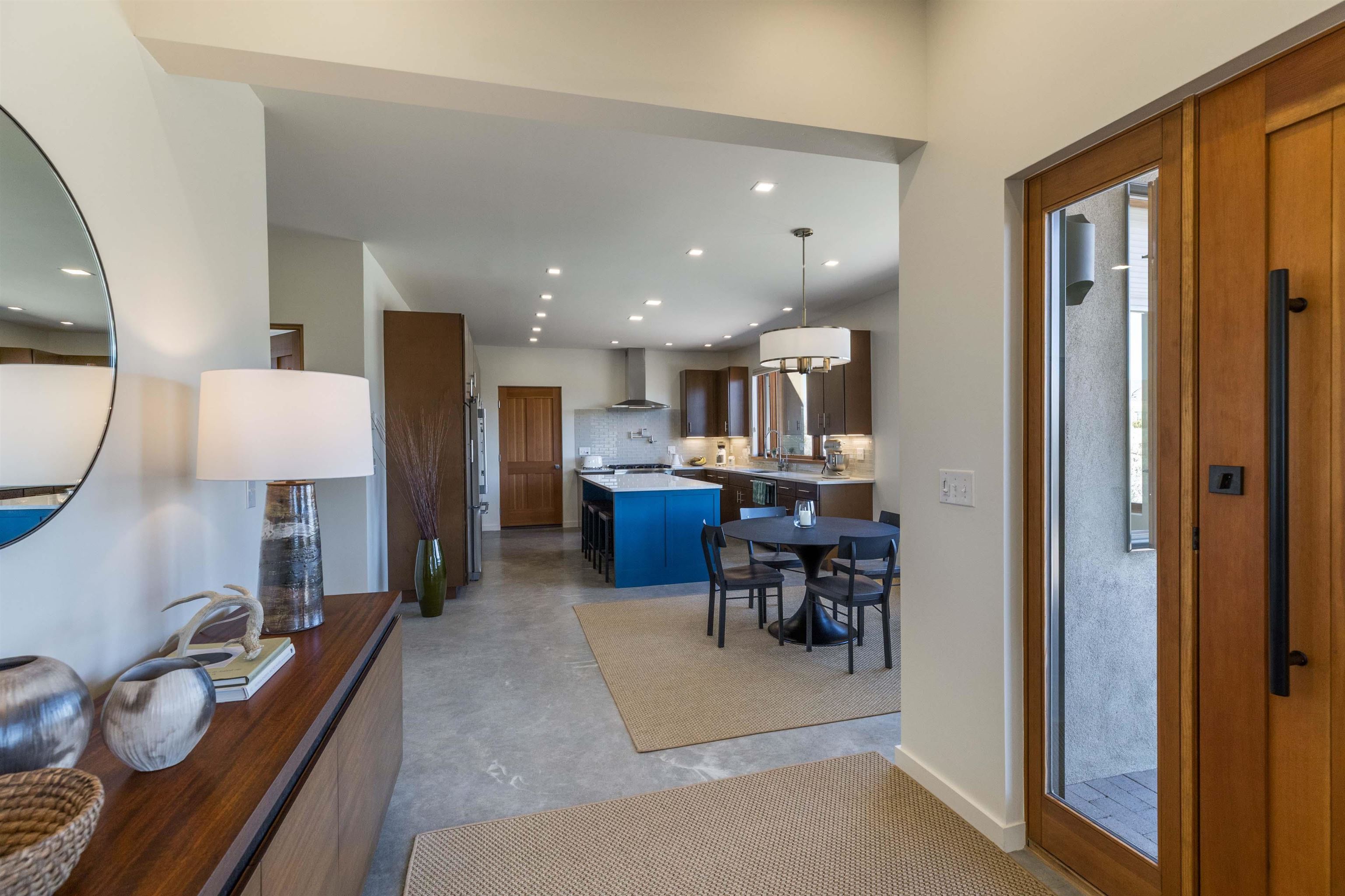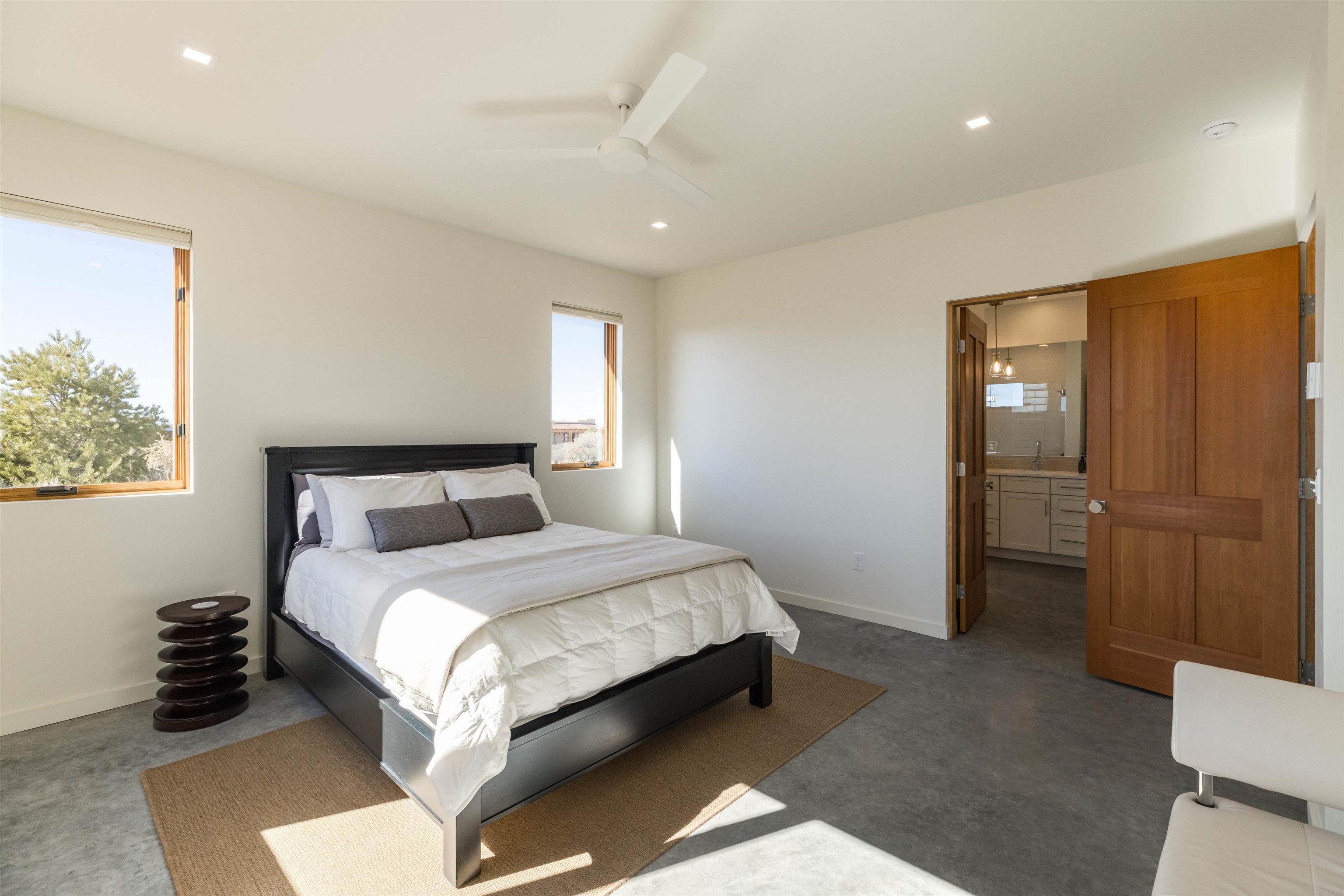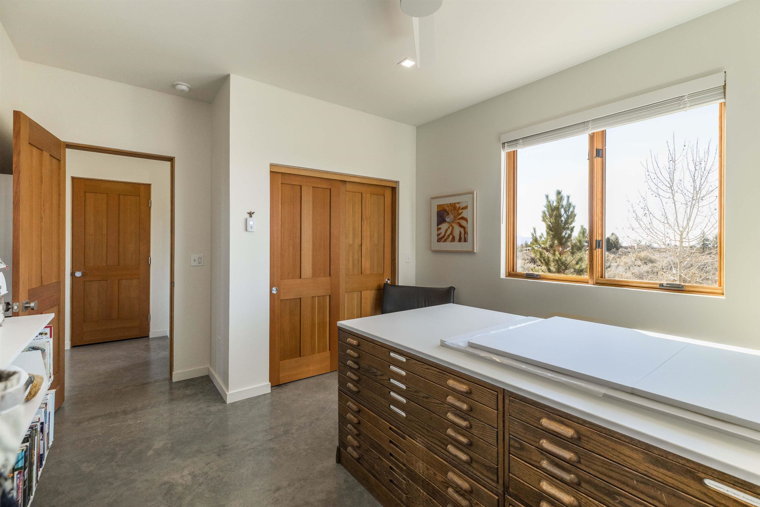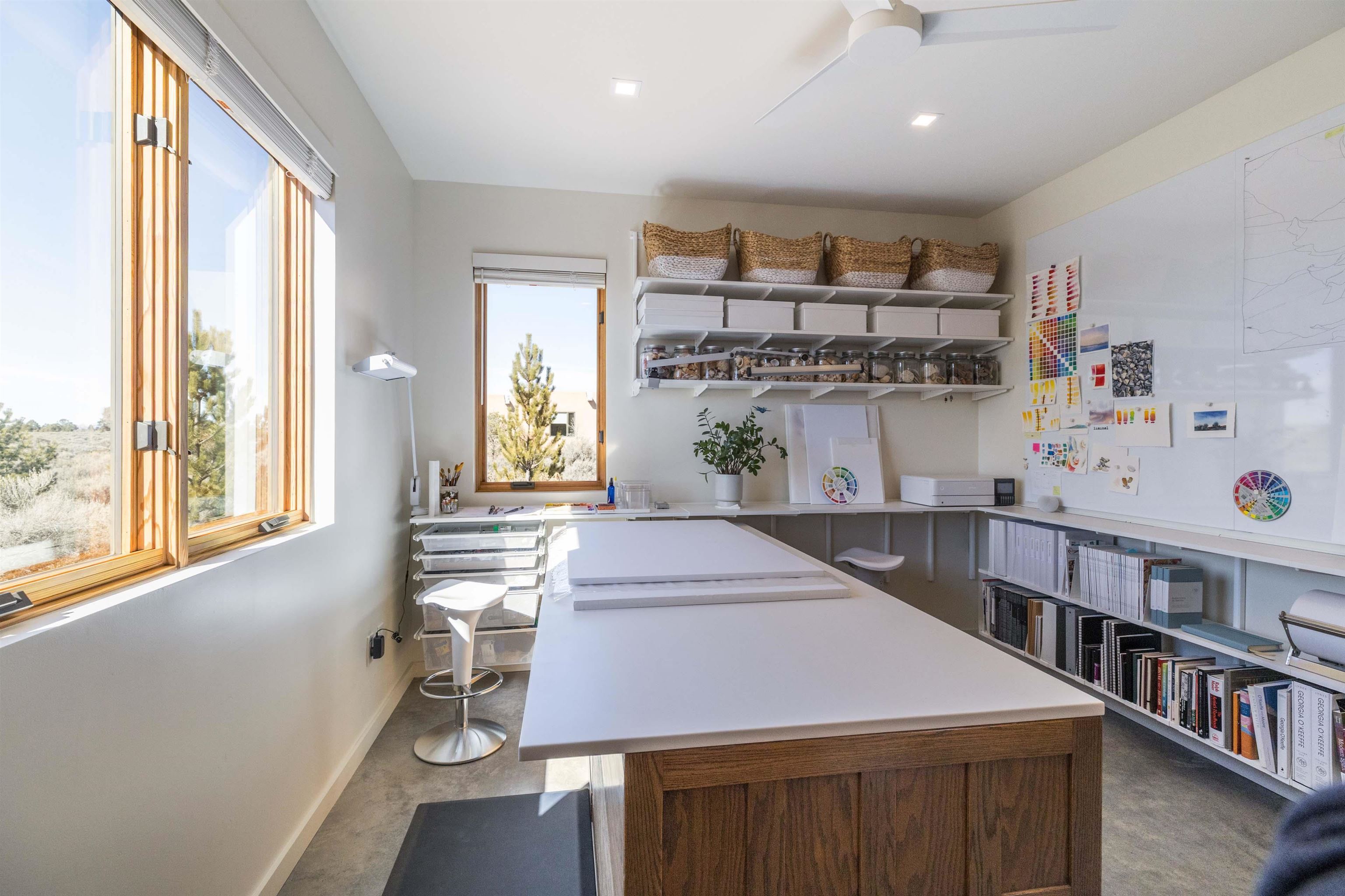 At the quiet end of a dead-end road, where the land opens into protected beauty and the sky feels endless, this contemporary Southwest residence offers a rare harmony of privacy, design, and place. Thoughtfully built just five years ago and maintained to the highest standard, the two-bedroom, two-bath home lives like new--radiant floor heat beneath your feet, a glowing gas Jotul fireplace anchoring the living space, and expansive windows framing the ever-changing drama of the Sangre de Cristo Mountains. Natural light moves effortlessly through the interiors, illuminating clean lines and warm, organic textures. The kitchen is exceptional--abundant custom storage, top-of-the-line Frigidaire Professional appliances, double wall ovens (convection), a convection microwave/oven combo, Zepher hood, 6 burner 36" Thor gas Range top, a large custom-built island and a gracious layout designed for both intimate evenings and inspired entertaining. Every detail feels intentional. Every finish, timeless. There are custom details throughout and all systems are thoughtful and efficient including: water softener, reverse osmosis drinking system, on demand hot water heater, instant hot water for taps, multi zone radiant heating, including garage, dimmable LED lighting inside and out, fiber optic high speed internet with ethernet wall outlets, adjustable Elfa closet systems, automatic drip irrigation and a hot tub hookup. The Primary bedroom is bathed in natural light and graced with a spa-like bath and large walk-in closet and a sublime view of Pedernal on the horizon through the West facing windows. The guest bedroom is currently used as a fantastic Artist studio. A flexible bonus room offers the perfect setting for a private office, studio, or creative sanctuary. The attached heated garage adds everyday ease, while the home's position contiguous to a conservation easement ensures lasting tranquility and gorgeous walks just out the front door. Step outside to miles of walking trails through open sage , where the landscape is preserved and the silence is sacred. Ideally located off the north end of Blueberry Hill, this property is perfectly poised between the cultural heartbeat of Taos and the alpine exhilaration of Taos Ski Valley. World-class skiing, rafting, biking, and hiking are all within effortless reach--yet home remains a peaceful retreat. Offered fully furnished with beautifully curated pieces that complement the architecture and light, this is more than a home. It is a turnkey expression of modern Southwest living--romantic, refined, and ready to be lived in beautifully.