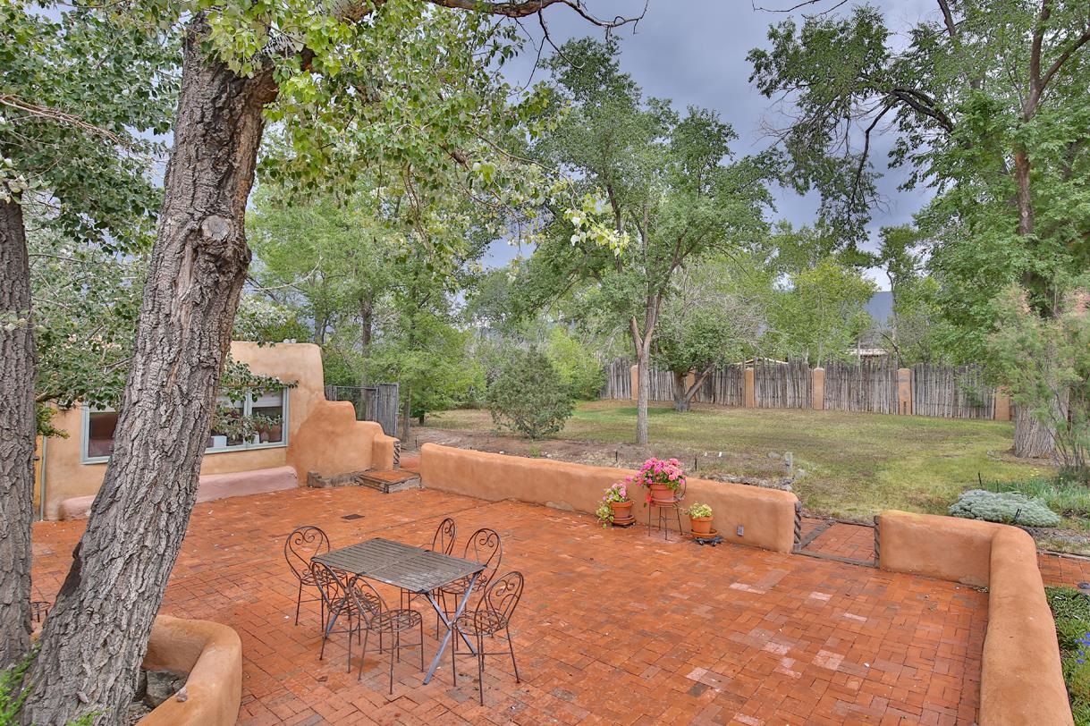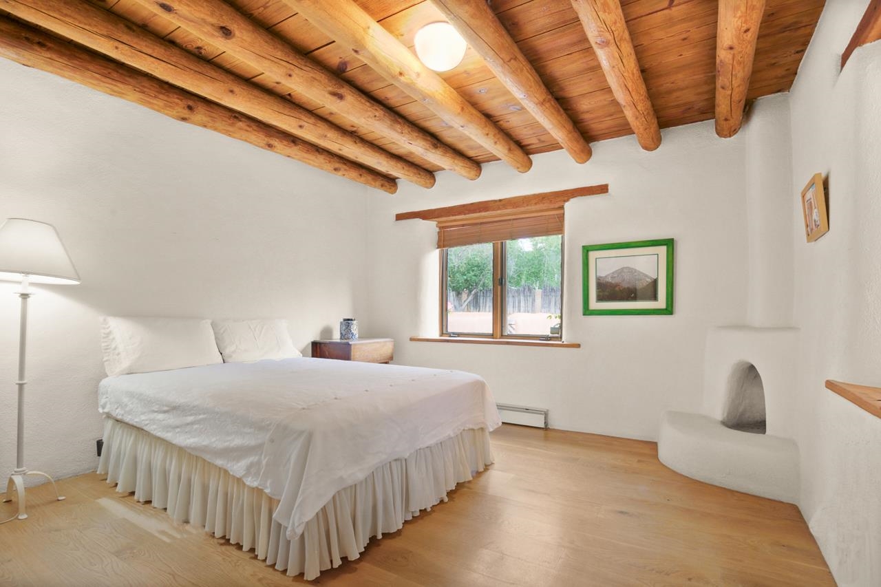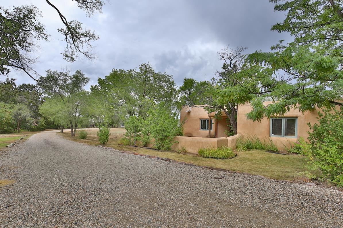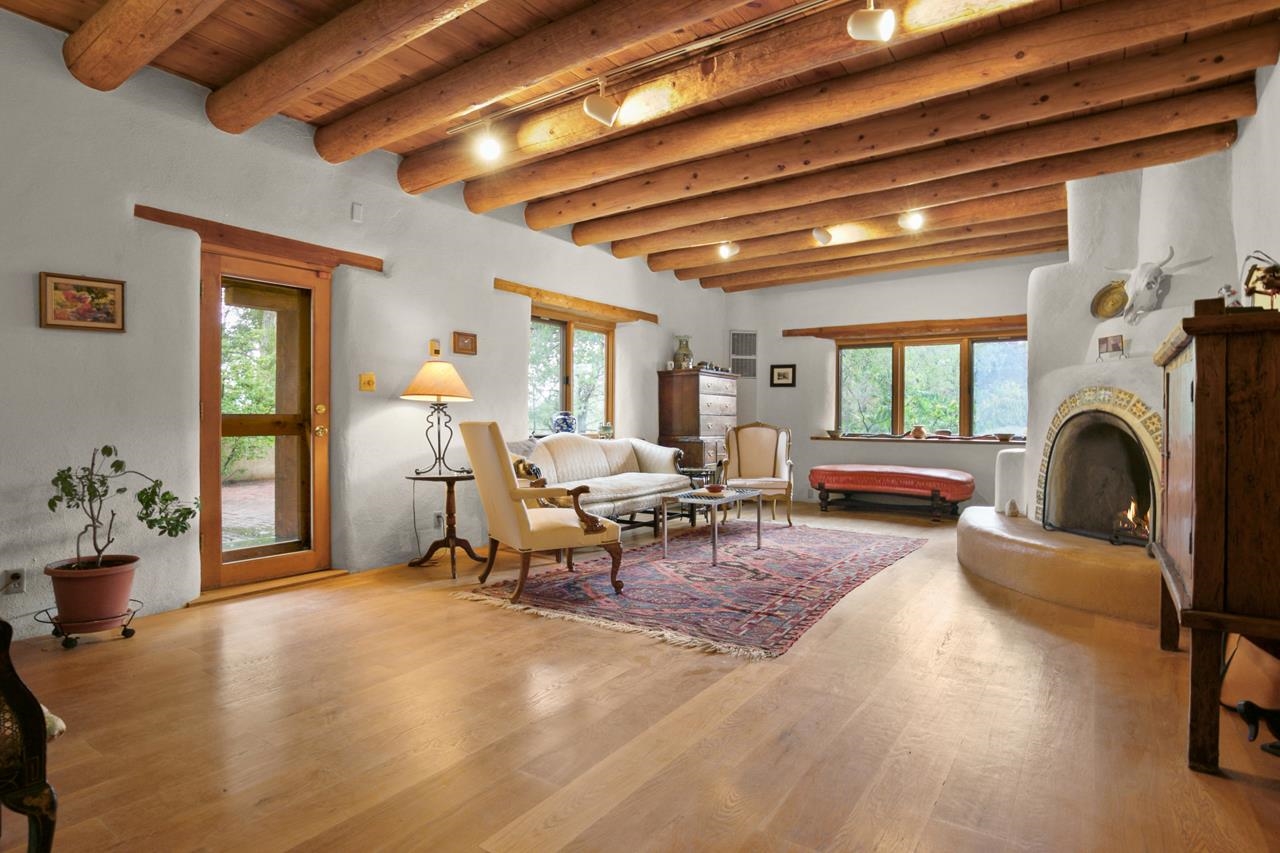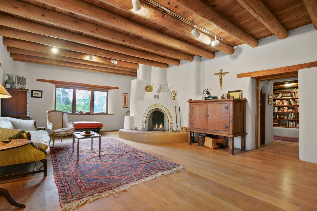 Privately set on 5.33 irrigated acres at the south end of Taos, this rare over-100-year-old, double-thick adobe estate offers enduring craftsmanship, warmth, and authenticity that cannot be replicated. Originally built in 1928, the substantial adobe walls provide exceptional insulation, quiet, and structural presence--hallmarks of true historic Taos construction. The home features seven traditional kiva fireplaces, creating warmth, character, and ambiance throughout multiple living spaces. A gracious central hallway serves as a gallery-style entrance, ideal for art display, and connects spacious rooms that flow naturally for both everyday living and entertaining. The kitchen, breakfast nook, formal dining room, library, and office provide a flexible and functional layout with room to gather or retreat. With four bedrooms, three with ensuite baths, the home offers comfort and privacy for residents and guests. An attached art studio with a two-car carport adds versatility and presents an excellent opportunity for conversion into a guest casita, creative studio, or private retreat. The expansive acreage and irrigated land create a true compound setting, offering ample room for future improvements such as additional guest structures, gardens, or recreational spaces (subject to approvals). Rich in history, substance, and potential, this distinctive adobe property represents a rare opportunity to own an authentic Taos estate with room to grow.