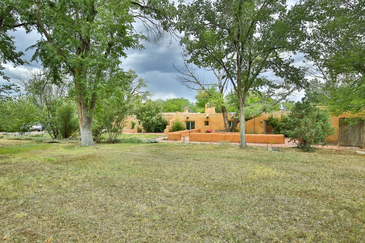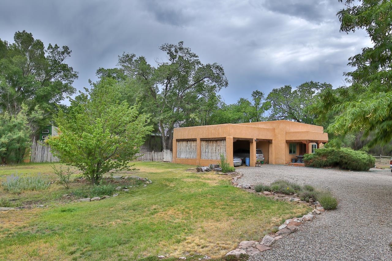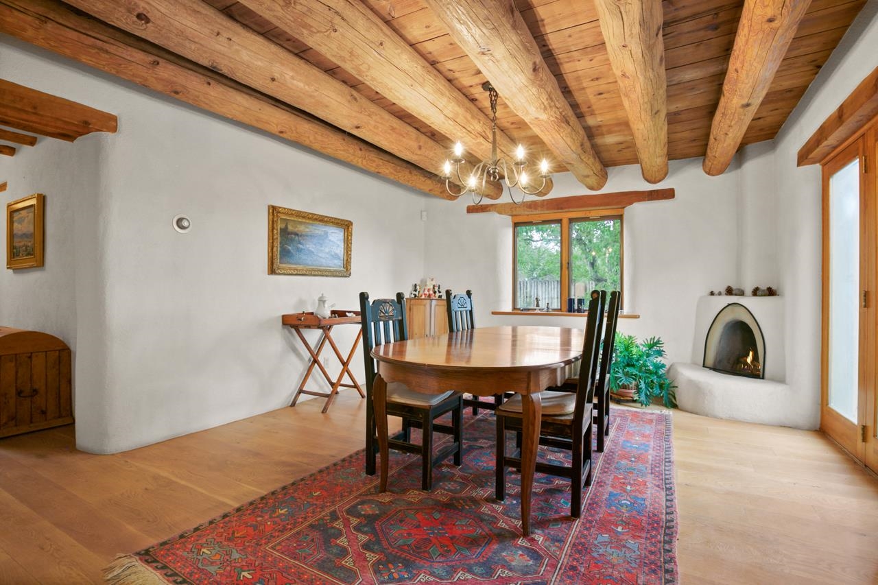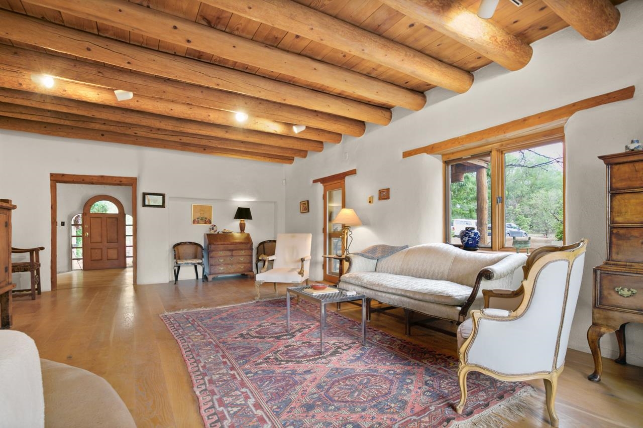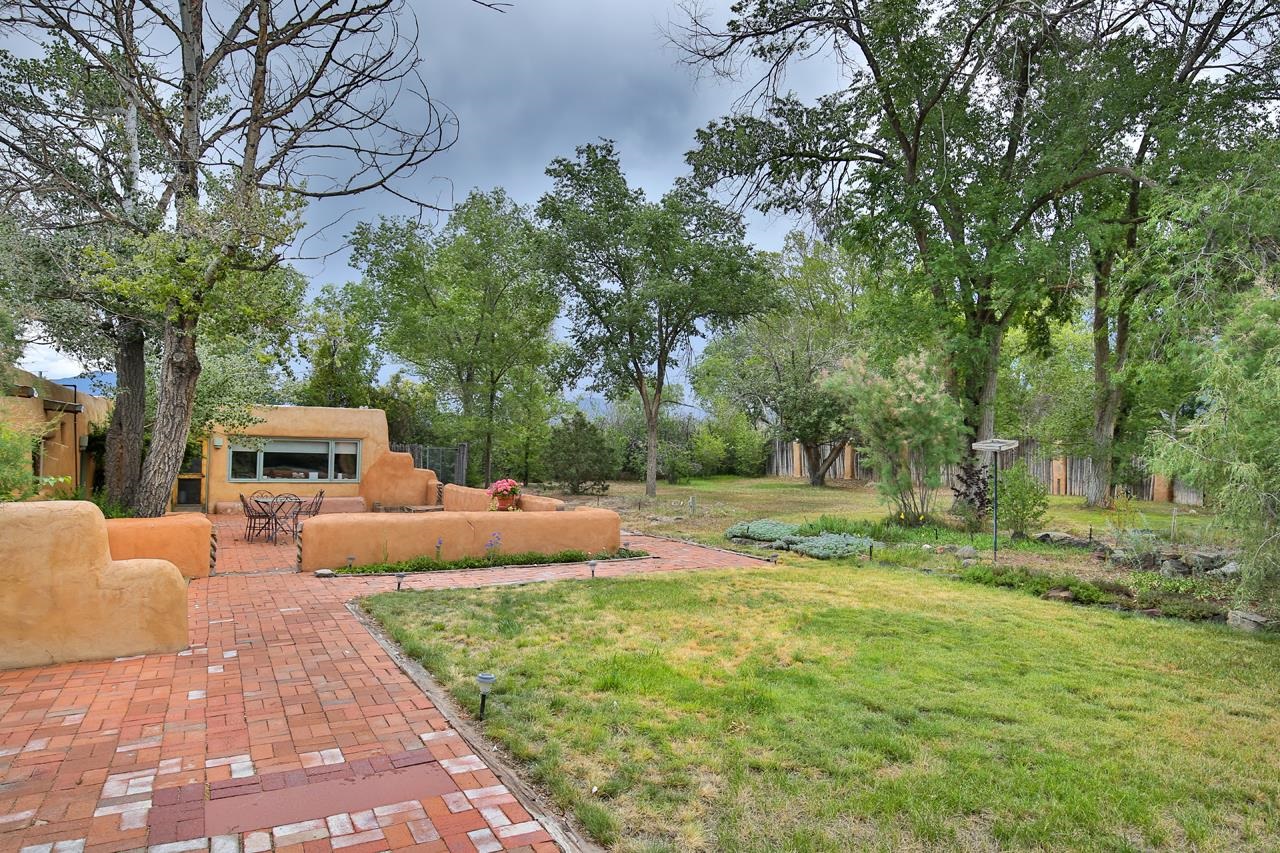 Privately set on 5.33 irrigated acres at the south end of Taos, this rare over-100-year-old, double-thick adobe estate offers enduring craftsmanship, warmth, and authenticity that cannot be replicated. Originally built in 1928, the substantial adobe walls provide exceptional insulation, quiet, and structural presence--hallmarks of true historic Taos construction. The home features seven traditional kiva fireplaces, creating warmth, character, and ambiance throughout multiple living spaces. A gracious central hallway serves as a gallery-style entrance, ideal for art display, and connects spacious rooms that flow naturally for both everyday living and entertaining. The kitchen, breakfast nook, formal dining room, library, and office provide a flexible and functional layout with room to gather or retreat. With four bedrooms, three with ensuite baths, the home offers comfort and privacy for residents and guests. An attached art studio with a two-car carport adds versatility and presents an excellent opportunity for conversion into a guest casita, creative studio, or private retreat. The expansive acreage and irrigated land create a true compound setting, offering ample room for future improvements such as additional guest structures, gardens, or recreational spaces (subject to approvals). Rich in history, substance, and potential, this distinctive adobe property represents a rare opportunity to own an authentic Taos estate with room to grow.