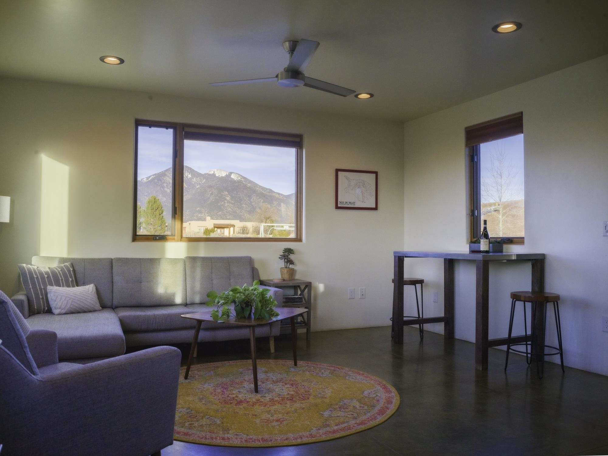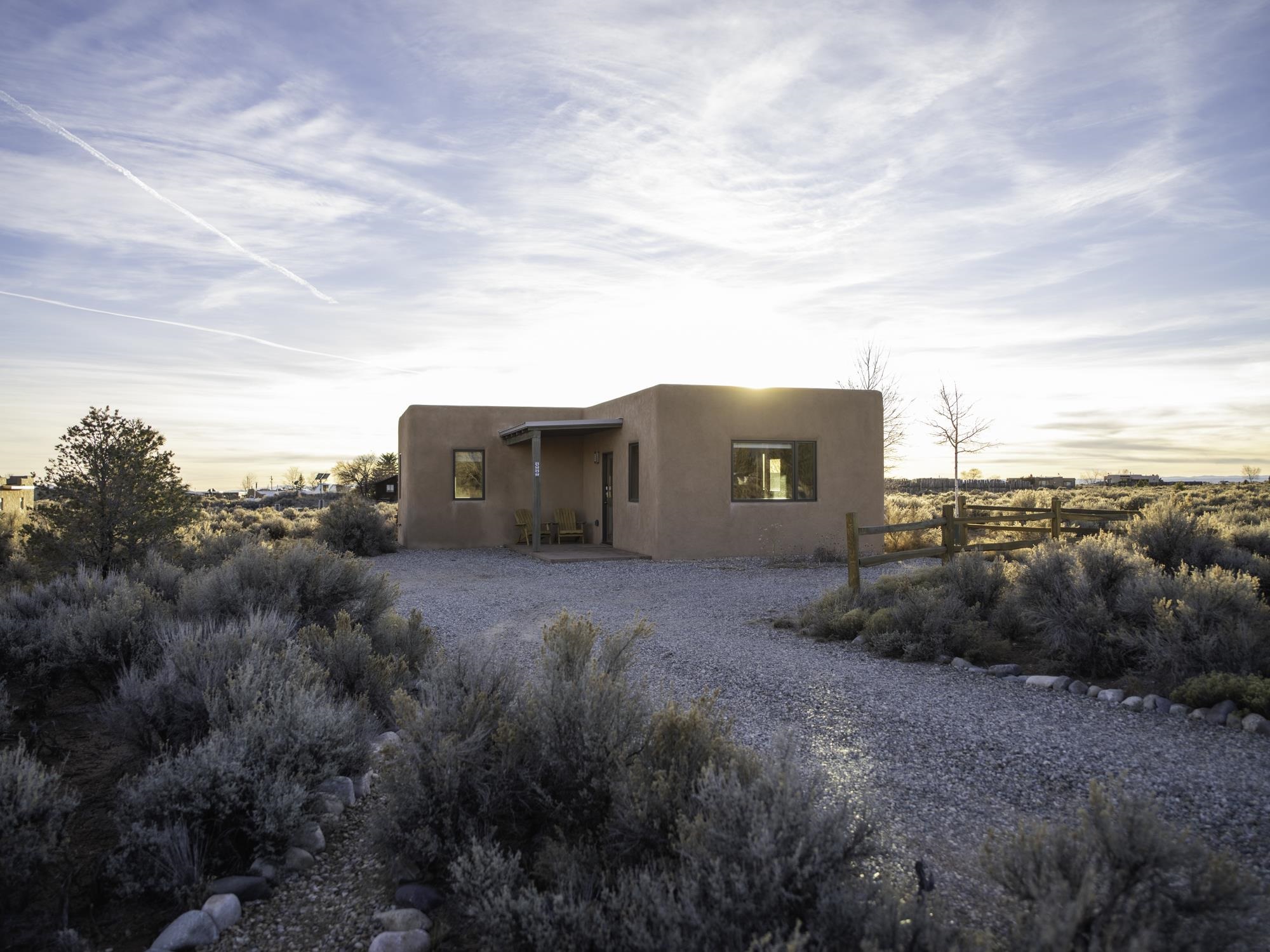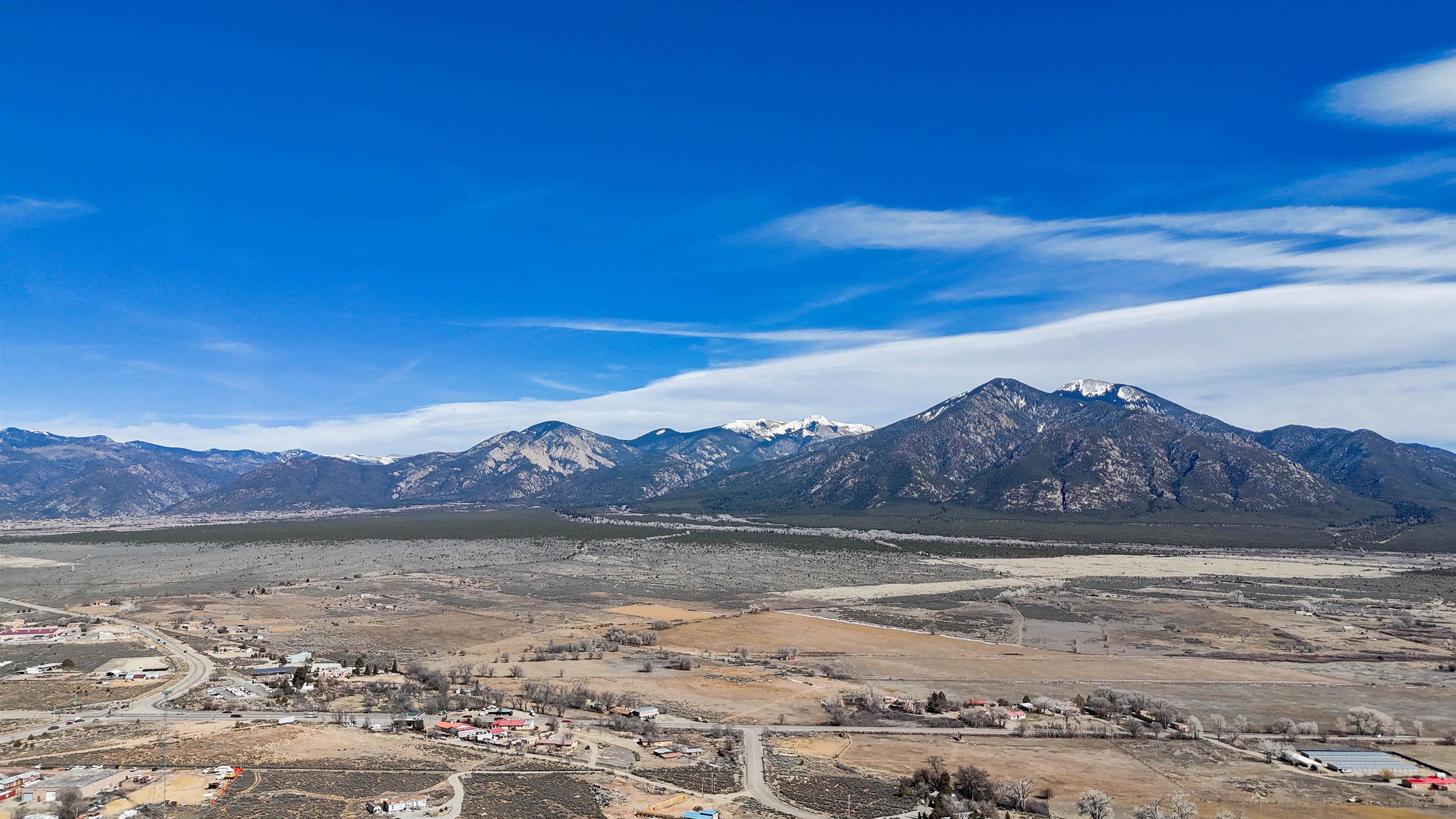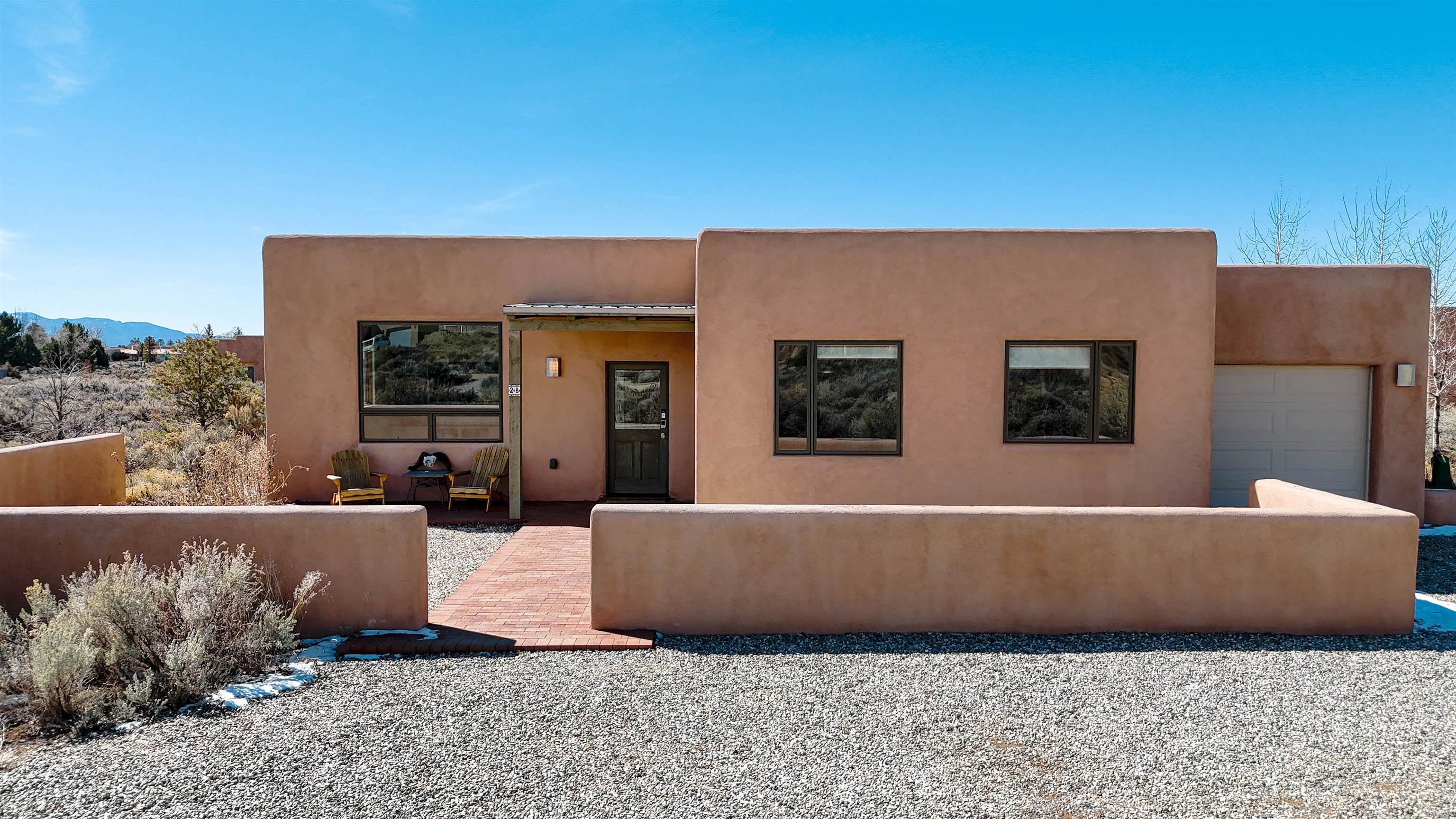 Framed by unobstructed views of Taos Mountain and set in one of El Prado's most desirable locations, this 2018-built residence reflects a thoughtful, modern approach to high-desert living. The architecture is clean and restrained, allowing light, proportion, and landscape to take the lead. Just 10 minutes from the Plaza in Taos and 20 minutes from Taos Ski Valley, the setting offers both quiet and connection, perfect for supporting a range of living and income possibilities. The 1,748 sq ft main home features 2 bedrooms and 2 baths beneath soaring ceilings, with radiant-heated concrete floors grounding the interiors in warmth and subtle texture. Open living spaces are intentionally oriented toward the mountain, creating a seamless dialogue with the indoors. Finishes are contemporary and refined, with an emphasis on clean lines, natural light, and livable simplicity. An attached heated garage integrates convenience without interrupting the home's aesthetic clarity. A completely separate 740 sq ft guest house -- 1 bedroom, 1 bath -- mirrors the same design sensibility. Bright, efficient, and beautifully proportioned, perfect for a private retreat, studio, or income-producing space with a strong short-term rental history available for review. Well-sited on its acre, modern in execution, and quietly architectural in presence, this is a home where design and landscape are in balance.