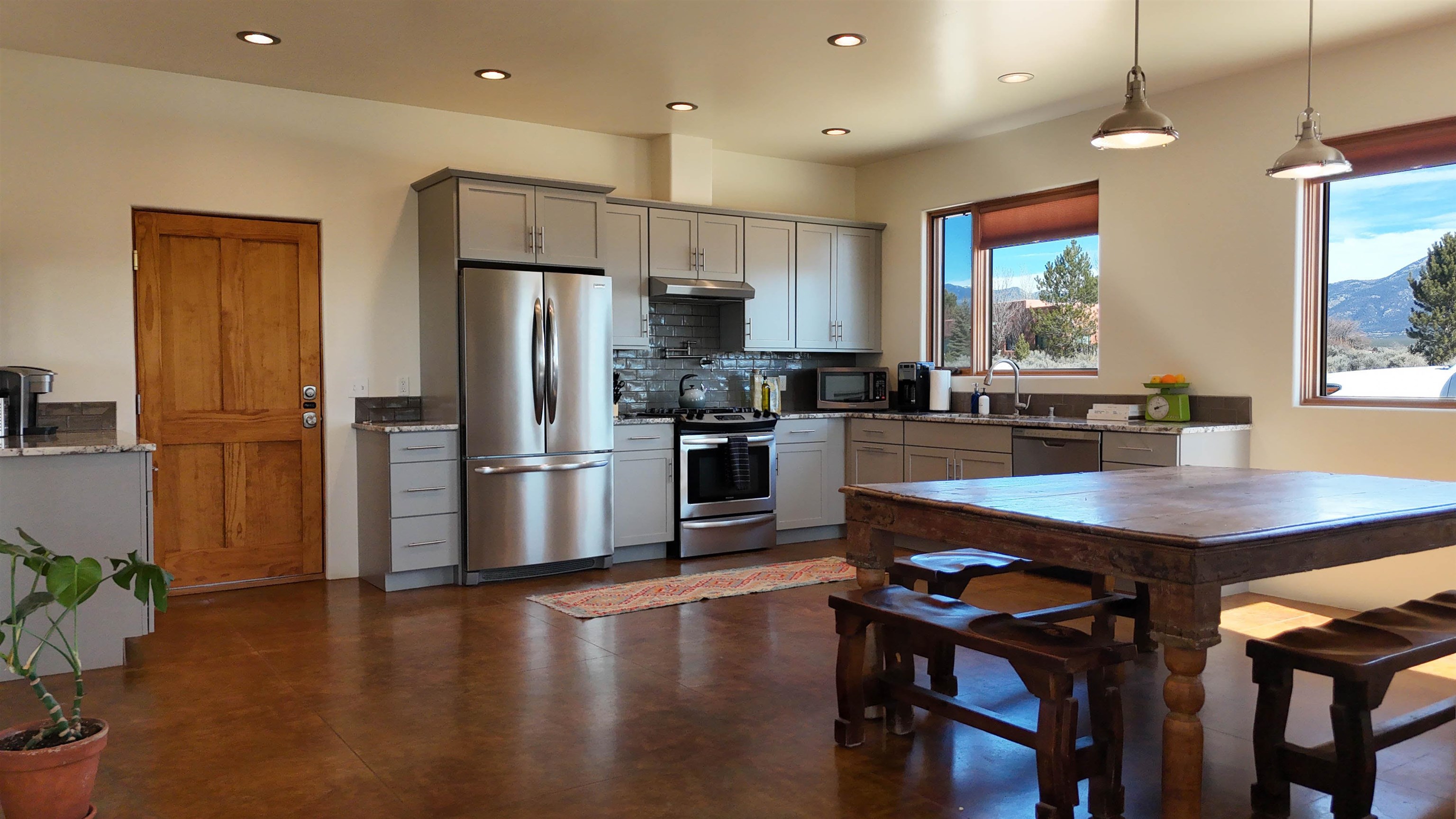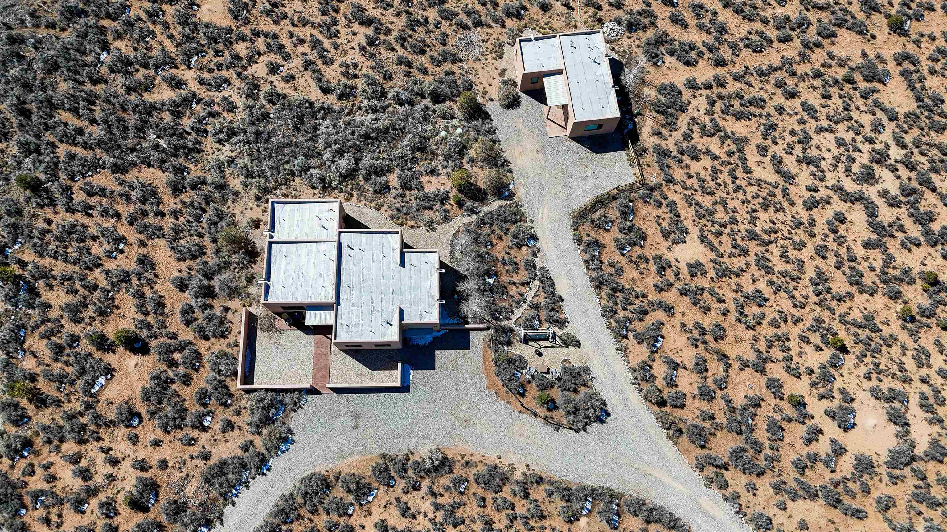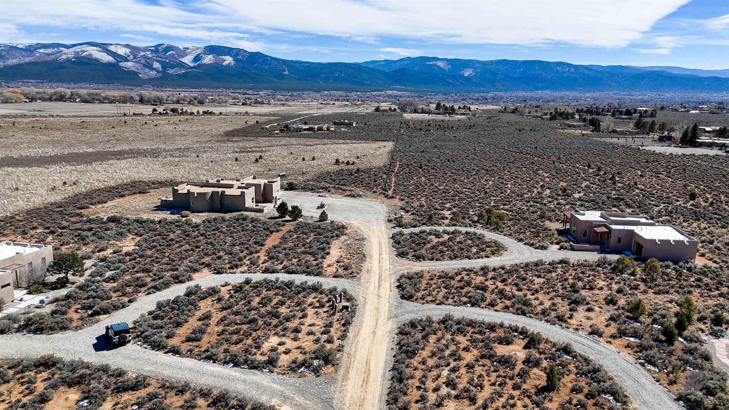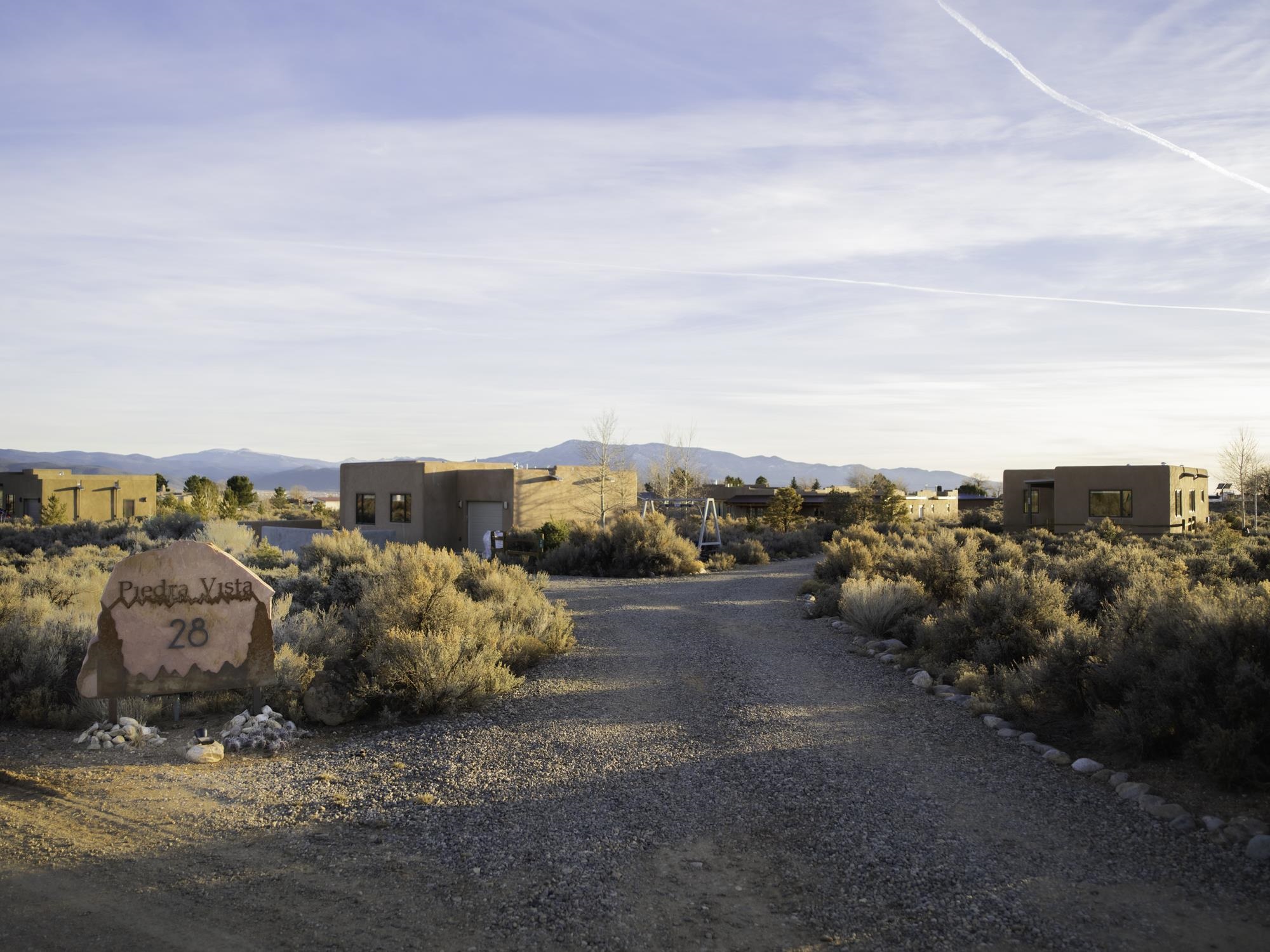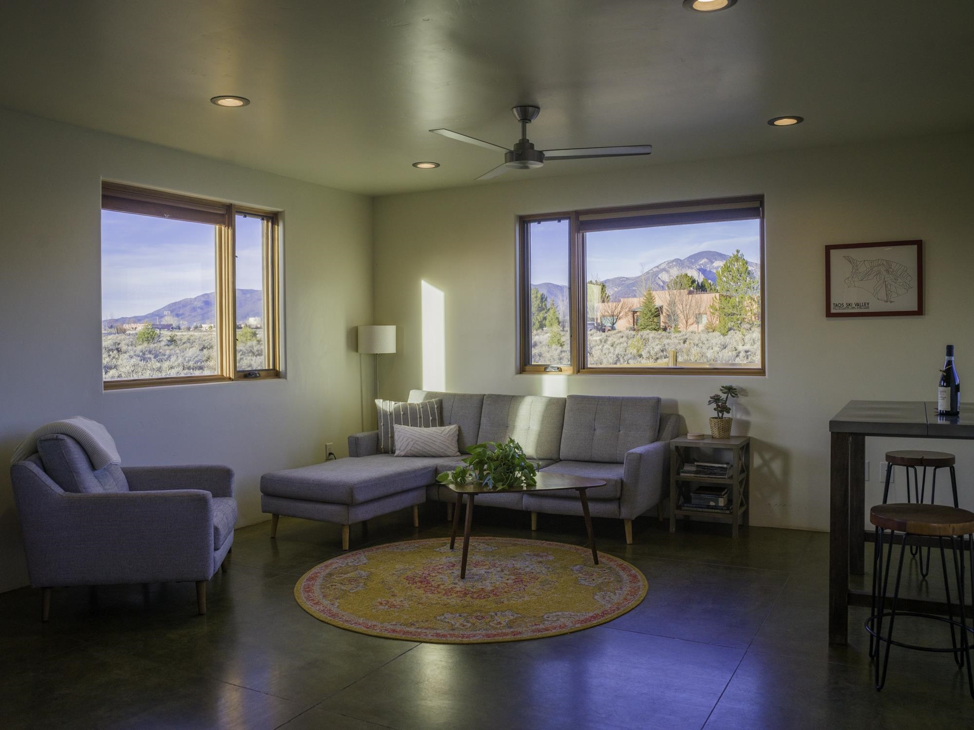 Framed by unobstructed views of Taos Mountain and set in one of El Prado's most desirable locations, this 2018-built residence reflects a thoughtful, modern approach to high-desert living. The architecture is clean and restrained, allowing light, proportion, and landscape to take the lead. Just 10 minutes from the Plaza in Taos and 20 minutes from Taos Ski Valley, the setting offers both quiet and connection, perfect for supporting a range of living and income possibilities. The 1,748 sq ft main home features 2 bedrooms and 2 baths beneath soaring ceilings, with radiant-heated concrete floors grounding the interiors in warmth and subtle texture. Open living spaces are intentionally oriented toward the mountain, creating a seamless dialogue with the indoors. Finishes are contemporary and refined, with an emphasis on clean lines, natural light, and livable simplicity. An attached heated garage integrates convenience without interrupting the home's aesthetic clarity. A completely separate 740 sq ft guest house -- 1 bedroom, 1 bath -- mirrors the same design sensibility. Bright, efficient, and beautifully proportioned, perfect for a private retreat, studio, or income-producing space with a strong short-term rental history available for review. Well-sited on its acre, modern in execution, and quietly architectural in presence, this is a home where design and landscape are in balance.