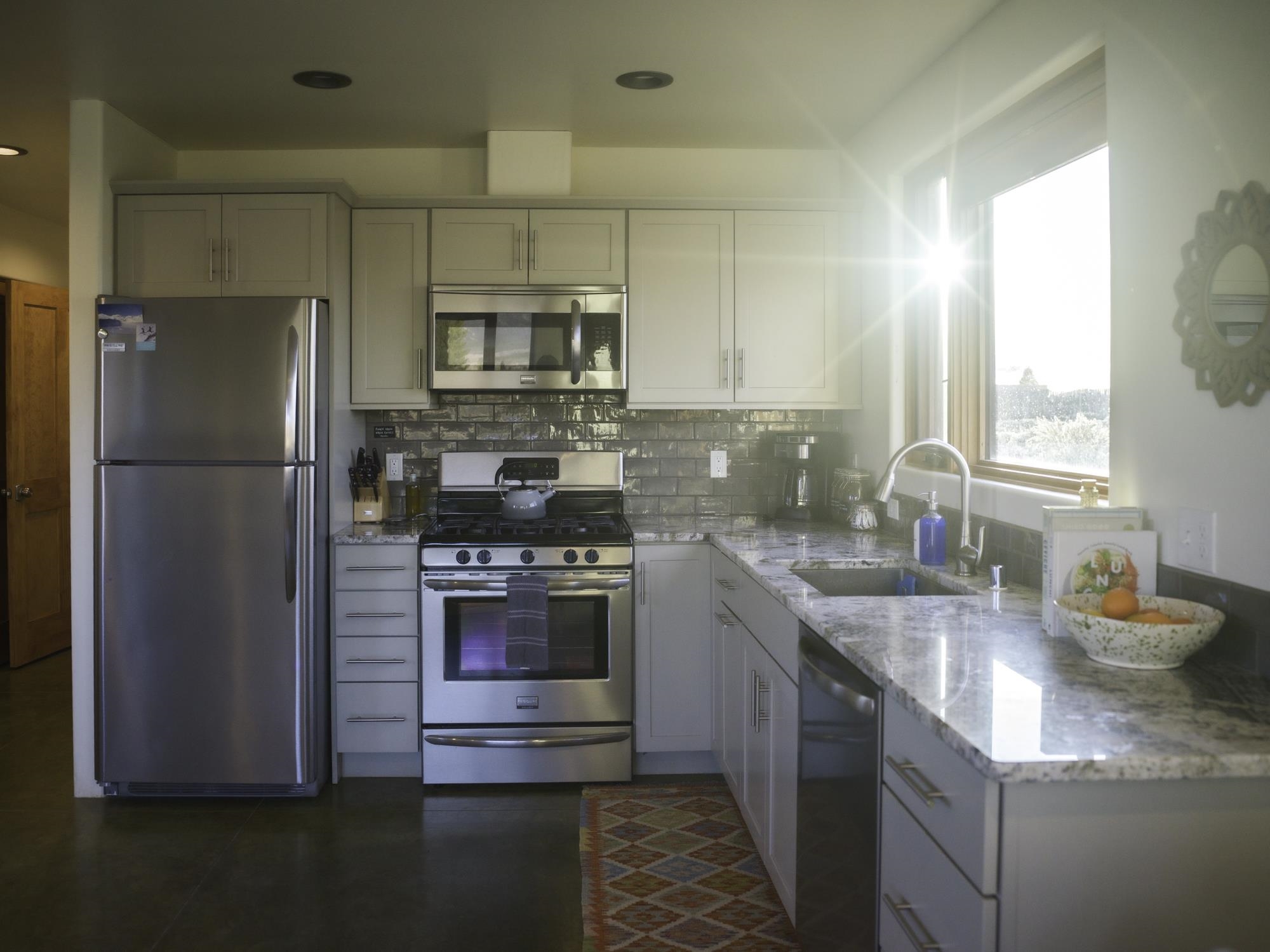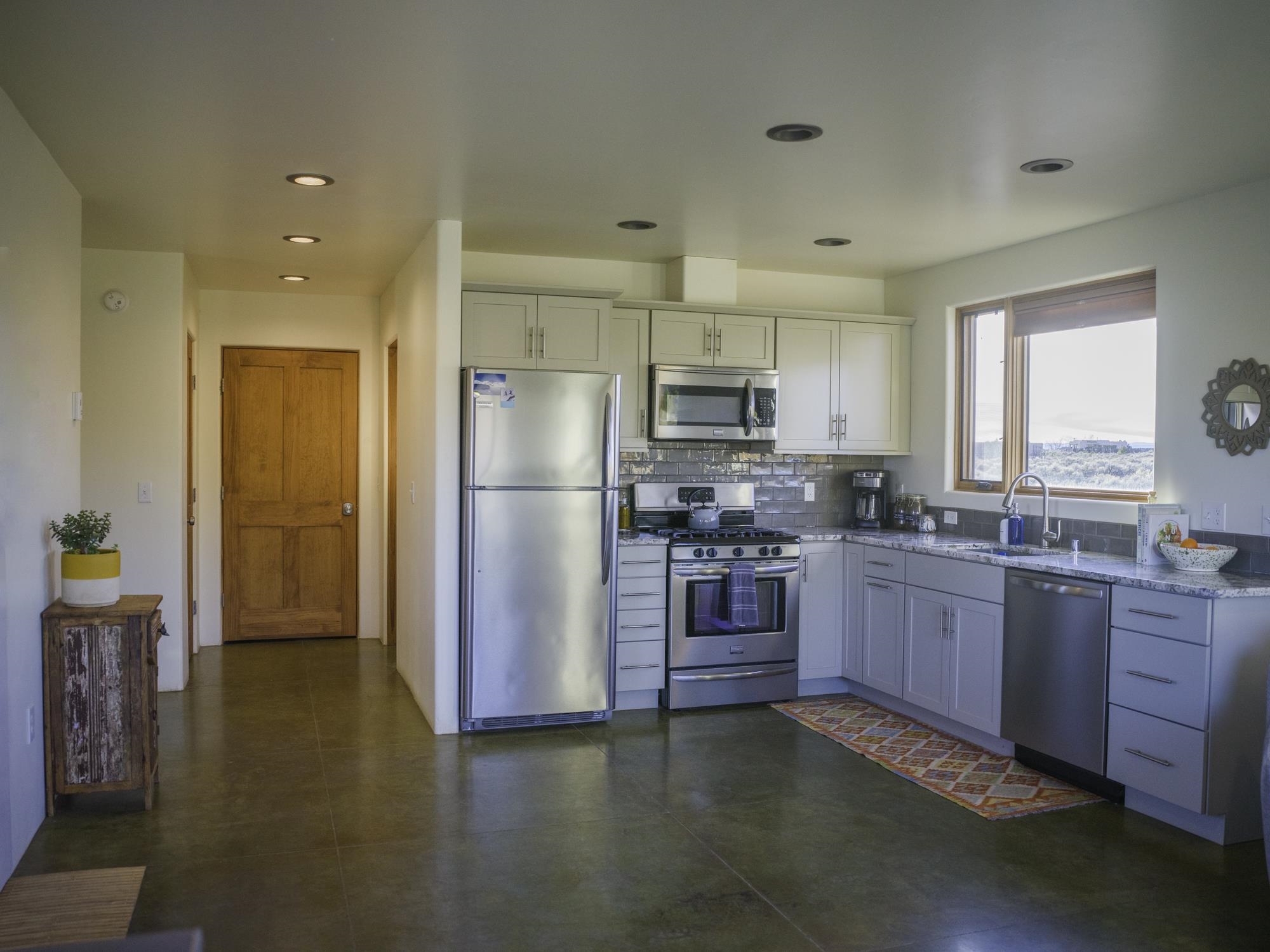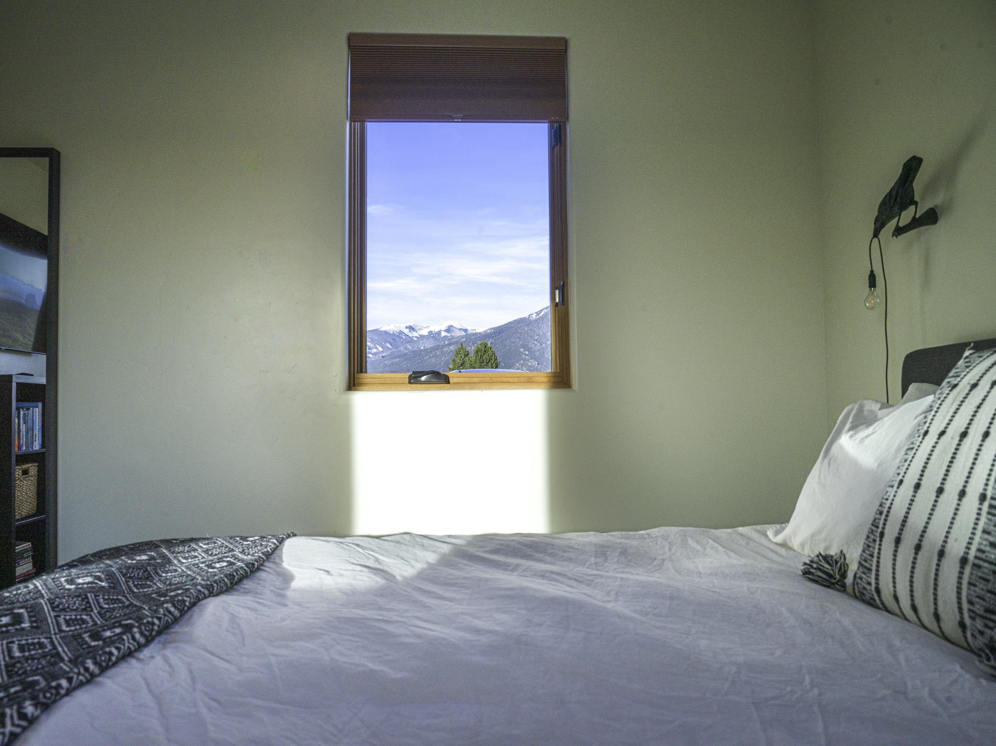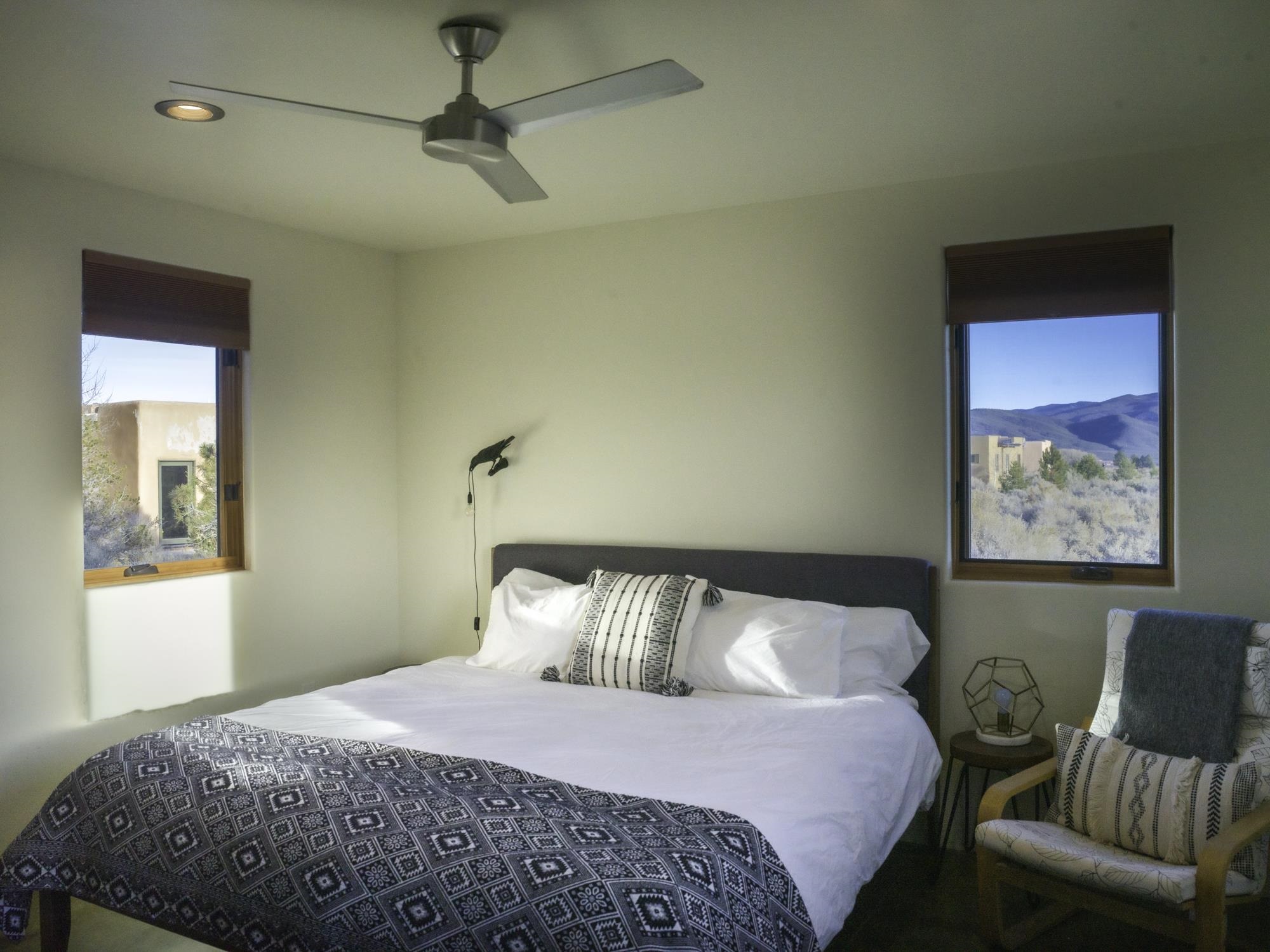 Framed by unobstructed views of Taos Mountain and set in one of El Prado's most desirable locations, this 2018-built residence reflects a thoughtful, modern approach to high-desert living. The architecture is clean and restrained, allowing light, proportion, and landscape to take the lead. Just 10 minutes from the Plaza in Taos and 20 minutes from Taos Ski Valley, the setting offers both quiet and connection, perfect for supporting a range of living and income possibilities. The 1,748 sq ft main home features 2 bedrooms and 2 baths beneath soaring ceilings, with radiant-heated concrete floors grounding the interiors in warmth and subtle texture. Open living spaces are intentionally oriented toward the mountain, creating a seamless dialogue with the indoors. Finishes are contemporary and refined, with an emphasis on clean lines, natural light, and livable simplicity. An attached heated garage integrates convenience without interrupting the home's aesthetic clarity. A completely separate 740 sq ft guest house -- 1 bedroom, 1 bath -- mirrors the same design sensibility. Bright, efficient, and beautifully proportioned, perfect for a private retreat, studio, or income-producing space with a strong short-term rental history available for review. Well-sited on its acre, modern in execution, and quietly architectural in presence, this is a home where design and landscape are in balance.