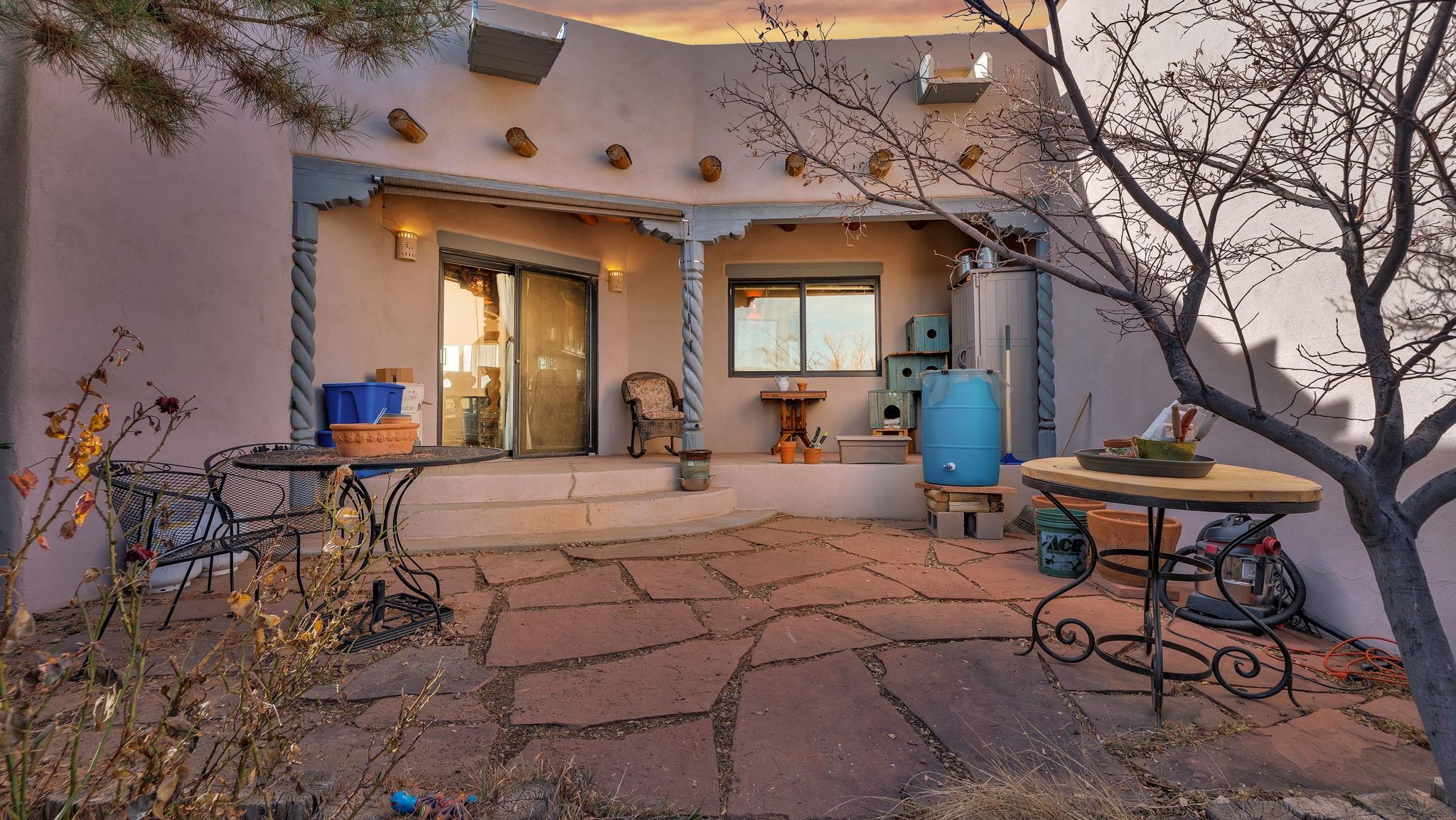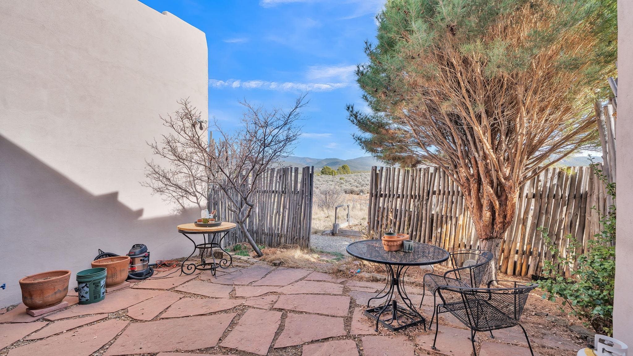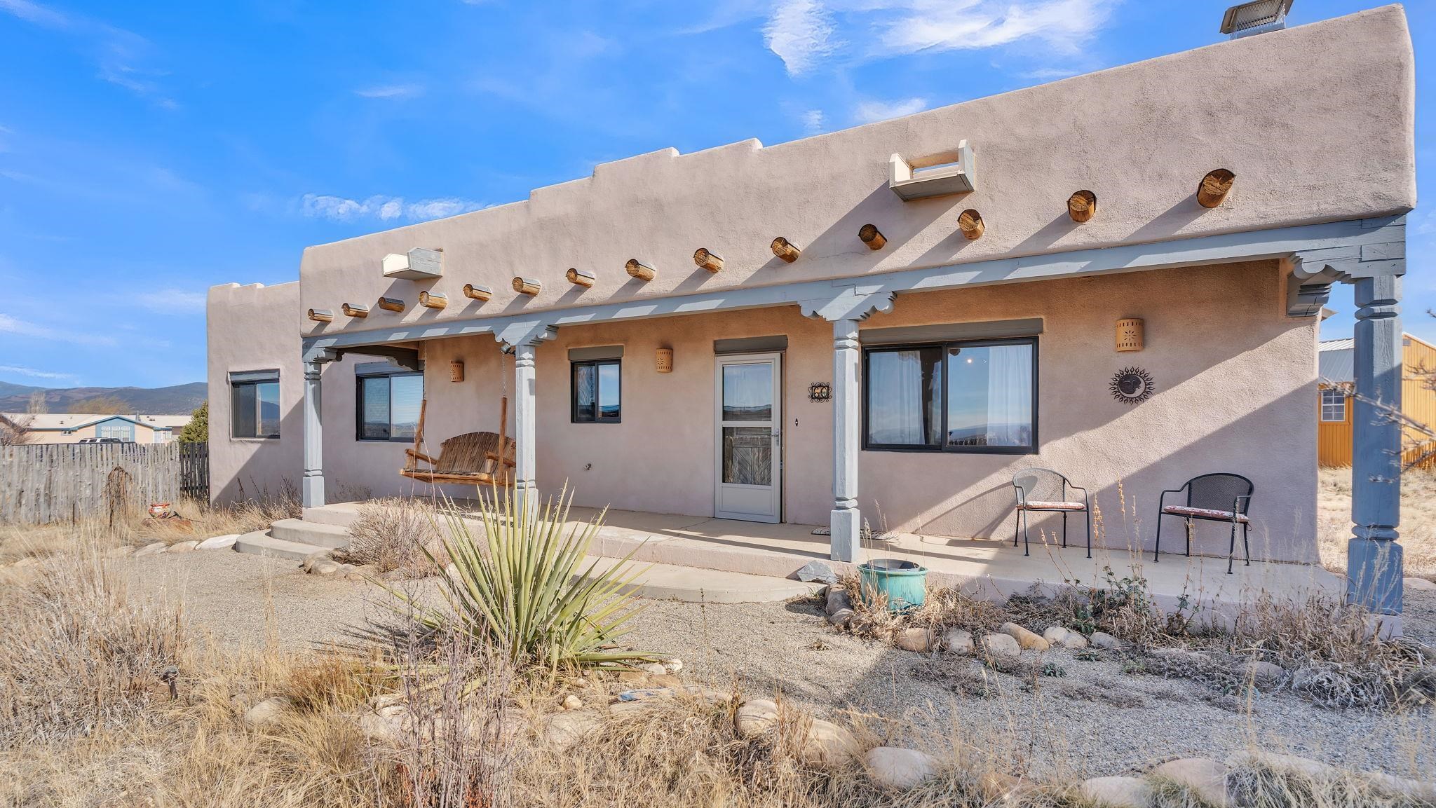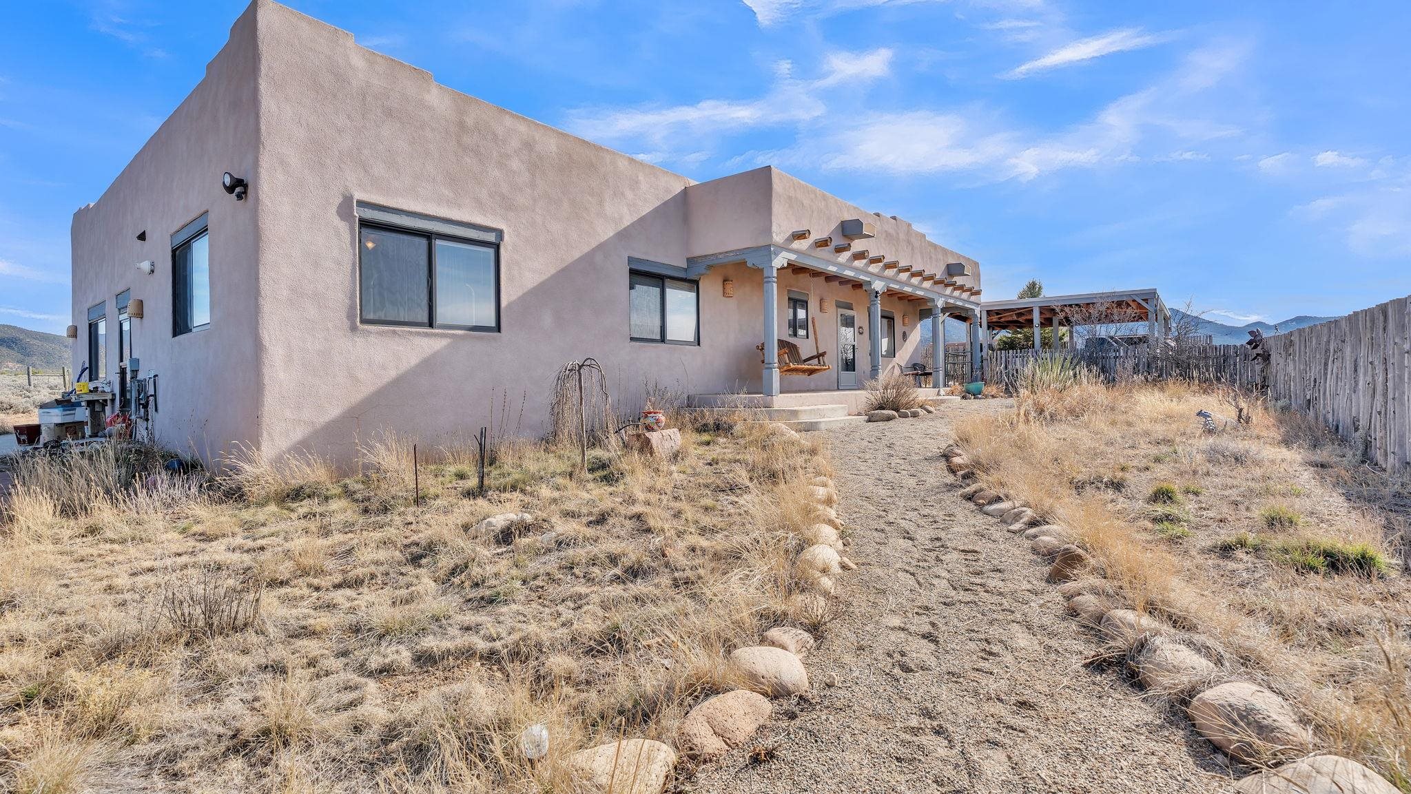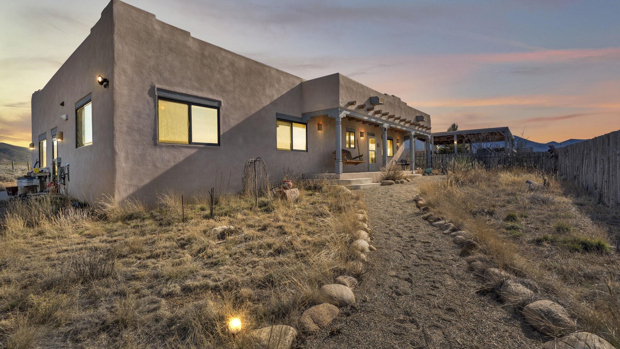 Mountain views take center stage at this spectacular Ranchos de Taos home, where epic vistas meet timeless Southwest charm. This spacious three-bedroom, two-full bath residence features a sunken living room with an inviting kiva fireplace, and saltillo tile floors throughout the home. The thoughtful split floor plan places the primary suite on the opposite side of the home from the guest bedrooms for added privacy. Step out onto the flagstone courtyard patio with trees to take in the vivid western sunsets and panoramic views. Outdoor walkways, a fully fenced yard, designated garden areas, a carport, and a large storage shed complete the property. Lovingly maintained and ideally located near the Taos golf course, and minutes from downtown Taos. This area offers plenty of hiking trails overlooking the Rio Grande, and of course the very epic sunsets. With 18 solar panels to offset your utility costs, a converted garage bonus room, and a tankless on-demand hot water heater, comfort meets efficiency. Discover the beauty of refined mountain living.