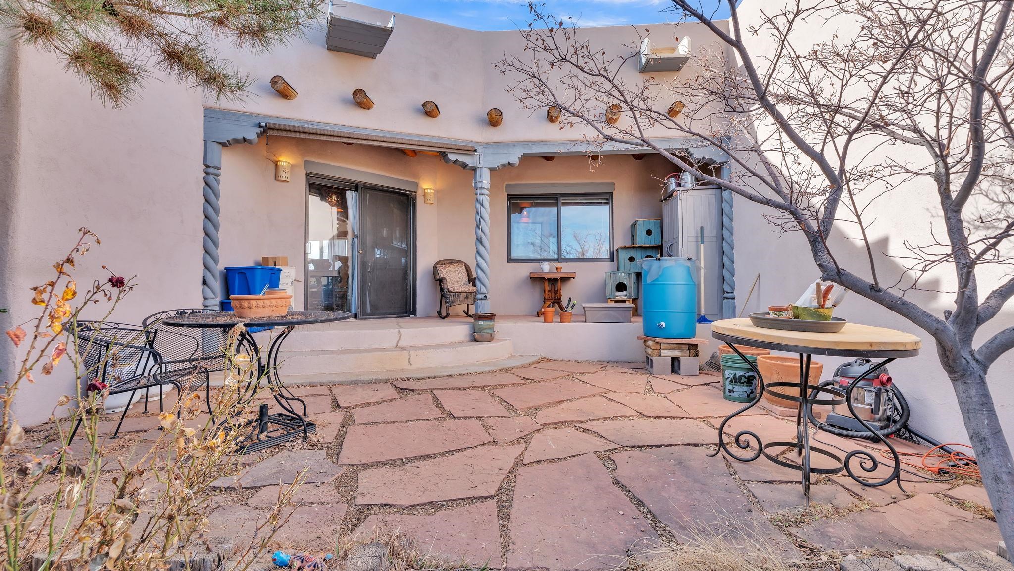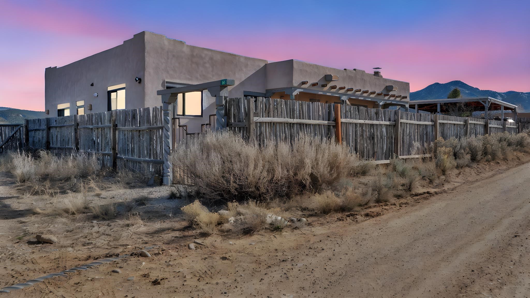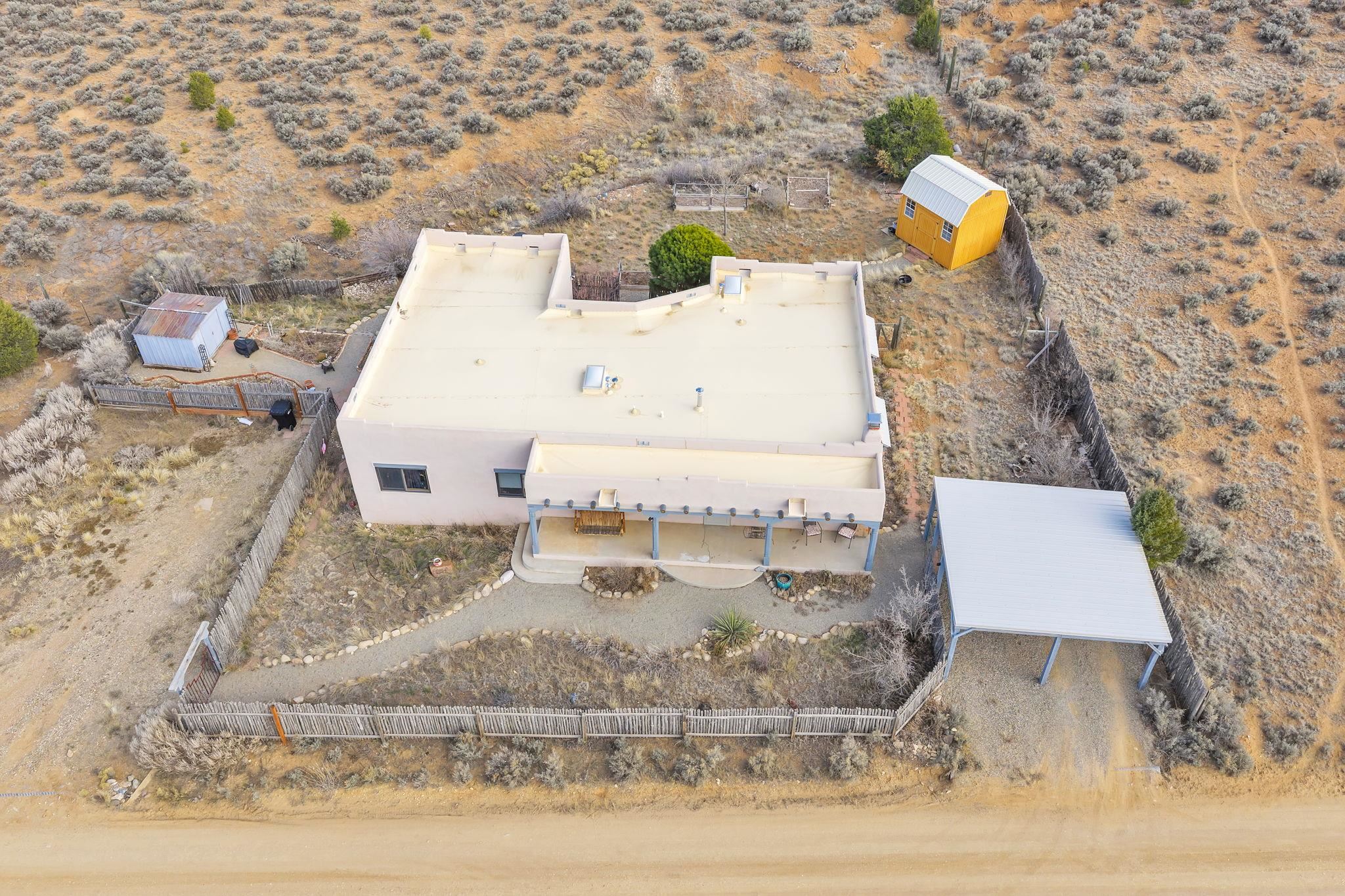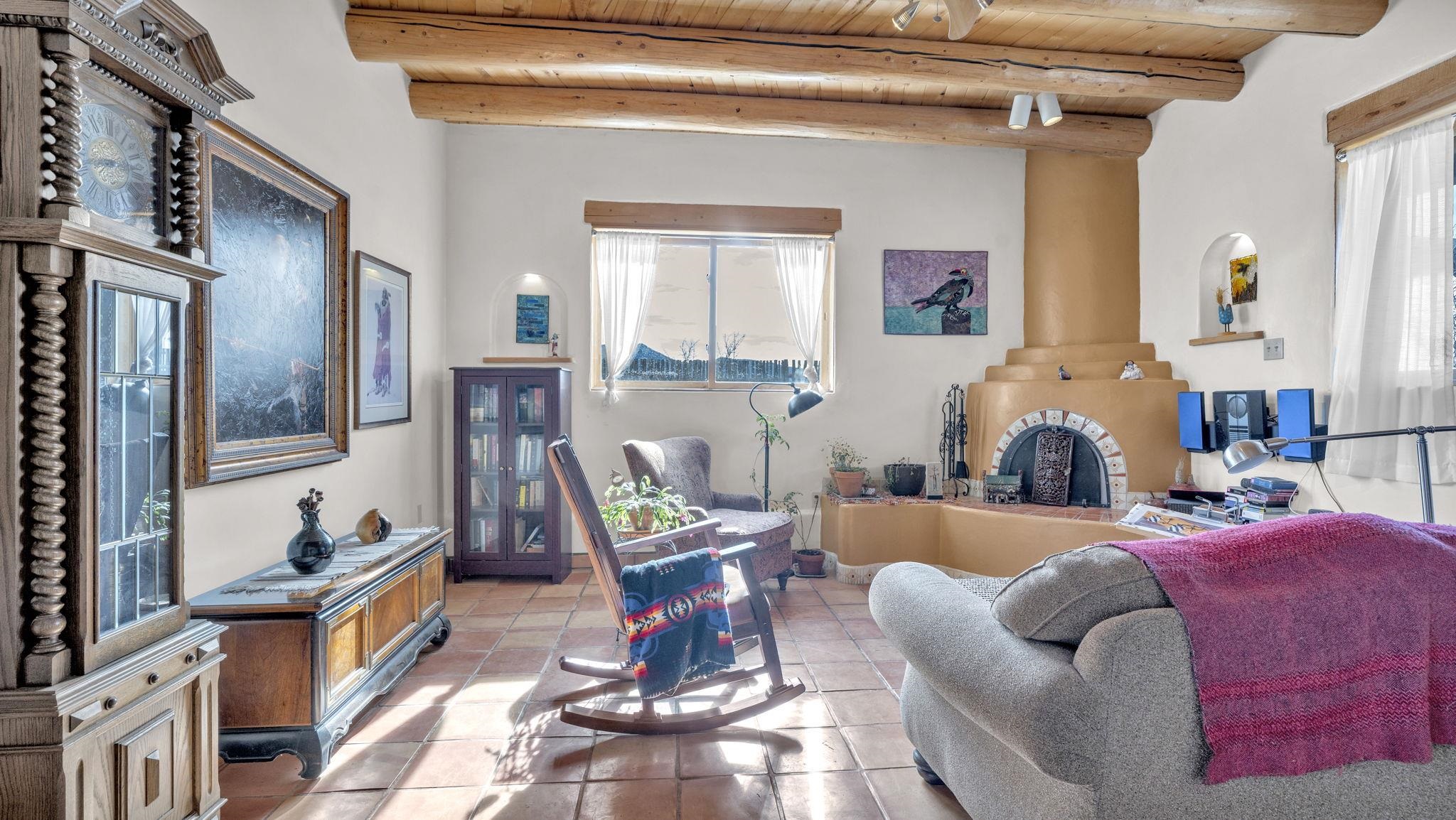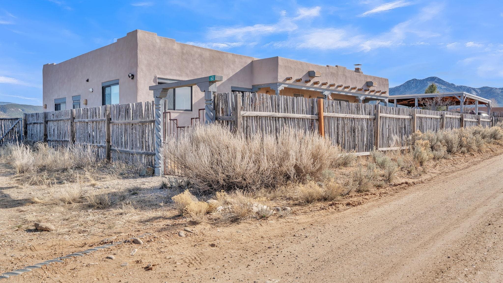 Mountain views take center stage at this spectacular Ranchos de Taos home, where epic vistas meet timeless Southwest charm. This spacious three-bedroom, two-full bath residence features a sunken living room with an inviting kiva fireplace, and saltillo tile floors throughout the home. The thoughtful split floor plan places the primary suite on the opposite side of the home from the guest bedrooms for added privacy. Step out onto the flagstone courtyard patio with trees to take in the vivid western sunsets and panoramic views. Outdoor walkways, a fully fenced yard, designated garden areas, a carport, and a large storage shed complete the property. Lovingly maintained and ideally located near the Taos golf course, and minutes from downtown Taos. This area offers plenty of hiking trails overlooking the Rio Grande, and of course the very epic sunsets. With 18 solar panels to offset your utility costs, a converted garage bonus room, and a tankless on-demand hot water heater, comfort meets efficiency. Discover the beauty of refined mountain living.