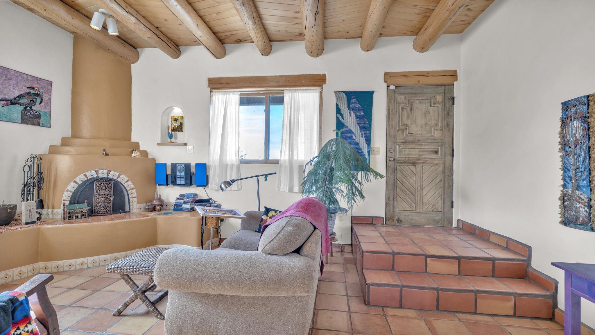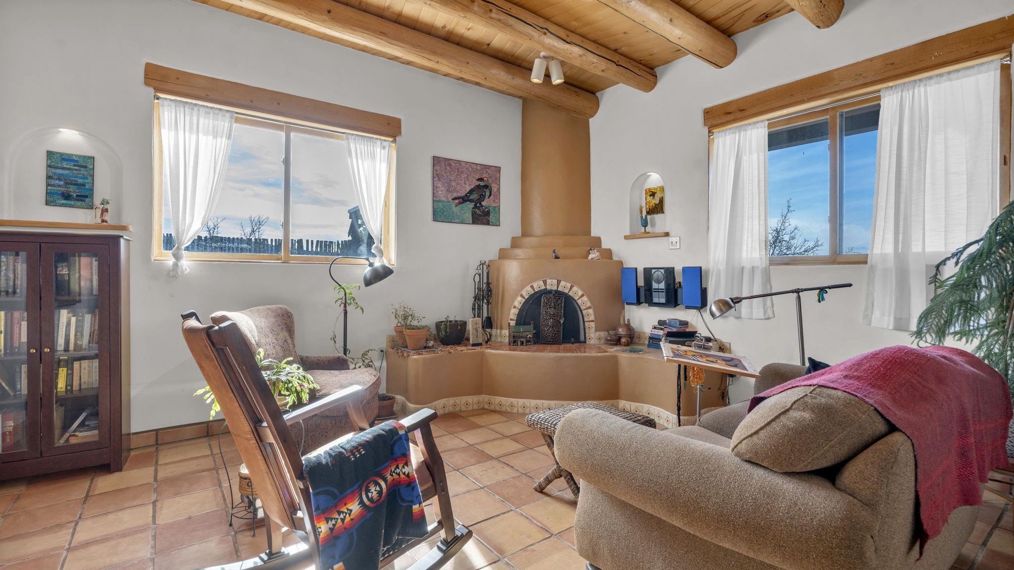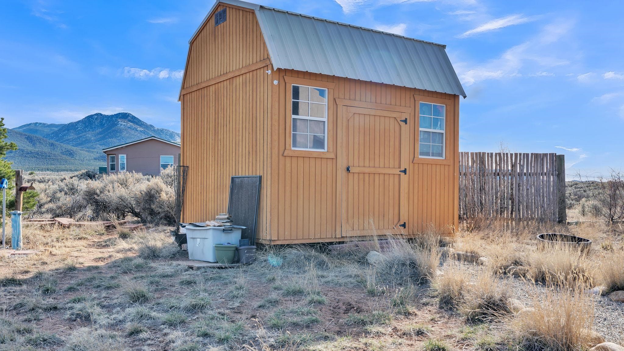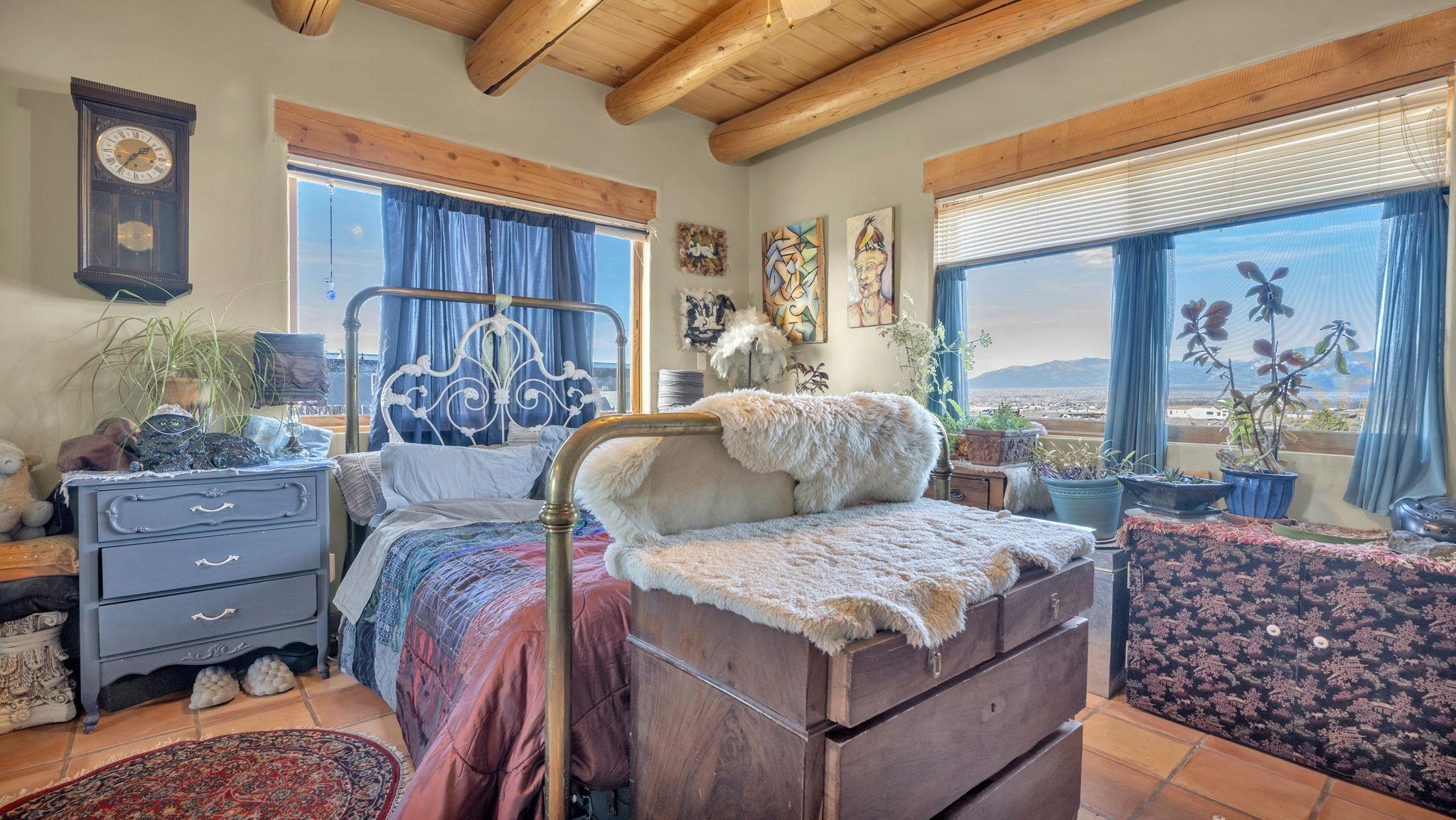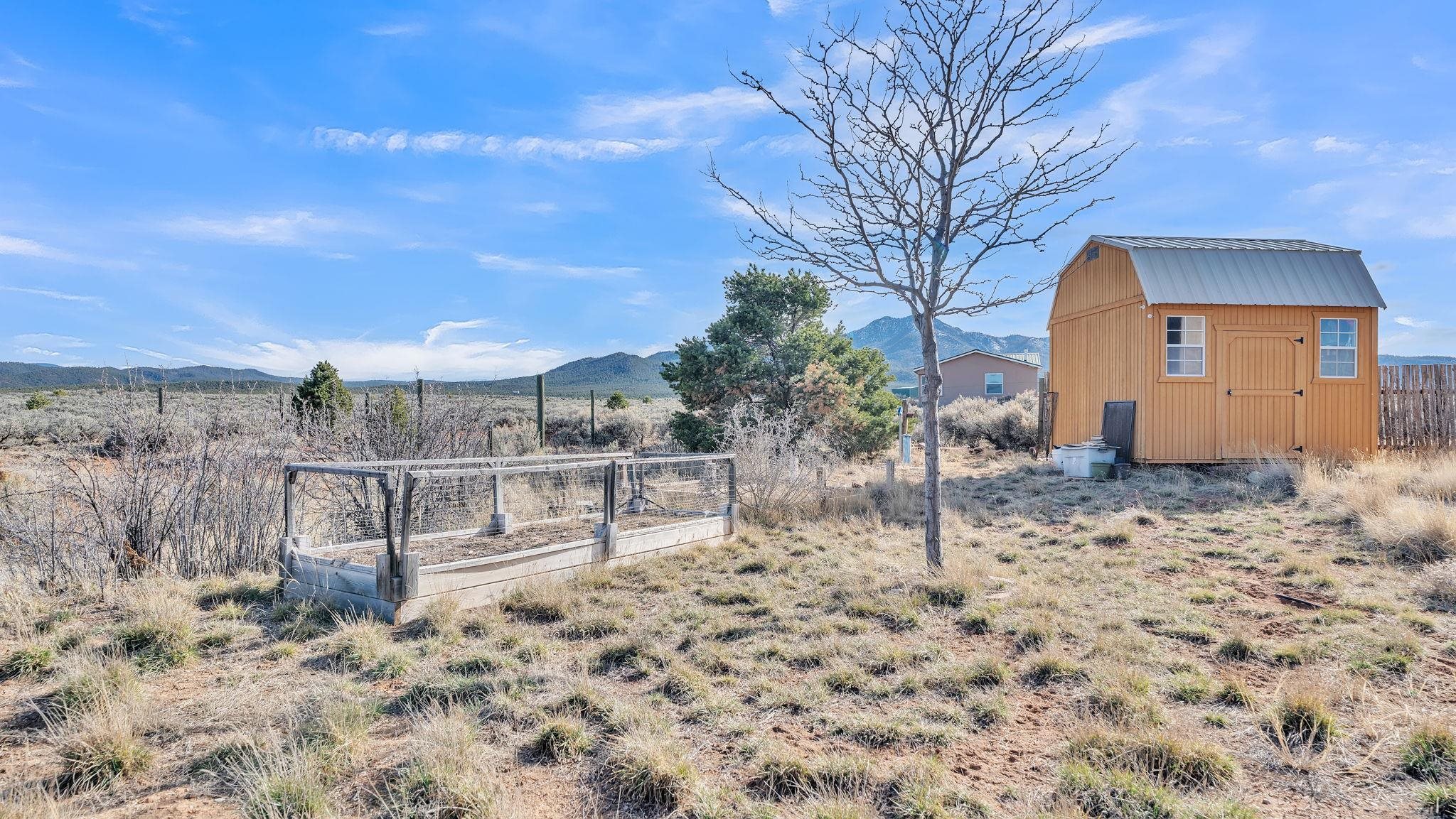 Mountain views take center stage at this spectacular Ranchos de Taos home, where epic vistas meet timeless Southwest charm. This spacious three-bedroom, two-full bath residence features a sunken living room with an inviting kiva fireplace, and saltillo tile floors throughout the home. The thoughtful split floor plan places the primary suite on the opposite side of the home from the guest bedrooms for added privacy. Step out onto the flagstone courtyard patio with trees to take in the vivid western sunsets and panoramic views. Outdoor walkways, a fully fenced yard, designated garden areas, a carport, and a large storage shed complete the property. Lovingly maintained and ideally located near the Taos golf course, and minutes from downtown Taos. This area offers plenty of hiking trails overlooking the Rio Grande, and of course the very epic sunsets. With 18 solar panels to offset your utility costs, a converted garage bonus room, and a tankless on-demand hot water heater, comfort meets efficiency. Discover the beauty of refined mountain living.