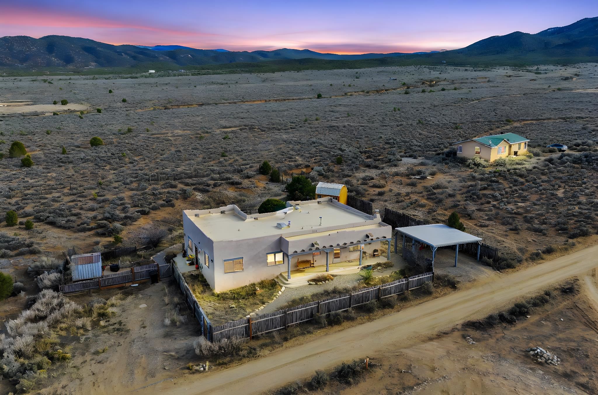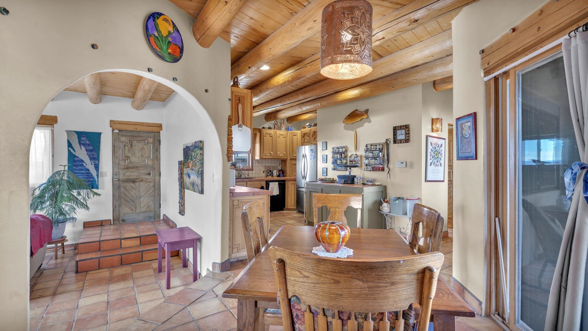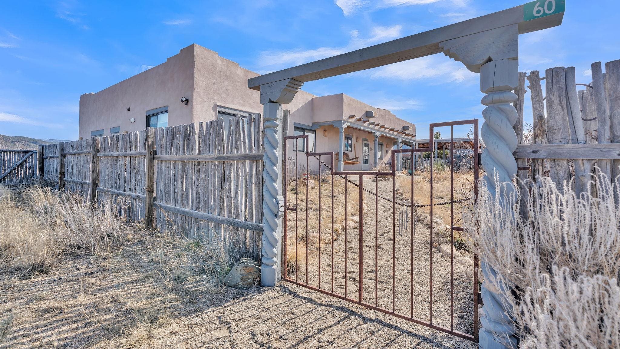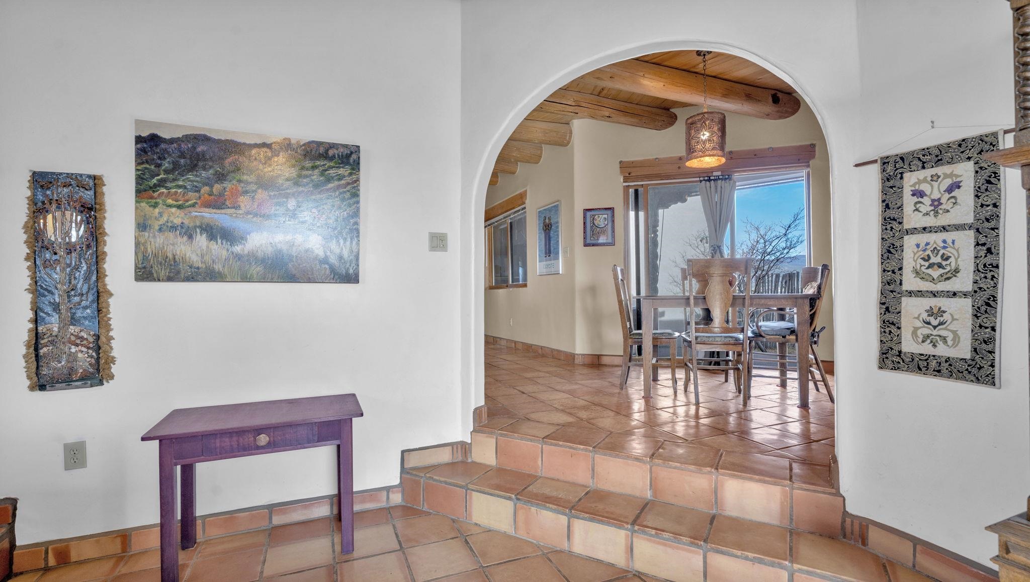 Mountain views take center stage at this spectacular Ranchos de Taos home, where epic vistas meet timeless Southwest charm. This spacious three-bedroom, two-full bath residence features a sunken living room with an inviting kiva fireplace, and saltillo tile floors throughout the home. The thoughtful split floor plan places the primary suite on the opposite side of the home from the guest bedrooms for added privacy. Step out onto the flagstone courtyard patio with trees to take in the vivid western sunsets and panoramic views. Outdoor walkways, a fully fenced yard, designated garden areas, a carport, and a large storage shed complete the property. Lovingly maintained and ideally located near the Taos golf course, and minutes from downtown Taos. This area offers plenty of hiking trails overlooking the Rio Grande, and of course the very epic sunsets. With 18 solar panels to offset your utility costs, a converted garage bonus room, and a tankless on-demand hot water heater, comfort meets efficiency. Discover the beauty of refined mountain living.