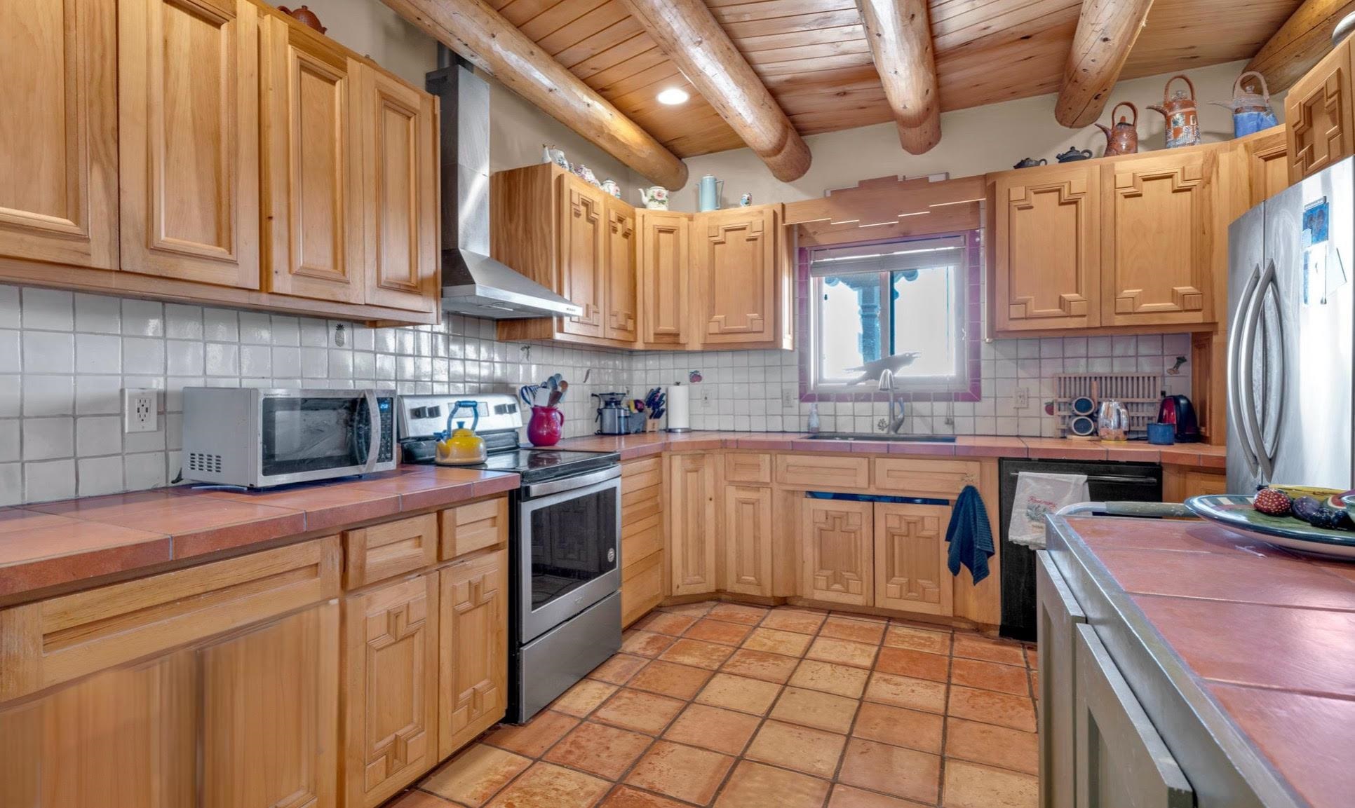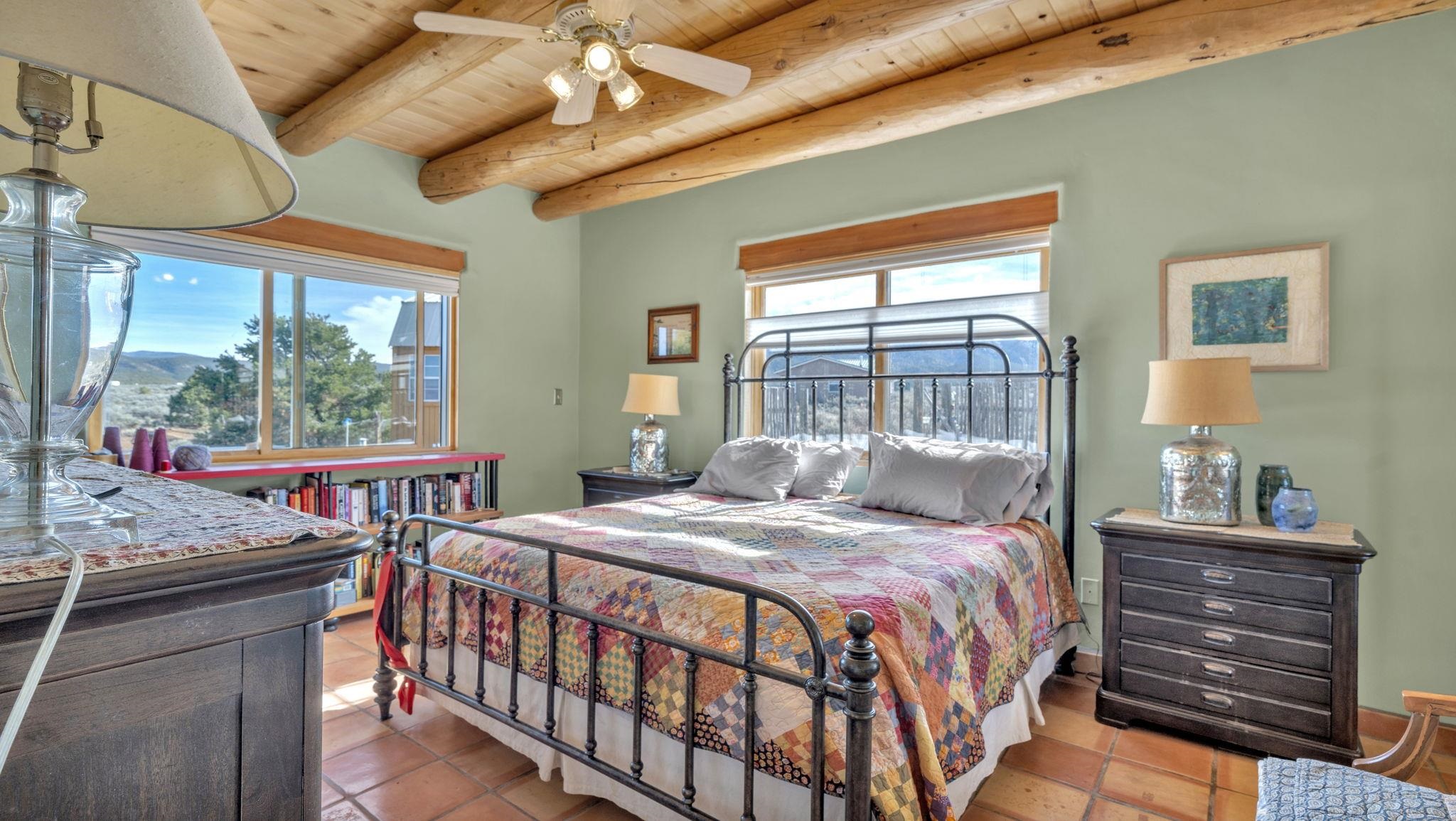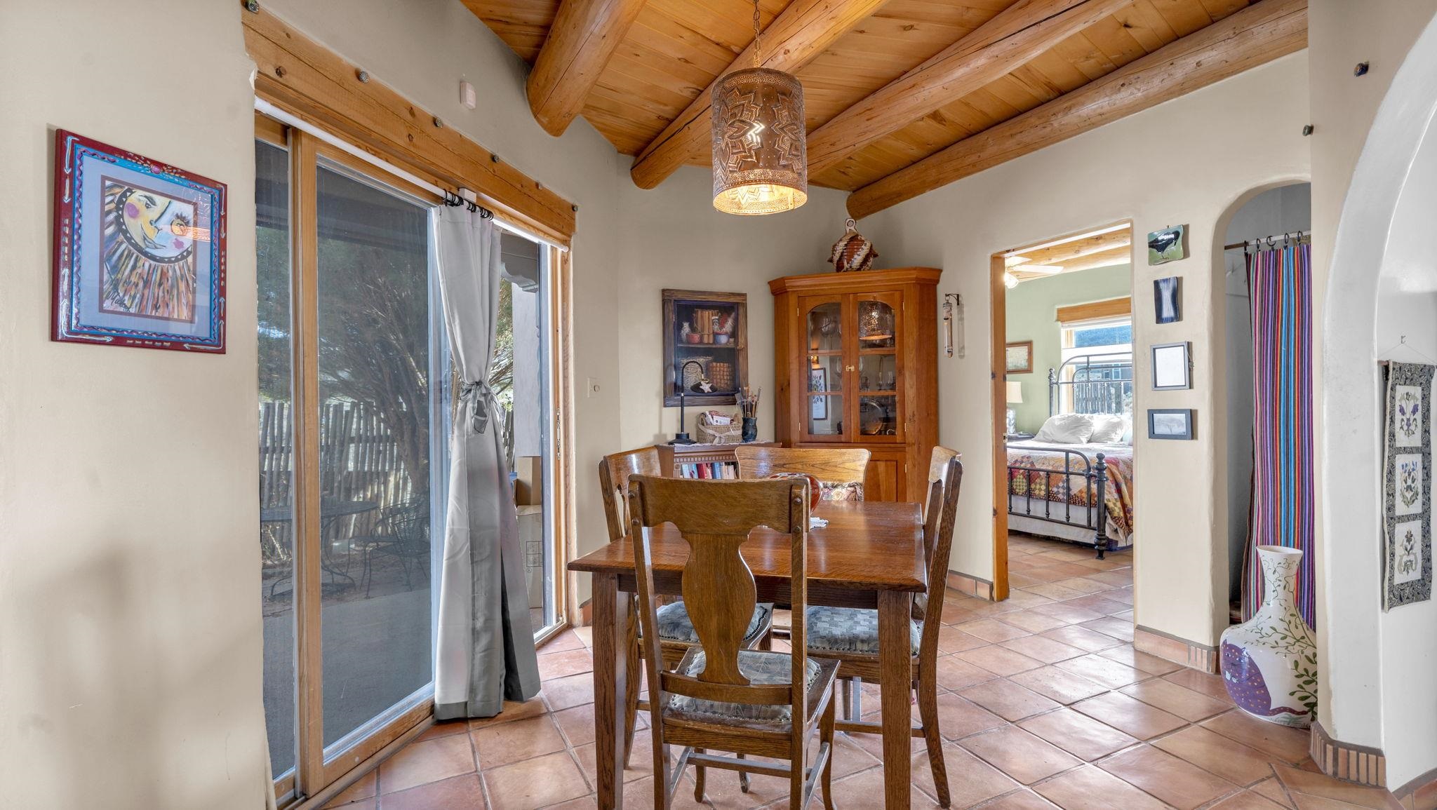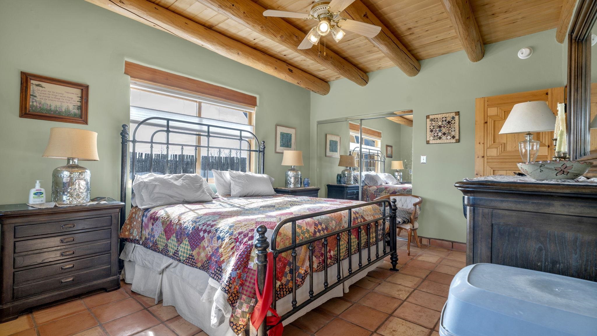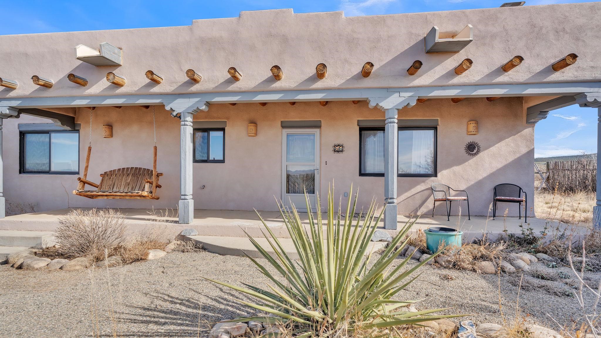 Mountain views take center stage at this spectacular Ranchos de Taos home, where epic vistas meet timeless Southwest charm. This spacious three-bedroom, two-full bath residence features a sunken living room with an inviting kiva fireplace, and saltillo tile floors throughout the home. The thoughtful split floor plan places the primary suite on the opposite side of the home from the guest bedrooms for added privacy. Step out onto the flagstone courtyard patio with trees to take in the vivid western sunsets and panoramic views. Outdoor walkways, a fully fenced yard, designated garden areas, a carport, and a large storage shed complete the property. Lovingly maintained and ideally located near the Taos golf course, and minutes from downtown Taos. This area offers plenty of hiking trails overlooking the Rio Grande, and of course the very epic sunsets. With 18 solar panels to offset your utility costs, a converted garage bonus room, and a tankless on-demand hot water heater, comfort meets efficiency. Discover the beauty of refined mountain living.