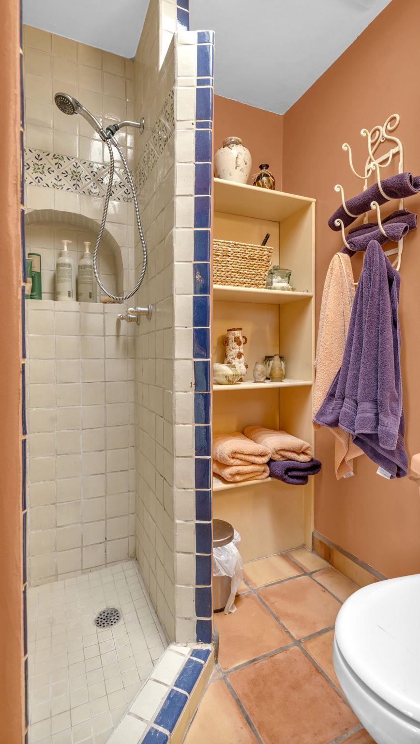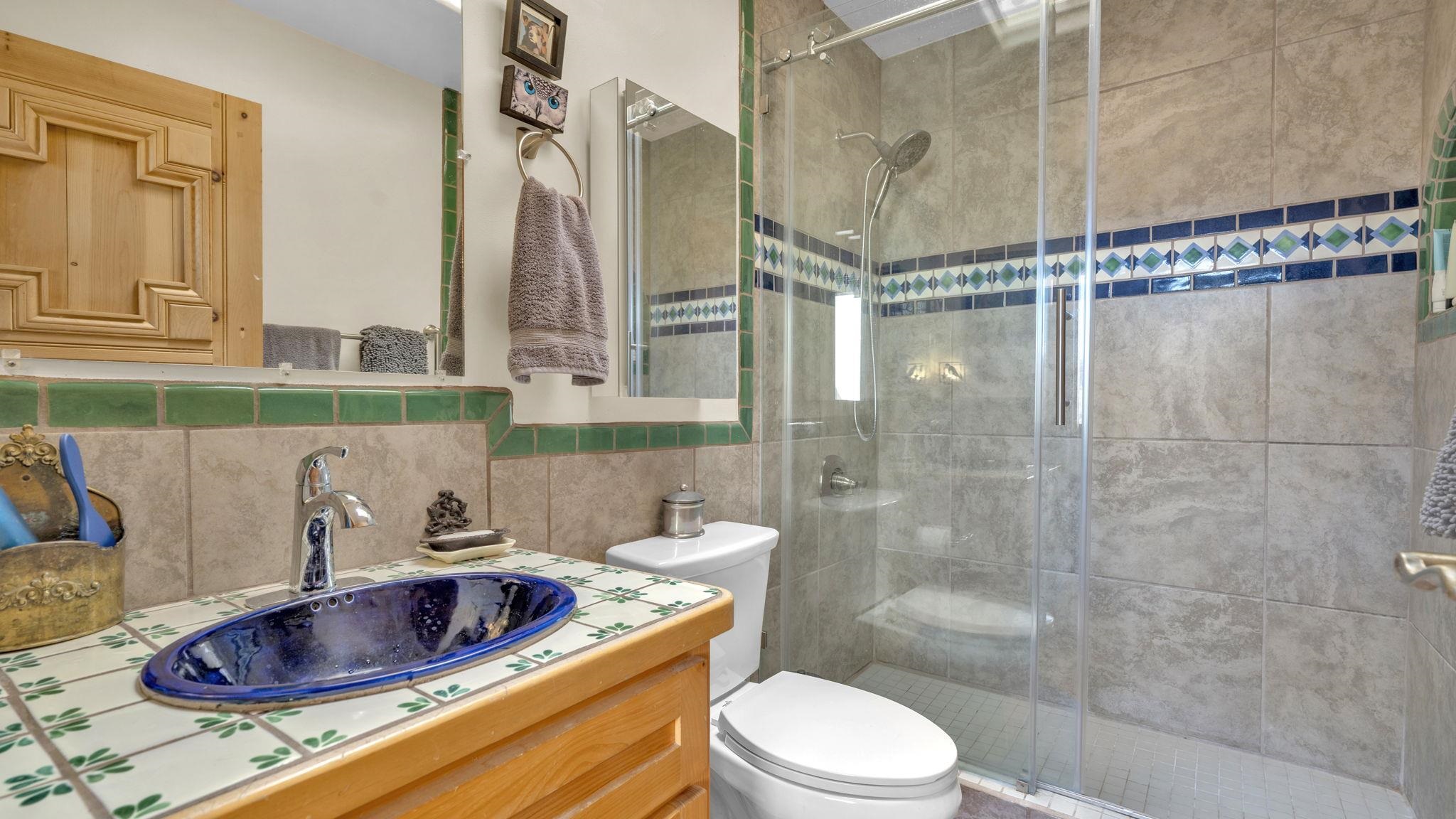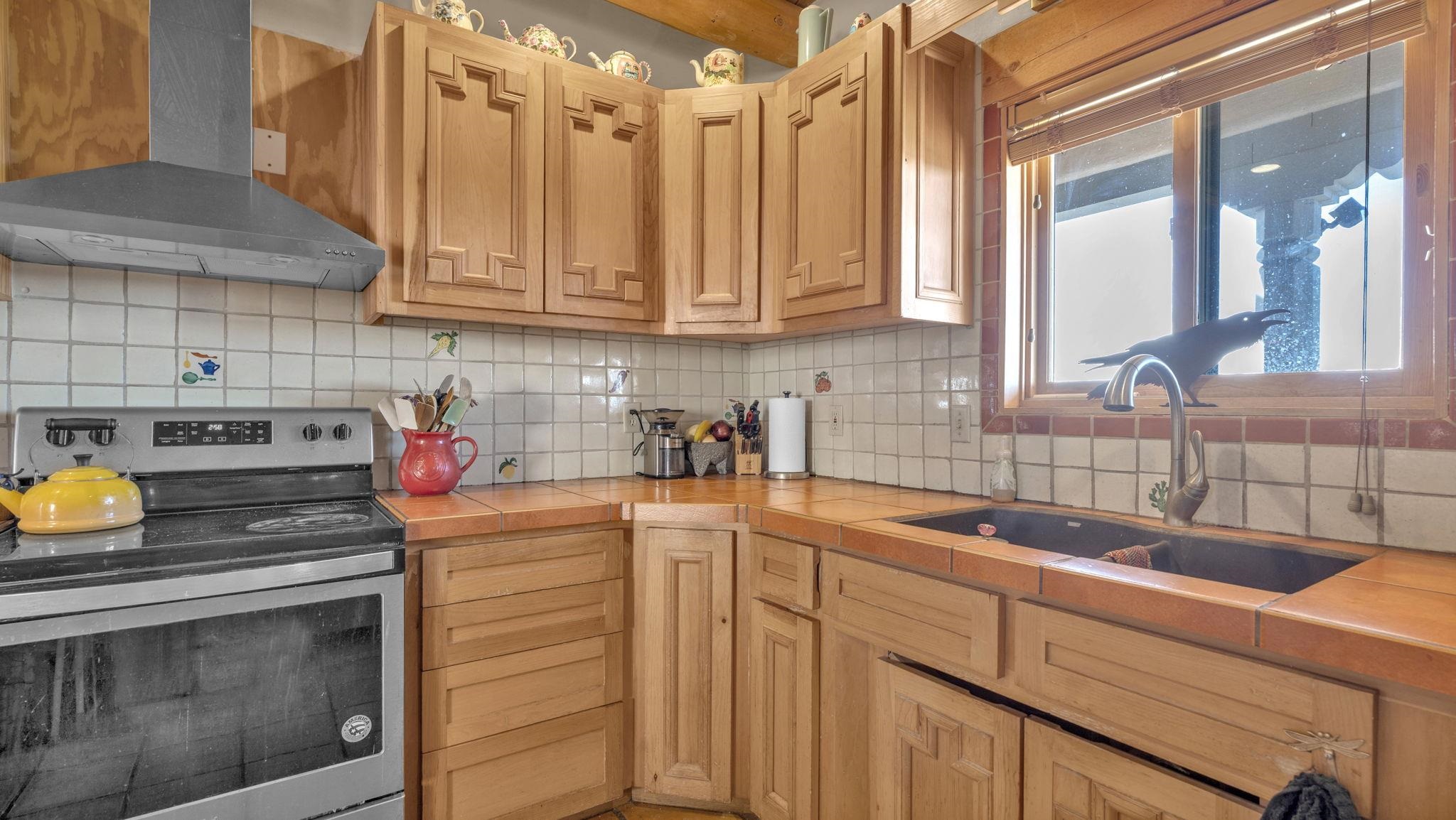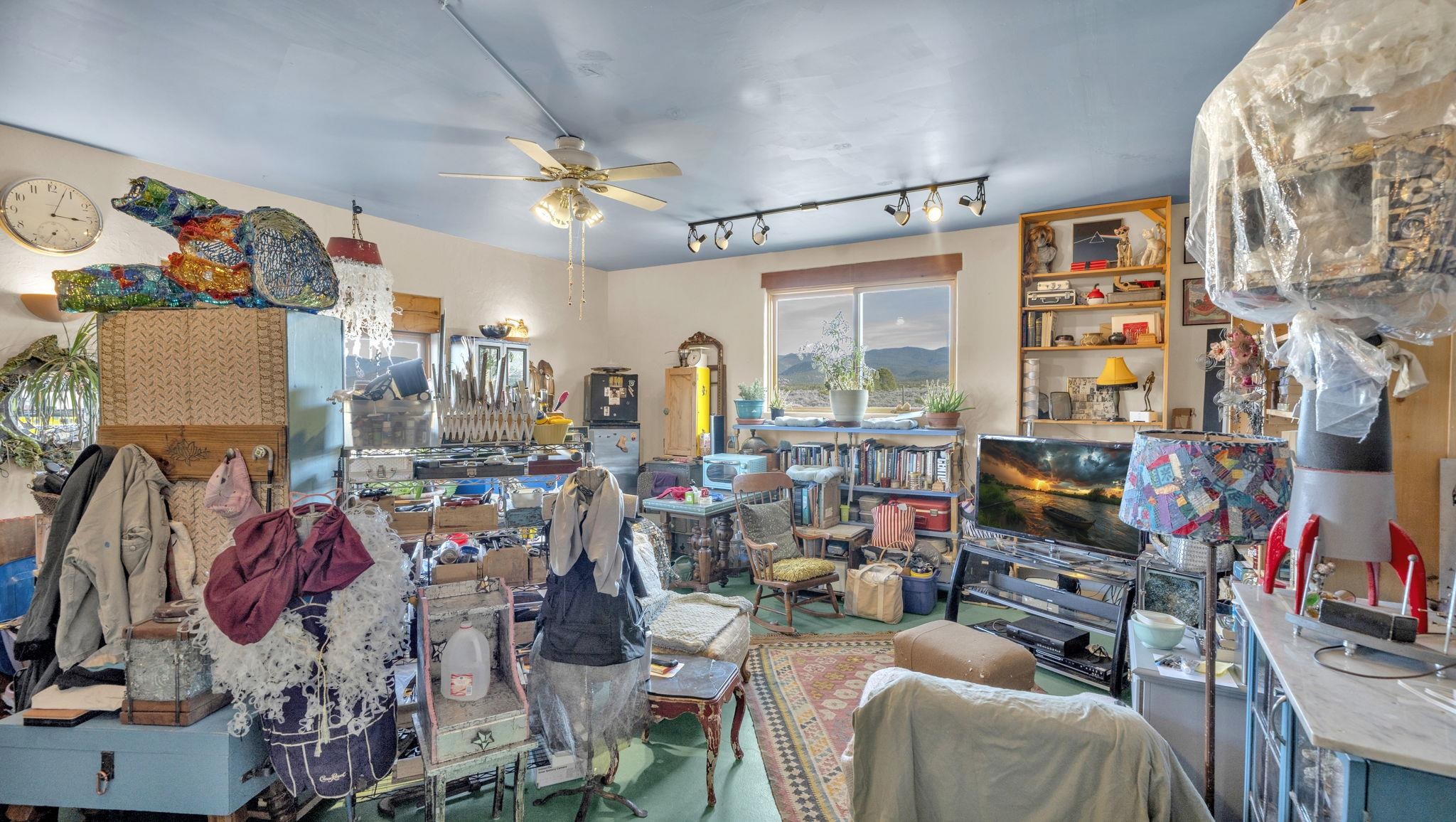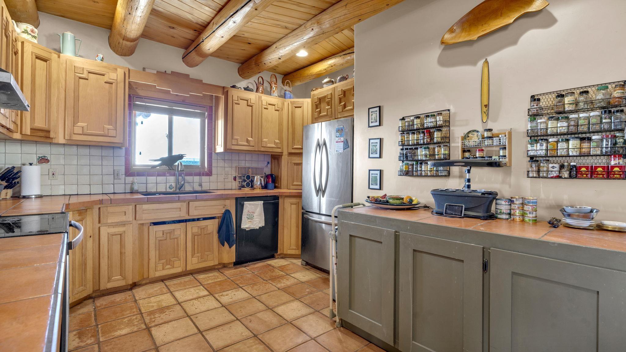 Mountain views take center stage at this spectacular Ranchos de Taos home, where epic vistas meet timeless Southwest charm. This spacious three-bedroom, two-full bath residence features a sunken living room with an inviting kiva fireplace, and saltillo tile floors throughout the home. The thoughtful split floor plan places the primary suite on the opposite side of the home from the guest bedrooms for added privacy. Step out onto the flagstone courtyard patio with trees to take in the vivid western sunsets and panoramic views. Outdoor walkways, a fully fenced yard, designated garden areas, a carport, and a large storage shed complete the property. Lovingly maintained and ideally located near the Taos golf course, and minutes from downtown Taos. This area offers plenty of hiking trails overlooking the Rio Grande, and of course the very epic sunsets. With 18 solar panels to offset your utility costs, a converted garage bonus room, and a tankless on-demand hot water heater, comfort meets efficiency. Discover the beauty of refined mountain living.