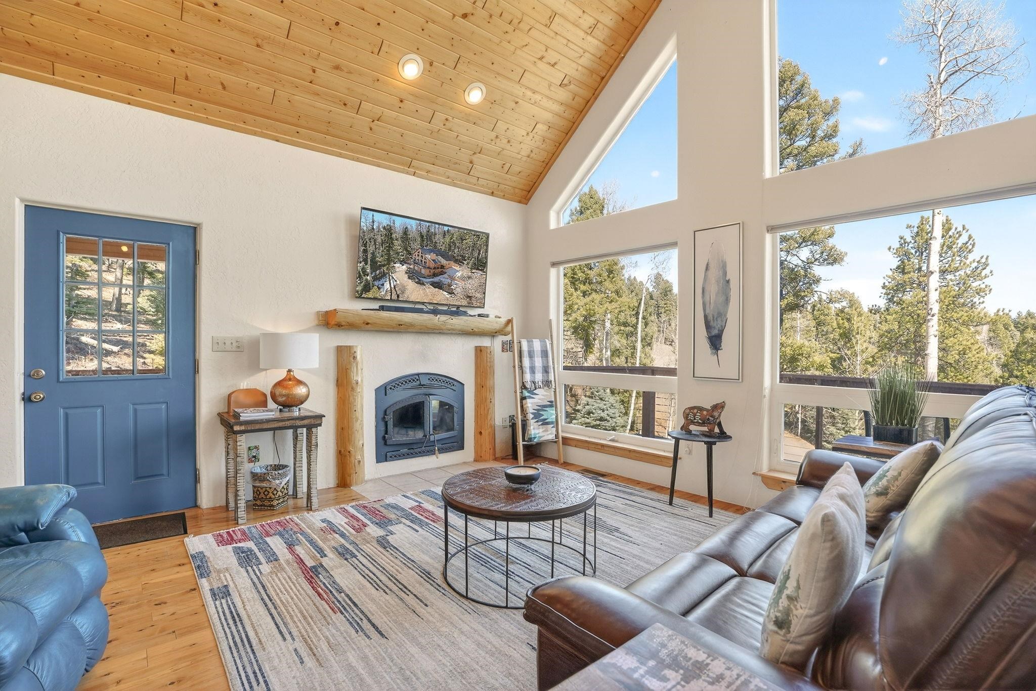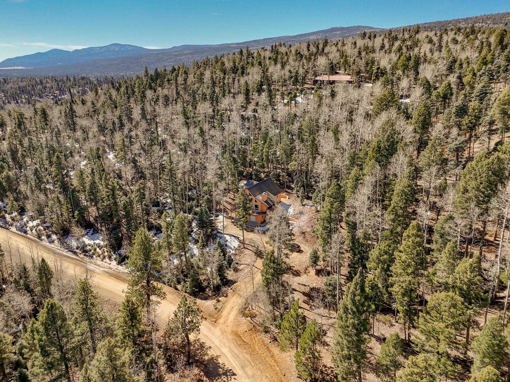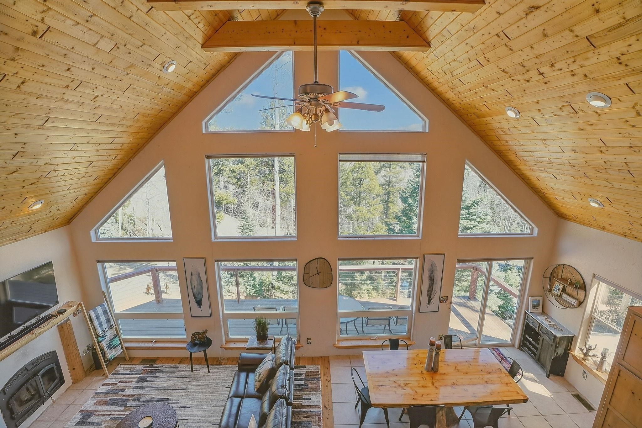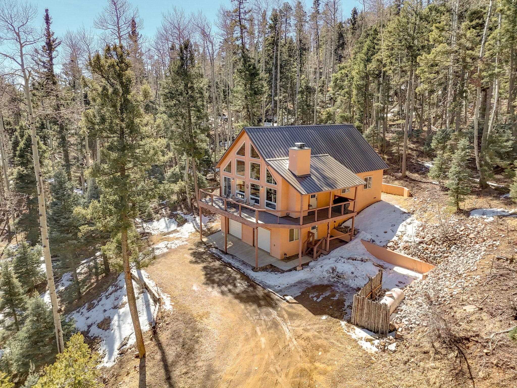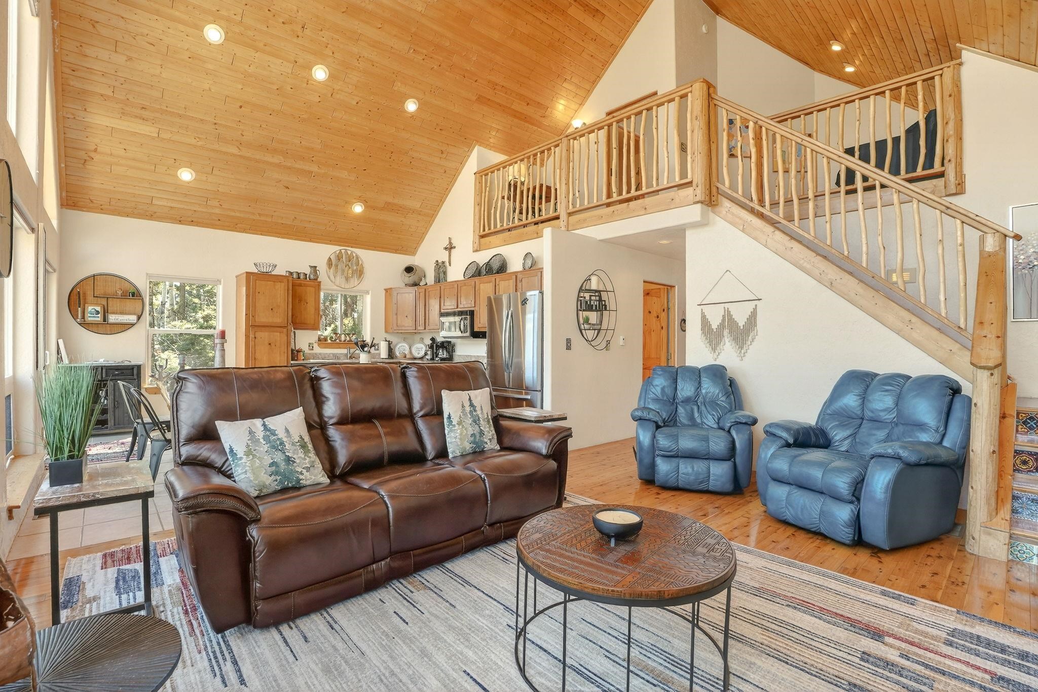 Nestled among the tall pines of Angel Fire, this warm and welcoming mountain chalet sits on a beautifully wooded 1.64-acre lot with peaceful views and room to breathe. Inside, the open living area is filled with natural light and features soaring wood ceilings, expansive windows, and a cozy propane fireplace - an ideal place to unwind after a day of skiing, hiking, or exploring the mountains. The home offers a flexible layout designed for hosting friends and family. The main level includes the living, kitchen, dining, and laundry areas along with two guest bedrooms, a guest bath, and a comfortable primary suite for convenient main-floor living. Upstairs, a loft leads to a second private primary suite, perfect for guests who want their own retreat. Step outside to the spacious composite deck and take in the quiet mountain setting surrounded by mature pines. The attached two-car garage includes an oversized bay with extra height and length, ideal for larger vehicles or outdoor gear. Whether you're looking for a peaceful getaway, a basecamp for mountain adventures, or a property with rental potential, this charming Angel Fire home offers the space and setting to enjoy it all.