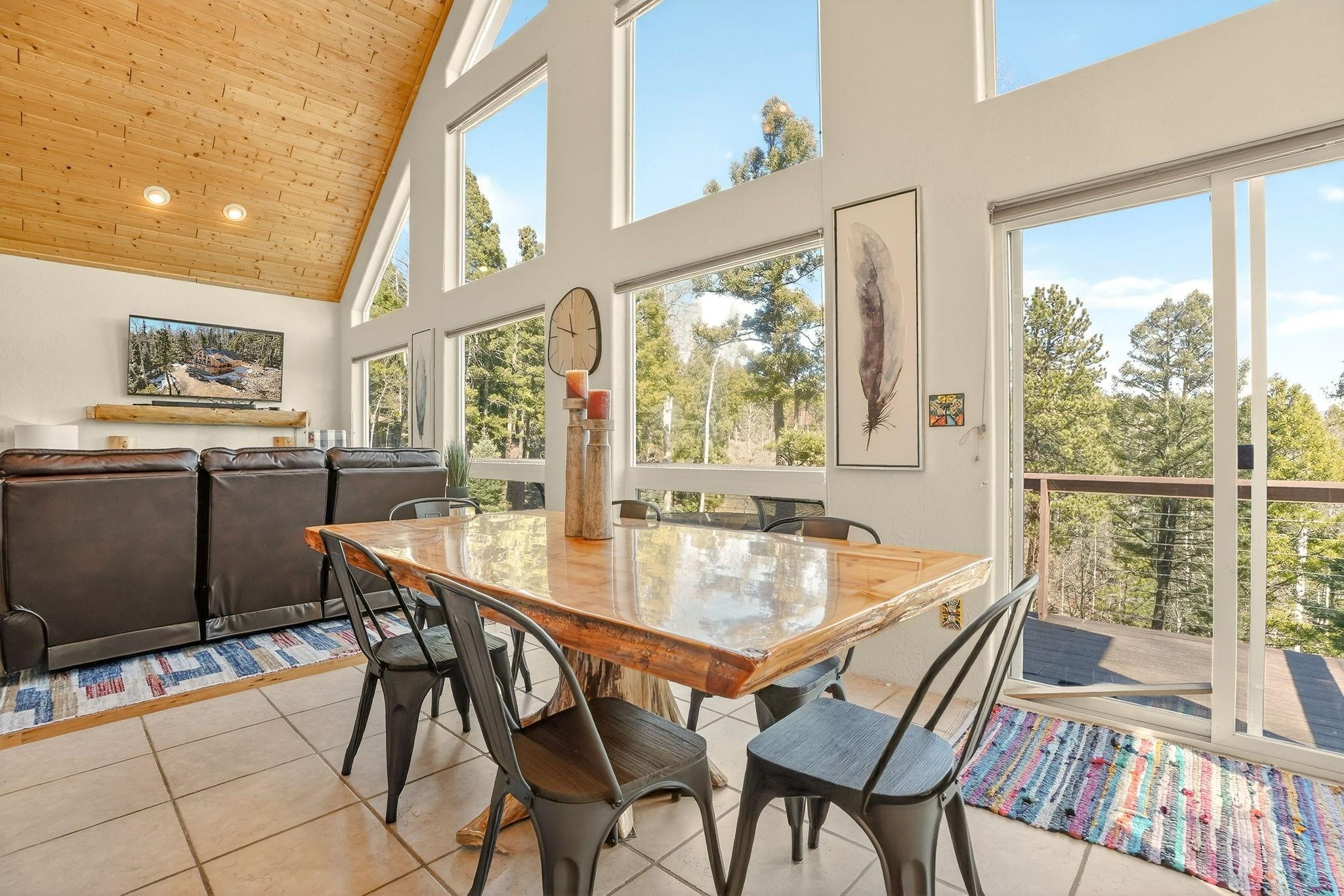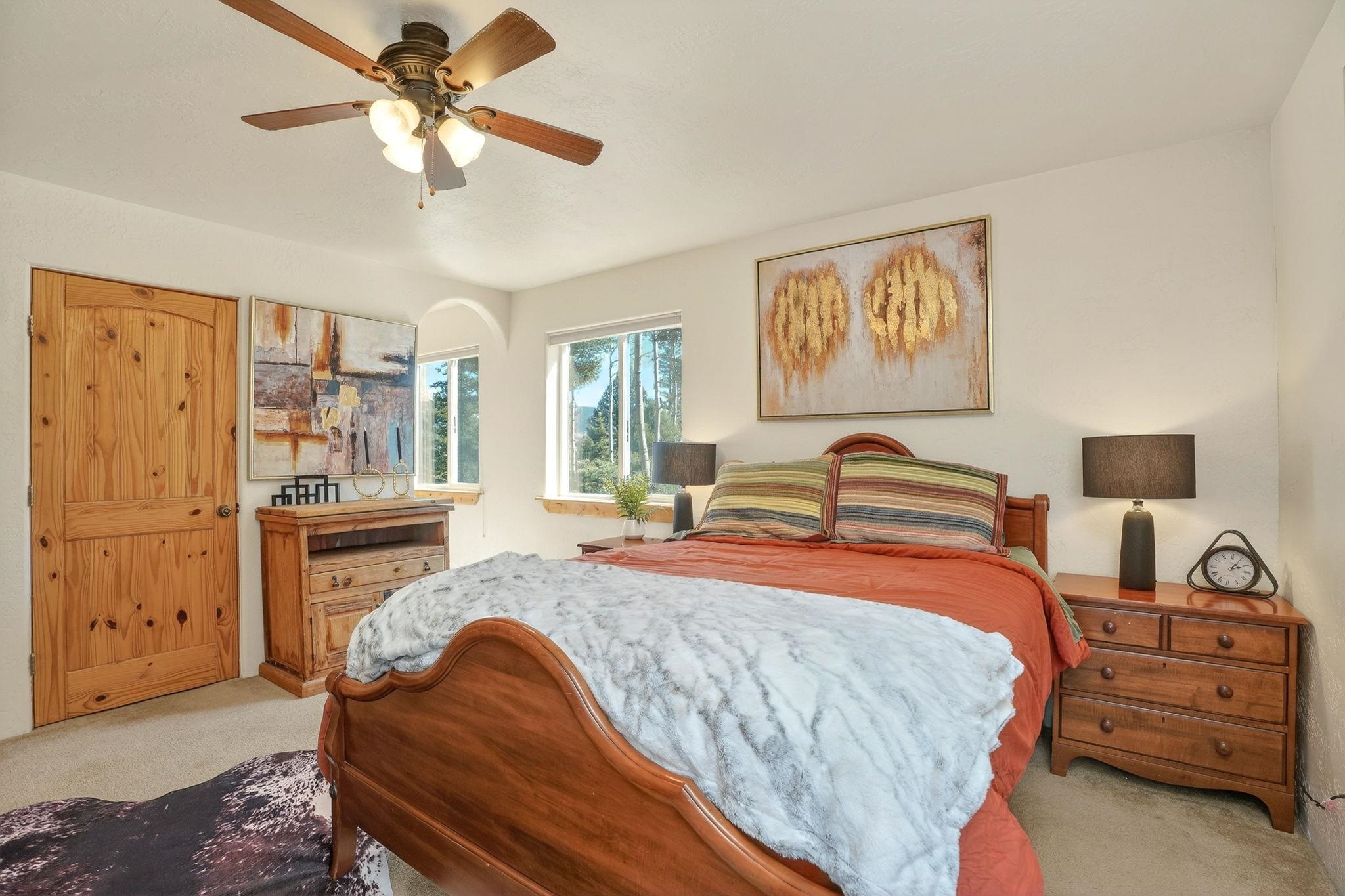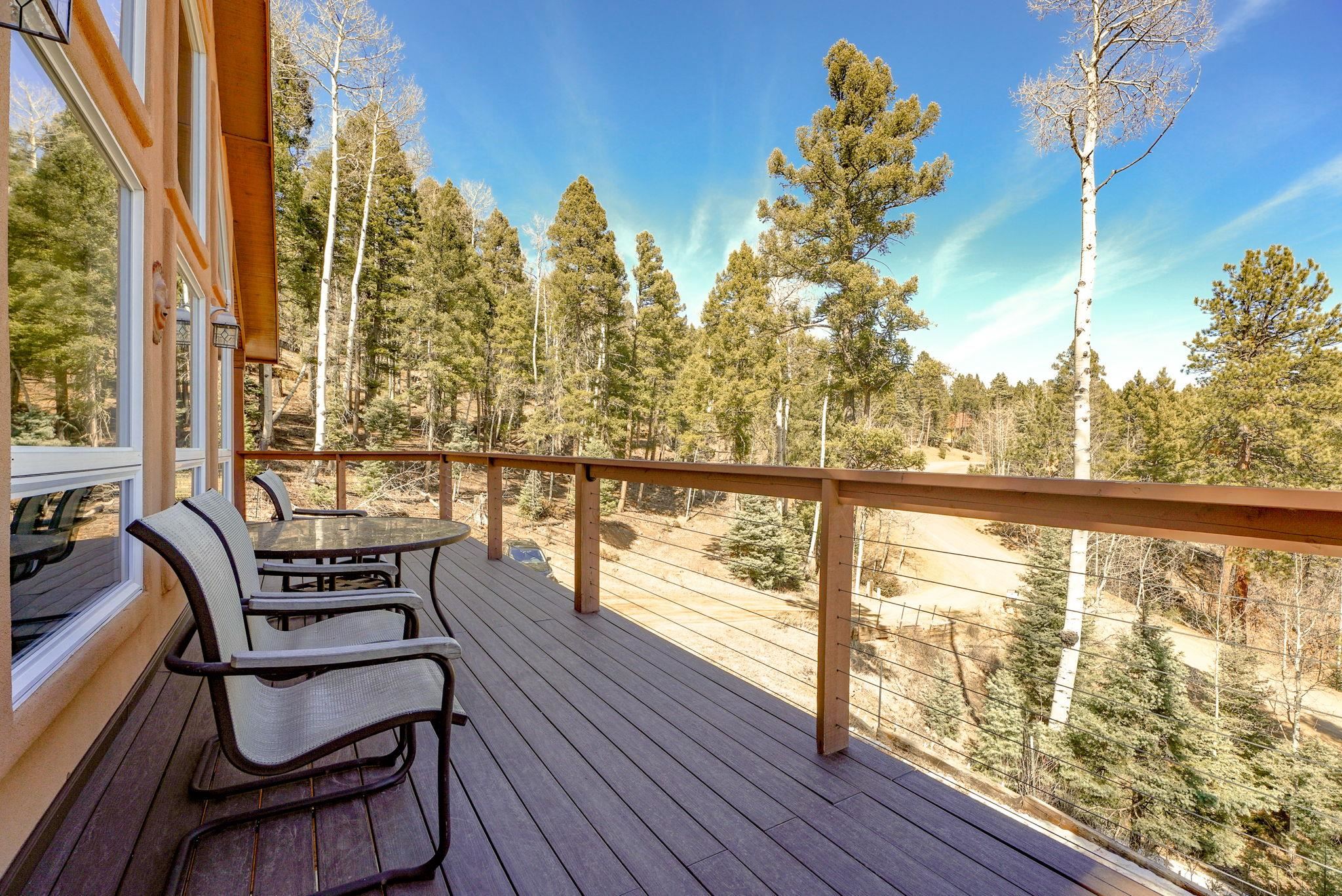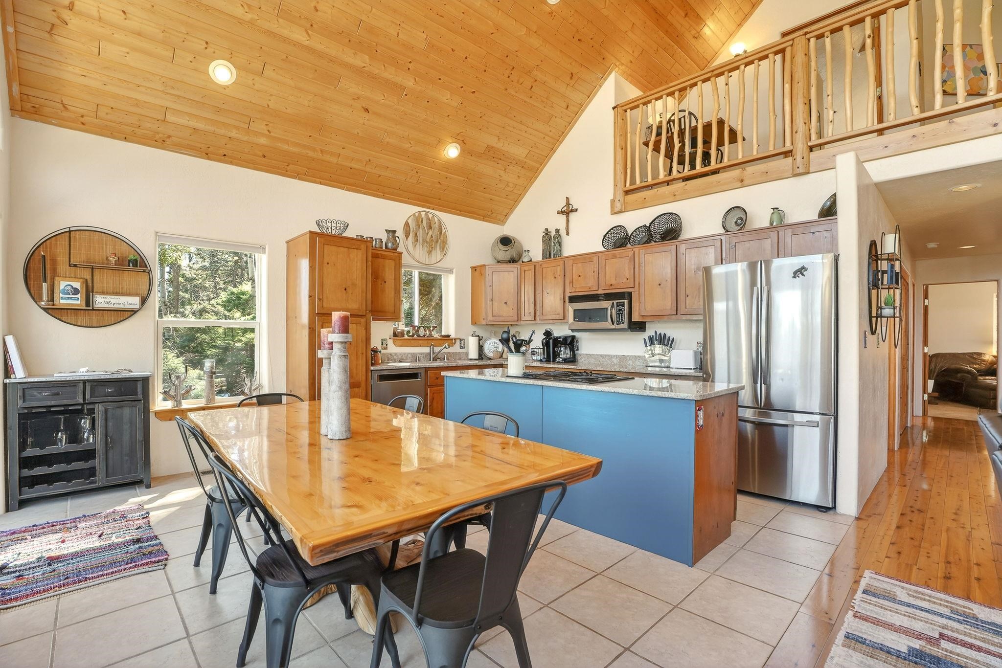 Nestled among the tall pines of Angel Fire, this warm and welcoming mountain chalet sits on a beautifully wooded 1.64-acre lot with peaceful views and room to breathe. Inside, the open living area is filled with natural light and features soaring wood ceilings, expansive windows, and a cozy propane fireplace - an ideal place to unwind after a day of skiing, hiking, or exploring the mountains. The home offers a flexible layout designed for hosting friends and family. The main level includes the living, kitchen, dining, and laundry areas along with two guest bedrooms, a guest bath, and a comfortable primary suite for convenient main-floor living. Upstairs, a loft leads to a second private primary suite, perfect for guests who want their own retreat. Step outside to the spacious composite deck and take in the quiet mountain setting surrounded by mature pines. The attached two-car garage includes an oversized bay with extra height and length, ideal for larger vehicles or outdoor gear. Whether you're looking for a peaceful getaway, a basecamp for mountain adventures, or a property with rental potential, this charming Angel Fire home offers the space and setting to enjoy it all.