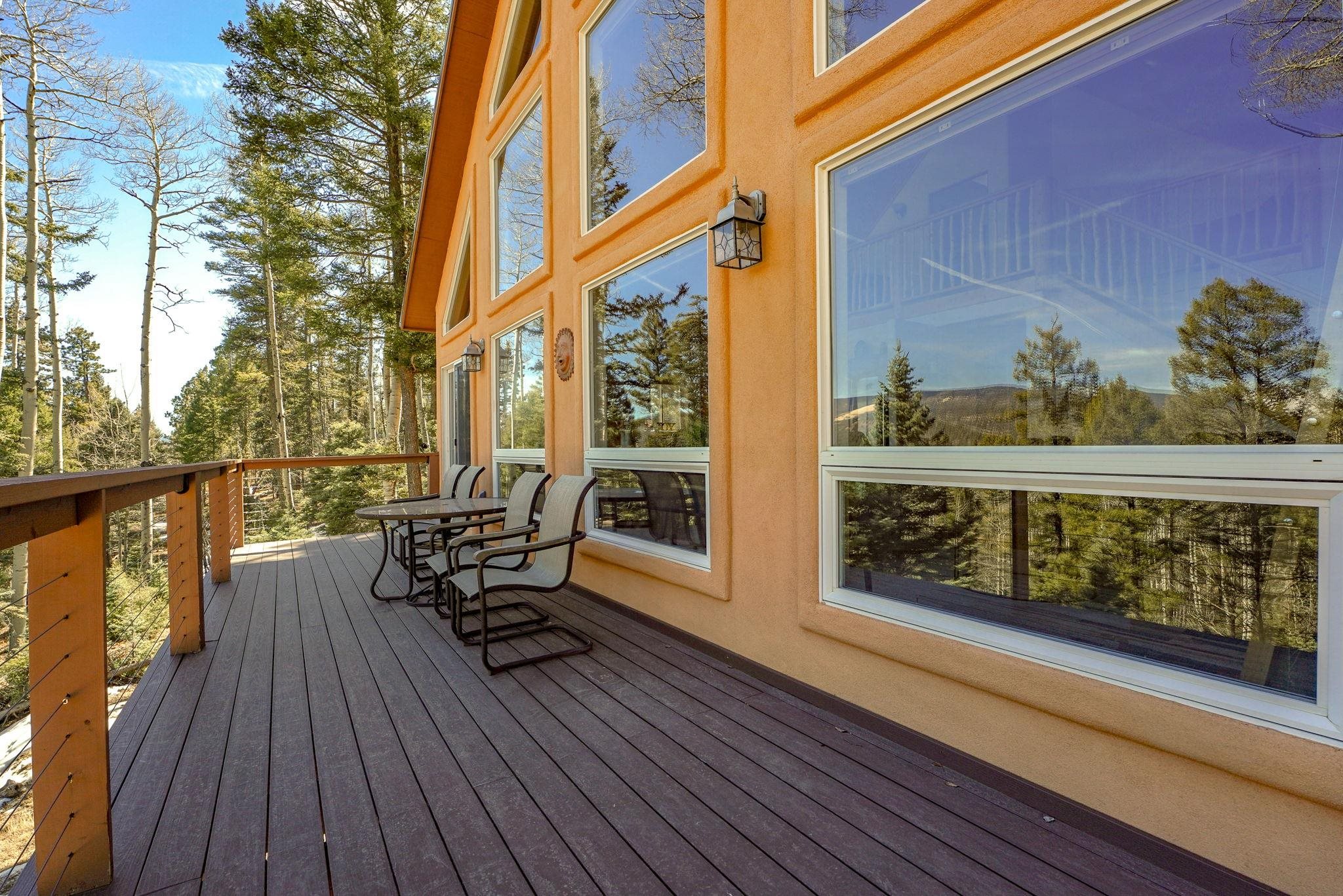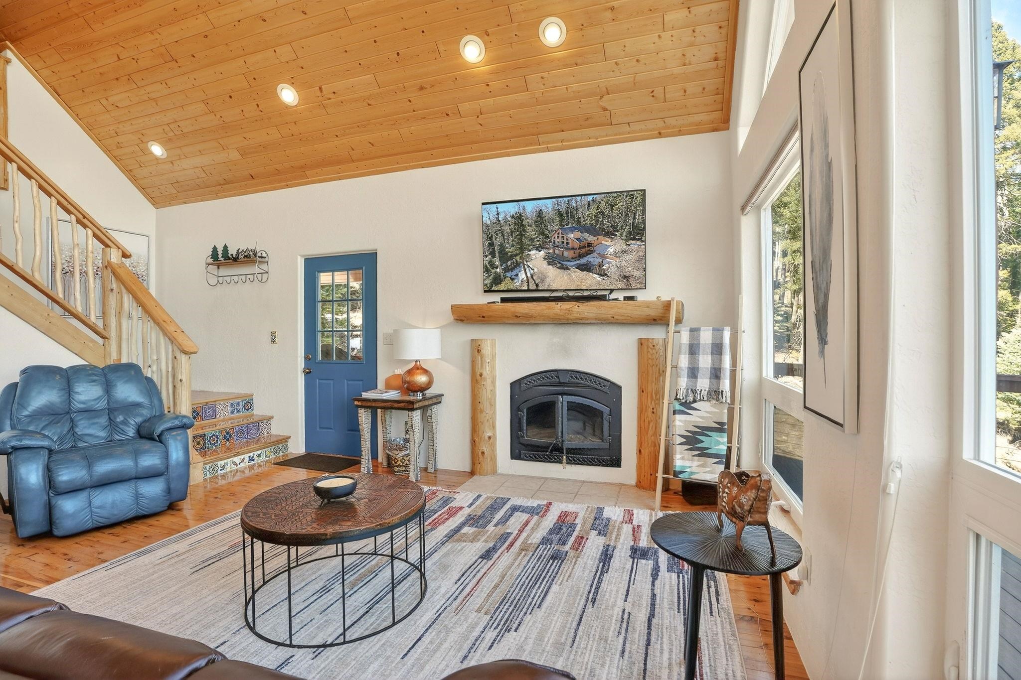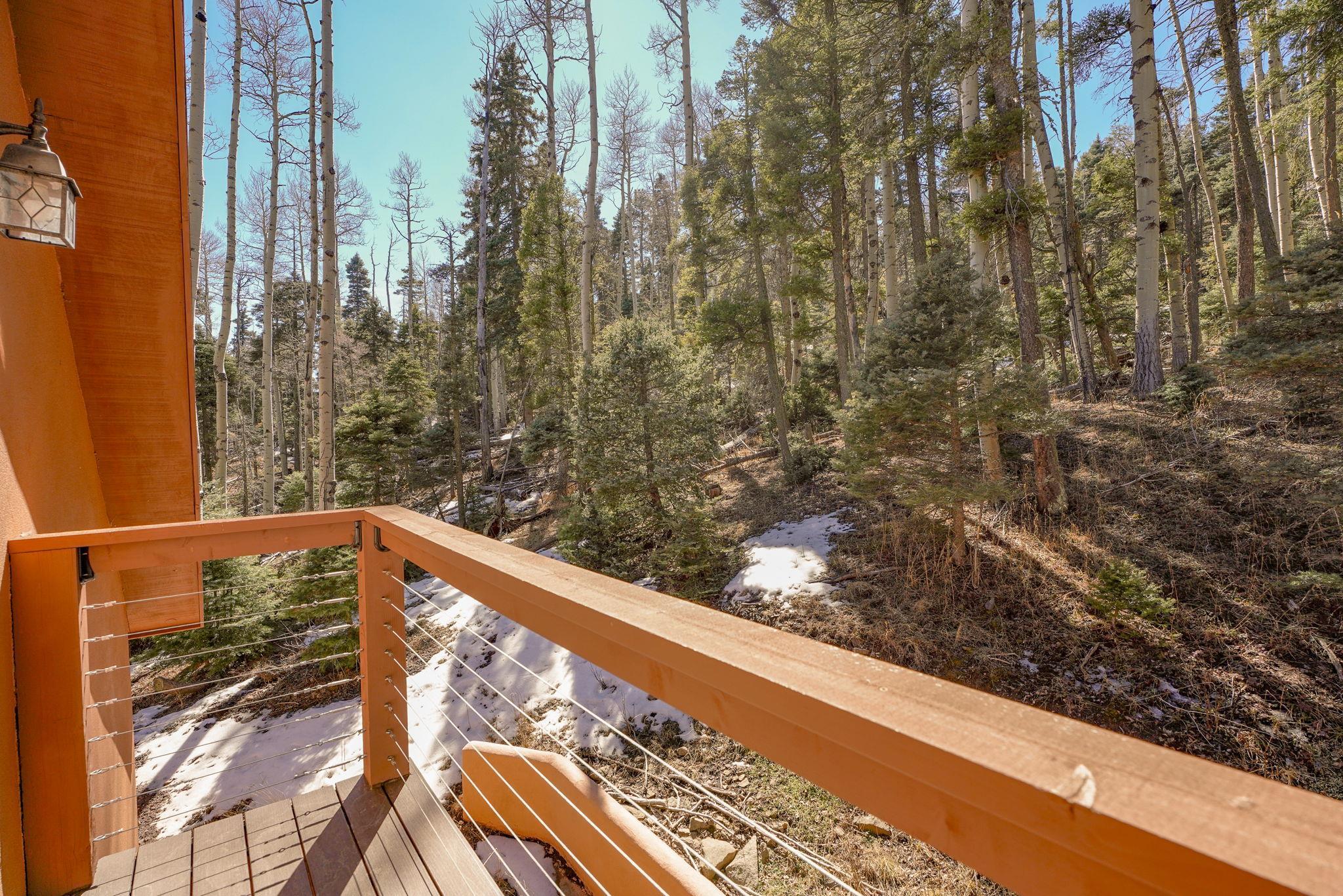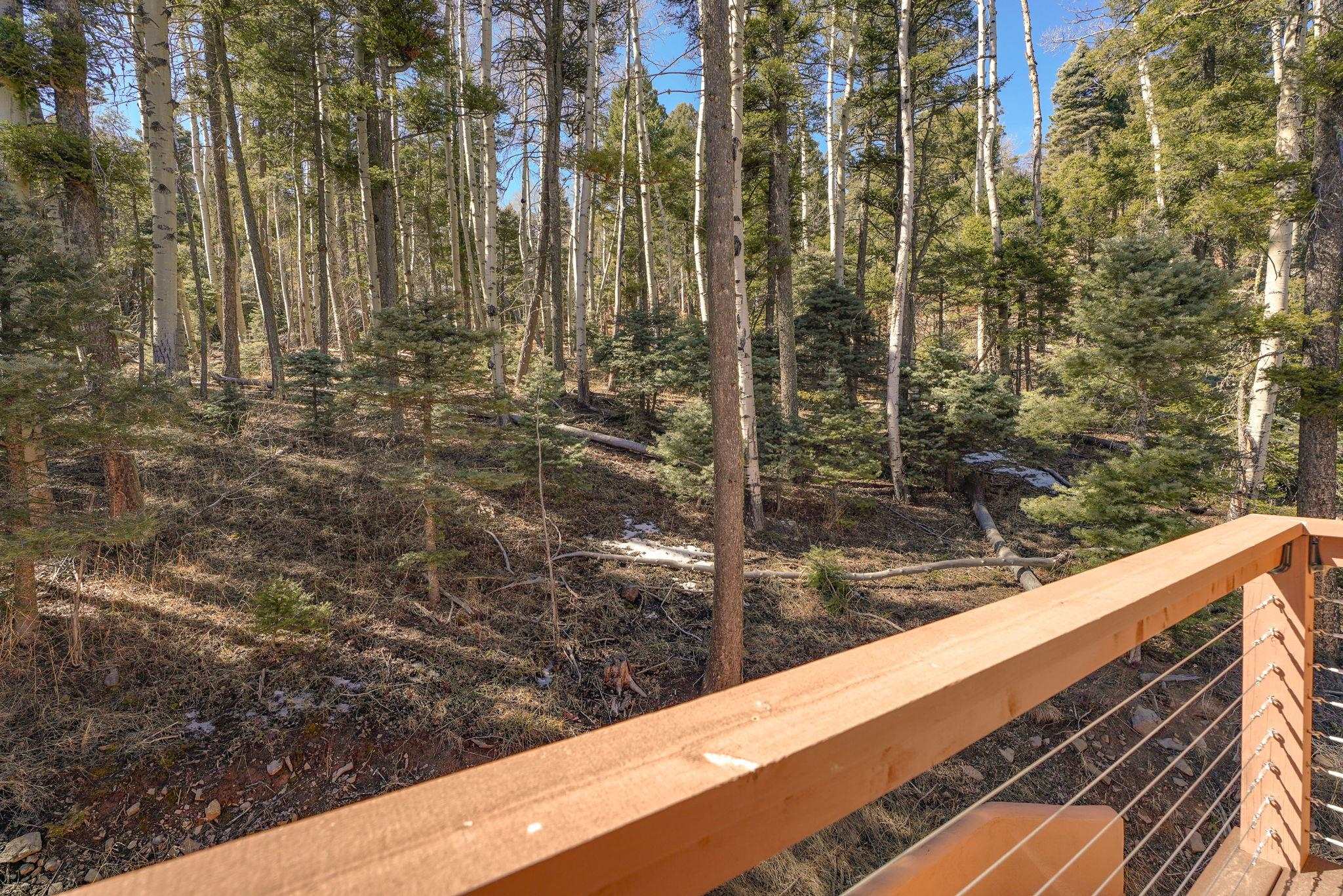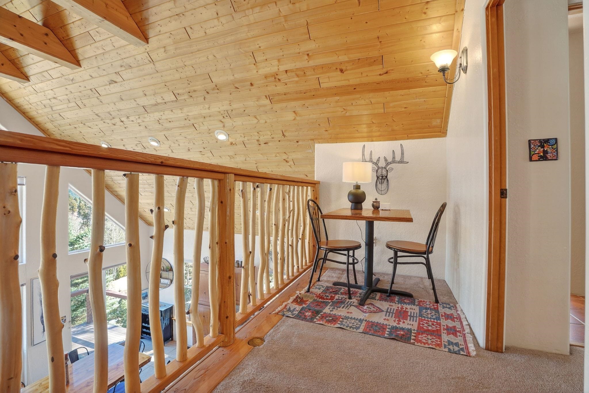 Nestled among the tall pines of Angel Fire, this warm and welcoming mountain chalet sits on a beautifully wooded 1.64-acre lot with peaceful views and room to breathe. Inside, the open living area is filled with natural light and features soaring wood ceilings, expansive windows, and a cozy propane fireplace - an ideal place to unwind after a day of skiing, hiking, or exploring the mountains. The home offers a flexible layout designed for hosting friends and family. The main level includes the living, kitchen, dining, and laundry areas along with two guest bedrooms, a guest bath, and a comfortable primary suite for convenient main-floor living. Upstairs, a loft leads to a second private primary suite, perfect for guests who want their own retreat. Step outside to the spacious composite deck and take in the quiet mountain setting surrounded by mature pines. The attached two-car garage includes an oversized bay with extra height and length, ideal for larger vehicles or outdoor gear. Whether you're looking for a peaceful getaway, a basecamp for mountain adventures, or a property with rental potential, this charming Angel Fire home offers the space and setting to enjoy it all.