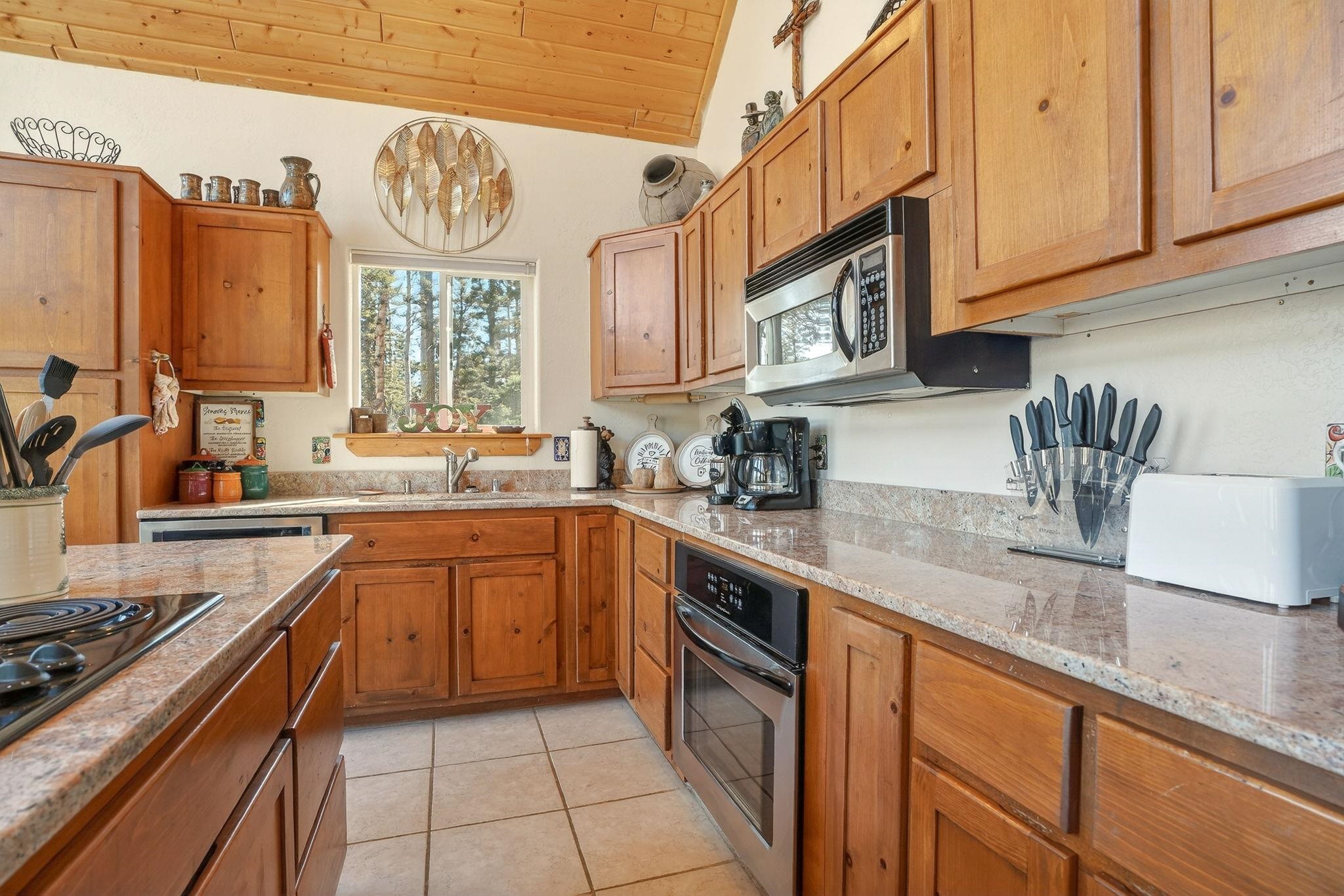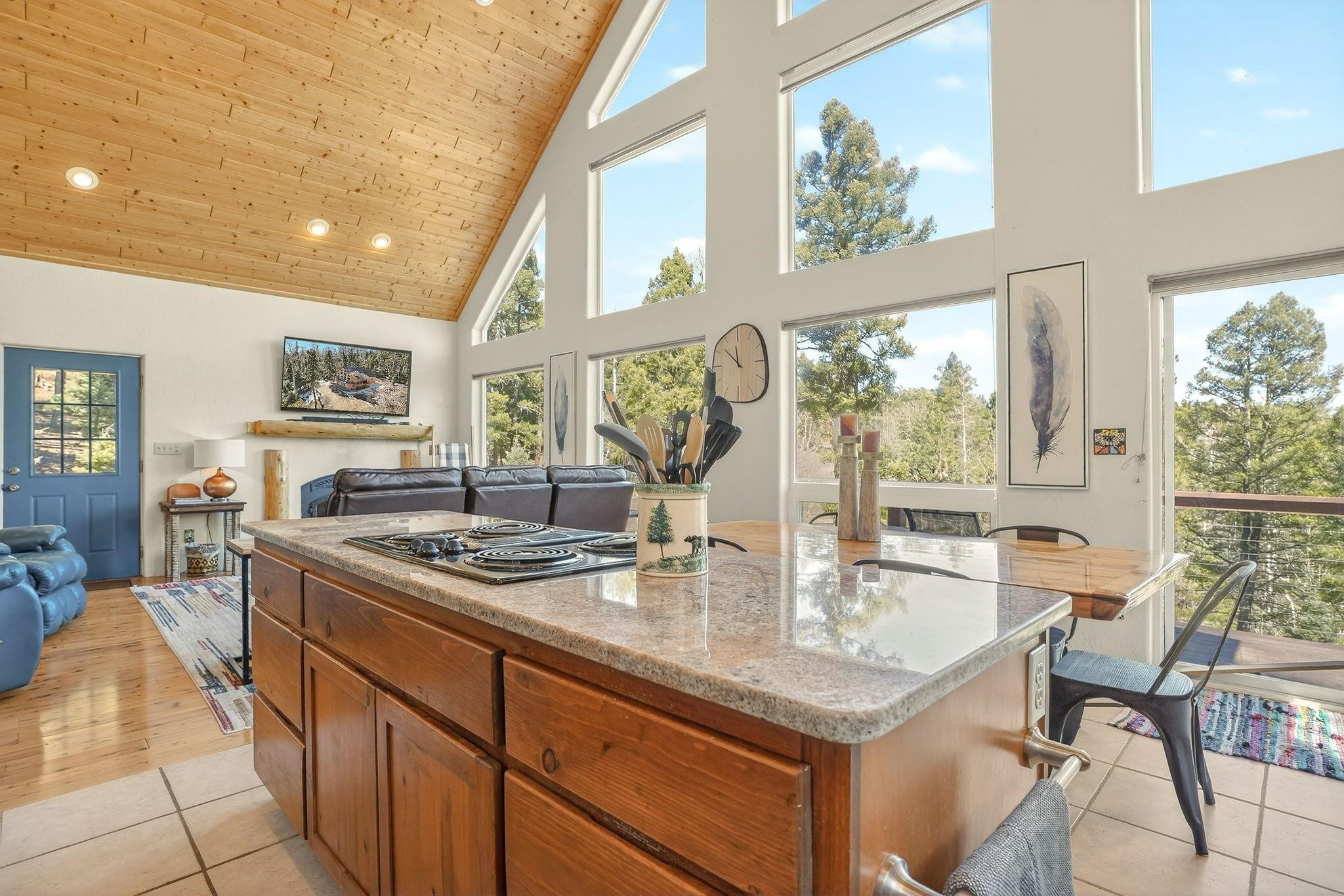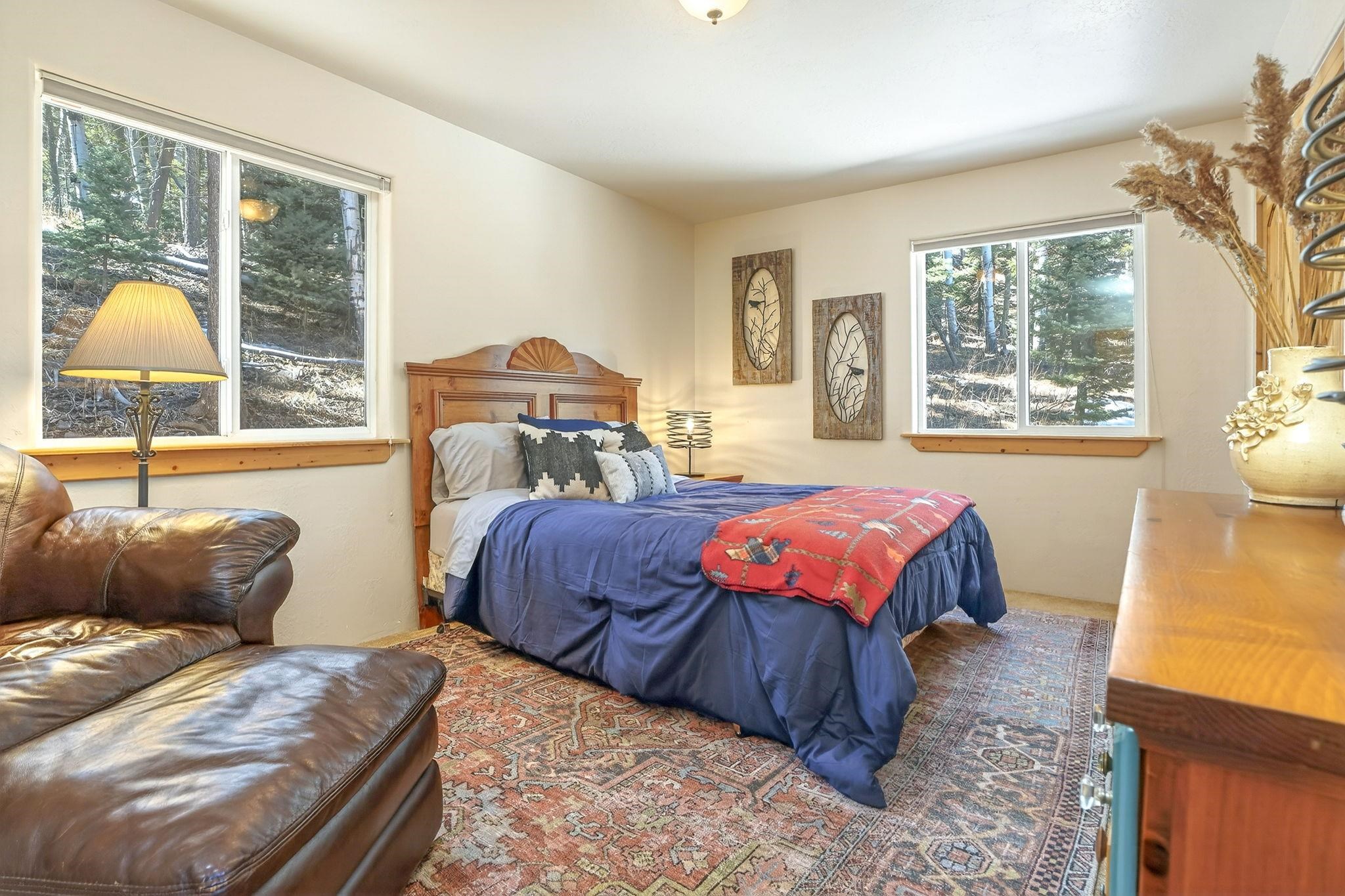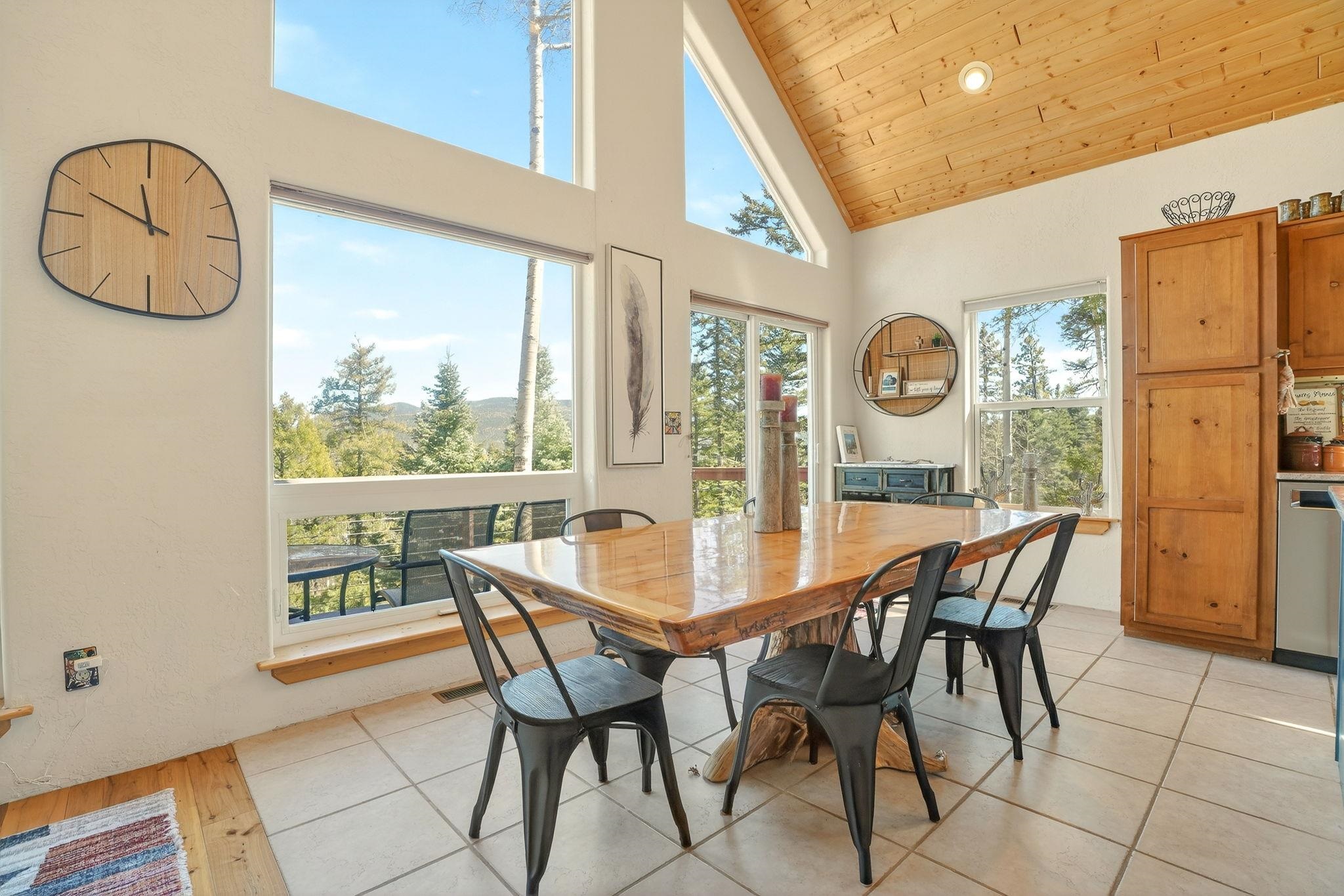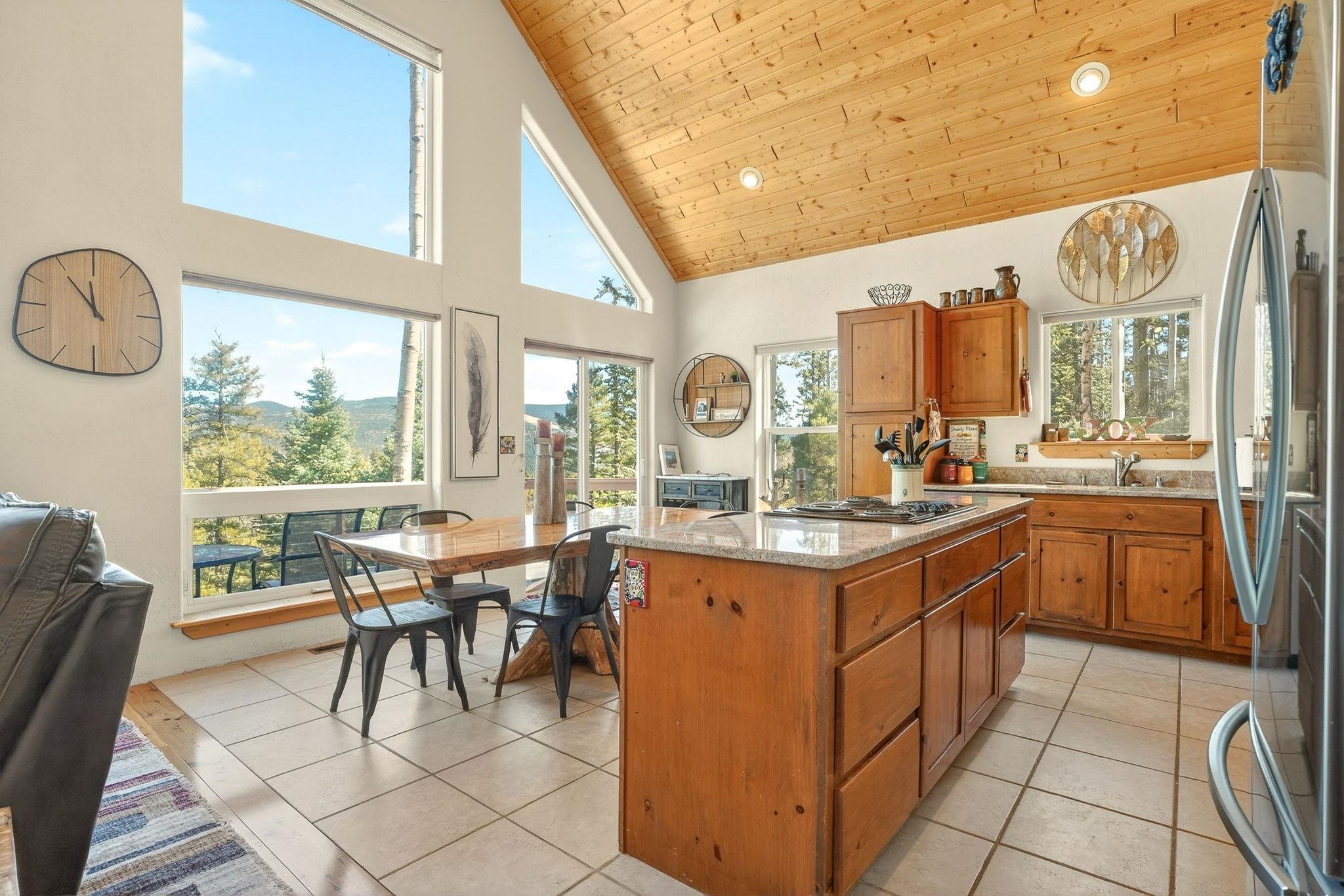 Nestled among the tall pines of Angel Fire, this warm and welcoming mountain chalet sits on a beautifully wooded 1.64-acre lot with peaceful views and room to breathe. Inside, the open living area is filled with natural light and features soaring wood ceilings, expansive windows, and a cozy propane fireplace - an ideal place to unwind after a day of skiing, hiking, or exploring the mountains. The home offers a flexible layout designed for hosting friends and family. The main level includes the living, kitchen, dining, and laundry areas along with two guest bedrooms, a guest bath, and a comfortable primary suite for convenient main-floor living. Upstairs, a loft leads to a second private primary suite, perfect for guests who want their own retreat. Step outside to the spacious composite deck and take in the quiet mountain setting surrounded by mature pines. The attached two-car garage includes an oversized bay with extra height and length, ideal for larger vehicles or outdoor gear. Whether you're looking for a peaceful getaway, a basecamp for mountain adventures, or a property with rental potential, this charming Angel Fire home offers the space and setting to enjoy it all.