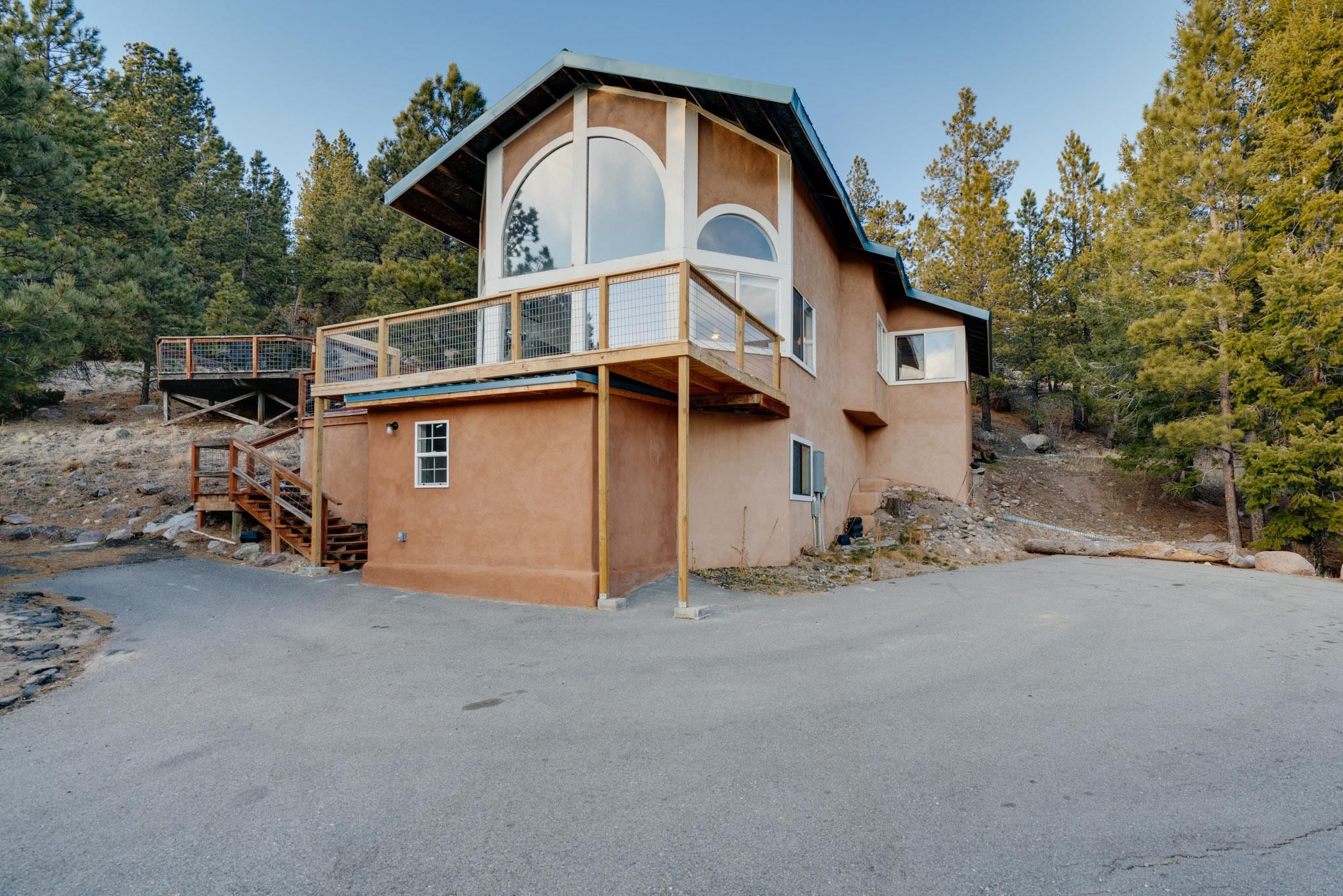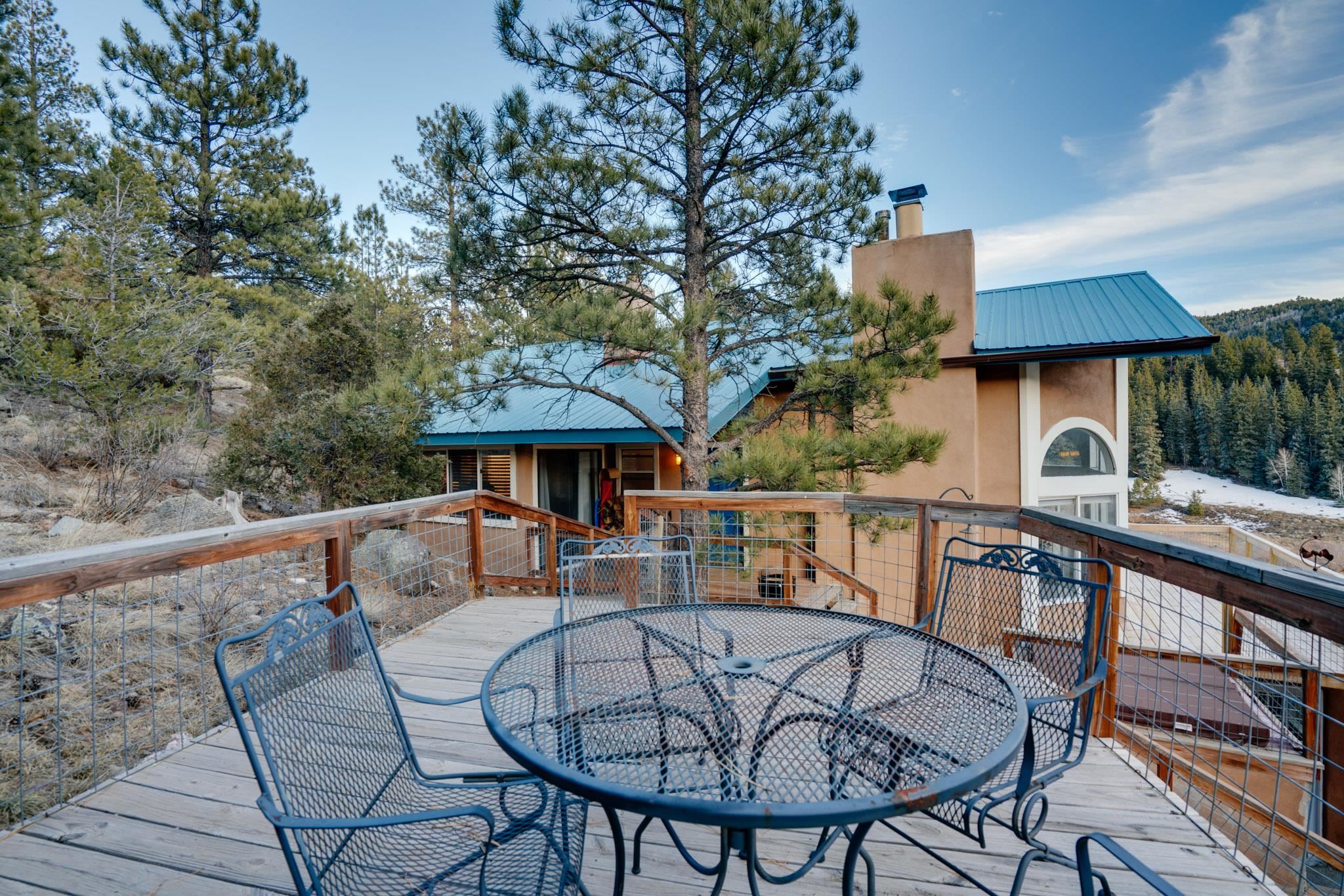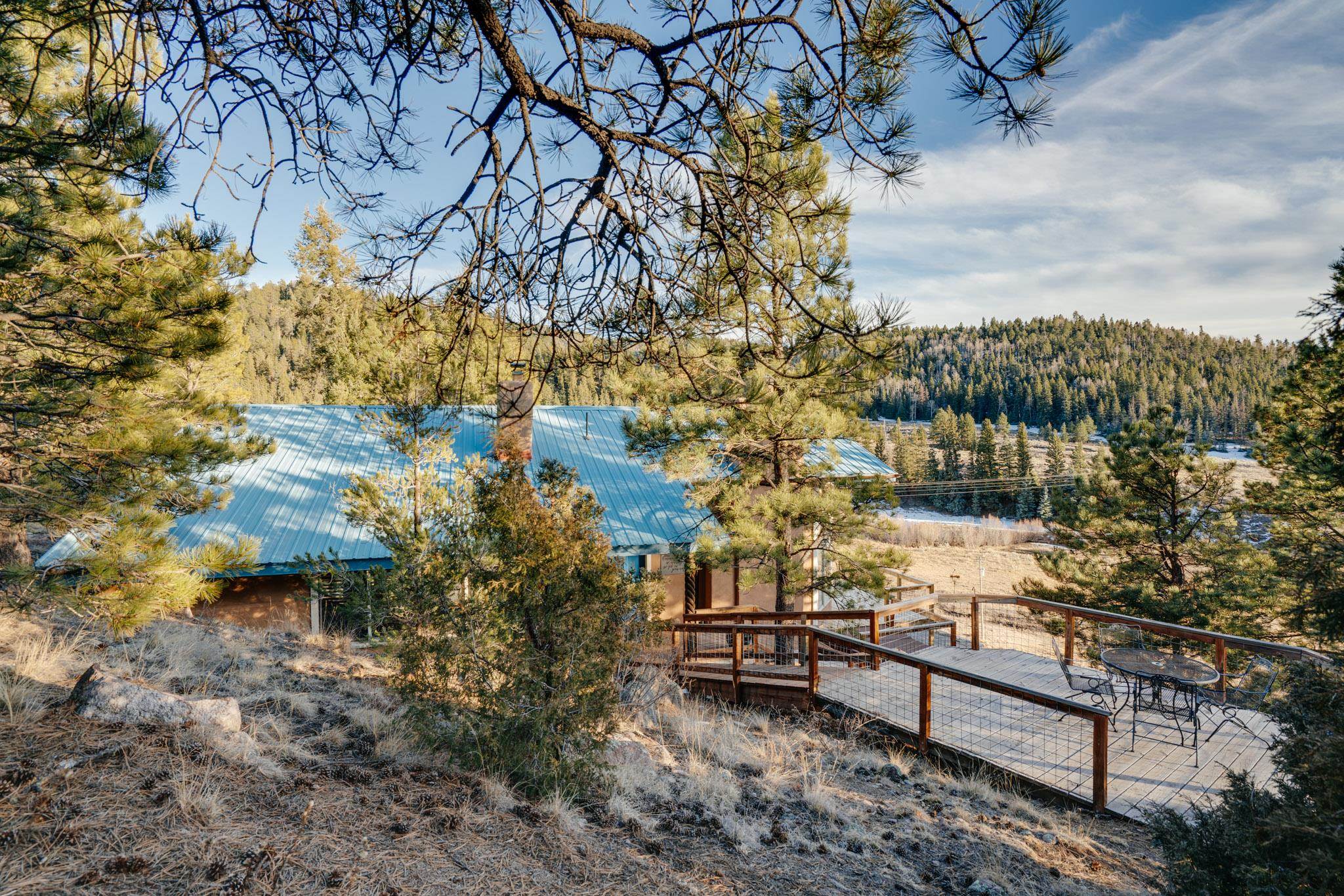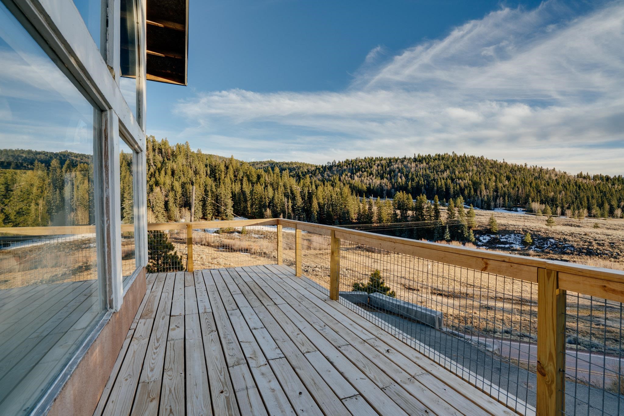 Embrace the mountain lifestyle in this beautiful custom 4-bedroom, 2-bath retreat set on .75 acres and surrounded by the natural beauty of Northern New Mexico. Perfectly positioned to capture stunning mountain views, the living room features dramatic floor-to-ceiling windows that bring the outdoors in and fill the home with natural light. Cozy up beside one of the two fireplaces, including a private fireplace in the primary bedroom, creating the perfect setting for cool mountain evenings. Step out onto the spacious deck to relax with your morning coffee, watch the changing colors of the mountains, or enjoy peaceful stargazing under the clear alpine sky. Backing directly to forest land, the property offers privacy, abundant wildlife, and immediate access to hiking and outdoor exploration right from your backyard. Whether you're looking for a full-time mountain home, weekend escape, or investment getaway, this property offers the perfect blend of comfort, scenery, and adventure in the heart of Northern New Mexico. Square footage is approximate only.