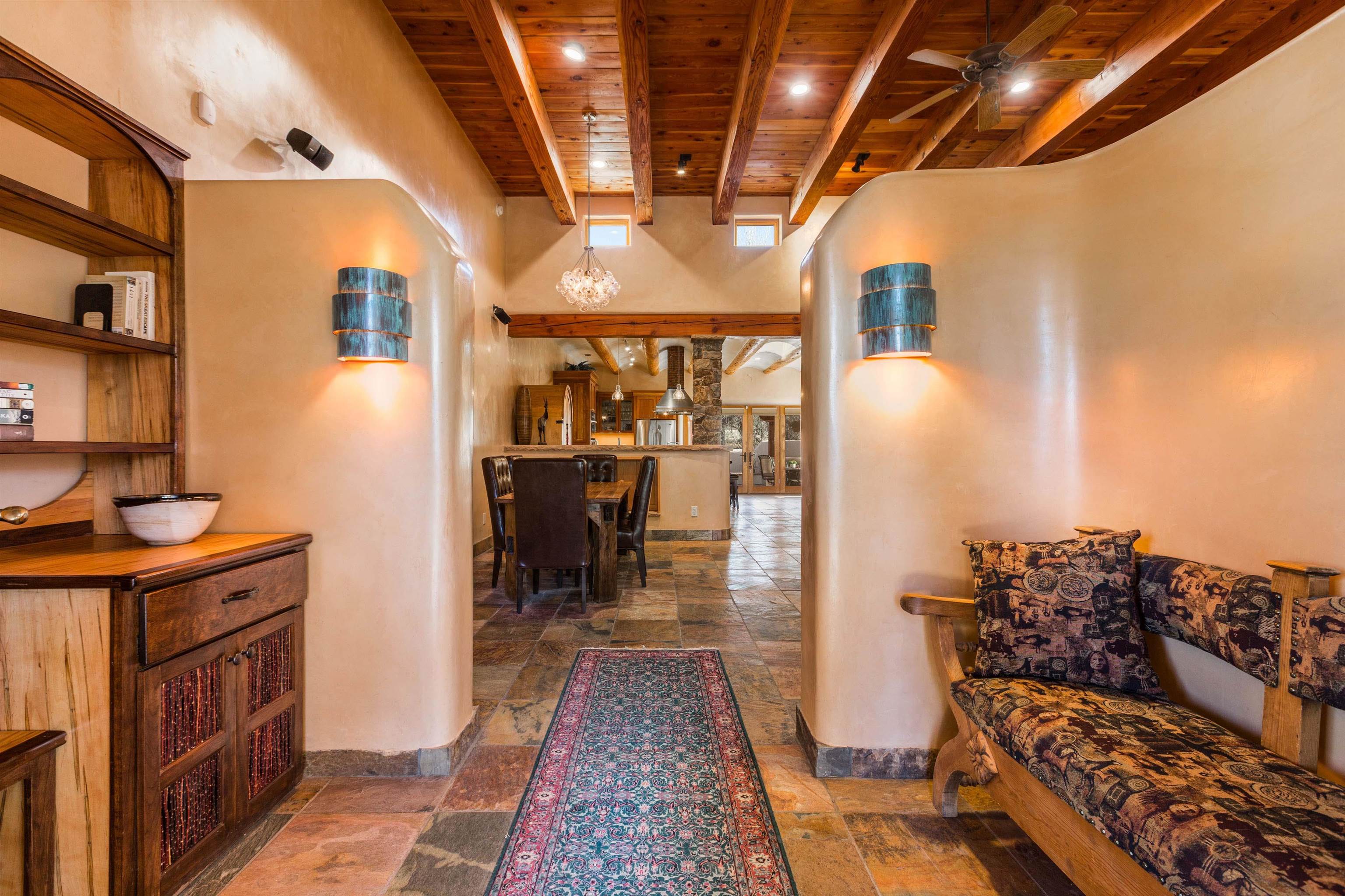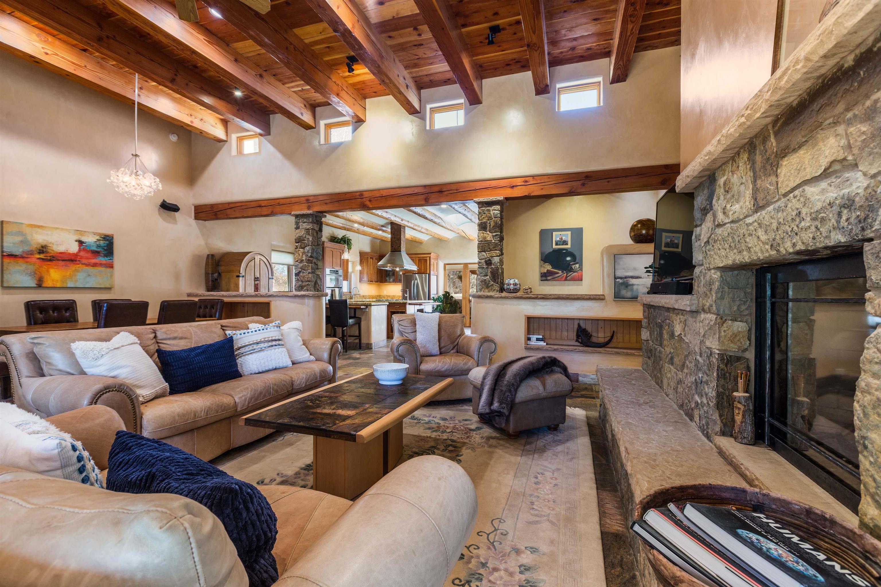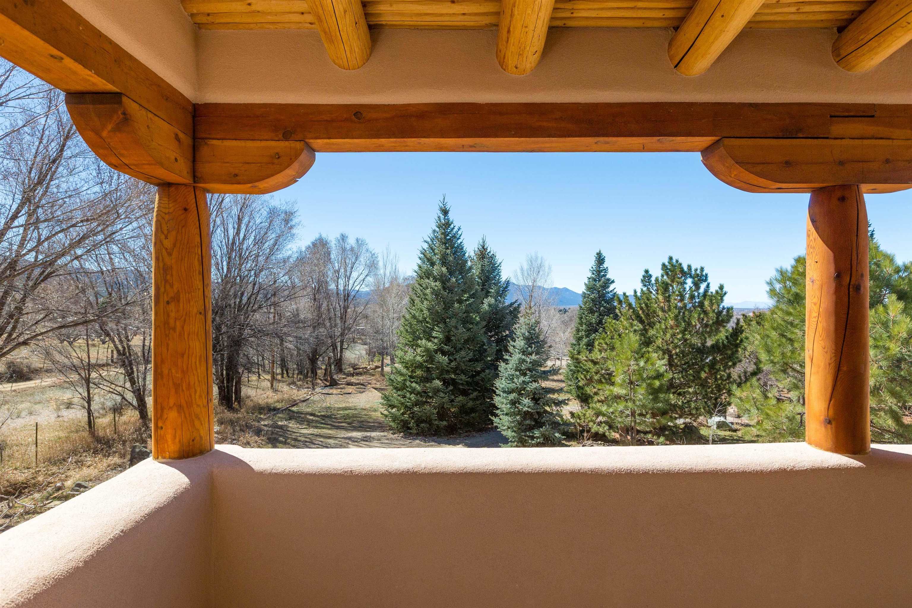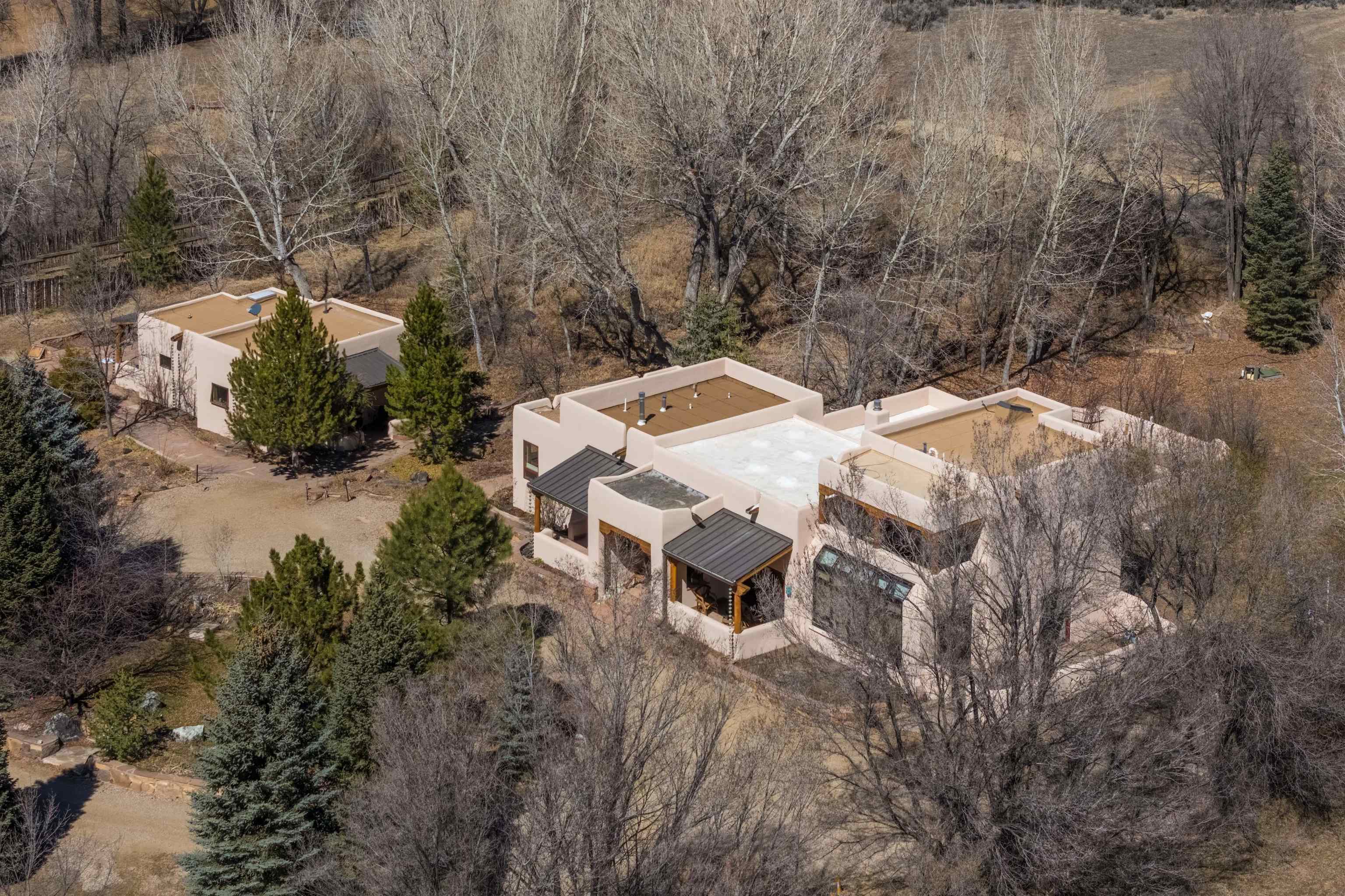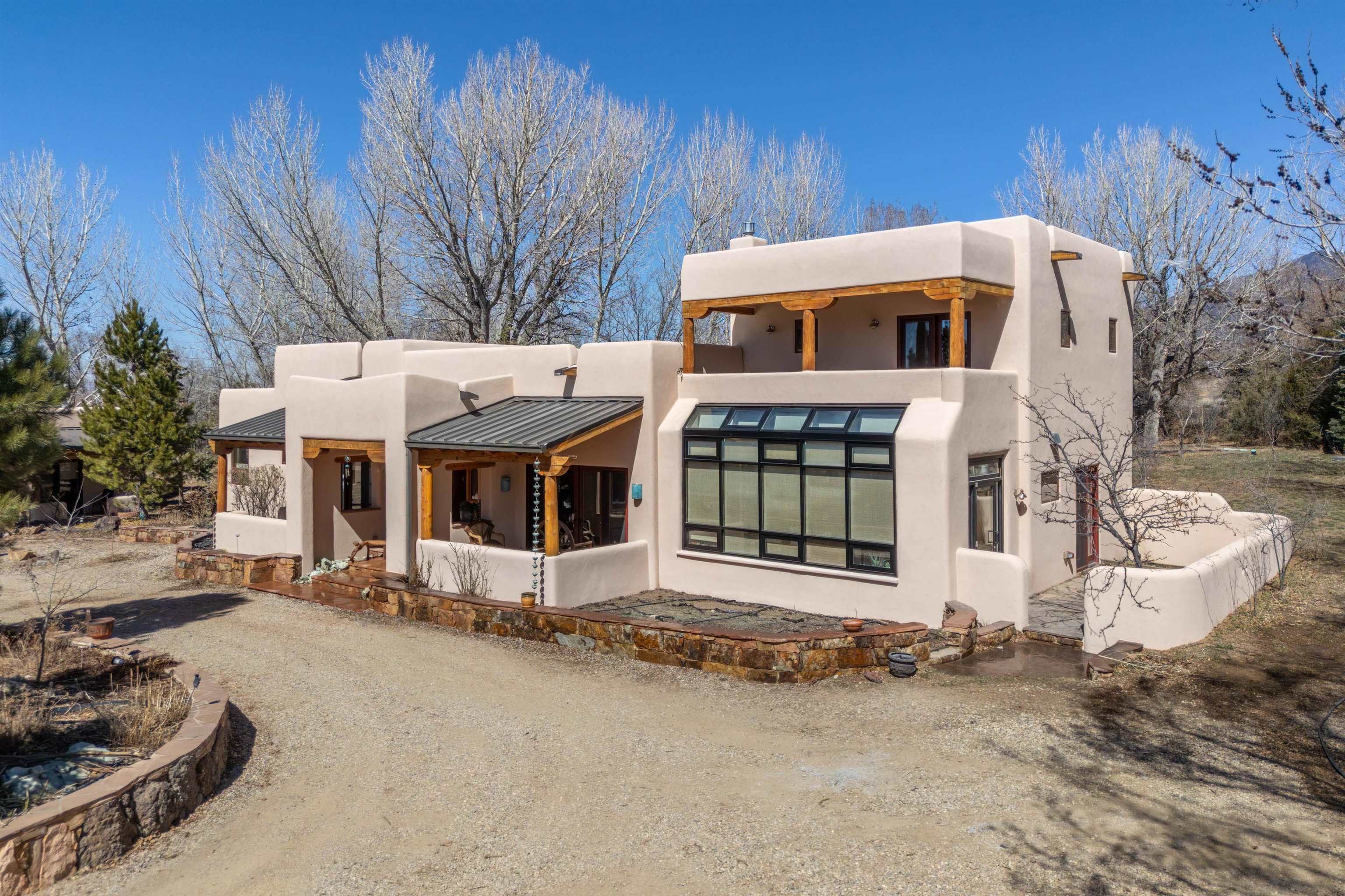 Welcome to your Oasis!! Set within the breathtaking high desert landscape of Taos and minutes from the Plaza. This extraordinary first time on the market, private estate offers a rare blend of timeless Northern New Mexico architecture, artisanal craftsmanship, and self-sustaining luxury. Built by Paul Rotman with substantial 18-inch thick Rastra Block walls, the residence embodies the enduring character of traditional adobe-style design while incorporating refined modern comfort. From the moment you enter through the handcrafted adobe entryway constructed with approximately 100-year-old bricks, the home reveals a level of artistry rarely found in traditional builds. Fourteen-foot ceilings, graceful coved ceilings in the kitchen, and diamond-finish plaster walls tinted with natural mineral pigments create a warm, sculptural interior that reflects the region's rich architectural heritage. The chef's kitchen is both bold and elegant, featuring granite countertops with full bullnose edges, custom cherry cabinetry, double ovens, and an intimate breakfast nook. Living spaces are anchored by gas fireplaces and custom stonework by renowned artisan Bob Loveless, complemented by natural stone tile flooring and expansive light-filled gathering areas including a tranquil sunroom. The primary suite offers a luxurious retreat with distinctive green marble accents in the bath, while upstairs cherry wood flooring adds warmth and refinement. Comfort throughout the home is provided by radiant floor heating, supplemental wall heaters, and a Navien high-efficiency boiler installed in February 2026. A charming casita with tongue-and-groove ceilings crafted from 400-year-old reclaimed wood provides exceptional guest accommodations or private retreat space. Beyond the residence, the property unfolds into an extraordinary multi-use compound. A heated three-car garage, artist studio, heated woodworking shop with professional dust collection system, and fitness room with full bath and laundry hookups create unmatched flexibility for creative pursuits, wellness, or home-based enterprises. The grounds themselves form a true Taos sanctuary. With 7+ acres of mature gardens and landscaping surround a productive orchard of apple, pear, apricot, cherry, peach, and plum trees, alongside flowering perennials and majestic Austrian pine, Colorado blue spruce, and bristlecone pines. Additional agricultural features include a tree nursery, chicken coop, bee house, hoop house, and irrigation access off the mother ditch. Designed for both sustainability and independence, the estate includes two wells (one solar powered), two cisterns, a five-zone in-ground irrigation system, RV hookups with water and 30-amp service, and a back porch pre-wired for a hot tub--perfect for enjoying the quiet beauty and star-filled skies of northern New Mexico. This exceptional offering represents a rare opportunity to own a private high-desert compound where craftsmanship, land stewardship, and luxury living come together in one remarkable Taos property.