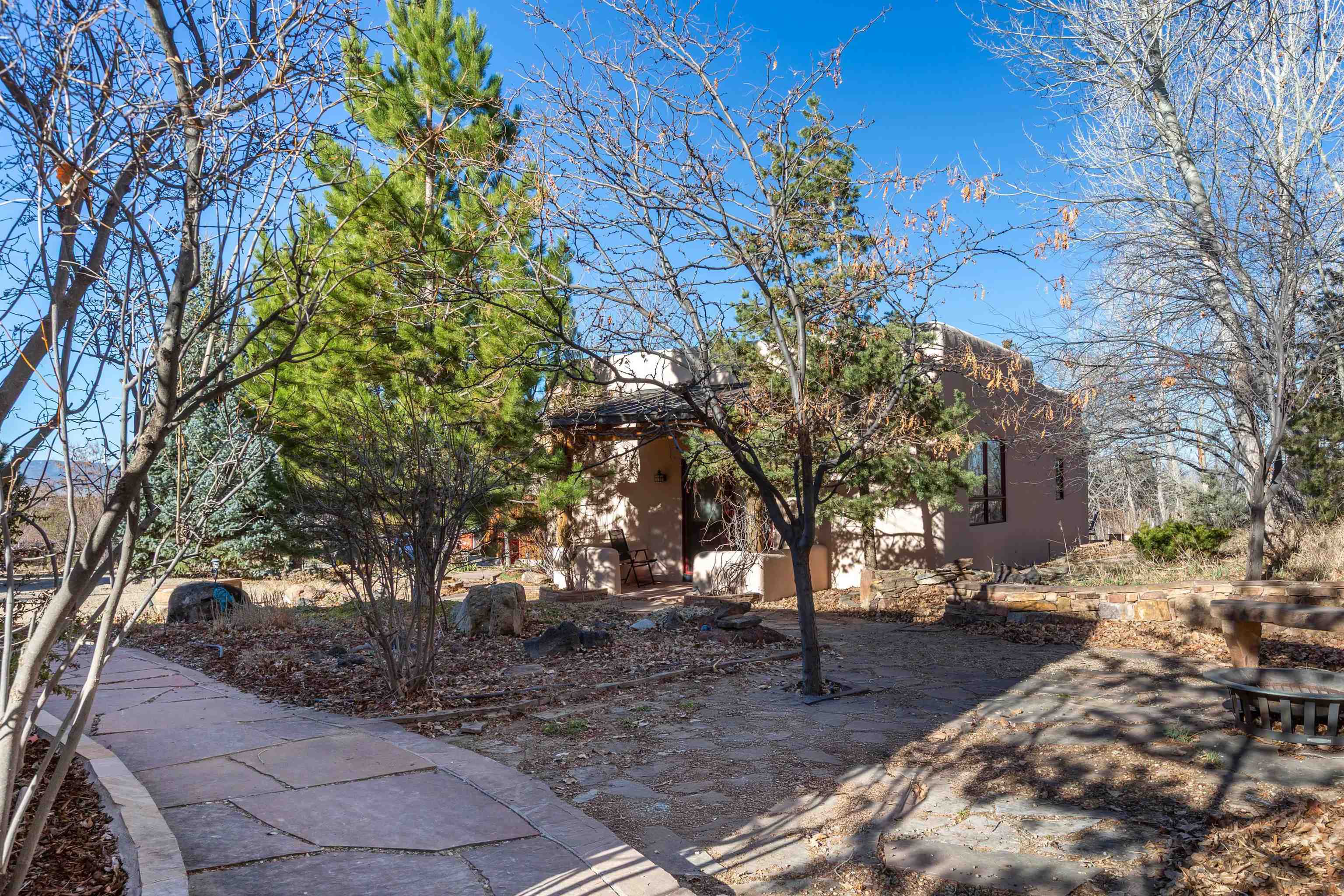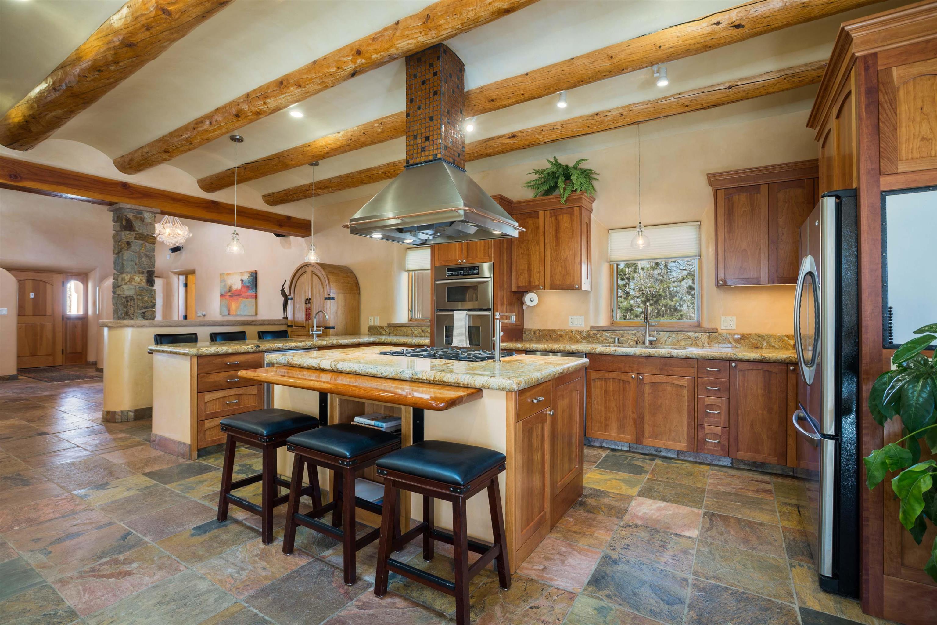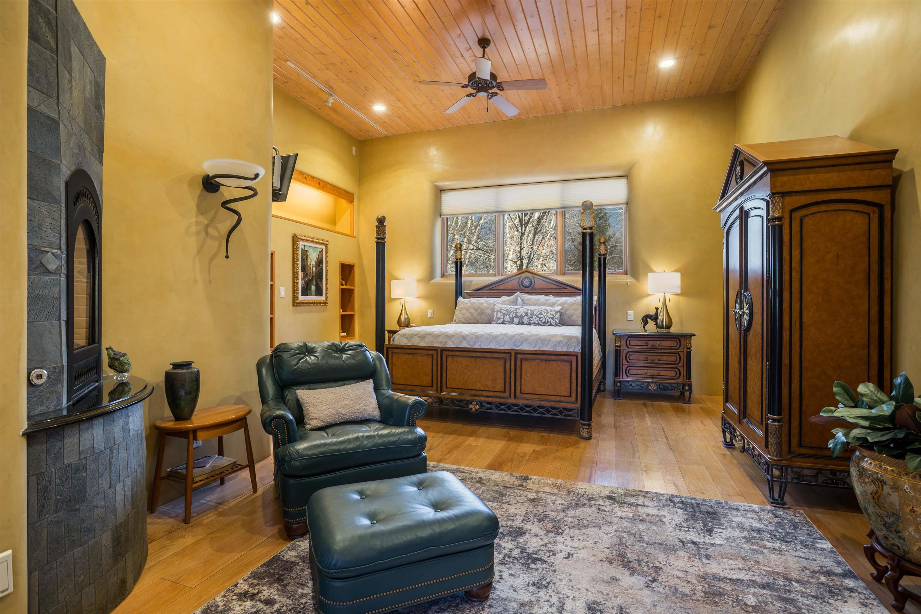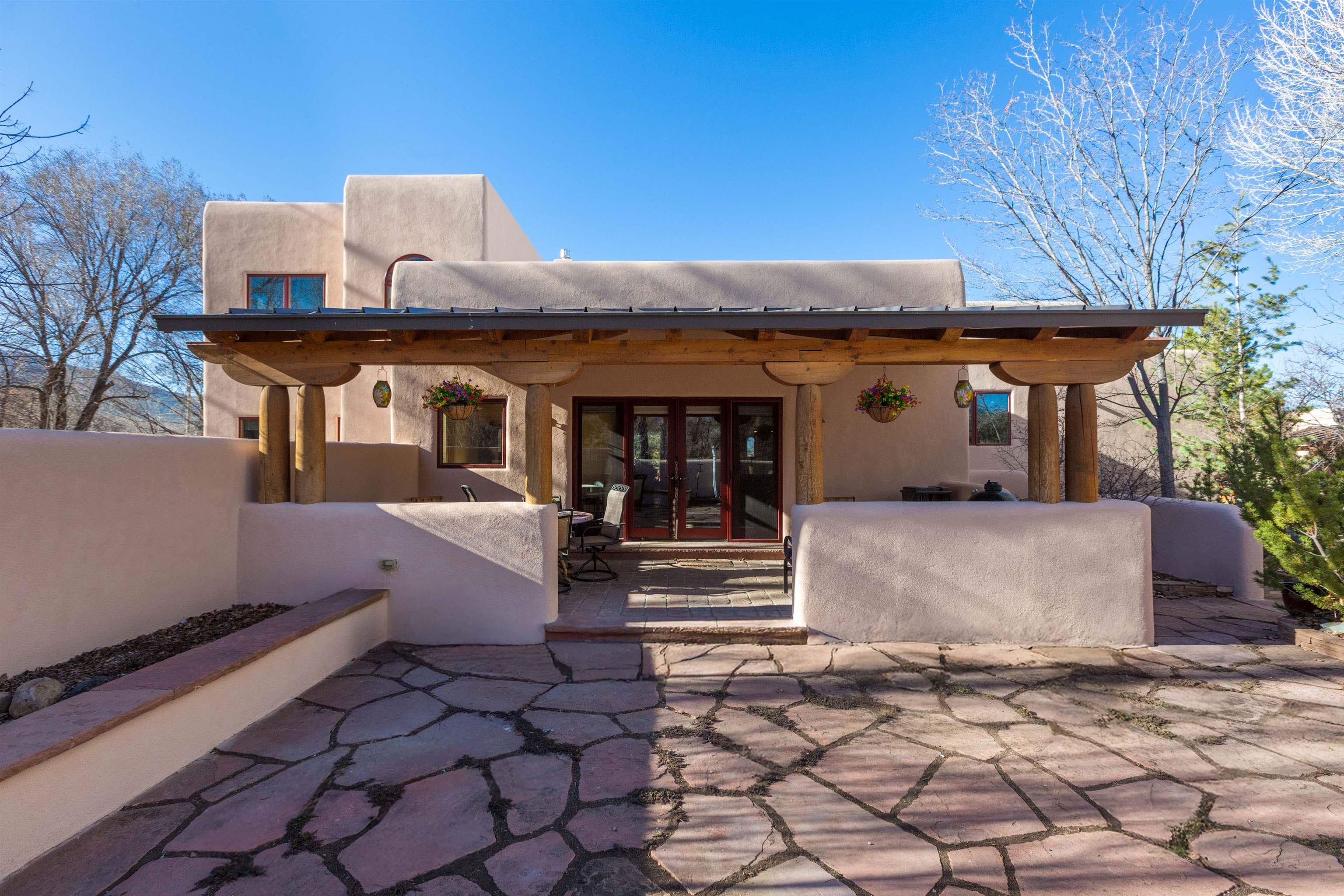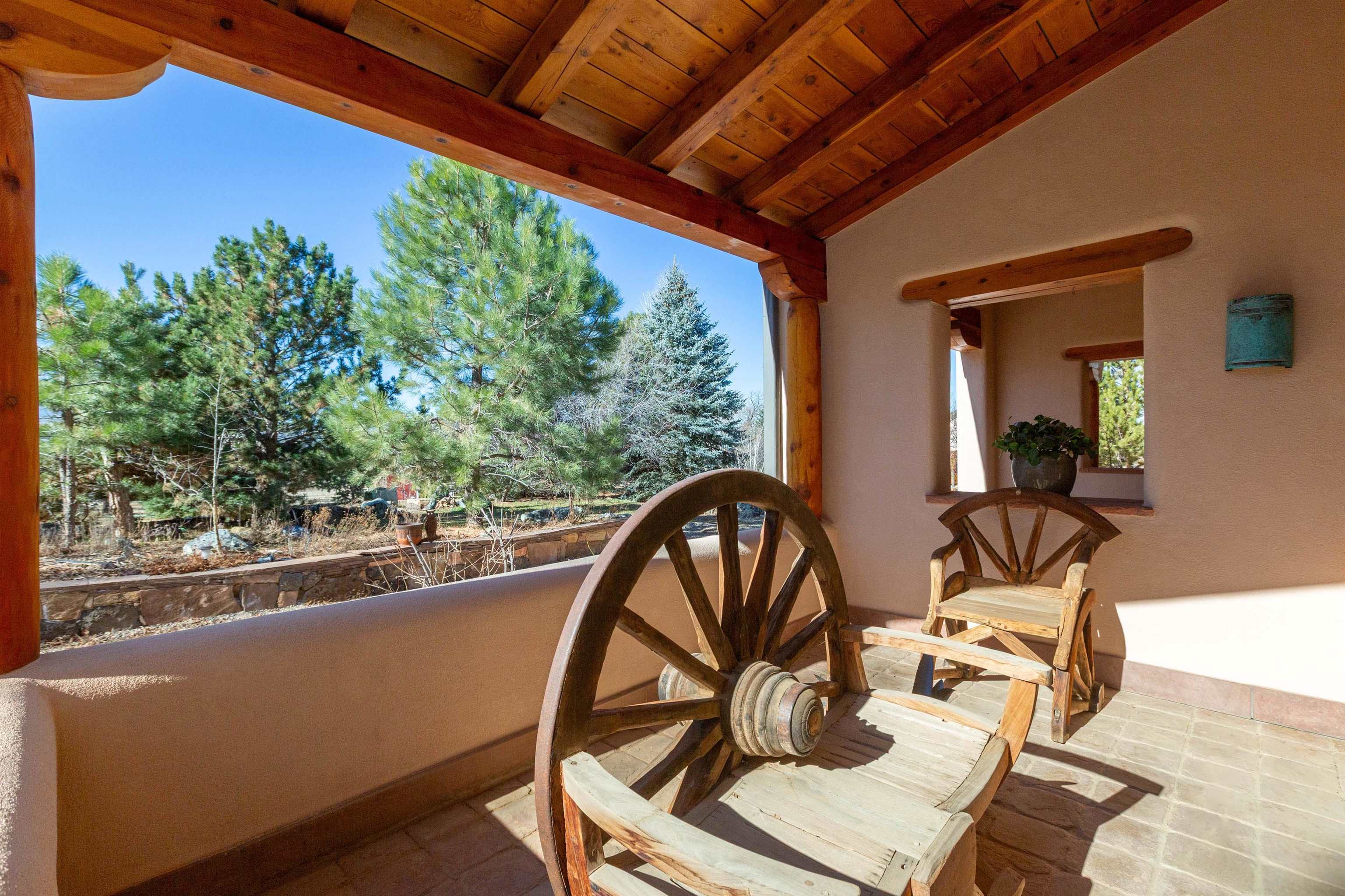 Welcome to your Oasis!! Set within the breathtaking high desert landscape of Taos and minutes from the Plaza. This extraordinary first time on the market, private estate offers a rare blend of timeless Northern New Mexico architecture, artisanal craftsmanship, and self-sustaining luxury. Built by Paul Rotman with substantial 18-inch thick Rastra Block walls, the residence embodies the enduring character of traditional adobe-style design while incorporating refined modern comfort. From the moment you enter through the handcrafted adobe entryway constructed with approximately 100-year-old bricks, the home reveals a level of artistry rarely found in traditional builds. Fourteen-foot ceilings, graceful coved ceilings in the kitchen, and diamond-finish plaster walls tinted with natural mineral pigments create a warm, sculptural interior that reflects the region's rich architectural heritage. The chef's kitchen is both bold and elegant, featuring granite countertops with full bullnose edges, custom cherry cabinetry, double ovens, and an intimate breakfast nook. Living spaces are anchored by gas fireplaces and custom stonework by renowned artisan Bob Loveless, complemented by natural stone tile flooring and expansive light-filled gathering areas including a tranquil sunroom. The primary suite offers a luxurious retreat with distinctive green marble accents in the bath, while upstairs cherry wood flooring adds warmth and refinement. Comfort throughout the home is provided by radiant floor heating, supplemental wall heaters, and a Navien high-efficiency boiler installed in February 2026. A charming casita with tongue-and-groove ceilings crafted from 400-year-old reclaimed wood provides exceptional guest accommodations or private retreat space. Beyond the residence, the property unfolds into an extraordinary multi-use compound. A heated three-car garage, artist studio, heated woodworking shop with professional dust collection system, and fitness room with full bath and laundry hookups create unmatched flexibility for creative pursuits, wellness, or home-based enterprises. The grounds themselves form a true Taos sanctuary. With 7+ acres of mature gardens and landscaping surround a productive orchard of apple, pear, apricot, cherry, peach, and plum trees, alongside flowering perennials and majestic Austrian pine, Colorado blue spruce, and bristlecone pines. Additional agricultural features include a tree nursery, chicken coop, bee house, hoop house, and irrigation access off the mother ditch. Designed for both sustainability and independence, the estate includes two wells (one solar powered), two cisterns, a five-zone in-ground irrigation system, RV hookups with water and 30-amp service, and a back porch pre-wired for a hot tub--perfect for enjoying the quiet beauty and star-filled skies of northern New Mexico. This exceptional offering represents a rare opportunity to own a private high-desert compound where craftsmanship, land stewardship, and luxury living come together in one remarkable Taos property.