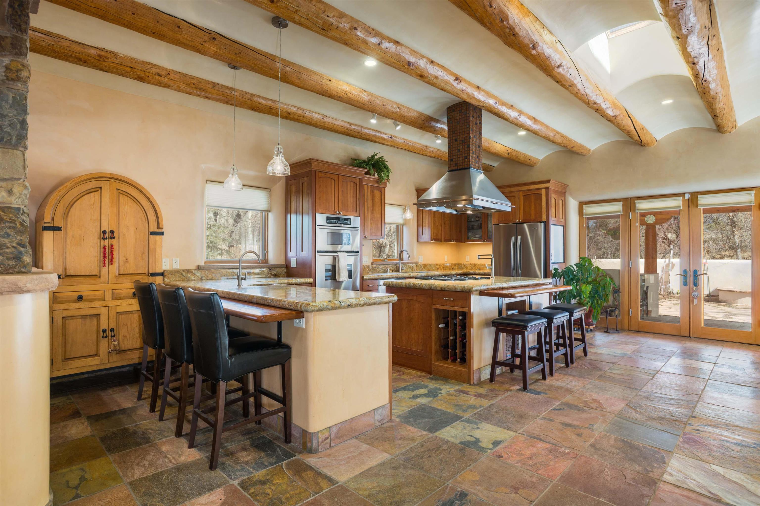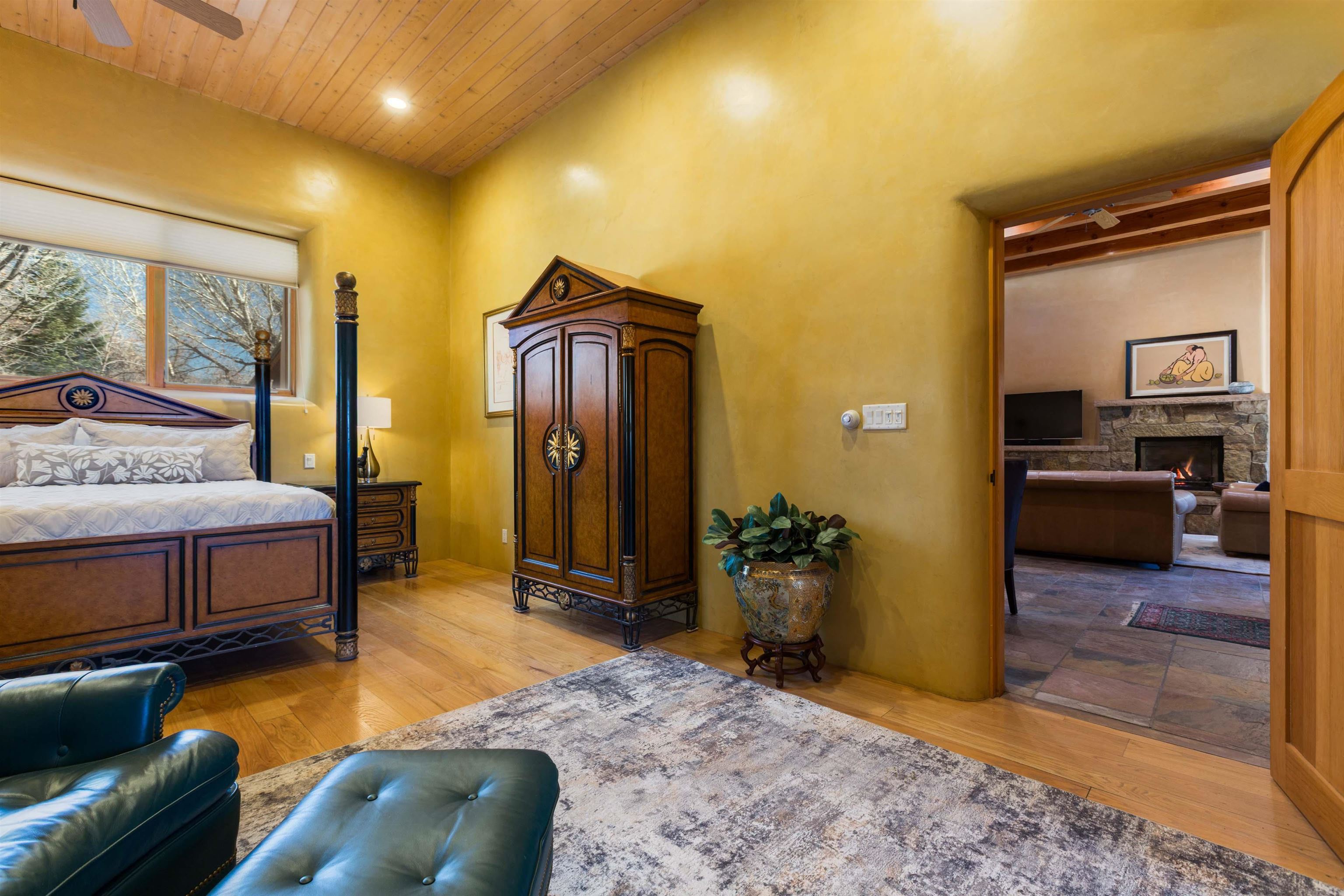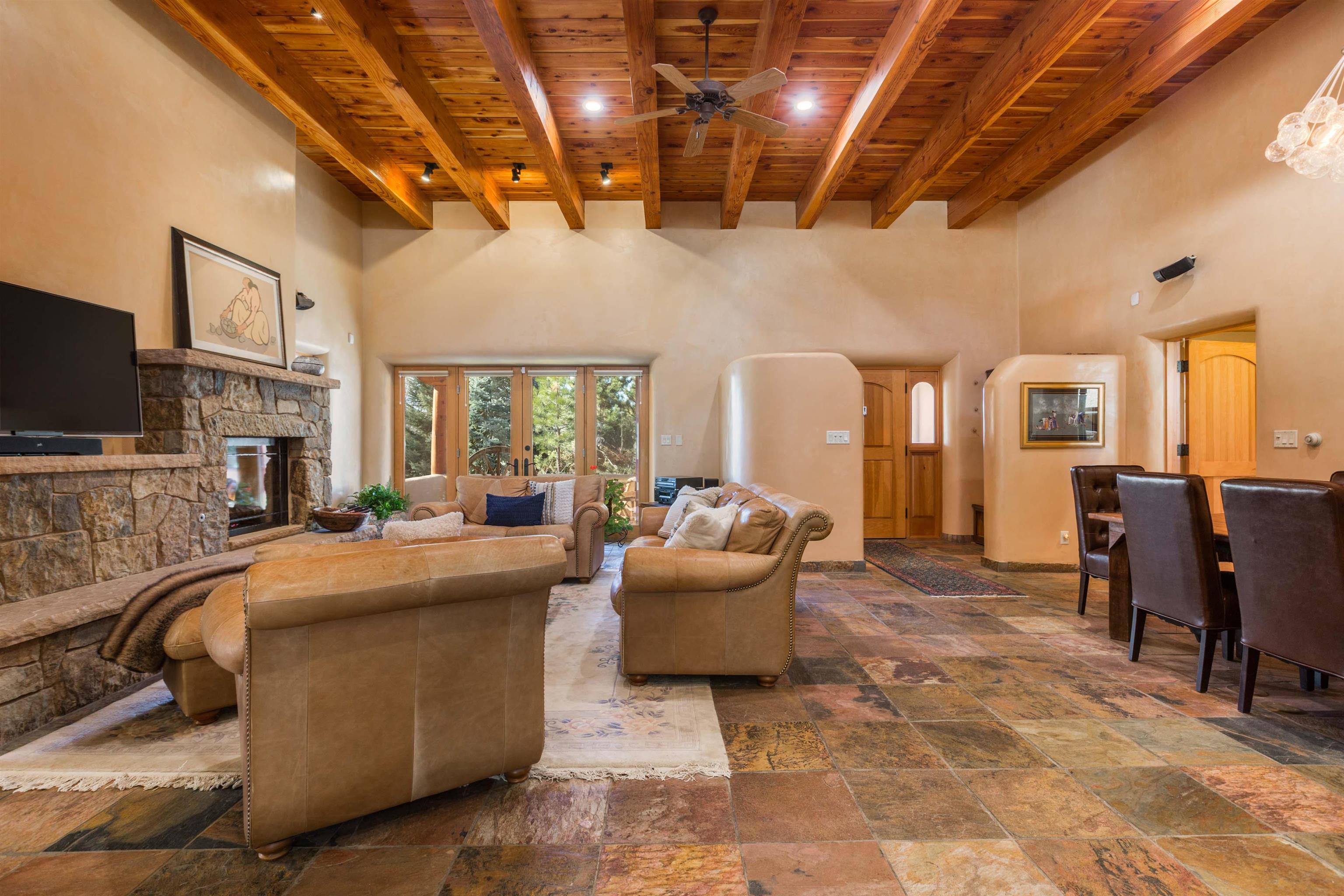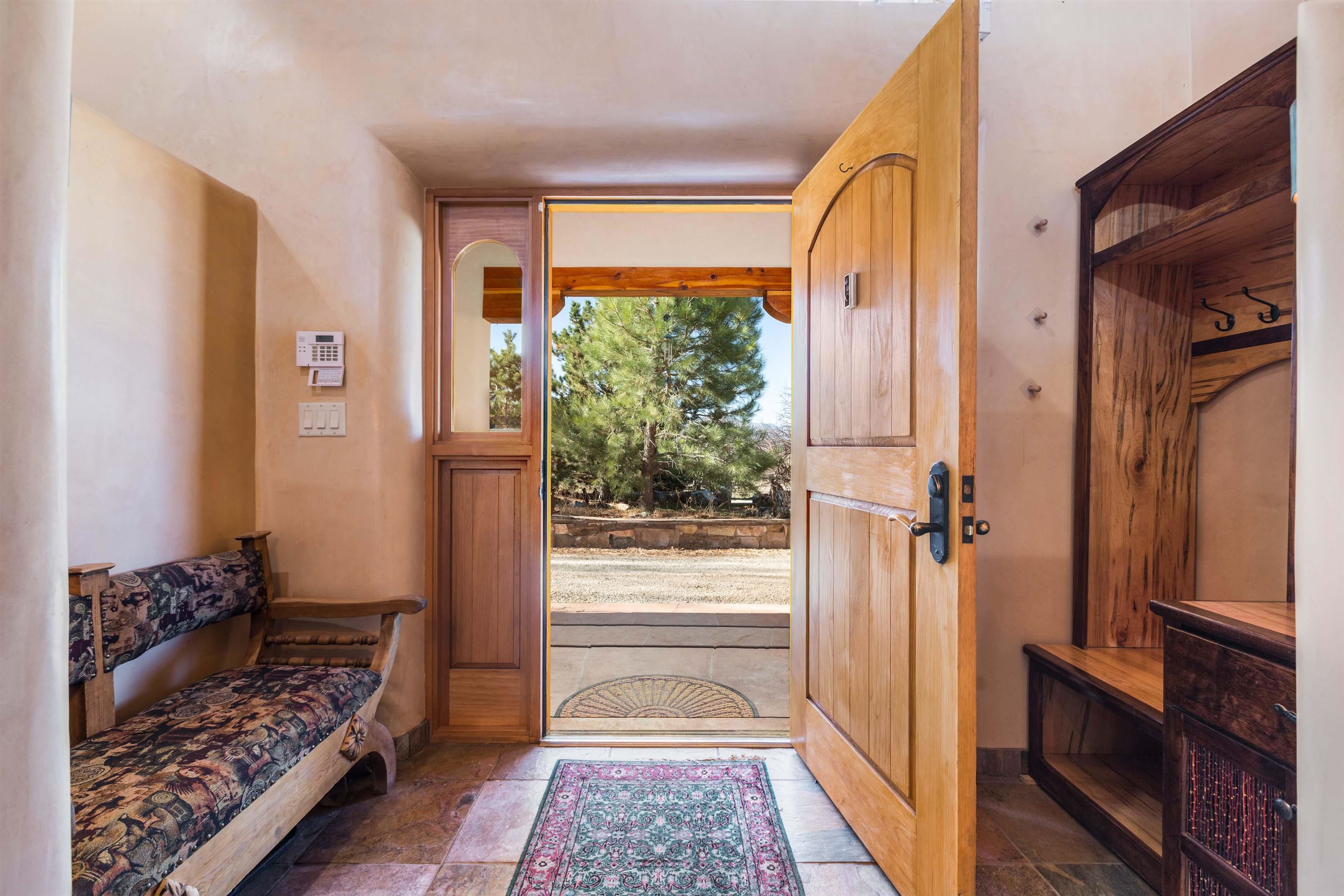 Welcome to your Oasis!! Set within the breathtaking high desert landscape of Taos and minutes from the Plaza. This extraordinary first time on the market, private estate offers a rare blend of timeless Northern New Mexico architecture, artisanal craftsmanship, and self-sustaining luxury. Built by Paul Rotman with substantial 18-inch thick Rastra Block walls, the residence embodies the enduring character of traditional adobe-style design while incorporating refined modern comfort. From the moment you enter through the handcrafted adobe entryway constructed with approximately 100-year-old bricks, the home reveals a level of artistry rarely found in traditional builds. Fourteen-foot ceilings, graceful coved ceilings in the kitchen, and diamond-finish plaster walls tinted with natural mineral pigments create a warm, sculptural interior that reflects the region's rich architectural heritage. The chef's kitchen is both bold and elegant, featuring granite countertops with full bullnose edges, custom cherry cabinetry, double ovens, and an intimate breakfast nook. Living spaces are anchored by gas fireplaces and custom stonework by renowned artisan Bob Loveless, complemented by natural stone tile flooring and expansive light-filled gathering areas including a tranquil sunroom. The primary suite offers a luxurious retreat with distinctive green marble accents in the bath, while upstairs cherry wood flooring adds warmth and refinement. Comfort throughout the home is provided by radiant floor heating, supplemental wall heaters, and a Navien high-efficiency boiler installed in February 2026. A charming casita with tongue-and-groove ceilings crafted from 400-year-old reclaimed wood provides exceptional guest accommodations or private retreat space. Beyond the residence, the property unfolds into an extraordinary multi-use compound. A heated three-car garage, artist studio, heated woodworking shop with professional dust collection system, and fitness room with full bath and laundry hookups create unmatched flexibility for creative pursuits, wellness, or home-based enterprises. The grounds themselves form a true Taos sanctuary. With 7+ acres of mature gardens and landscaping surround a productive orchard of apple, pear, apricot, cherry, peach, and plum trees, alongside flowering perennials and majestic Austrian pine, Colorado blue spruce, and bristlecone pines. Additional agricultural features include a tree nursery, chicken coop, bee house, hoop house, and irrigation access off the mother ditch. Designed for both sustainability and independence, the estate includes two wells (one solar powered), two cisterns, a five-zone in-ground irrigation system, RV hookups with water and 30-amp service, and a back porch pre-wired for a hot tub--perfect for enjoying the quiet beauty and star-filled skies of northern New Mexico. This exceptional offering represents a rare opportunity to own a private high-desert compound where craftsmanship, land stewardship, and luxury living come together in one remarkable Taos property.